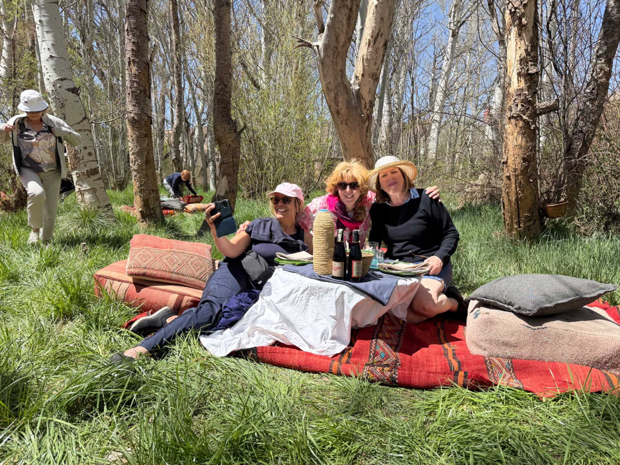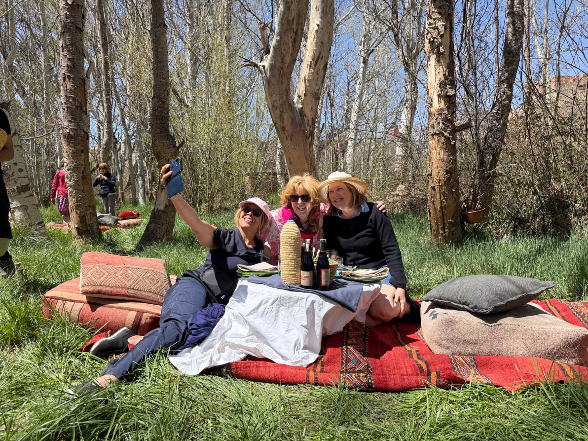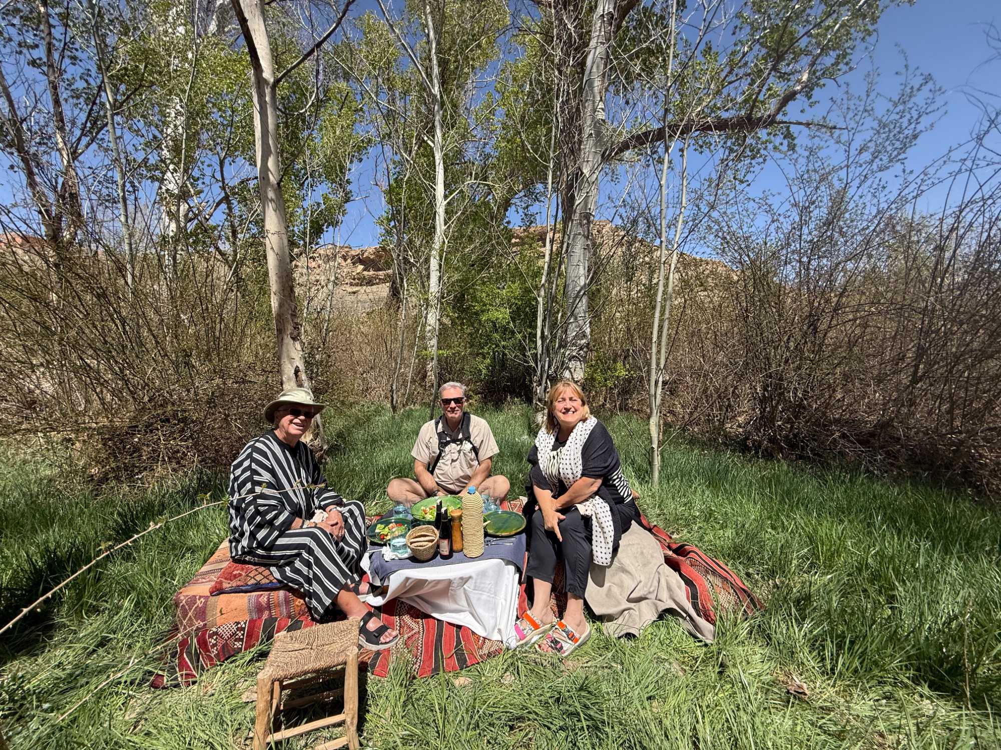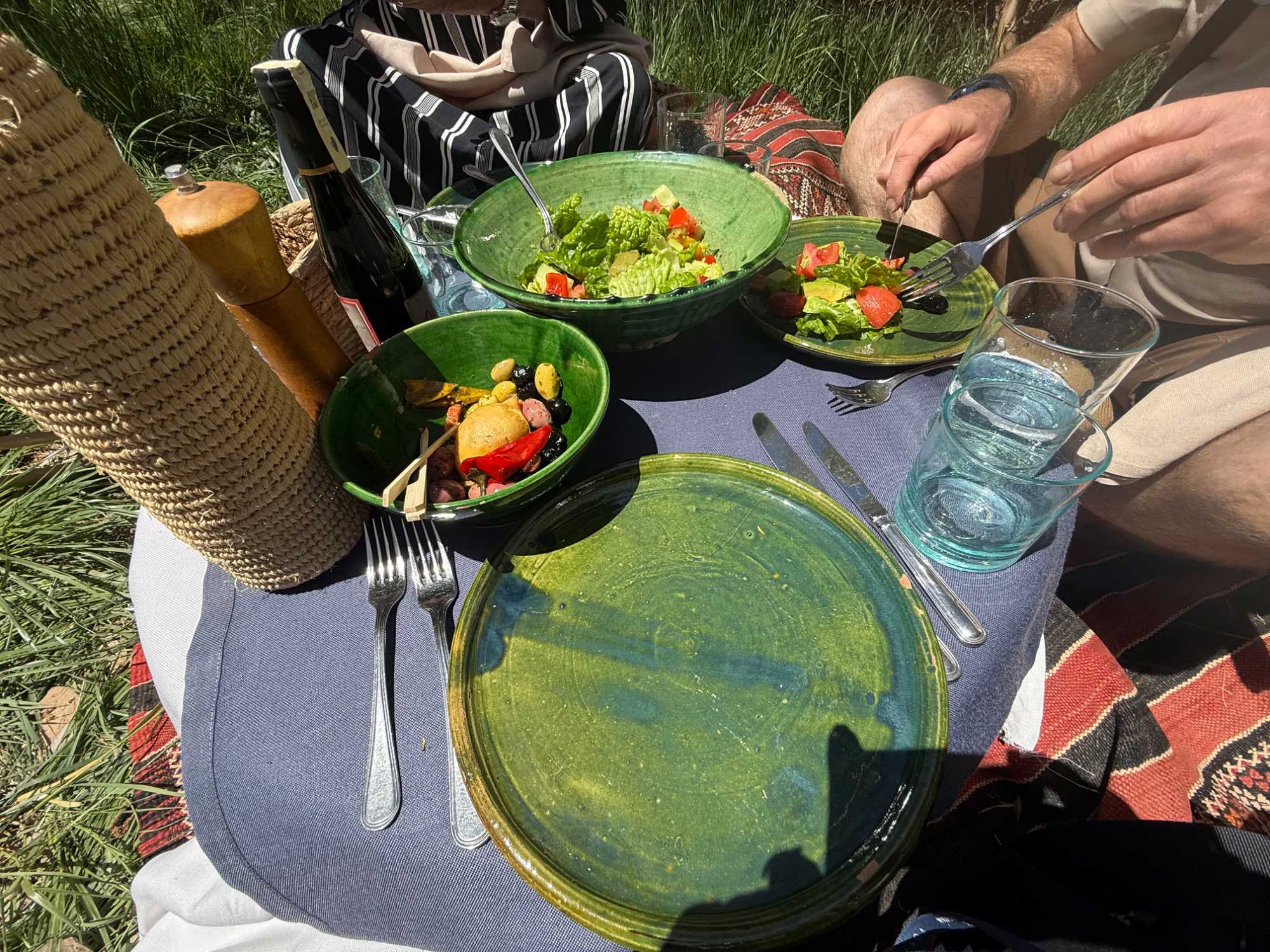 Des tables dressées avec soin, des coussins marocains, une ambiance intime et chaleureuse… tout est installé spécialement pour nous, au milieu de la nature.