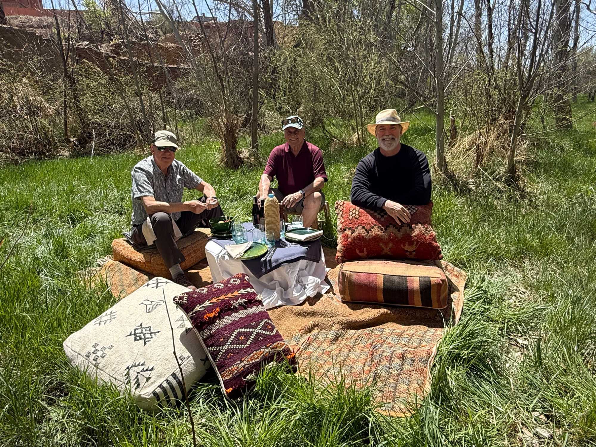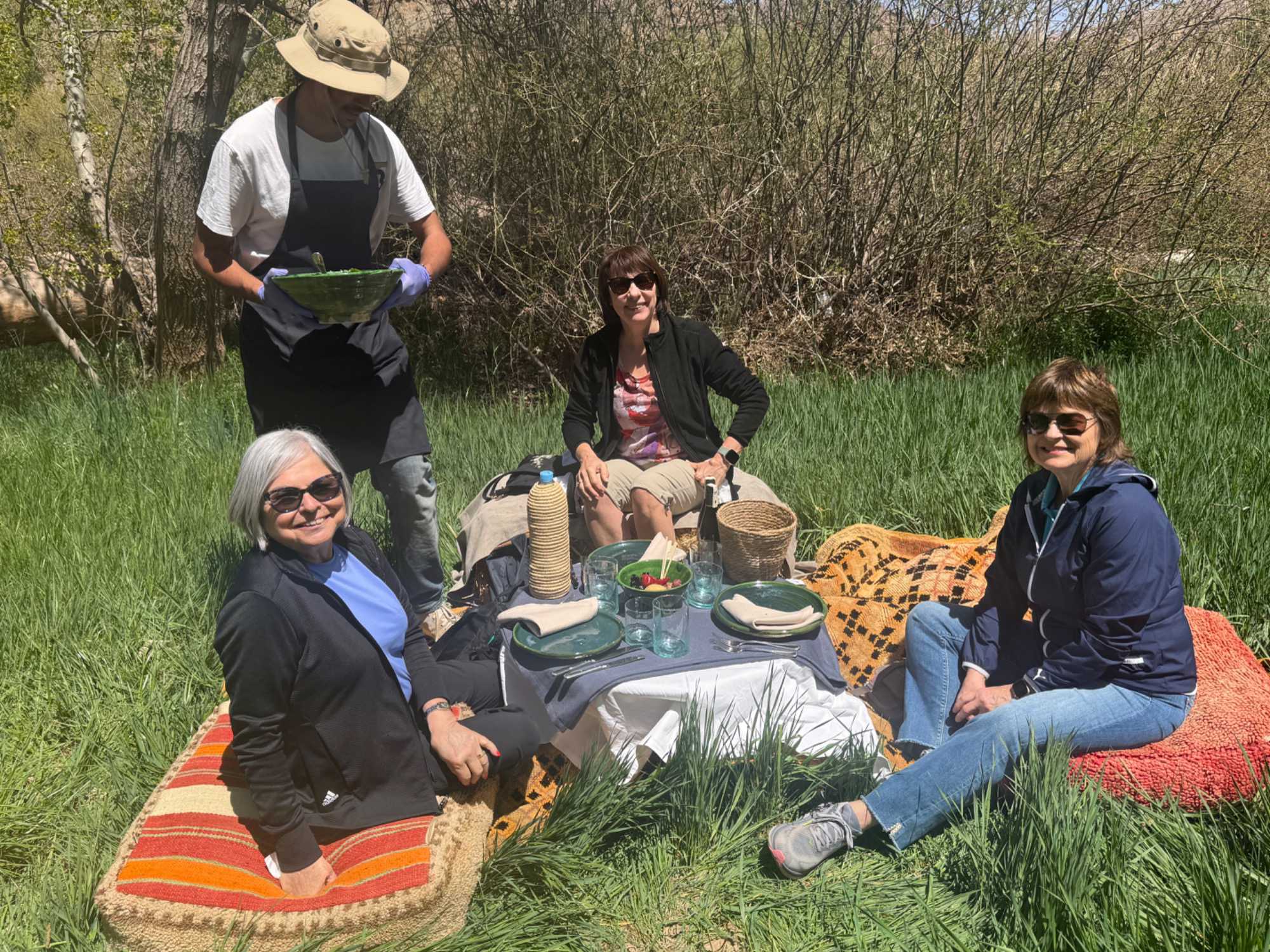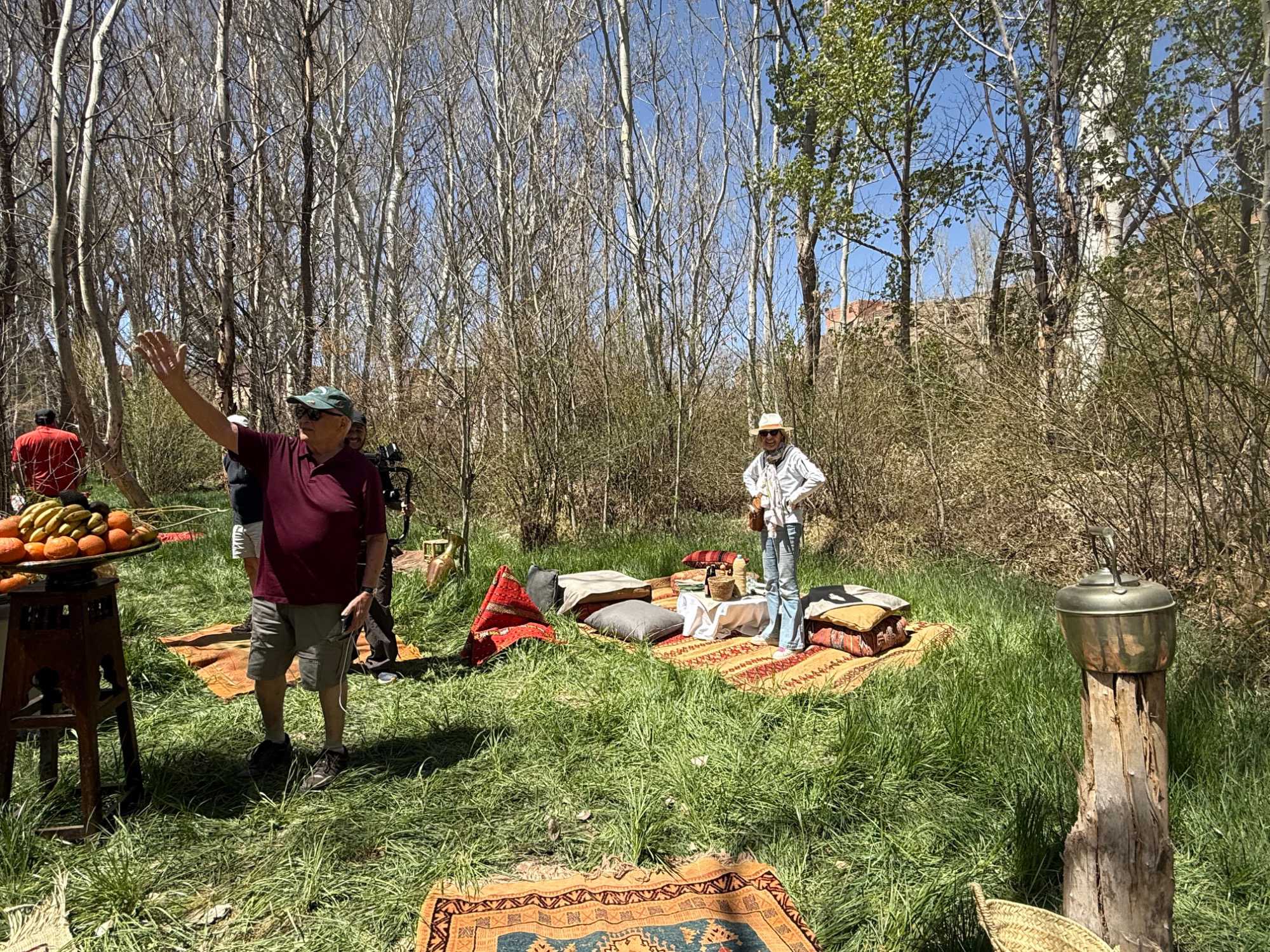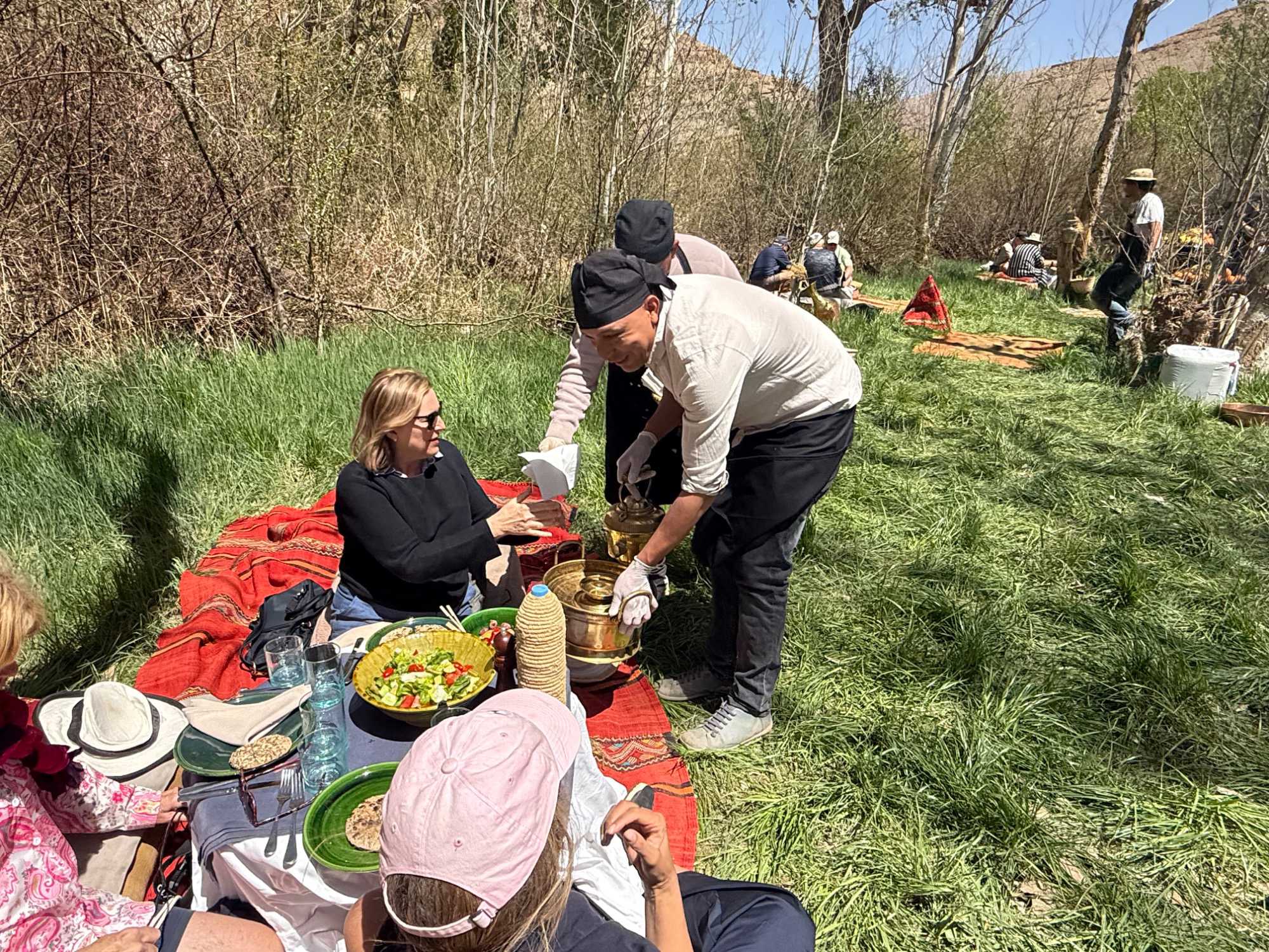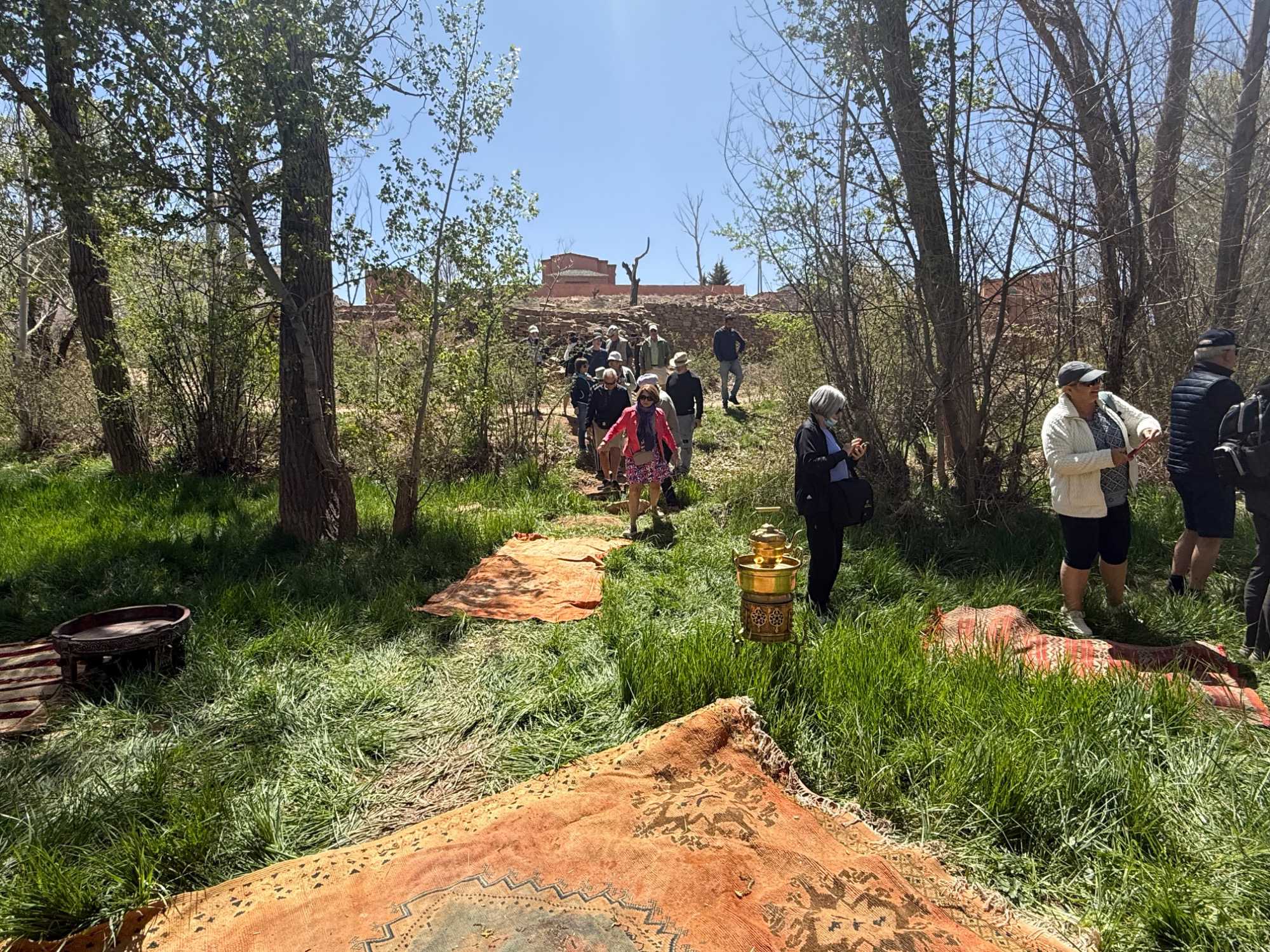 Des tables dressées avec soin, des coussins marocains, une ambiance intime et chaleureuse… tout est installé spécialement pour nous, au milieu de la nature.