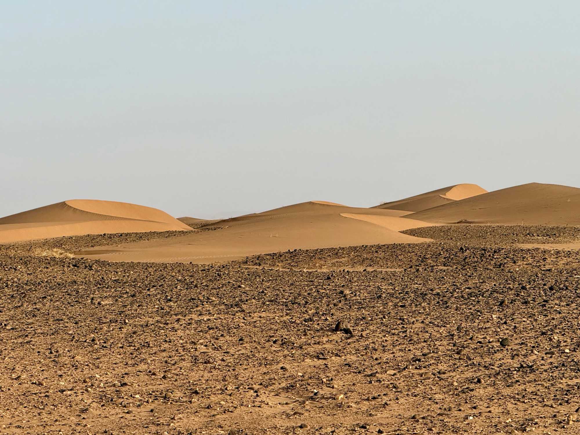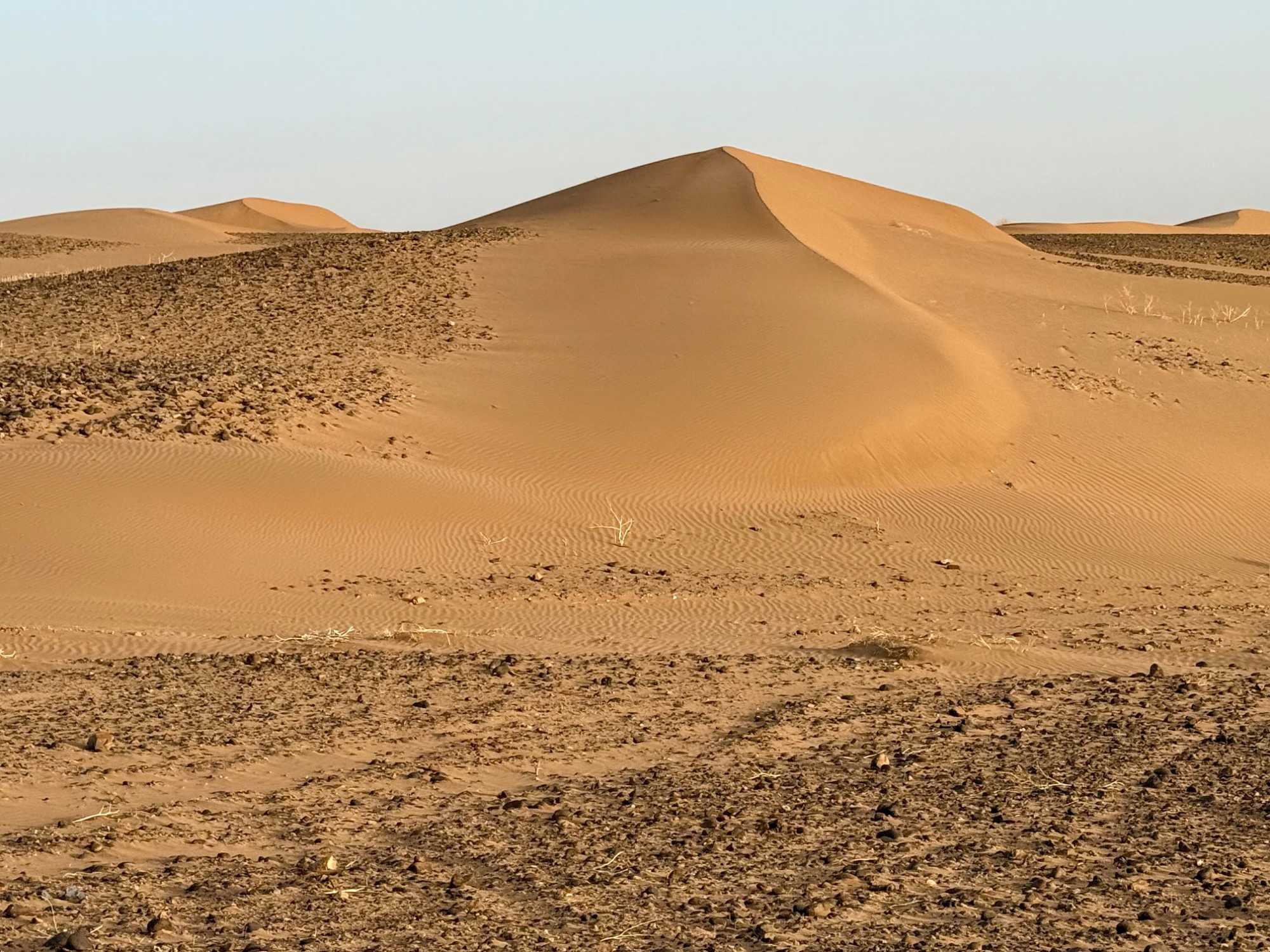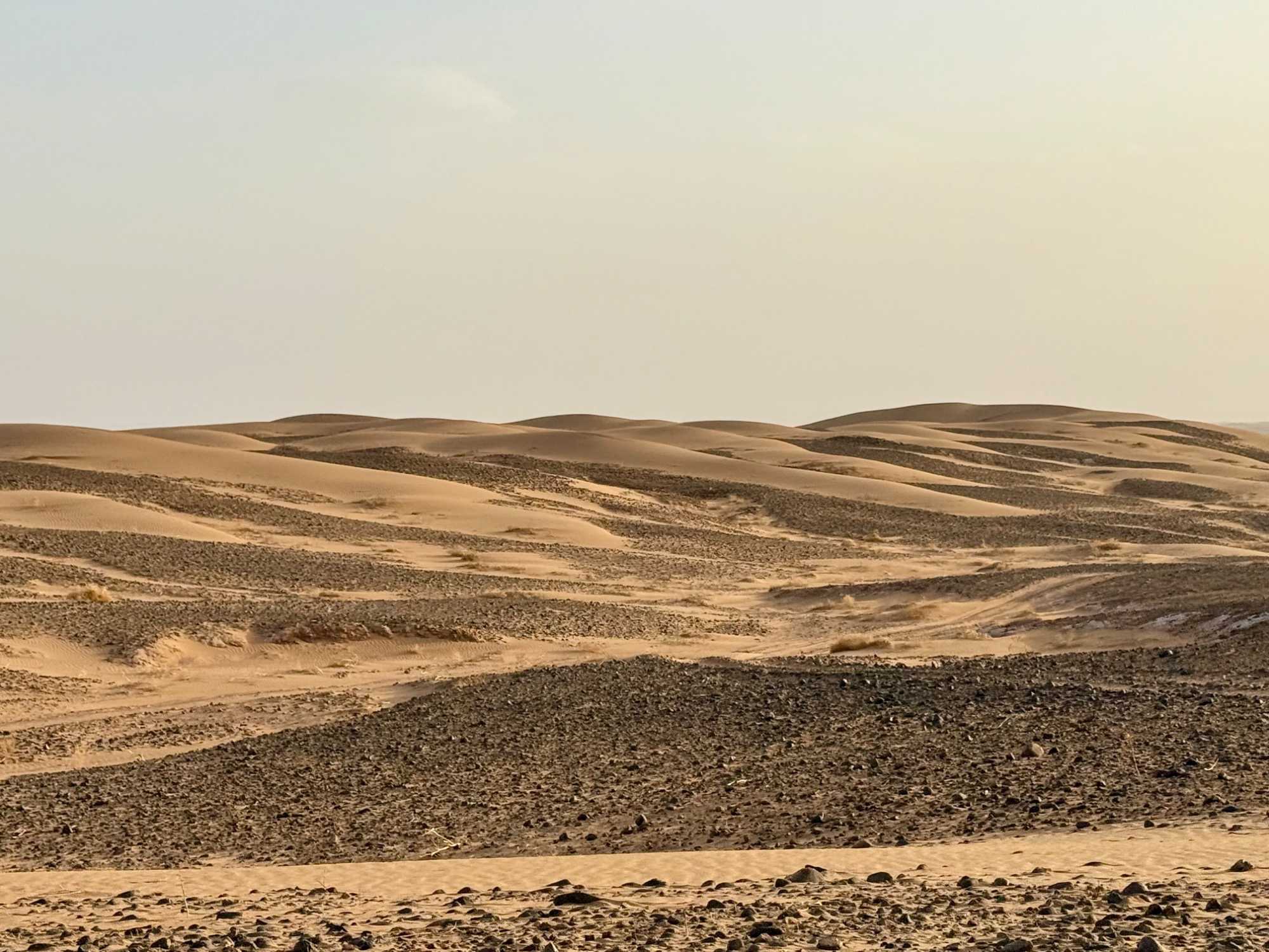 C’est ici que débute l’immensité. Le Sahara, le plus grand désert chaud du monde, s’étend sur près de 9 millions de kilomètres carrés à travers plusieurs pays. Dans cette région du Maroc, les dunes d’Erg Chegaga comptent parmi les plus vastes et les plus sauvages : elles s’étirent sur environ 40 kilomètres de long et peuvent atteindre jusqu’à 300 mètres de hauteur, offrant une mer de sable à perte de vue.