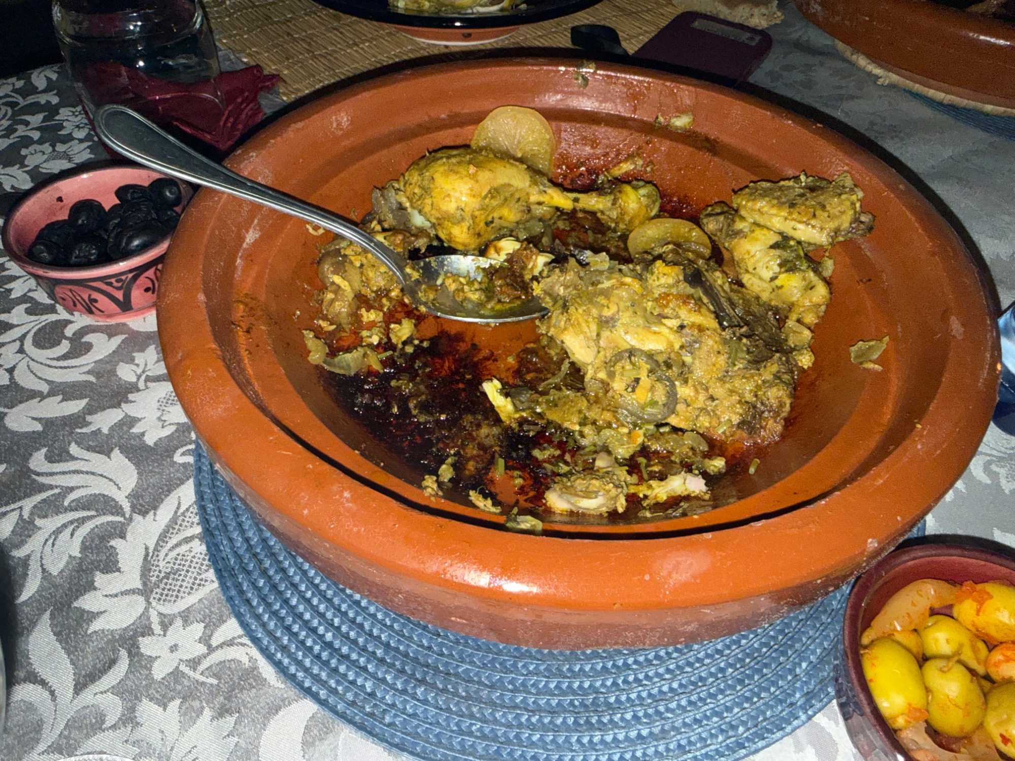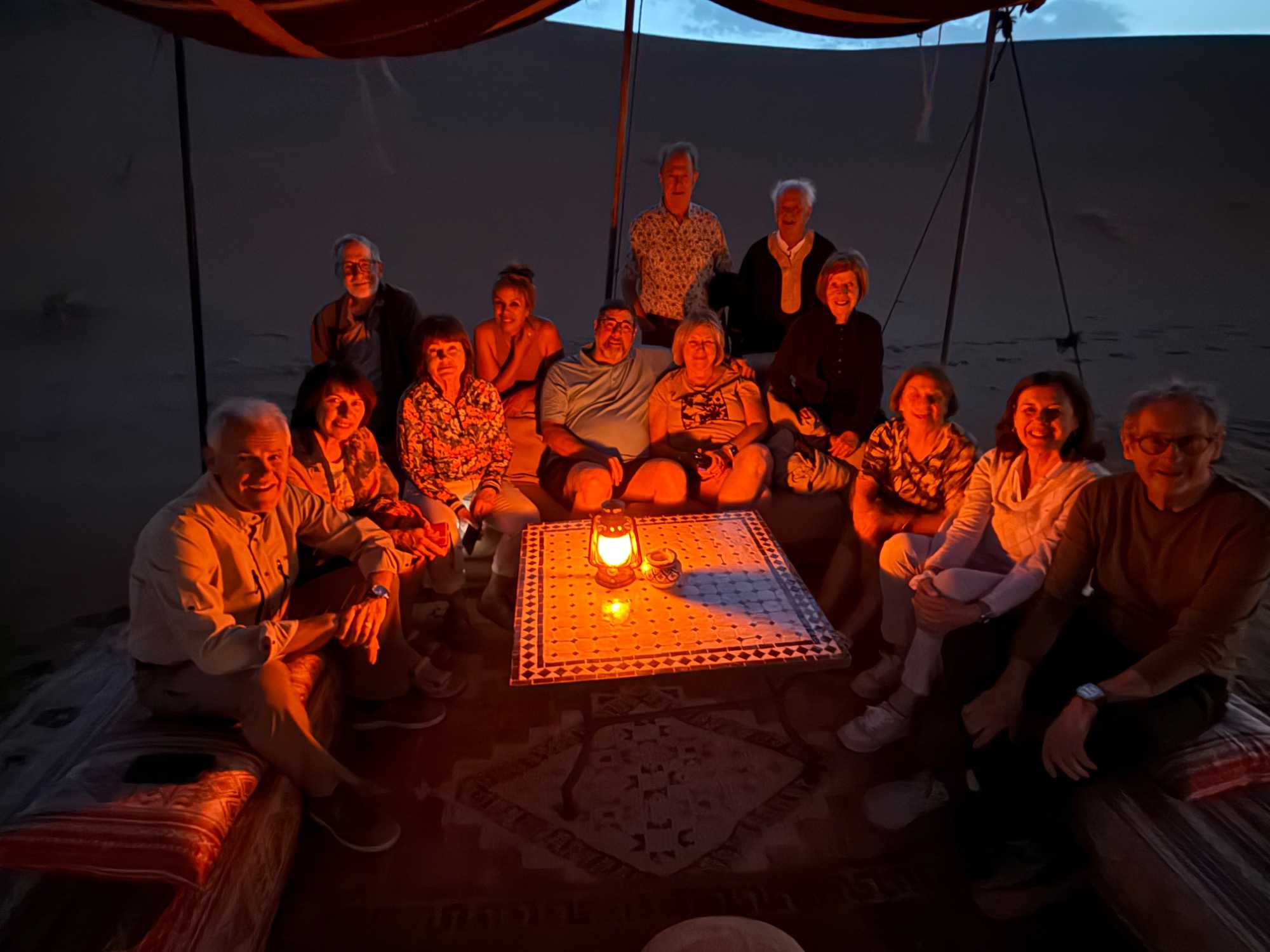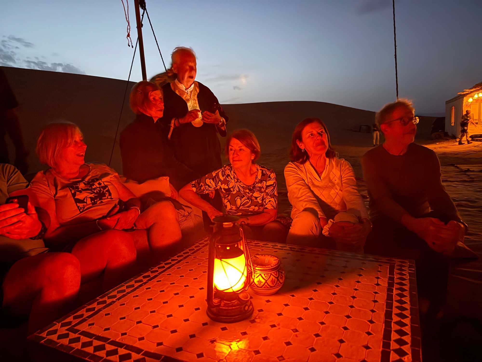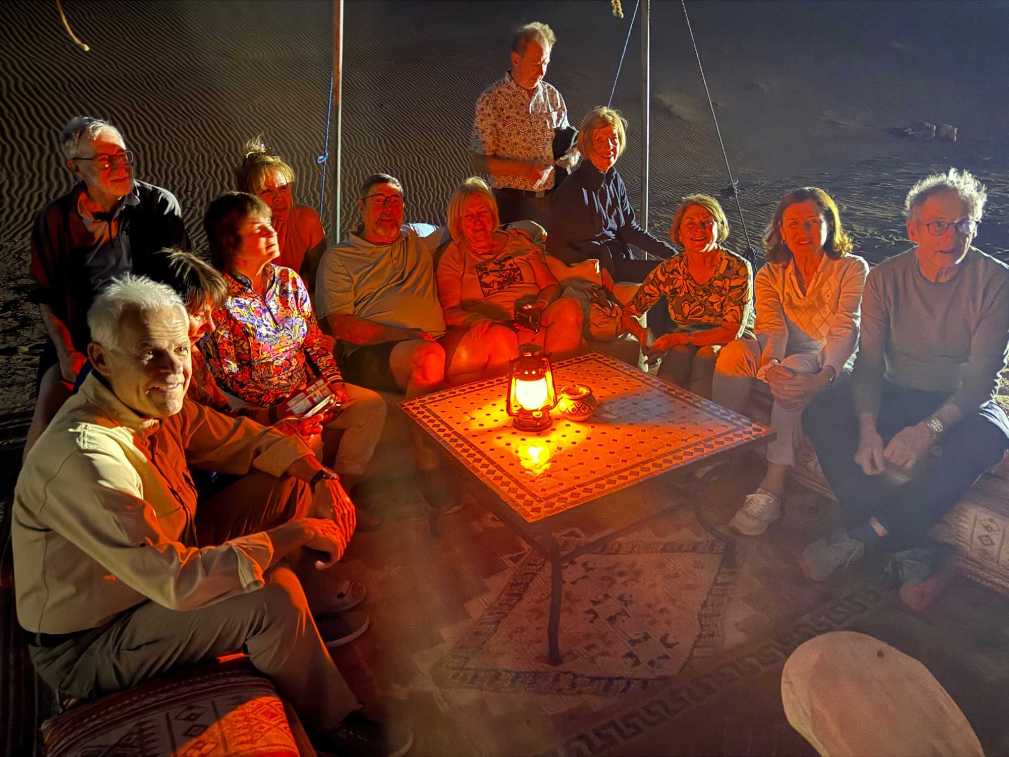 La soirée se poursuit autour d’un repas sous tente : tajine de poulet au citron, légumes, plats généreux et réconfortants. Manger ainsi, au cœur du désert, loin de tout, prend une dimension toute particulière.