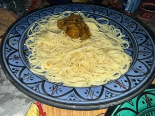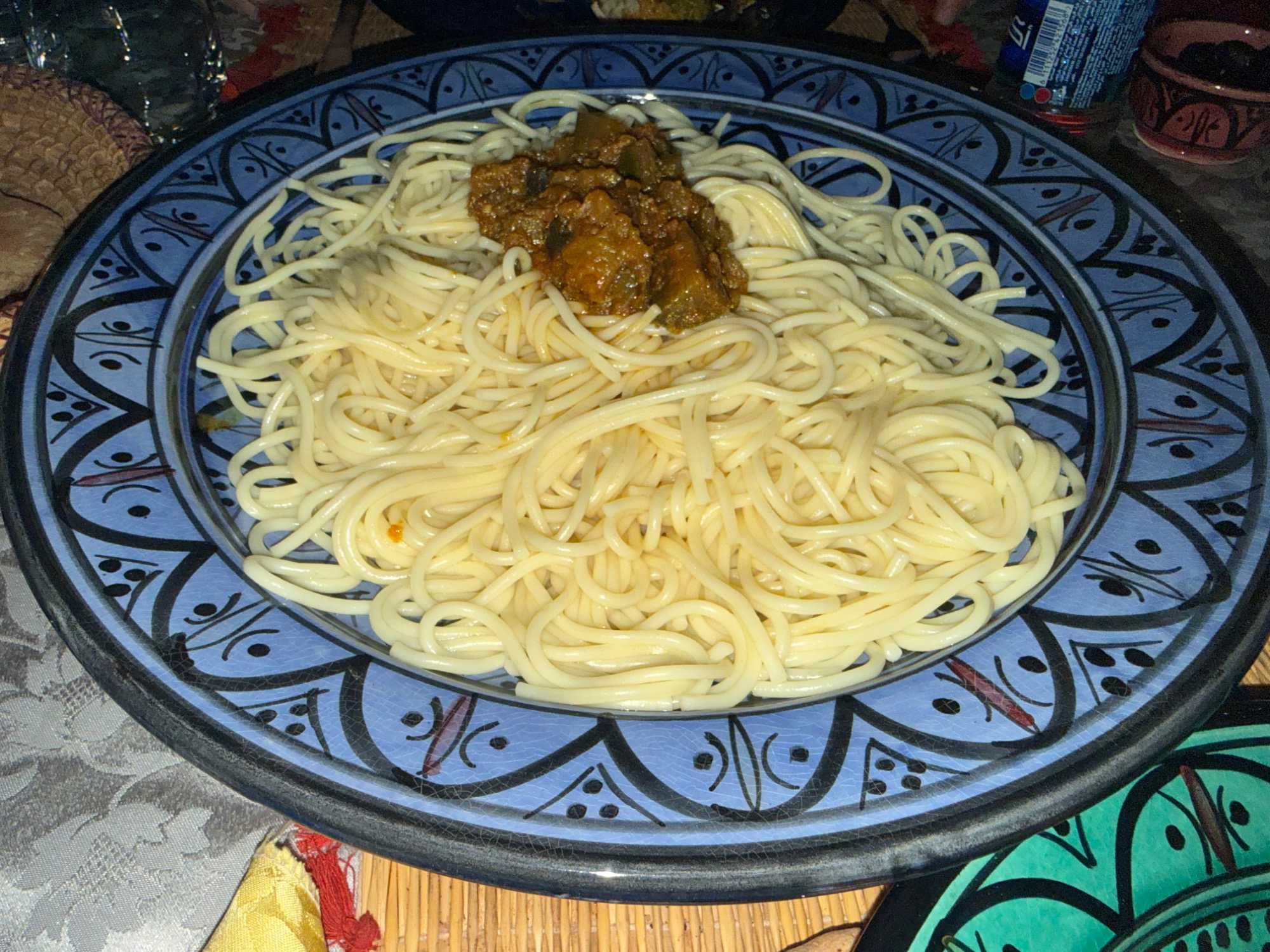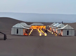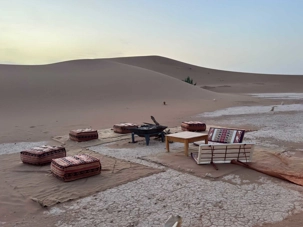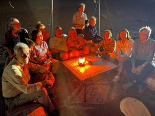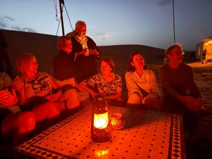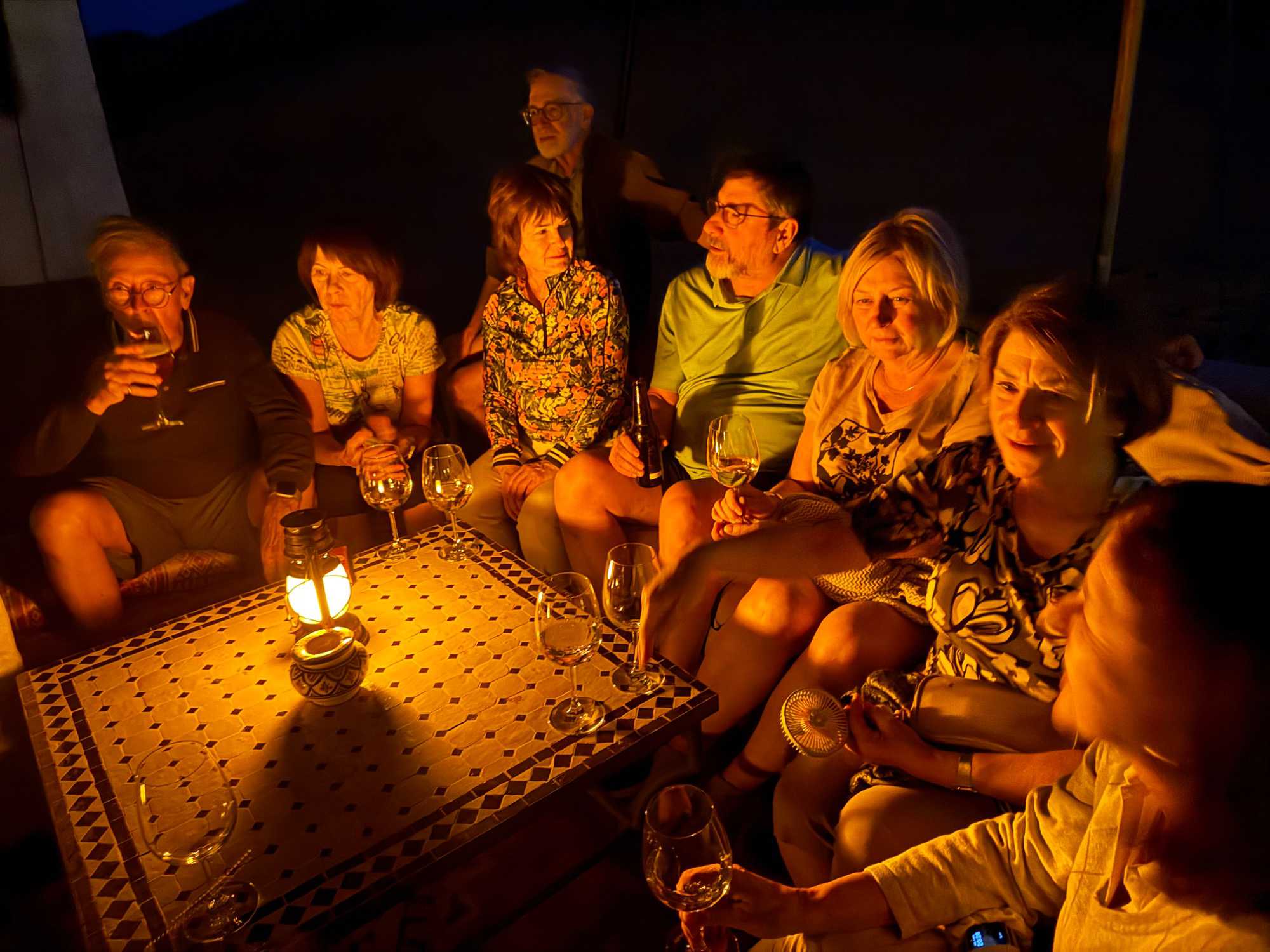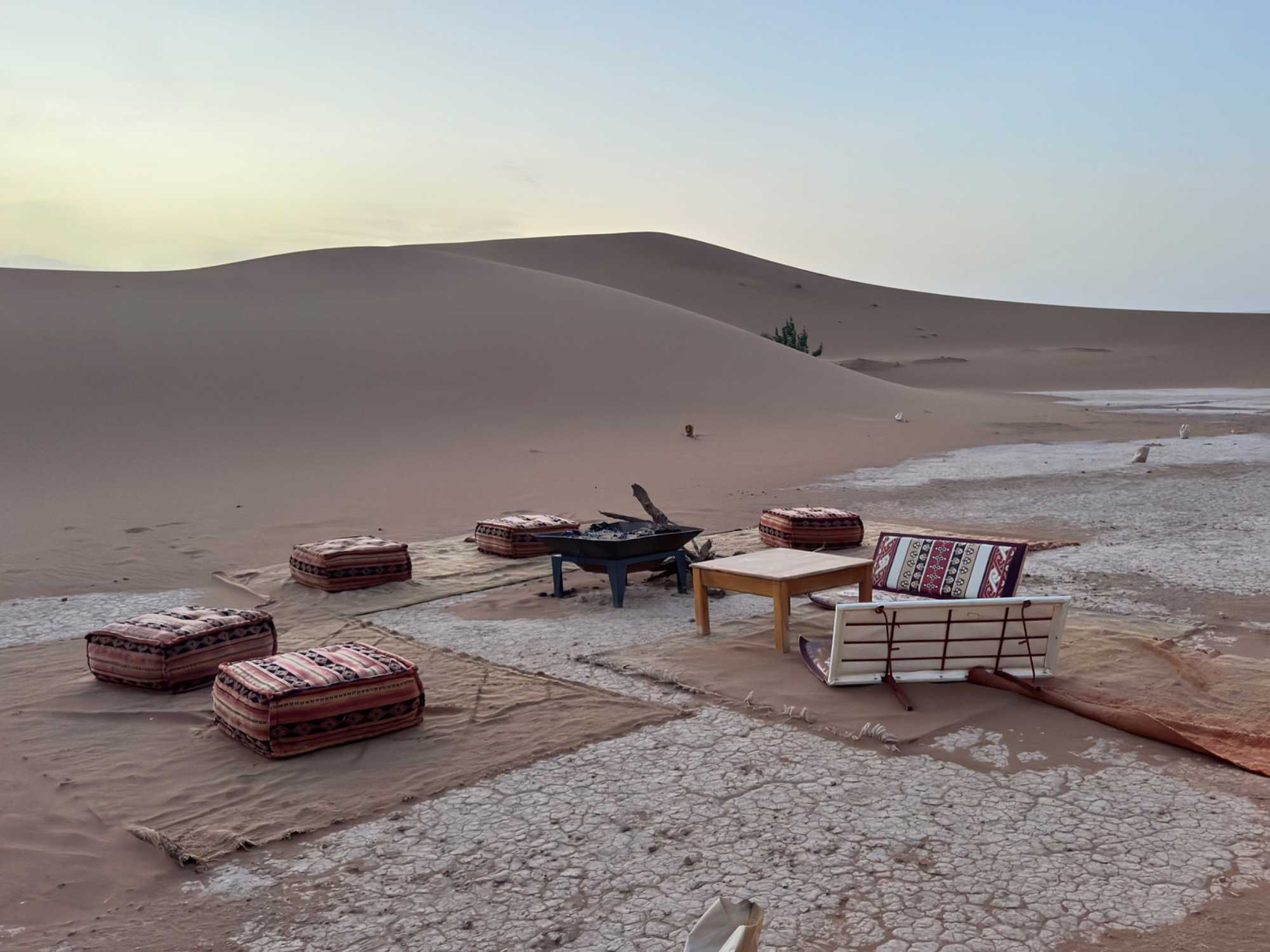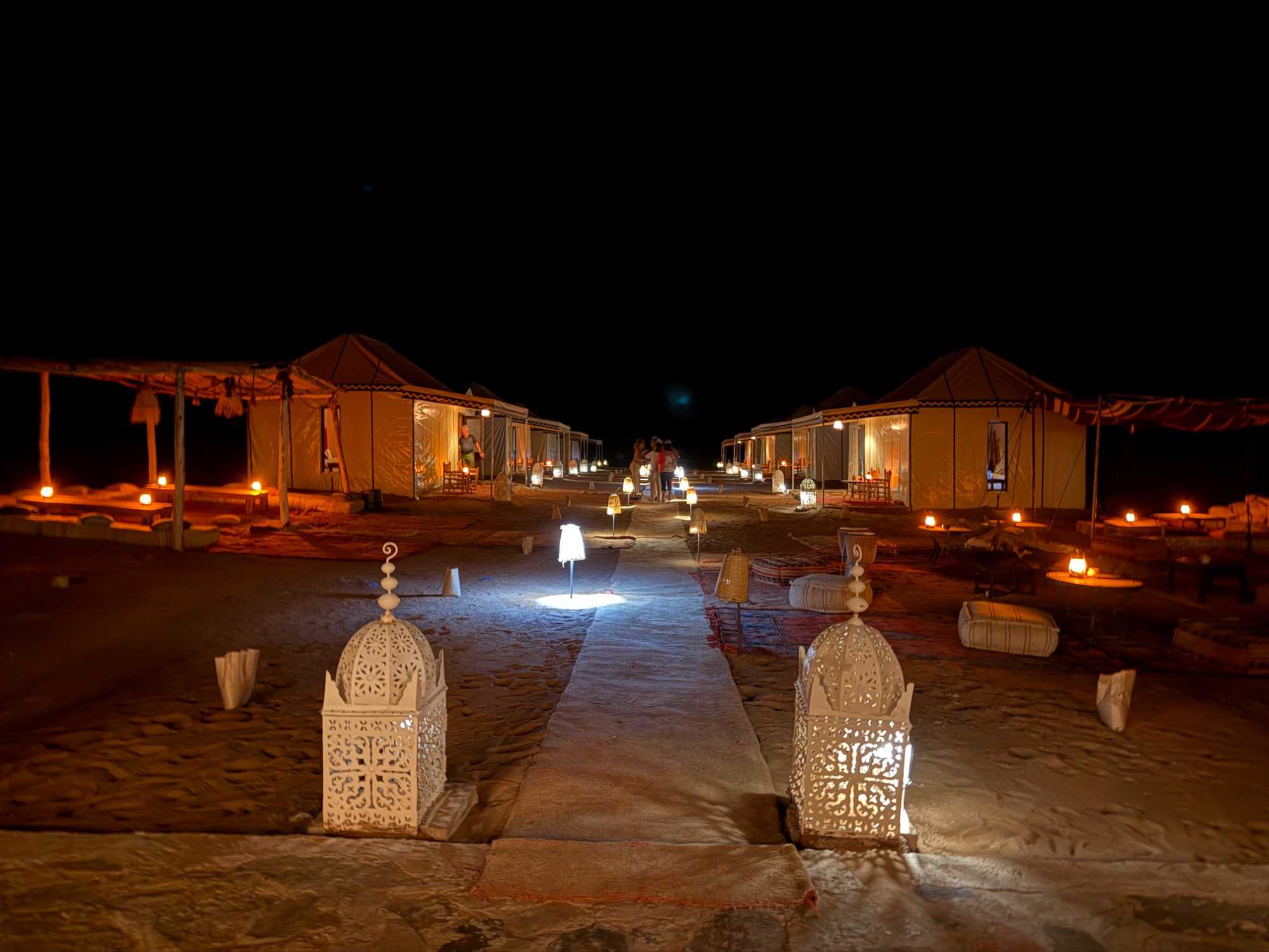 La soirée se poursuit autour d’un repas sous tente : tajine de poulet au citron, légumes, plats généreux et réconfortants. Manger ainsi, au cœur du désert, loin de tout, prend une dimension toute particulière.