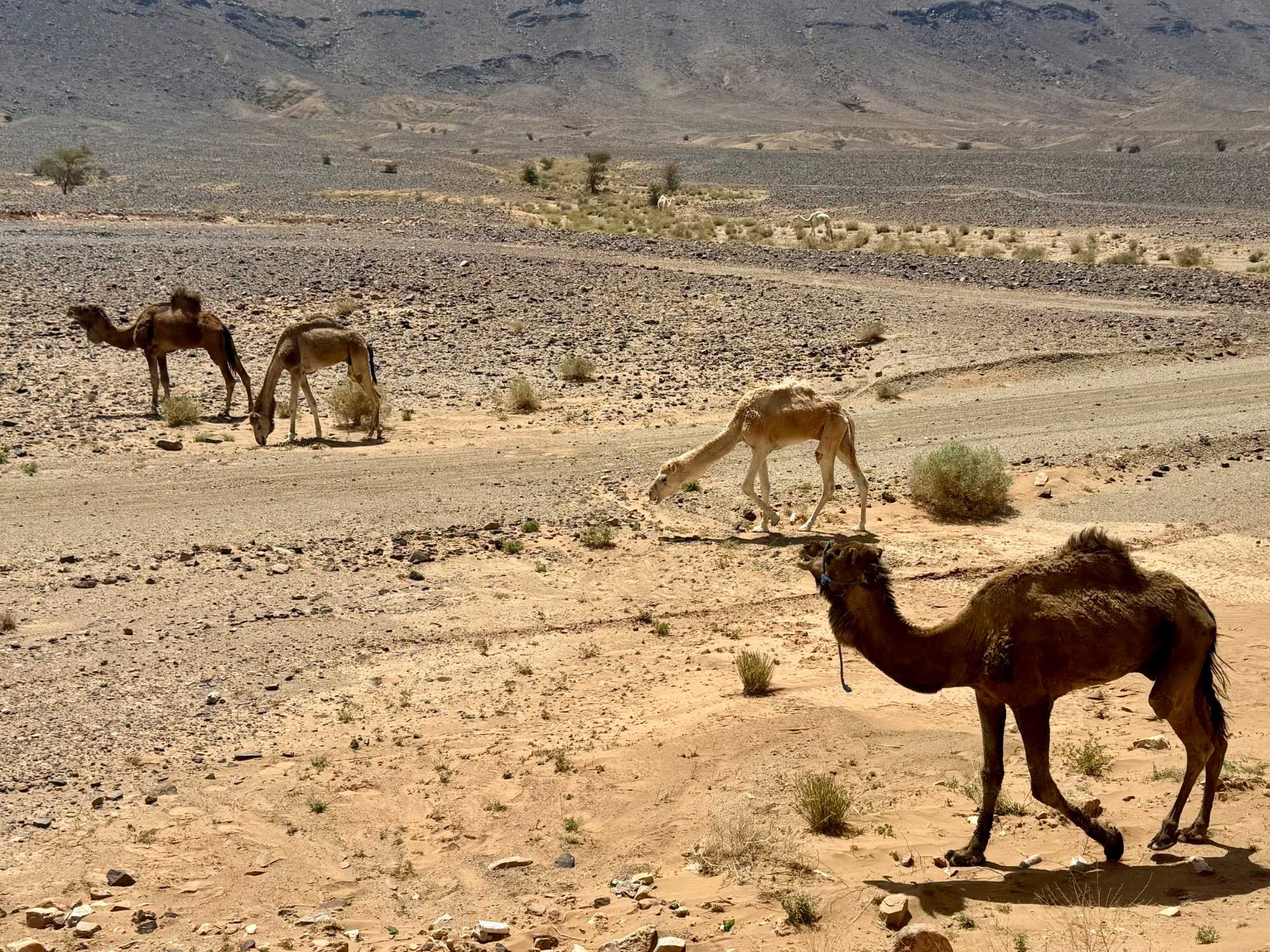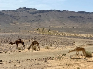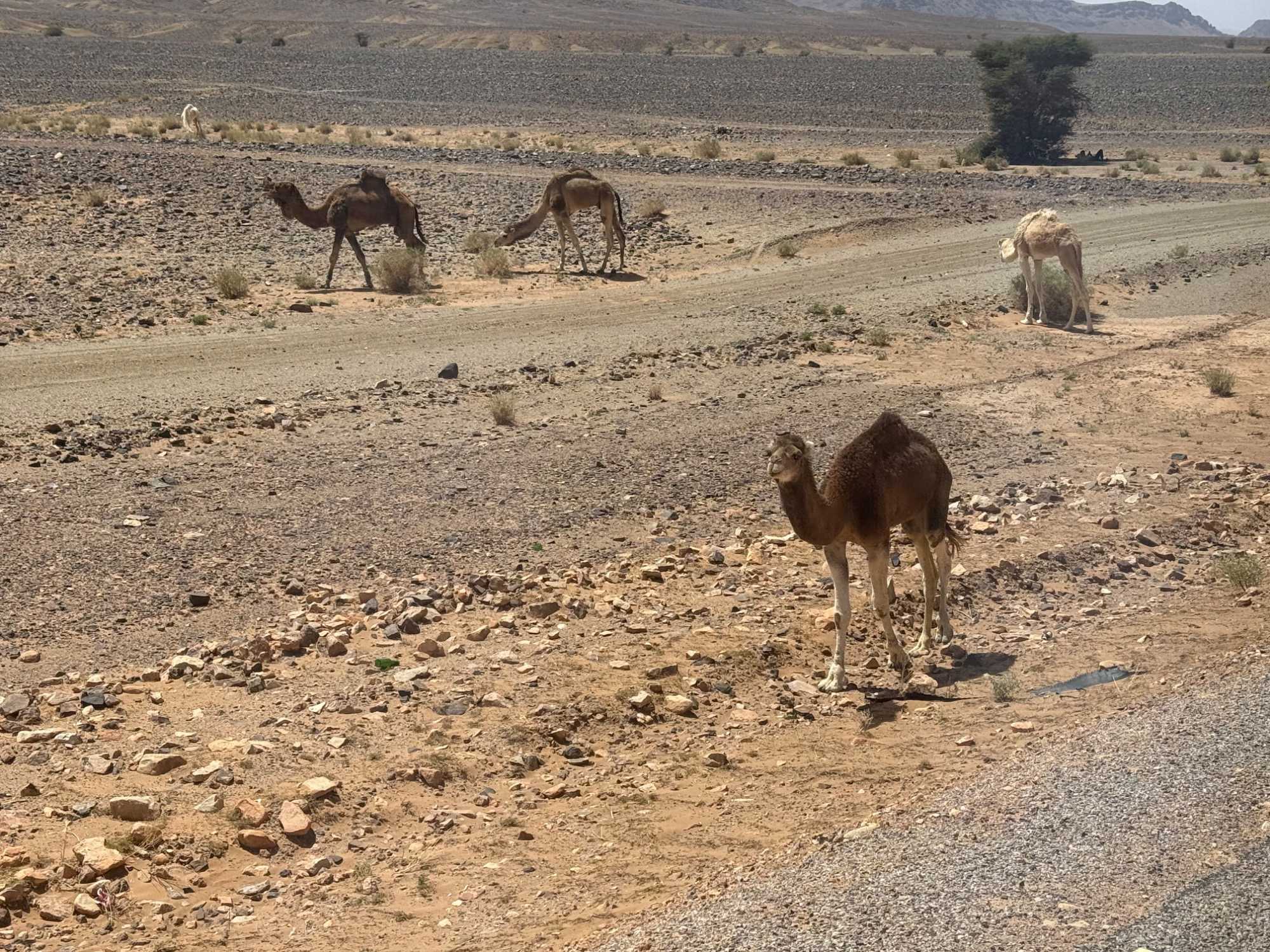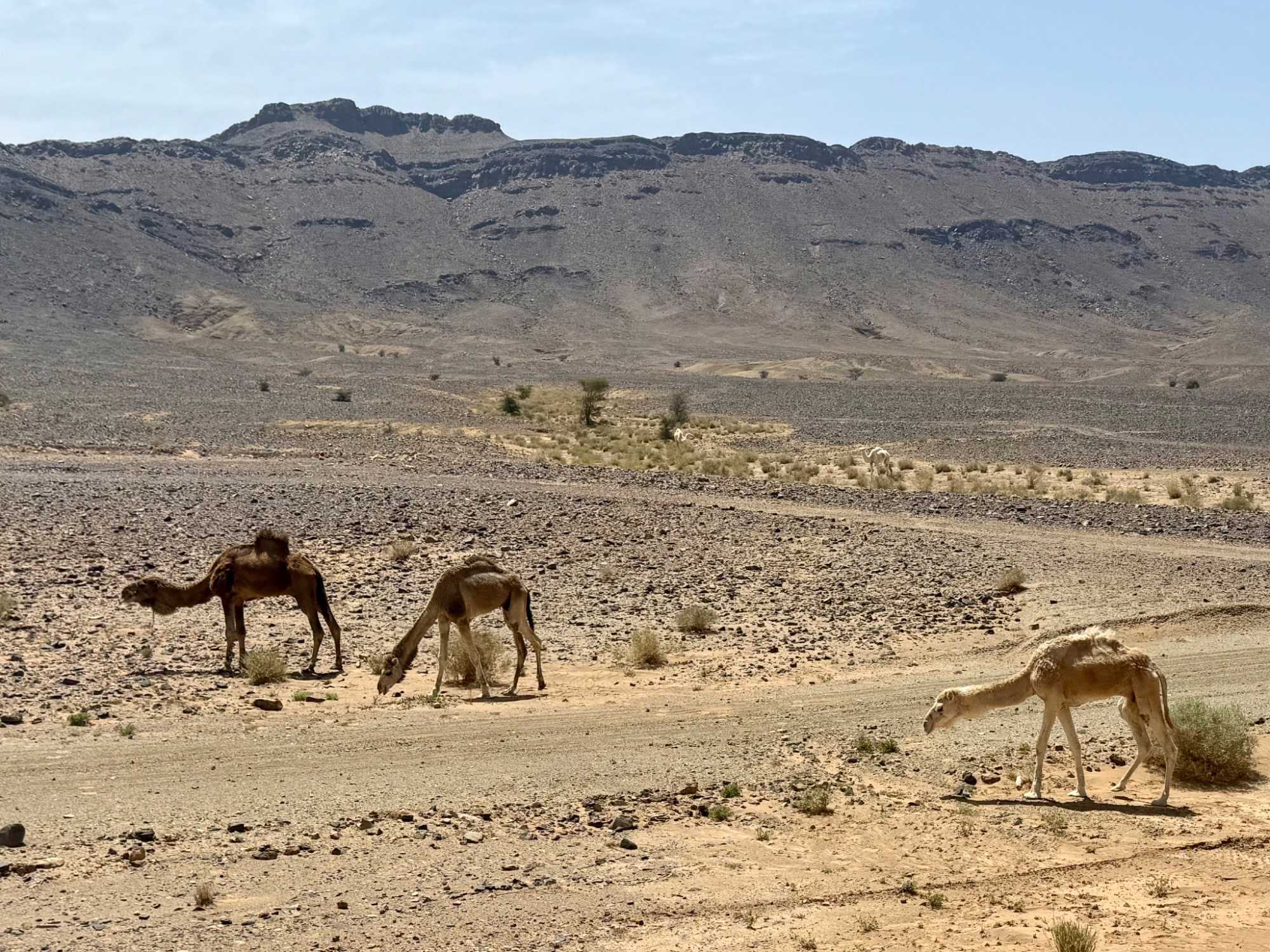 Au fil de la route, nous apprenons à reconnaître les oasis grâce aux palmiers dattiers qui les annoncent. Nous en apercevons quelques-unes, ainsi que des dromadaires, silhouettes tranquilles dans ce paysage désertique.