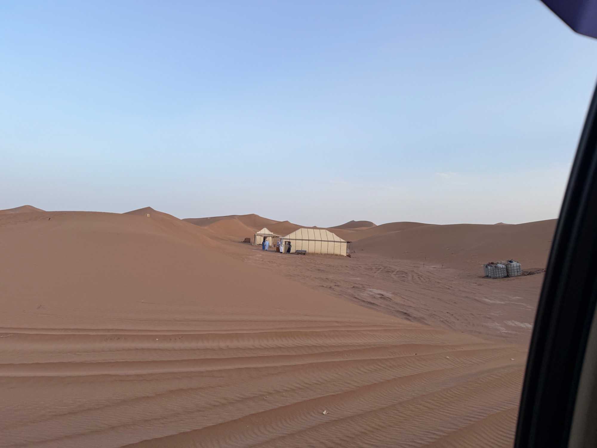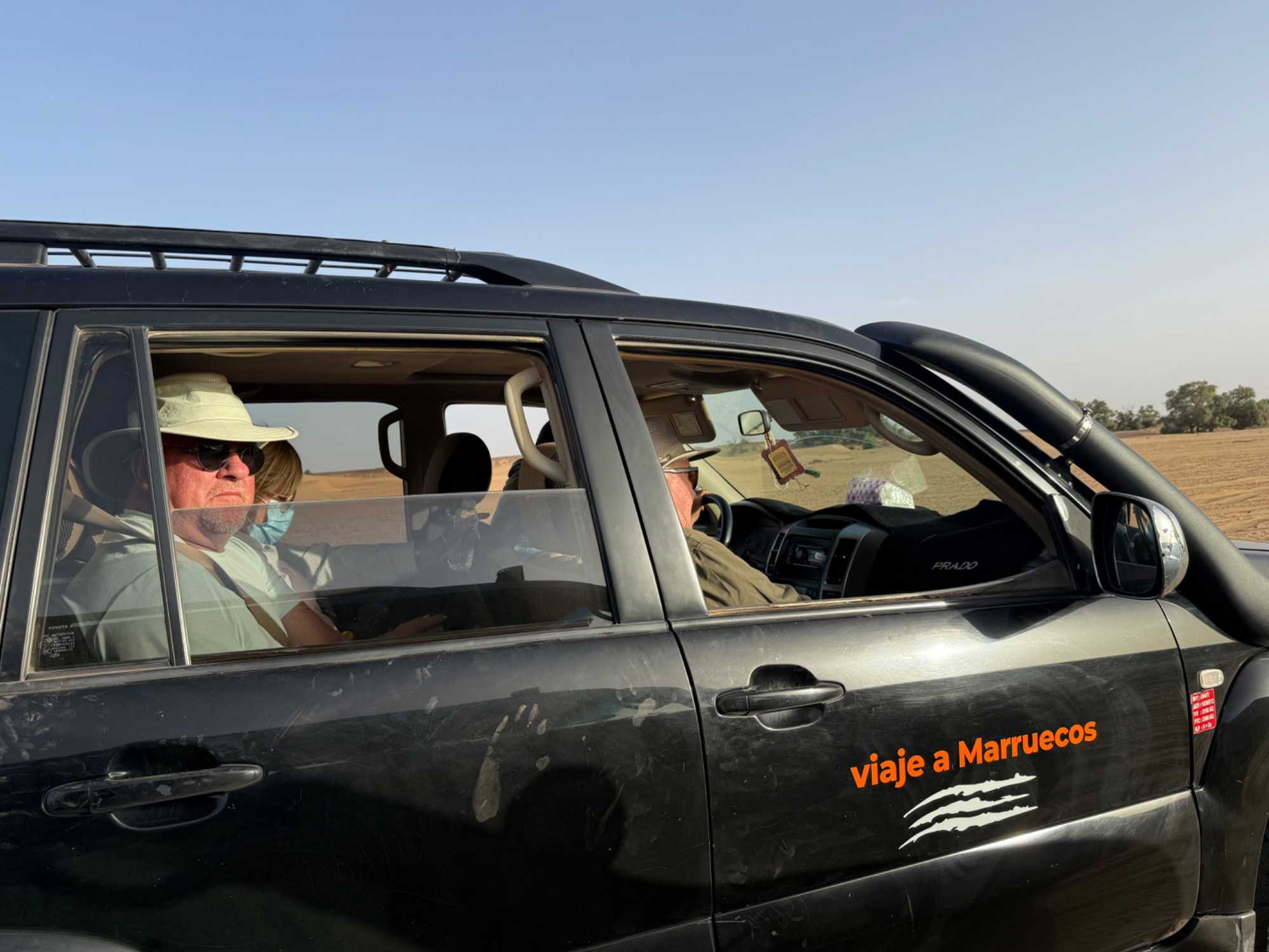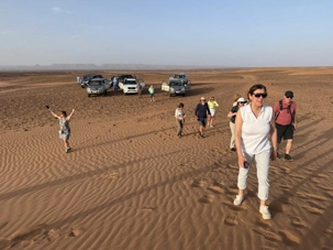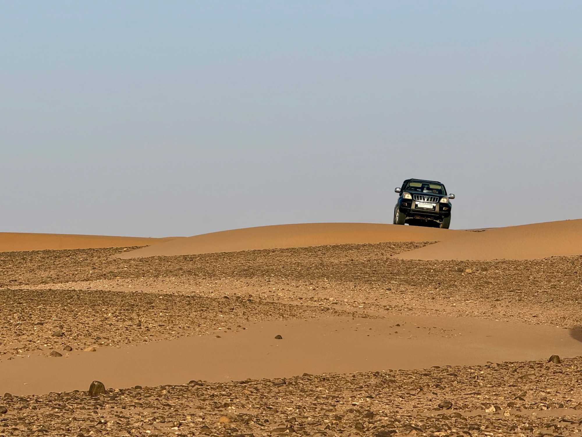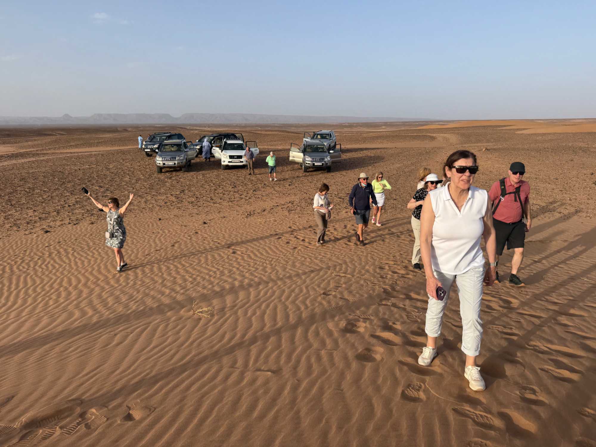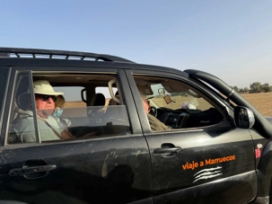 Nous embarquons à bord de nos Jeeps 4x4, quatre voyageurs par véhicule, accompagnés de conducteurs marocains chaleureux. La route devient piste, le paysage encore plus vaste, plus brut. Nous nous dirigeons vers M’Hamid, véritable porte d’entrée du Sahara marocain.