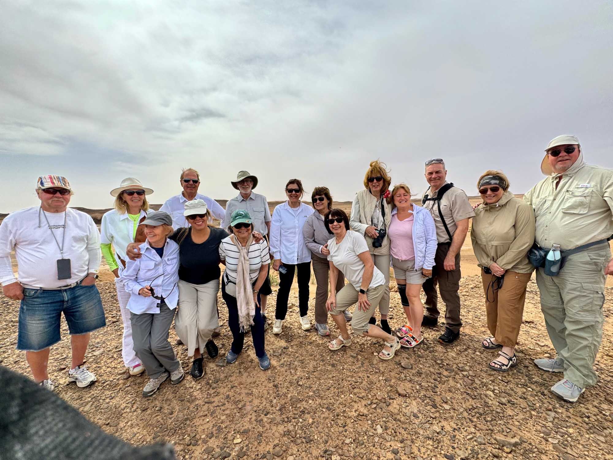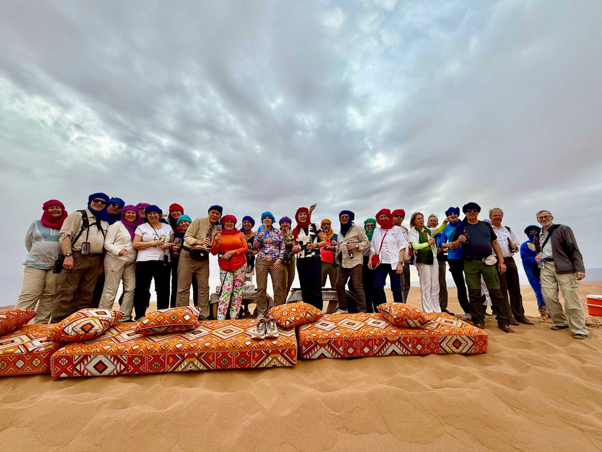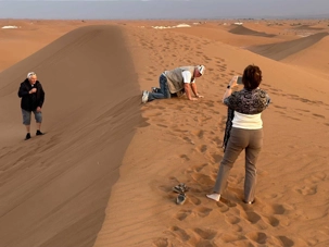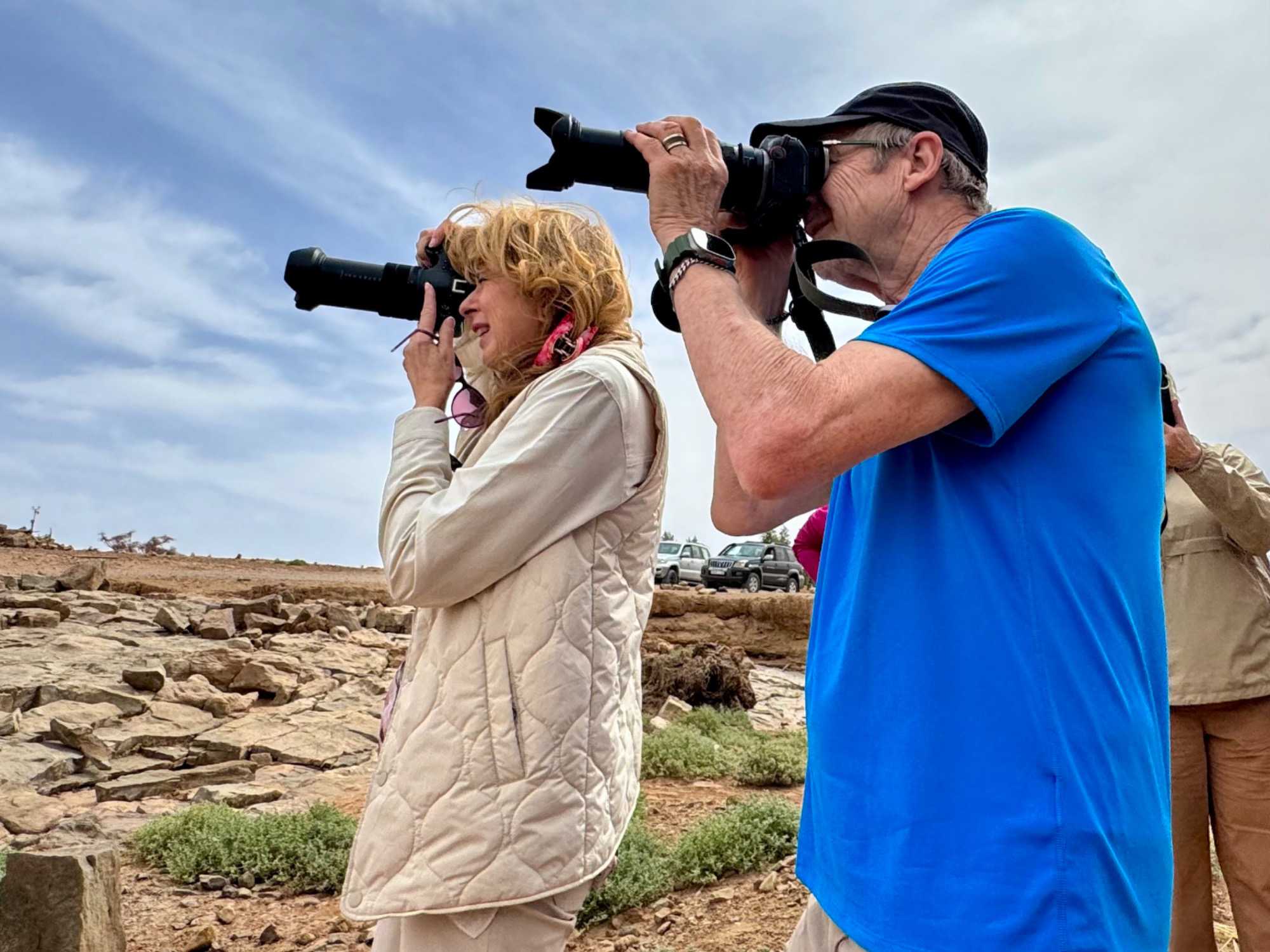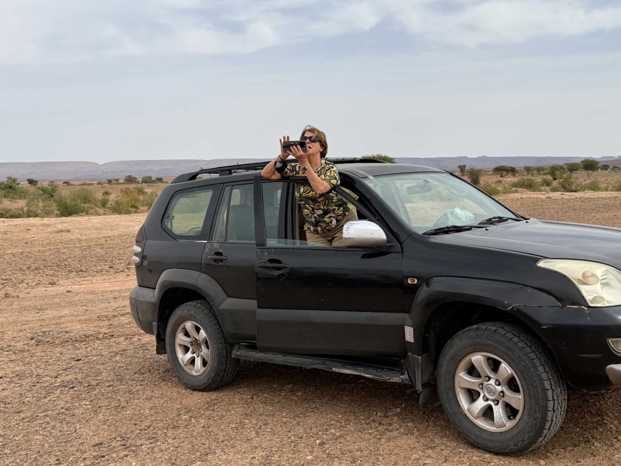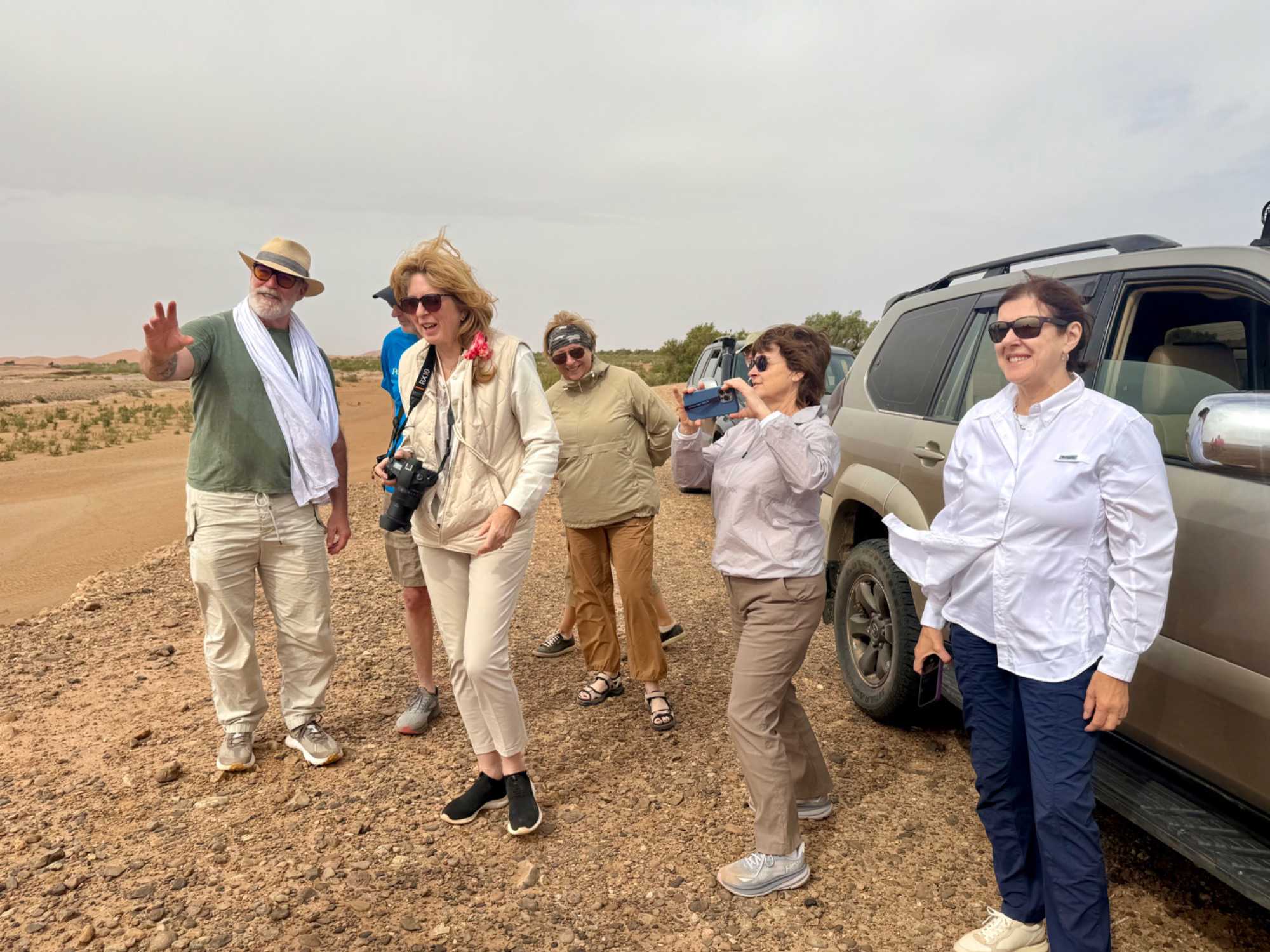 Nous repartons en Jeep pour explorer les environs, à la découverte du désert et de ses secrets. Très vite, les arrêts se transforment en moments de pur plaisir. Les photos s’enchaînent, les rires aussi. Ce que j’appelle le « moment couleurs » : chacun s’exprime, s’amuse, ose. Le désert devient un terrain de jeu où la spontanéité du groupe s’exprime pleinement.