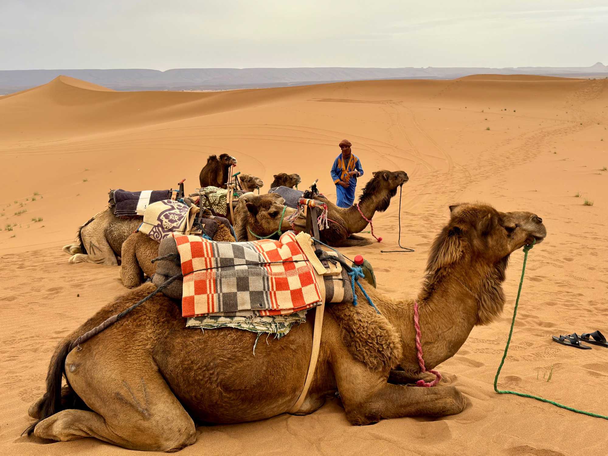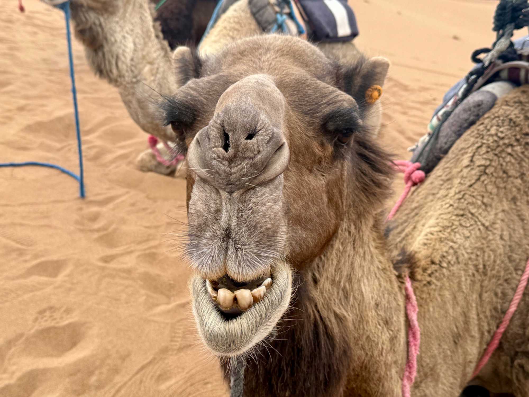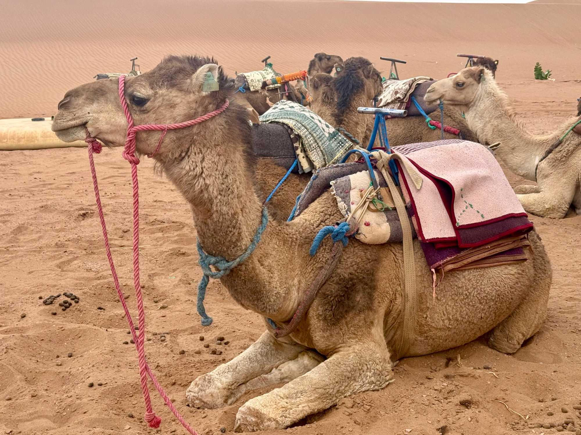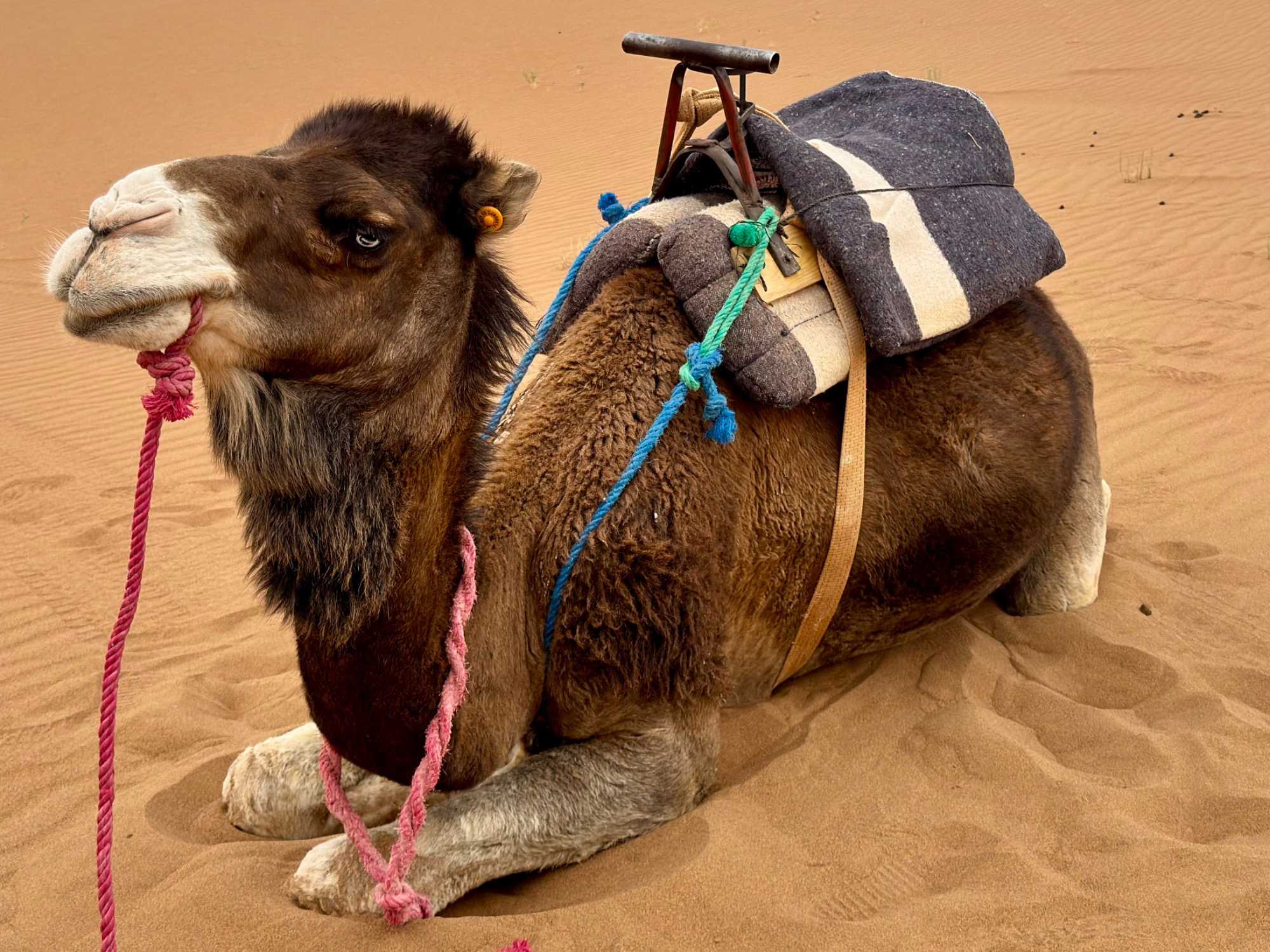 Il est intéressant de rappeler ici que nous sommes bien sur des dromadaires, et non des chameaux. Le dromadaire possède une seule bosse et est parfaitement adapté aux climats chauds et désertiques, comme ceux du Sahara. Le chameau, quant à lui, possède deux bosses et vit plutôt dans les régions d’Asie centrale, où les conditions sont beaucoup plus froides. Deux animaux cousins, mais adaptés à des environnements bien différents.