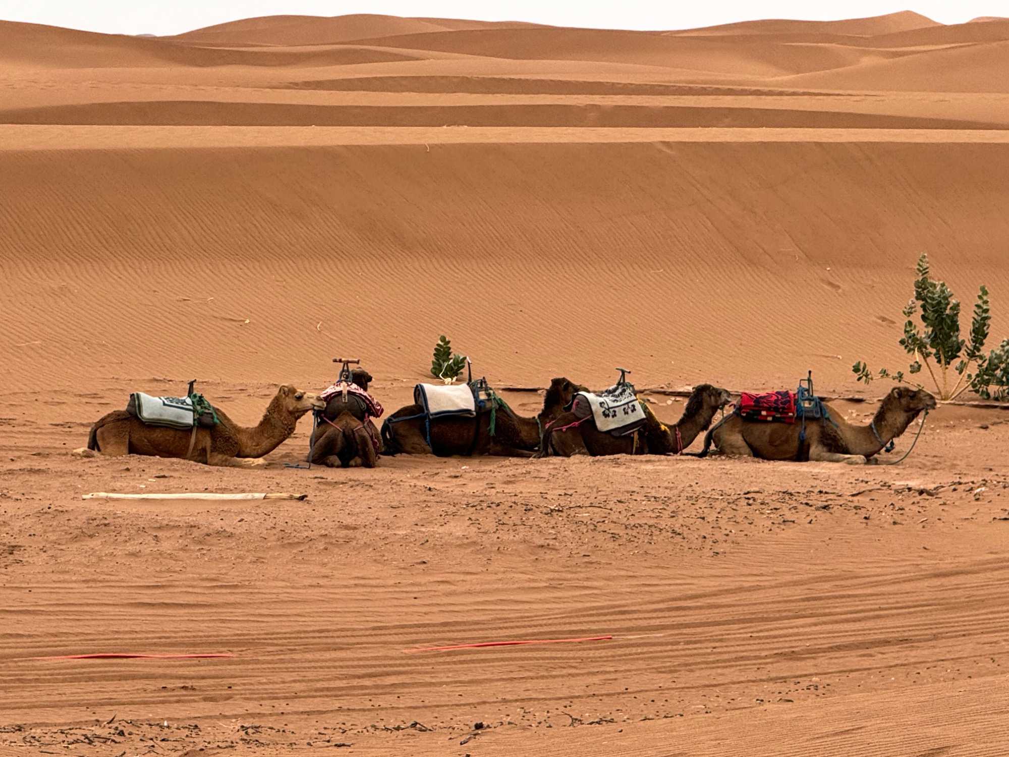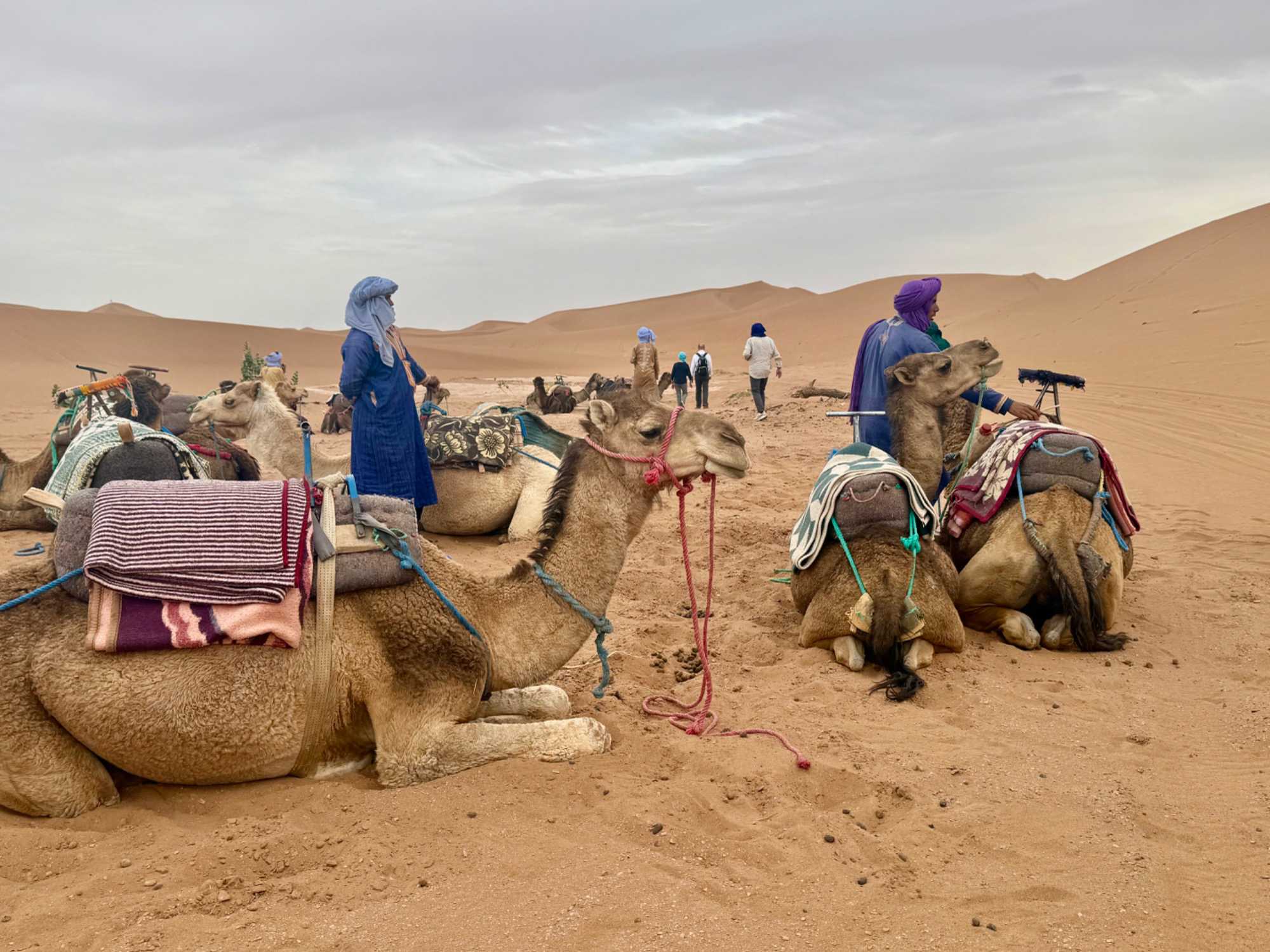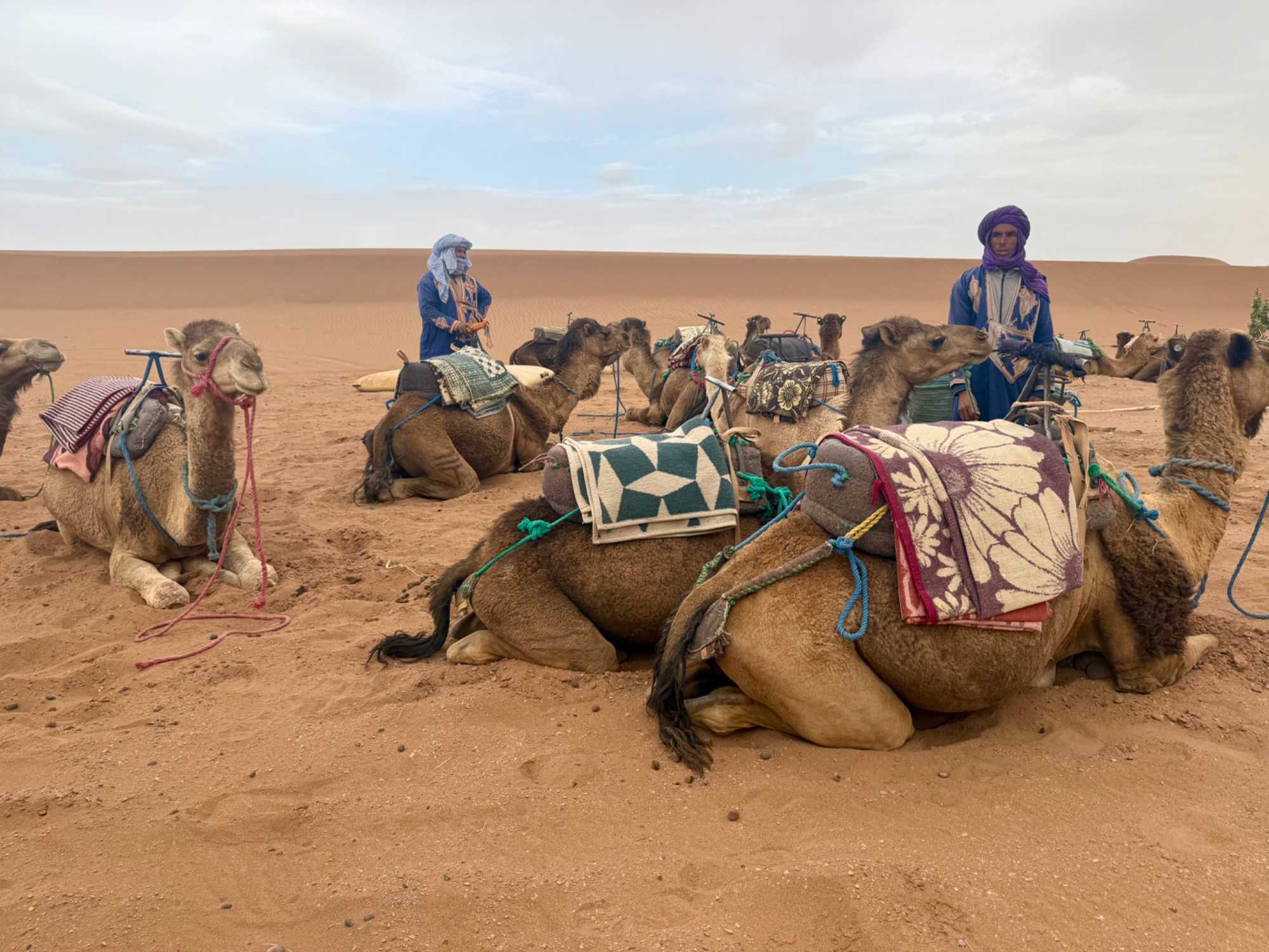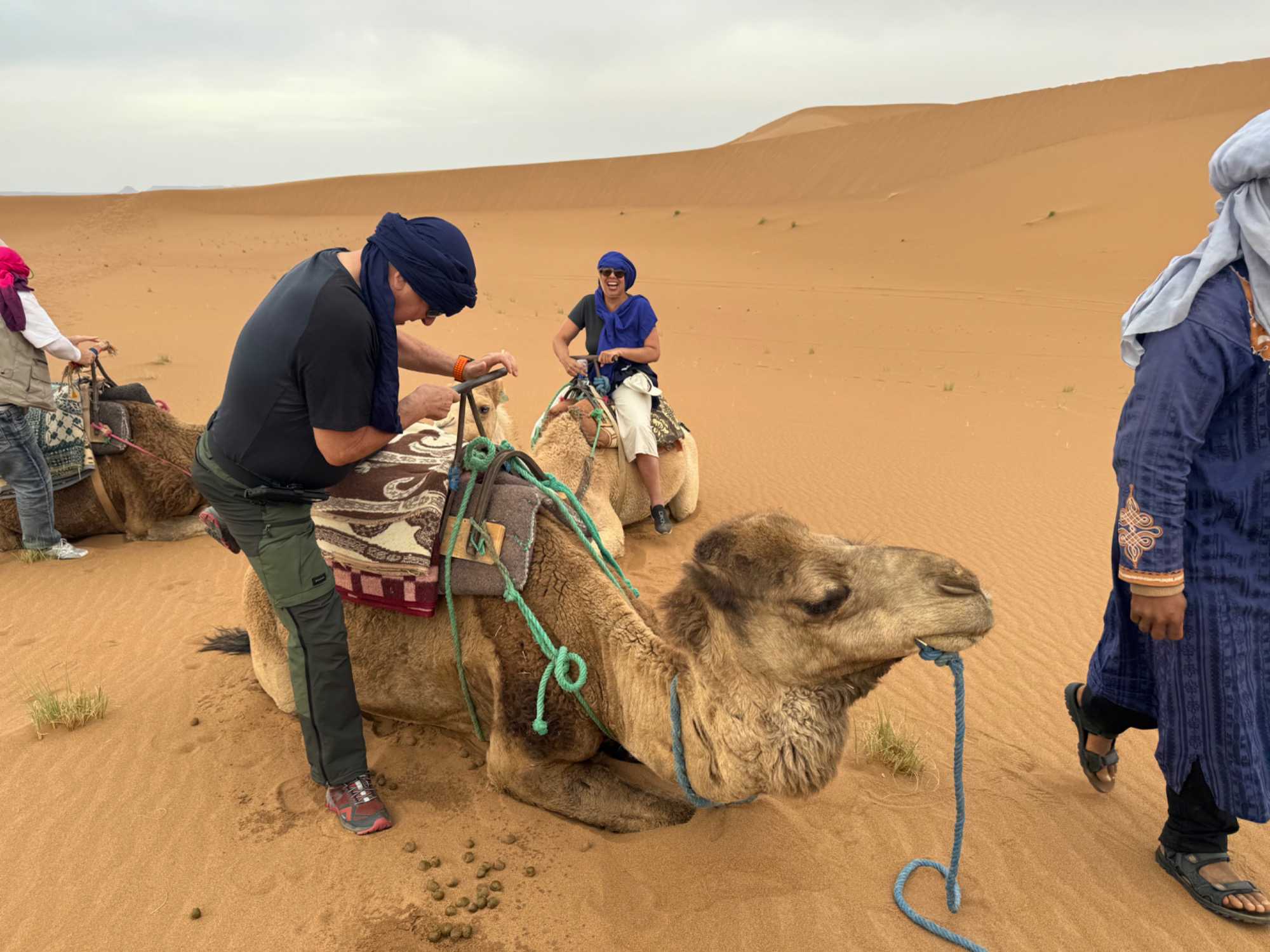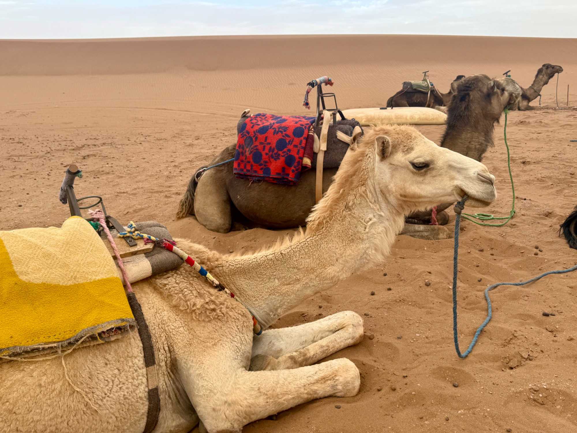 Il est intéressant de rappeler ici que nous sommes bien sur des dromadaires, et non des chameaux. Le dromadaire possède une seule bosse et est parfaitement adapté aux climats chauds et désertiques, comme ceux du Sahara. Le chameau, quant à lui, possède deux bosses et vit plutôt dans les régions d’Asie centrale, où les conditions sont beaucoup plus froides. Deux animaux cousins, mais adaptés à des environnements bien différents.