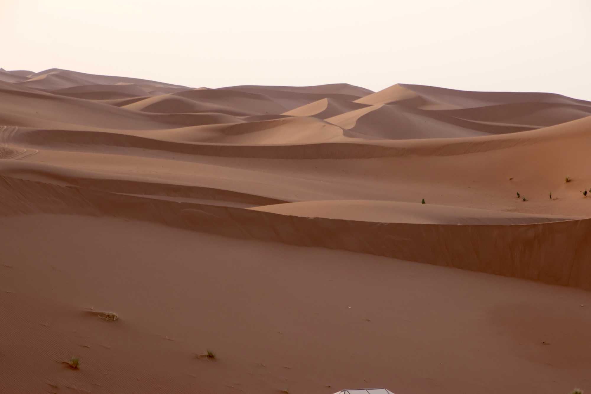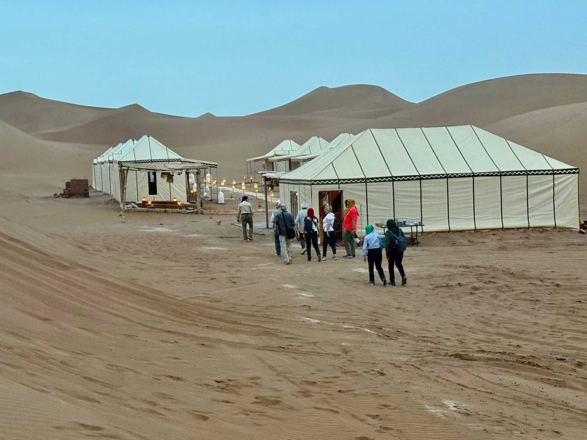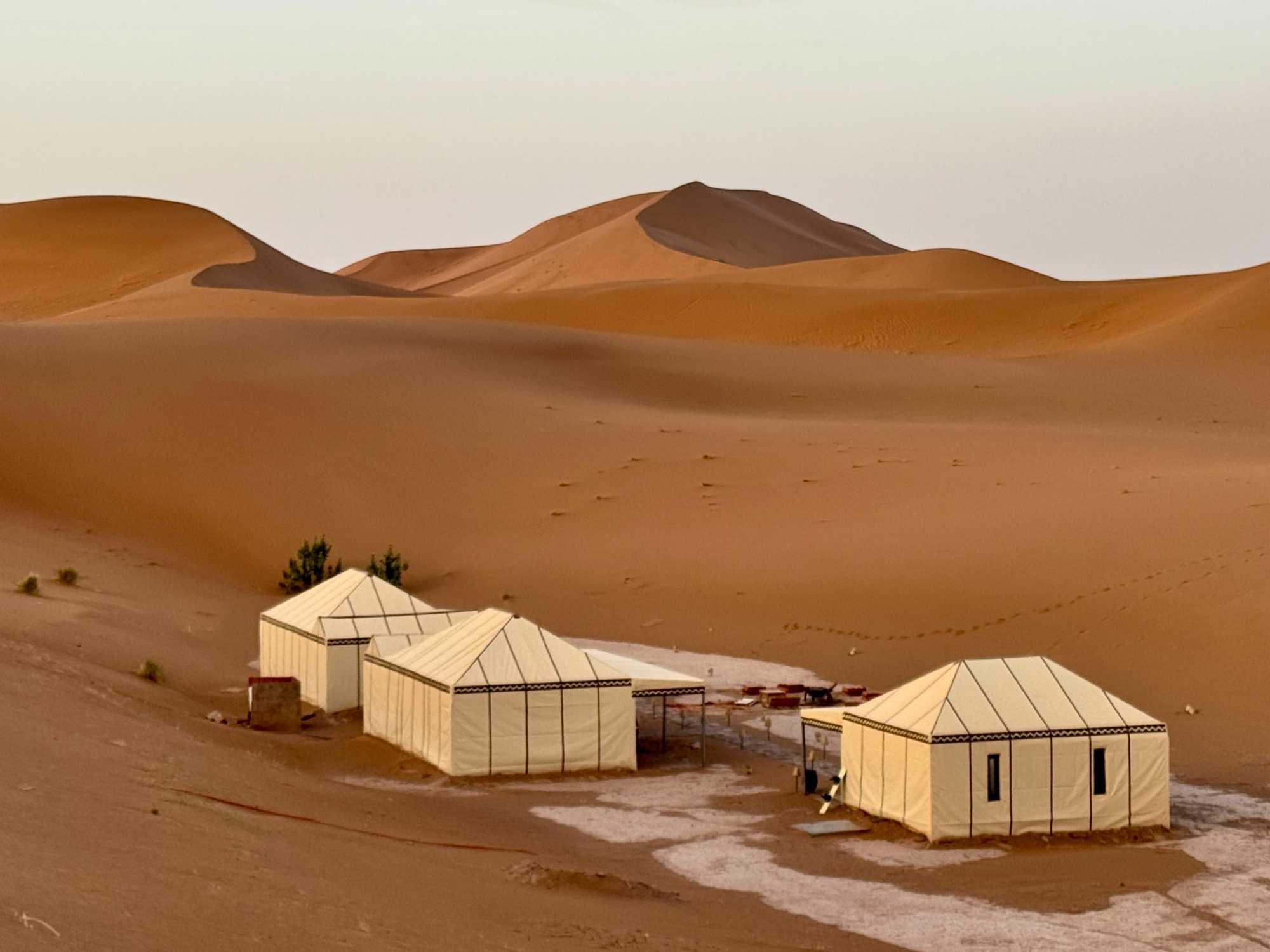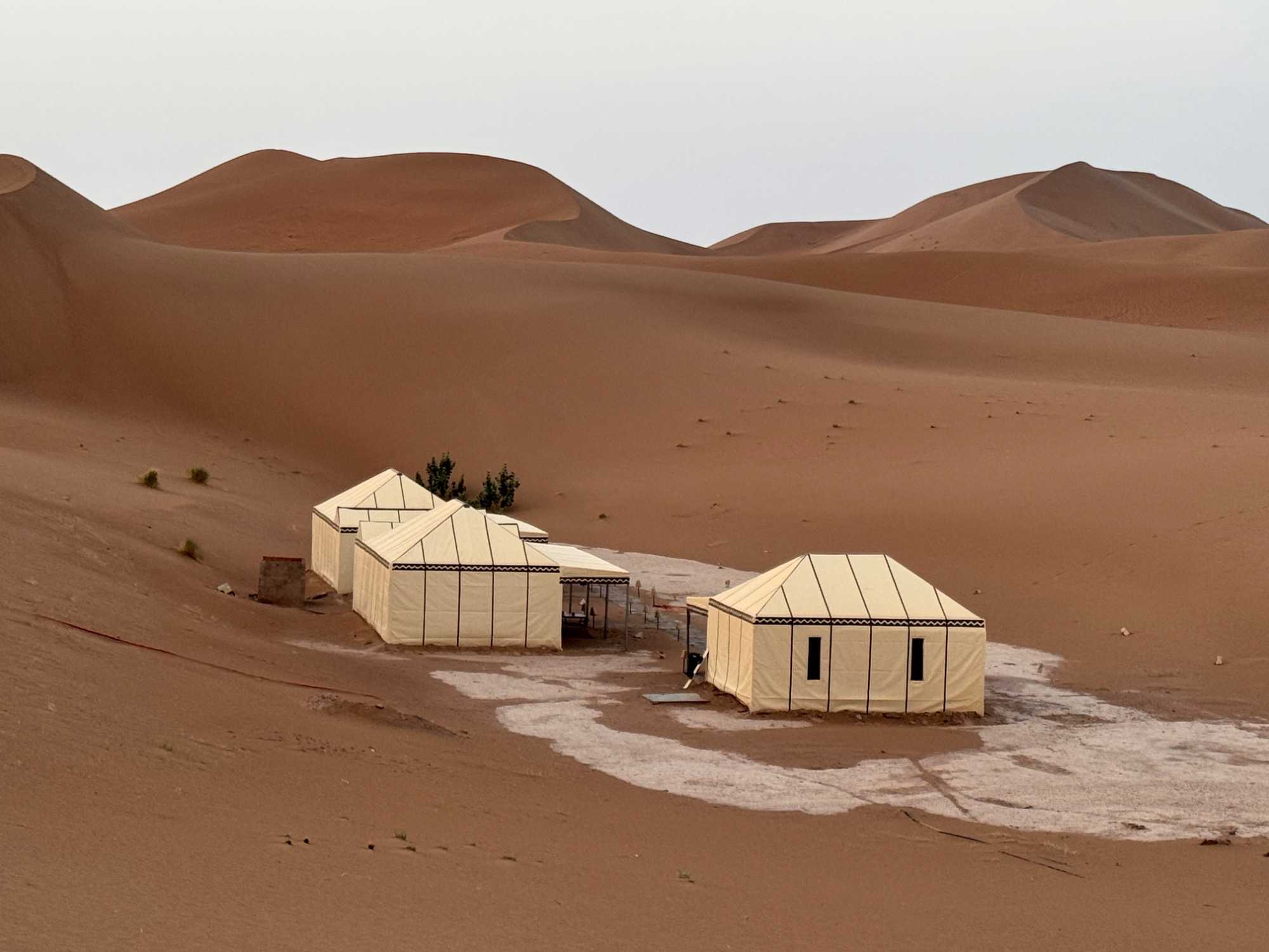 La lumière du matin est unique ici. Les installations blanches de notre campement contrastent avec les teintes rougeâtres du sable, protégées par les dunes qui les enveloppent. La température, douce et agréable, avoisinait les 14 degrés — un confort que peu imaginent lorsqu’on pense au Sahara.