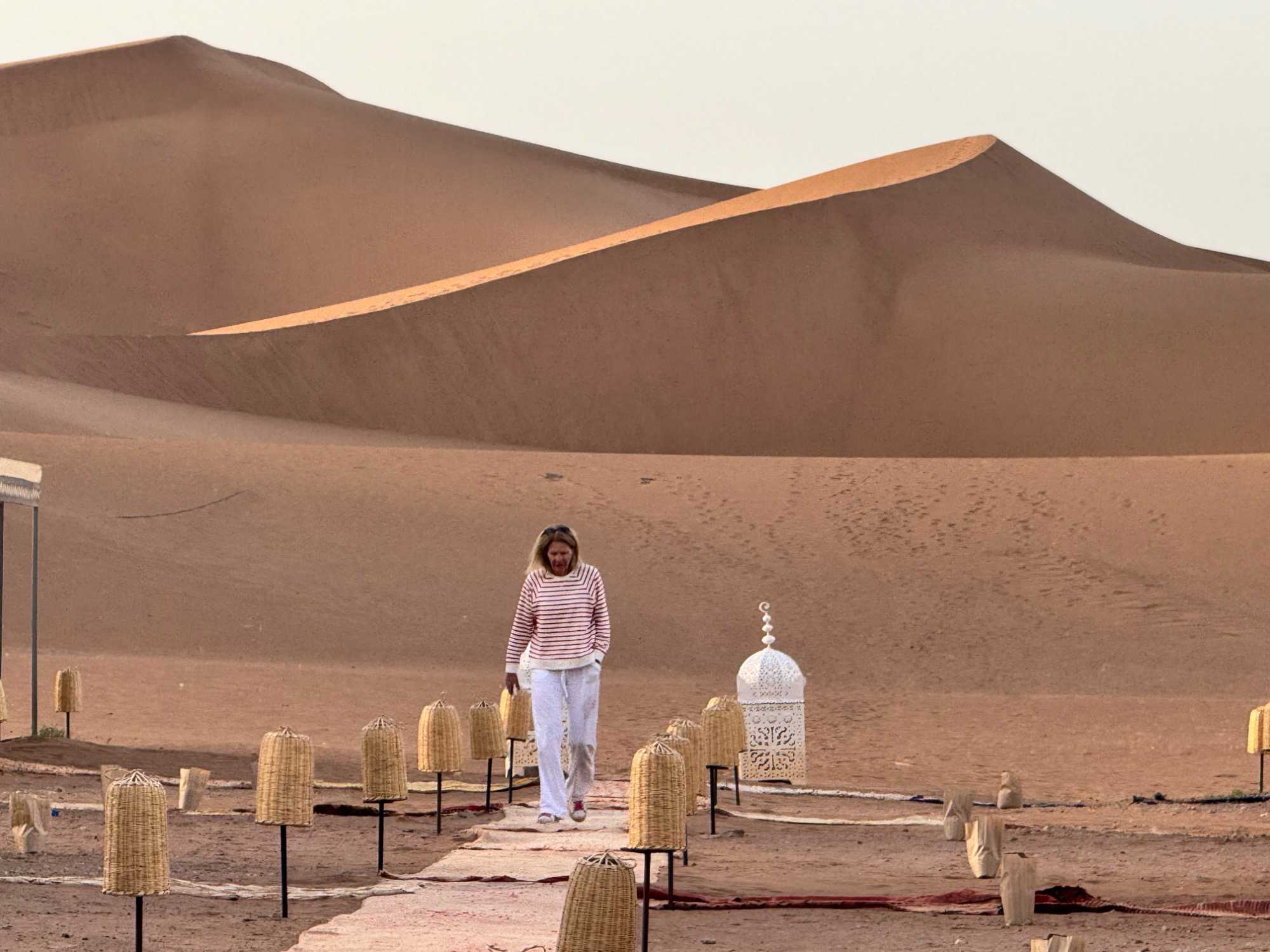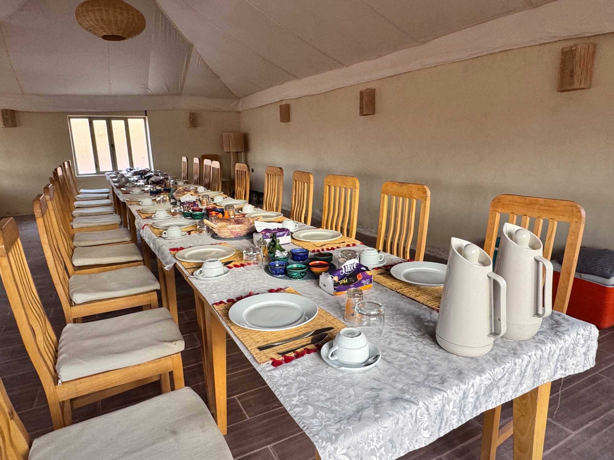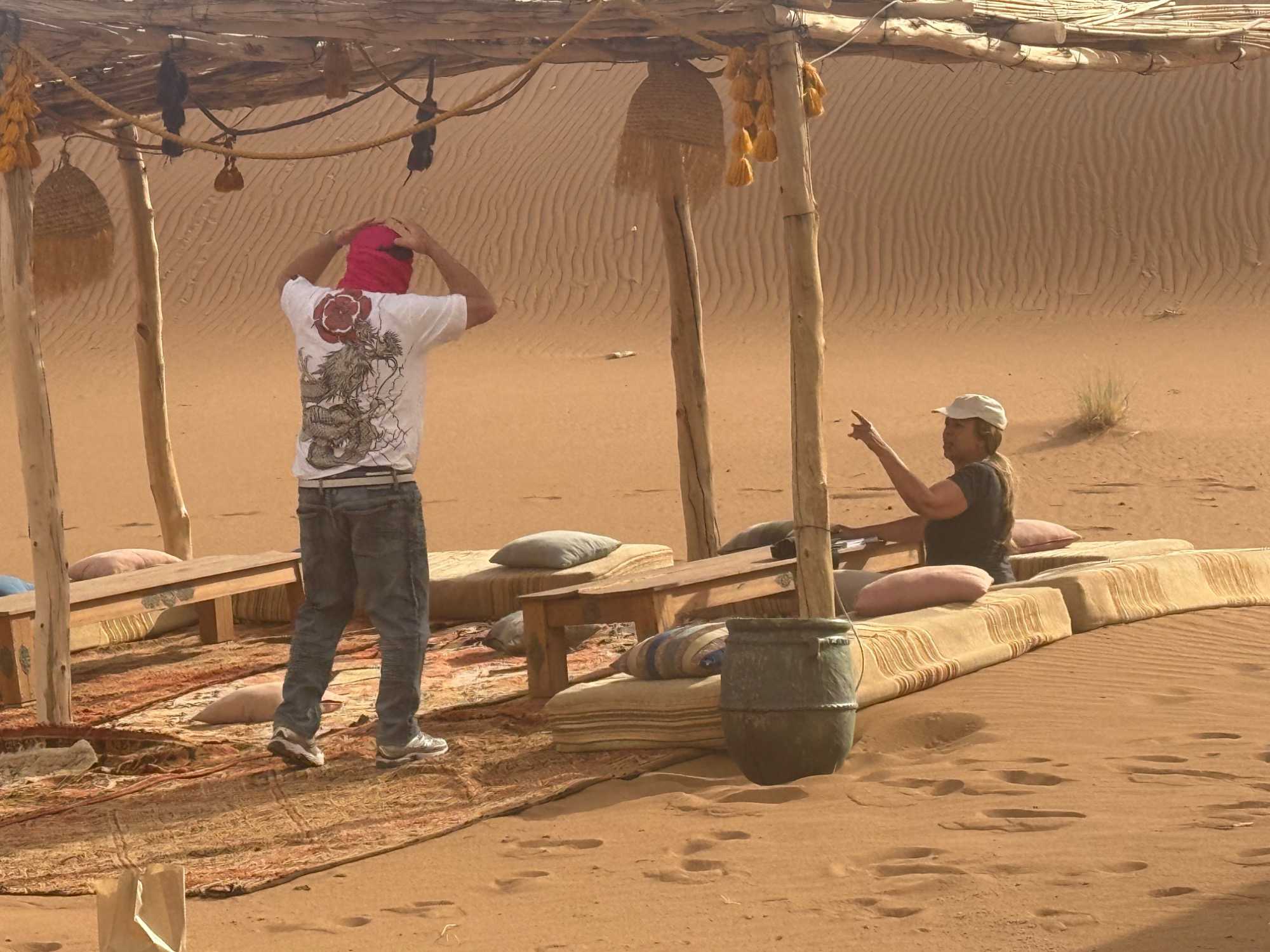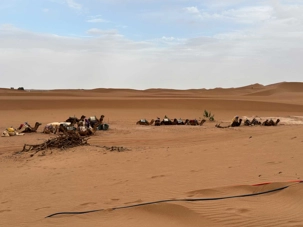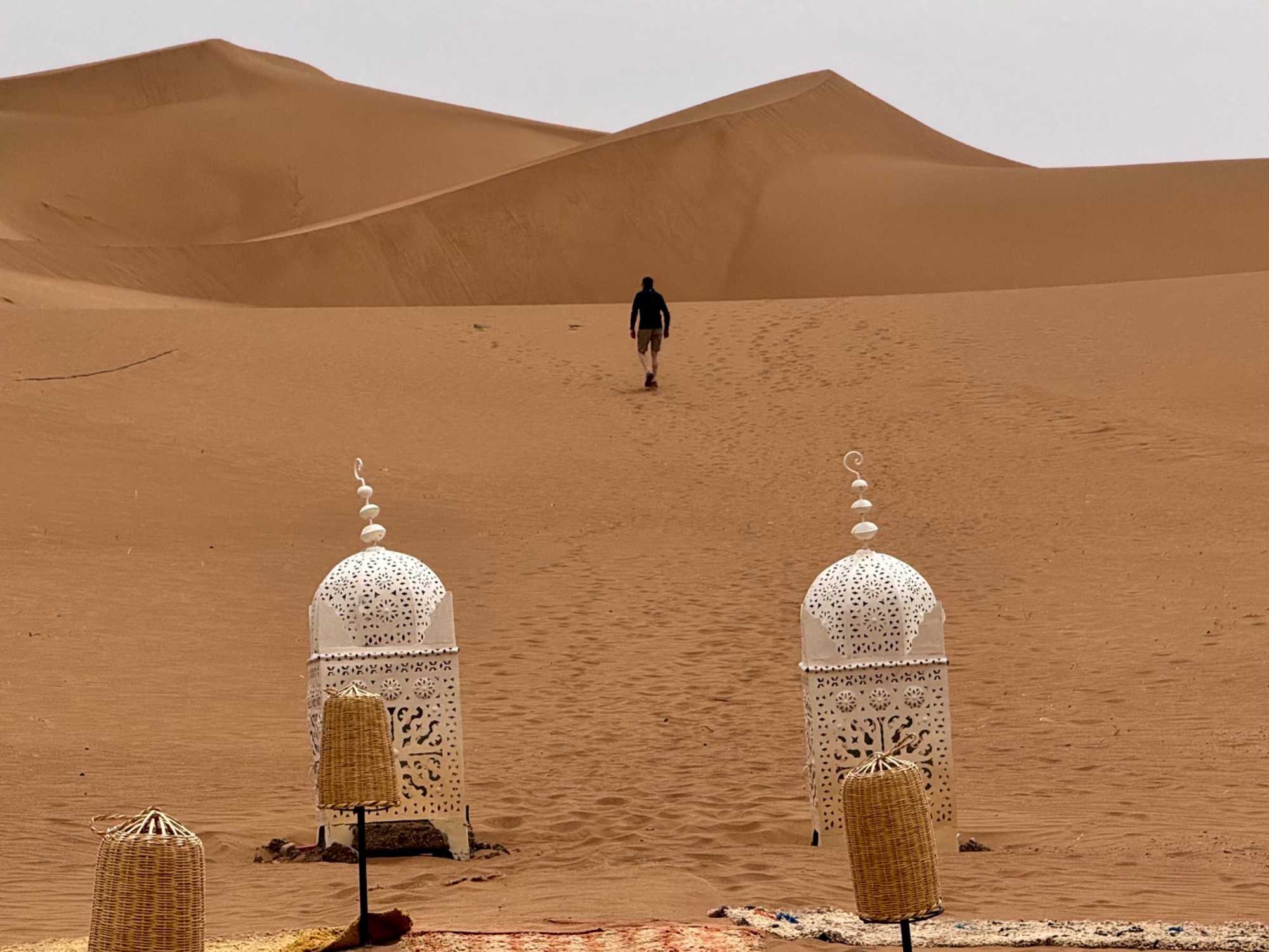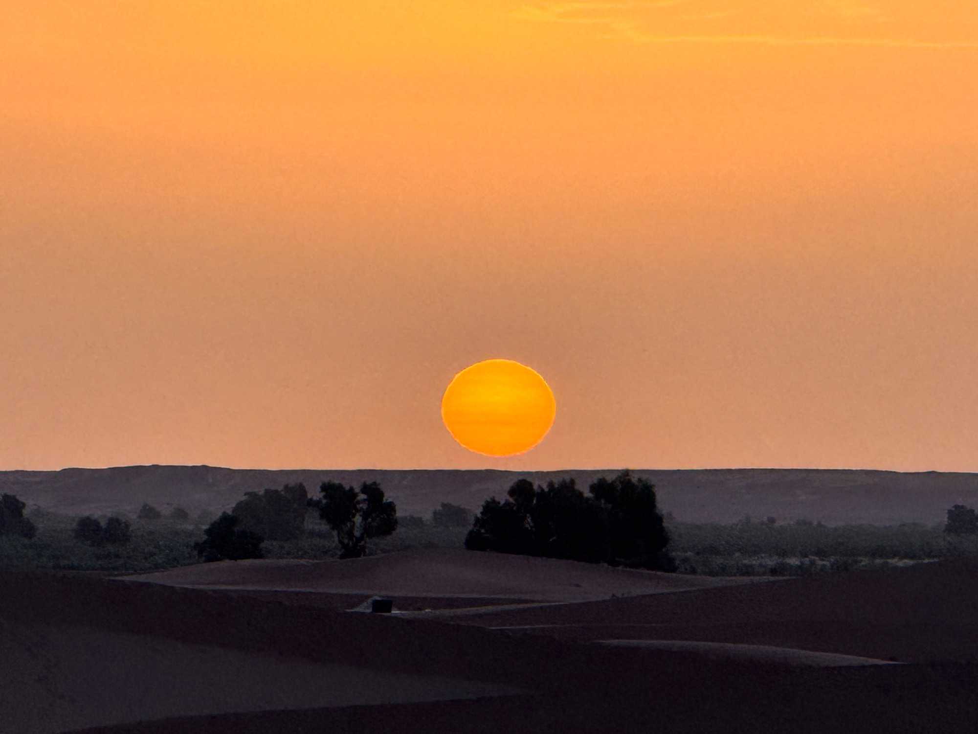 La lumière du matin est unique ici. Les installations blanches de notre campement contrastent avec les teintes rougeâtres du sable, protégées par les dunes qui les enveloppent. La température, douce et agréable, avoisinait les 14 degrés — un confort que peu imaginent lorsqu’on pense au Sahara.