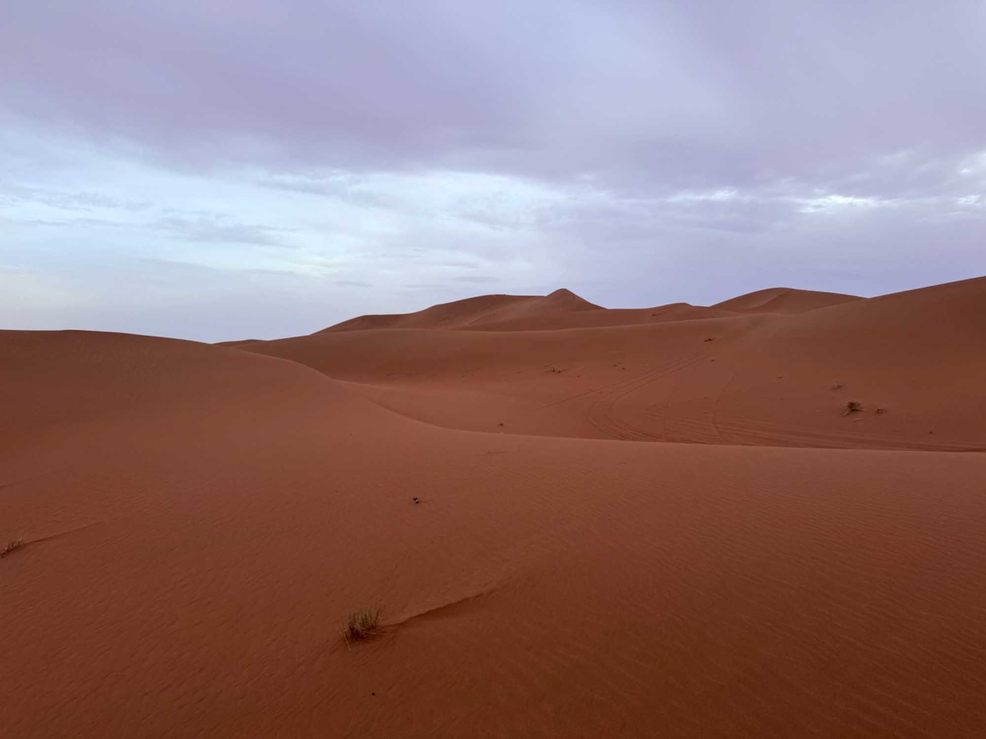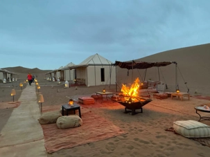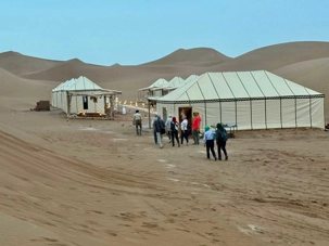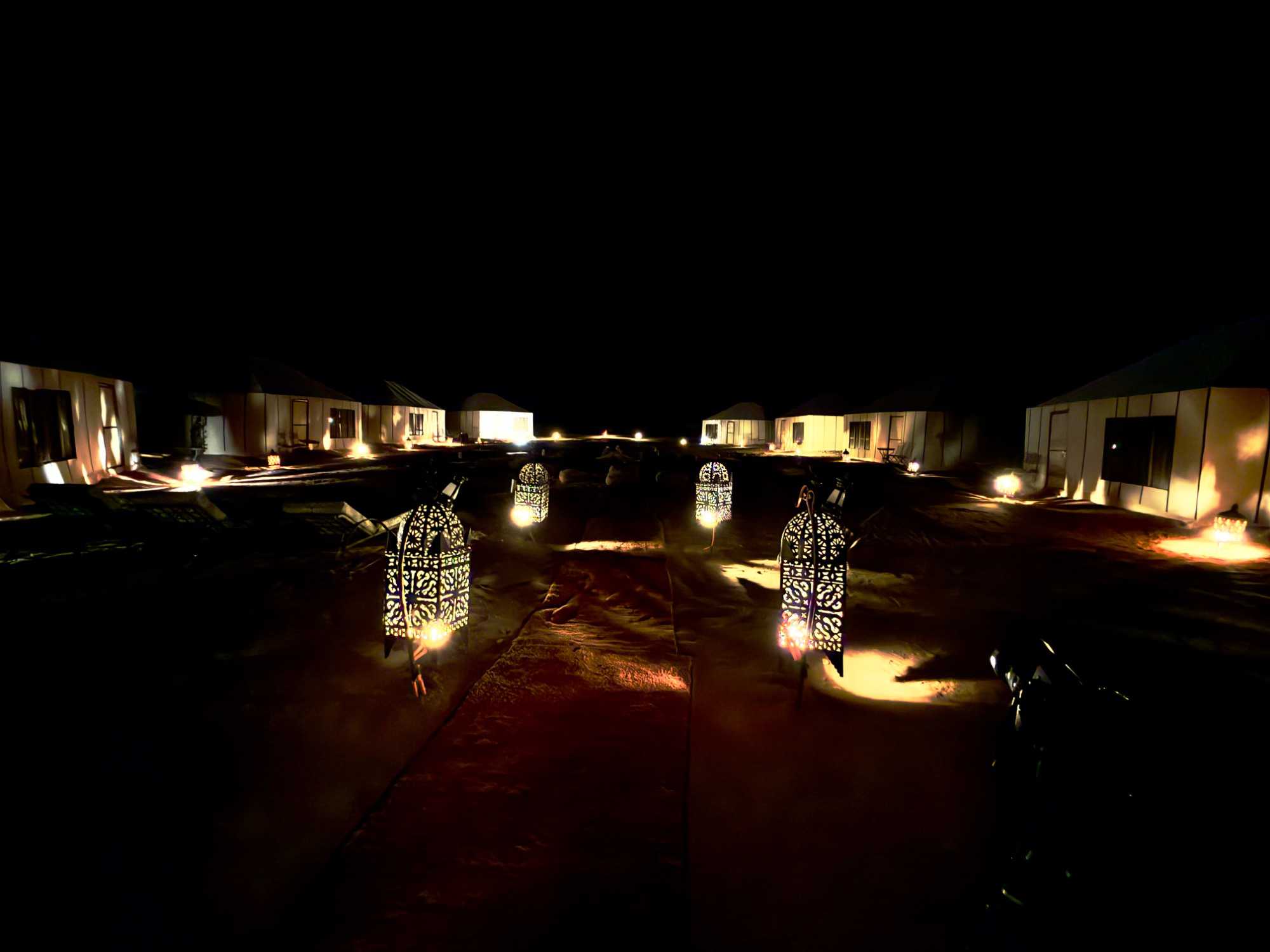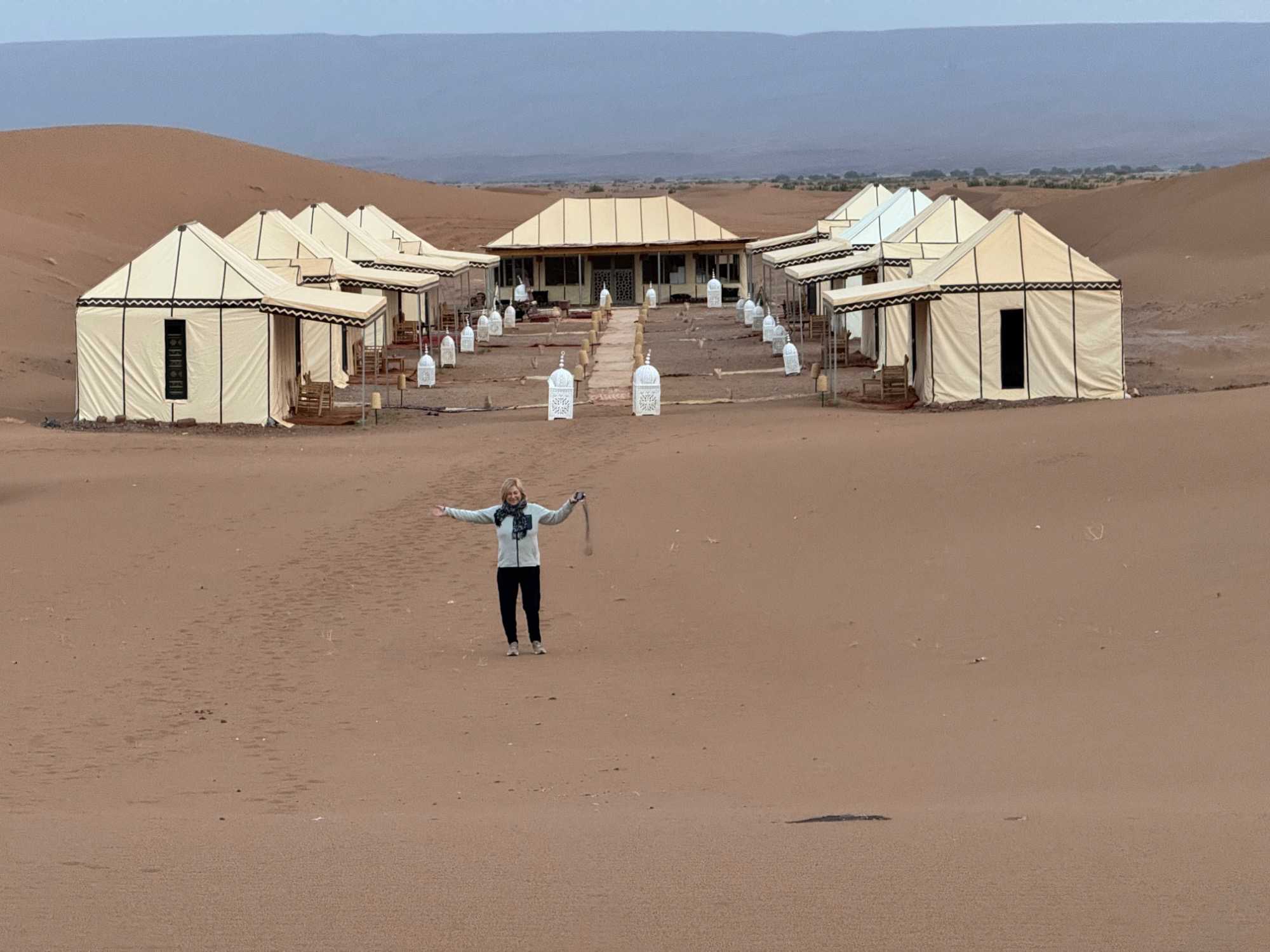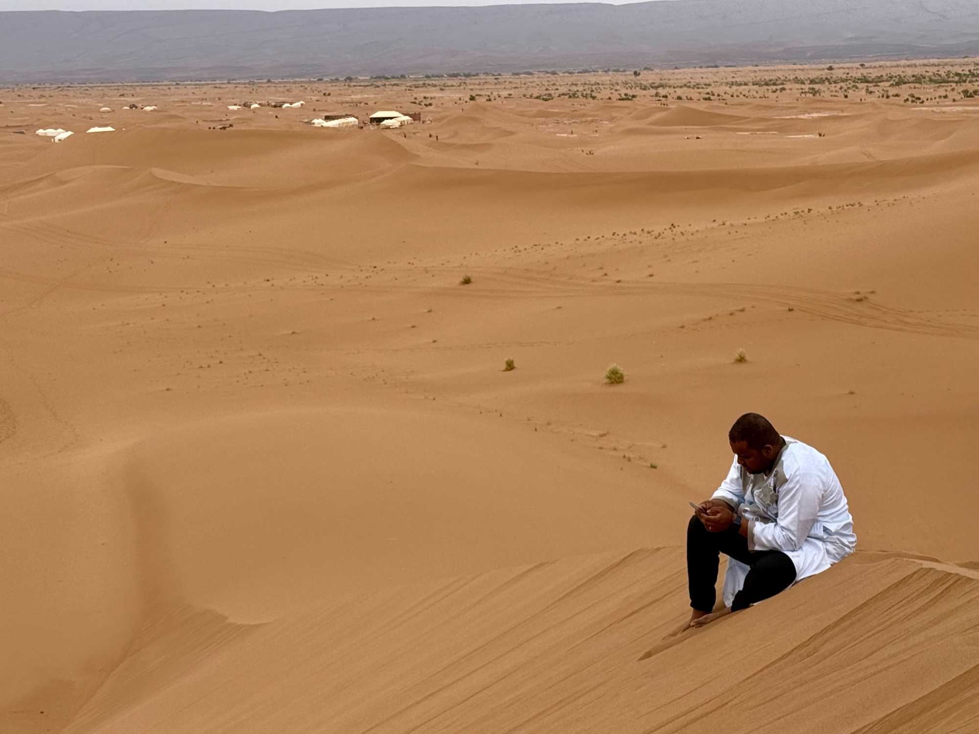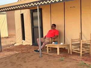 La lumière du matin est unique ici. Les installations blanches de notre campement contrastent avec les teintes rougeâtres du sable, protégées par les dunes qui les enveloppent. La température, douce et agréable, avoisinait les 14 degrés — un confort que peu imaginent lorsqu’on pense au Sahara.