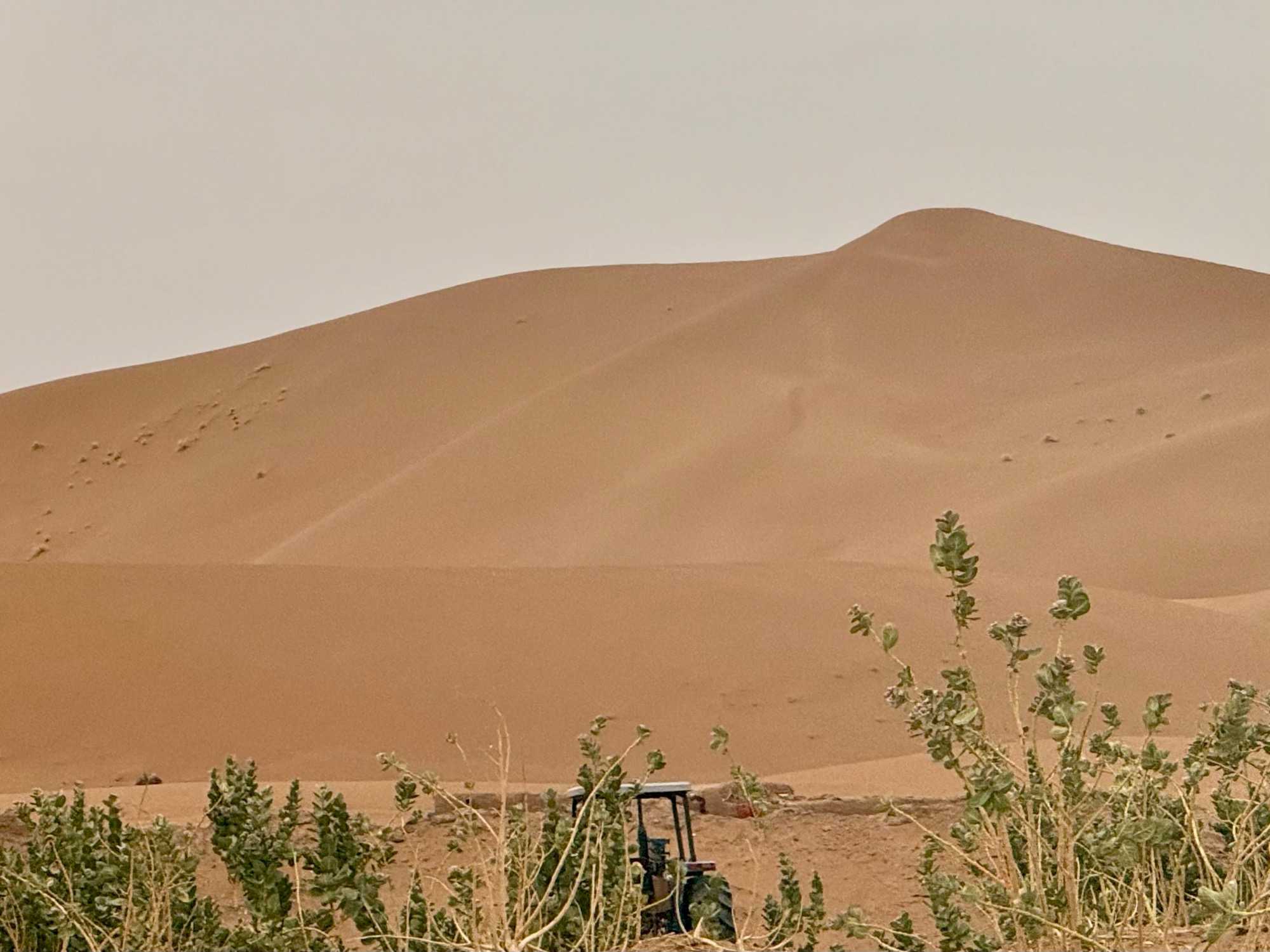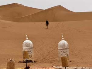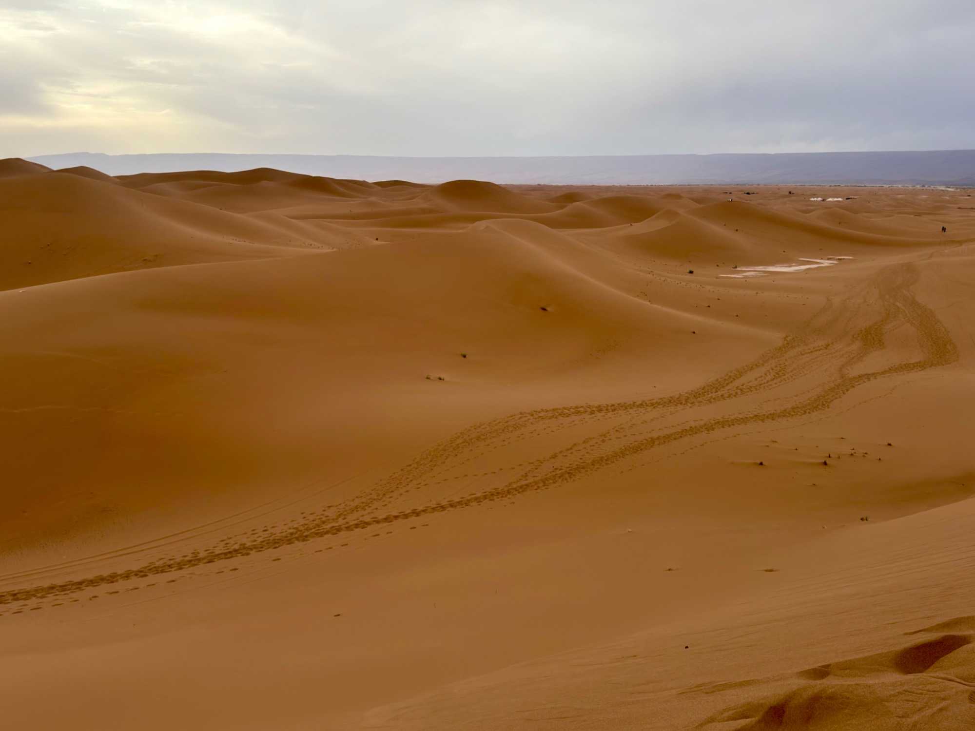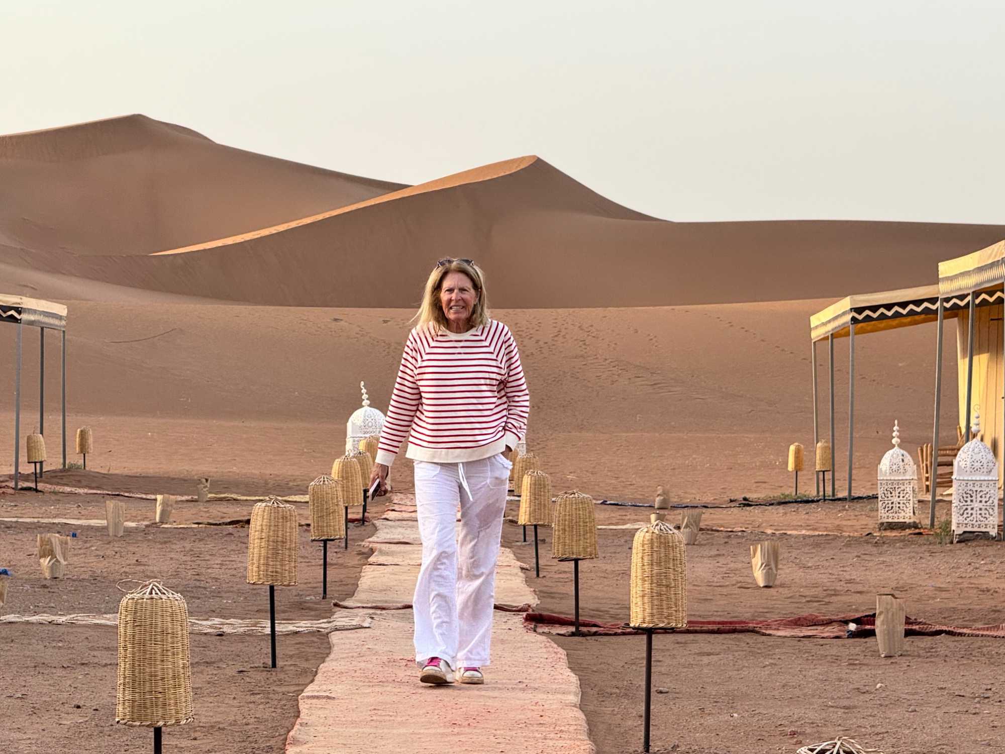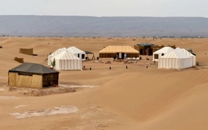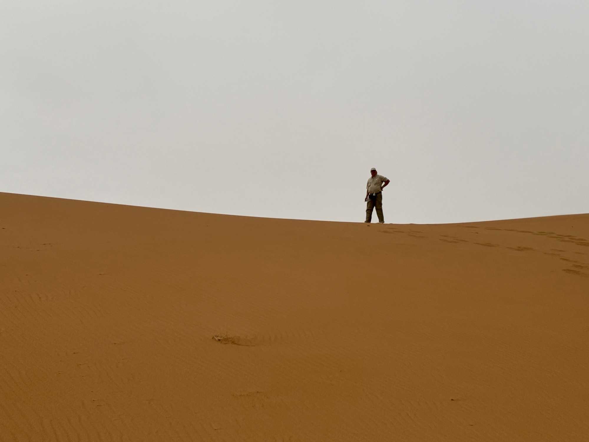 La lumière du matin est unique ici. Les installations blanches de notre campement contrastent avec les teintes rougeâtres du sable, protégées par les dunes qui les enveloppent. La température, douce et agréable, avoisinait les 14 degrés — un confort que peu imaginent lorsqu’on pense au Sahara.