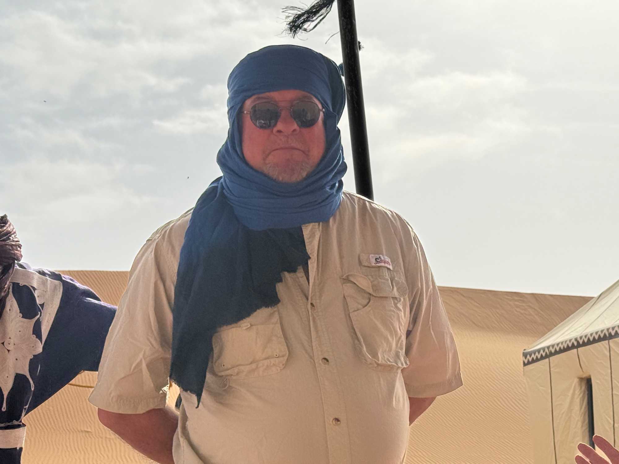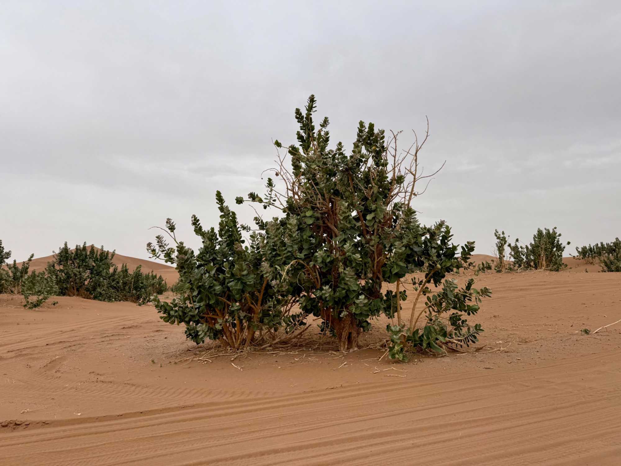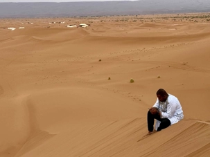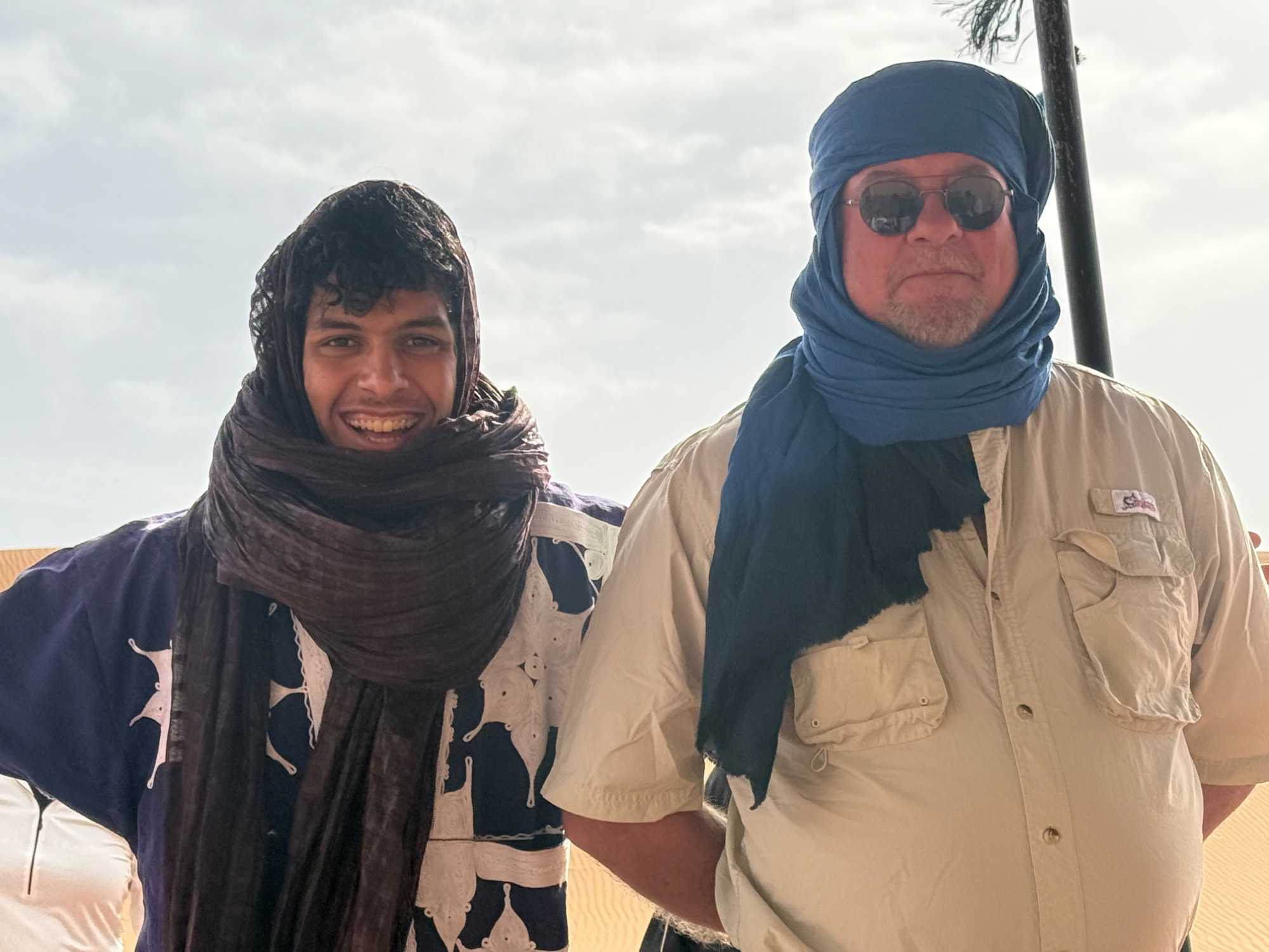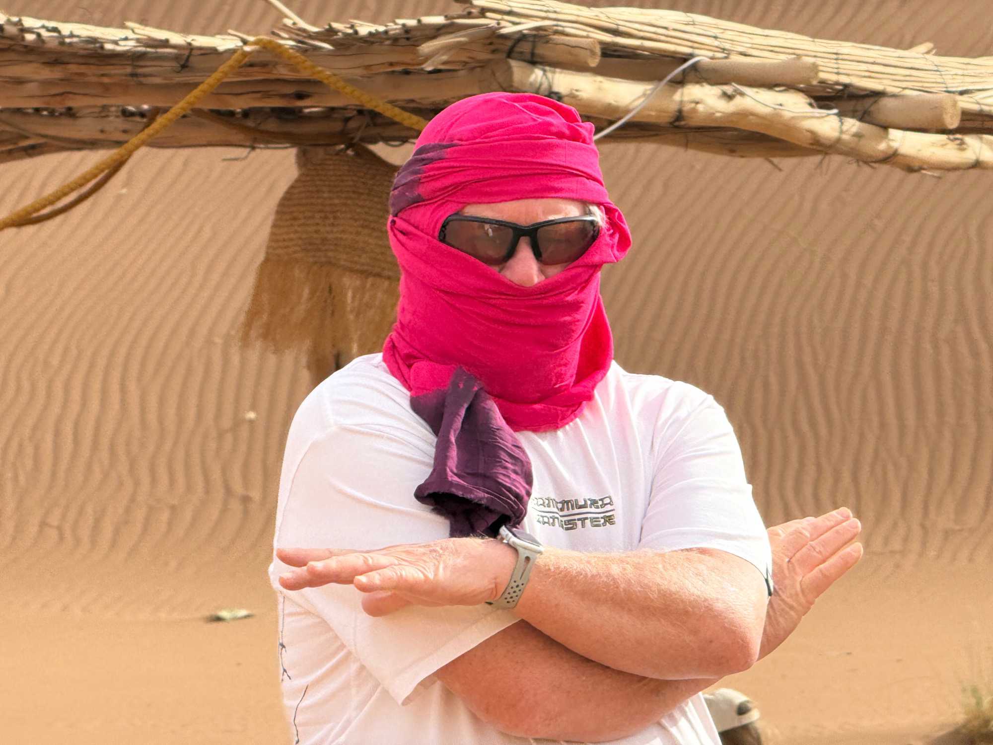 La lumière du matin est unique ici. Les installations blanches de notre campement contrastent avec les teintes rougeâtres du sable, protégées par les dunes qui les enveloppent. La température, douce et agréable, avoisinait les 14 degrés — un confort que peu imaginent lorsqu’on pense au Sahara.