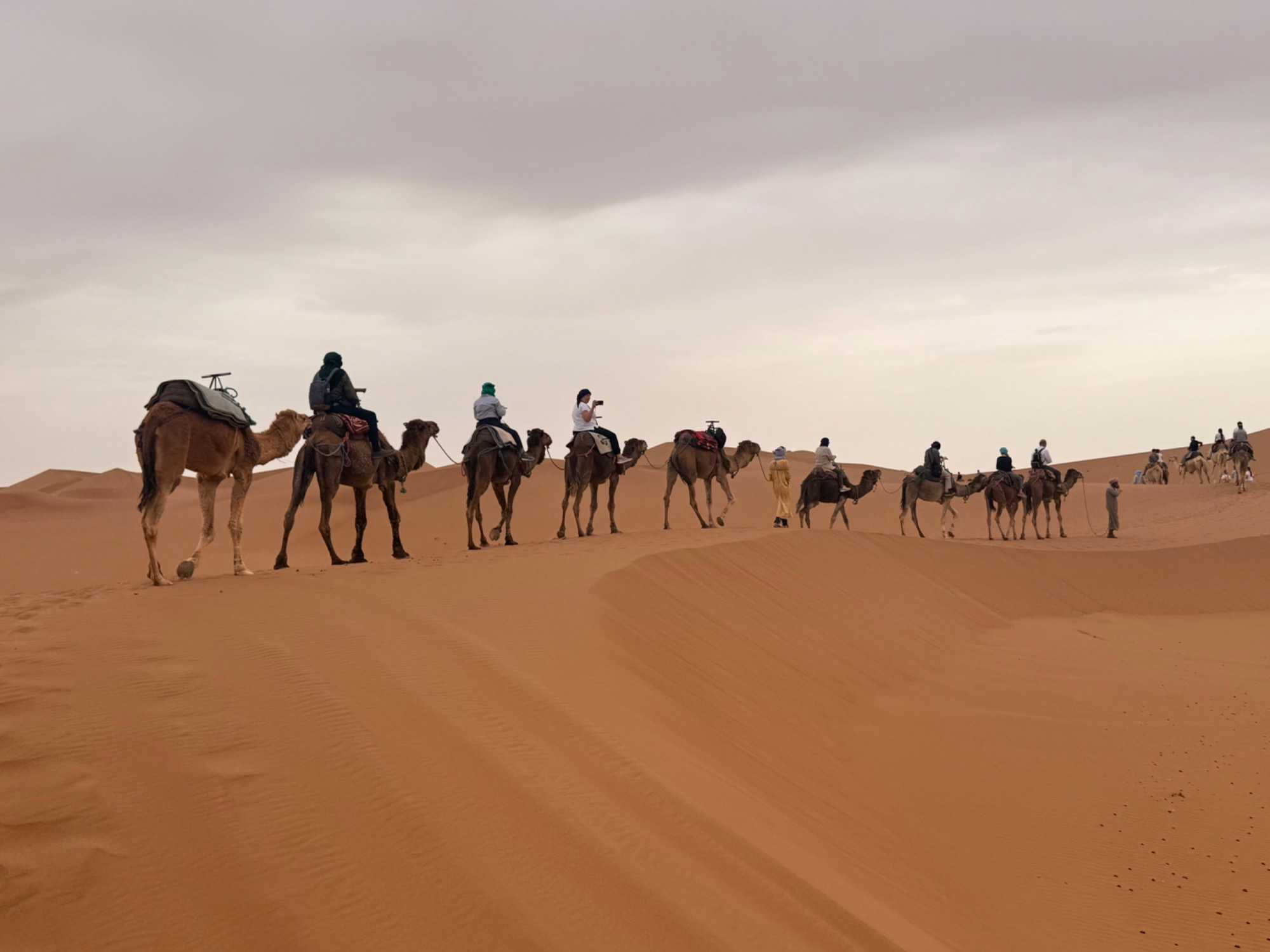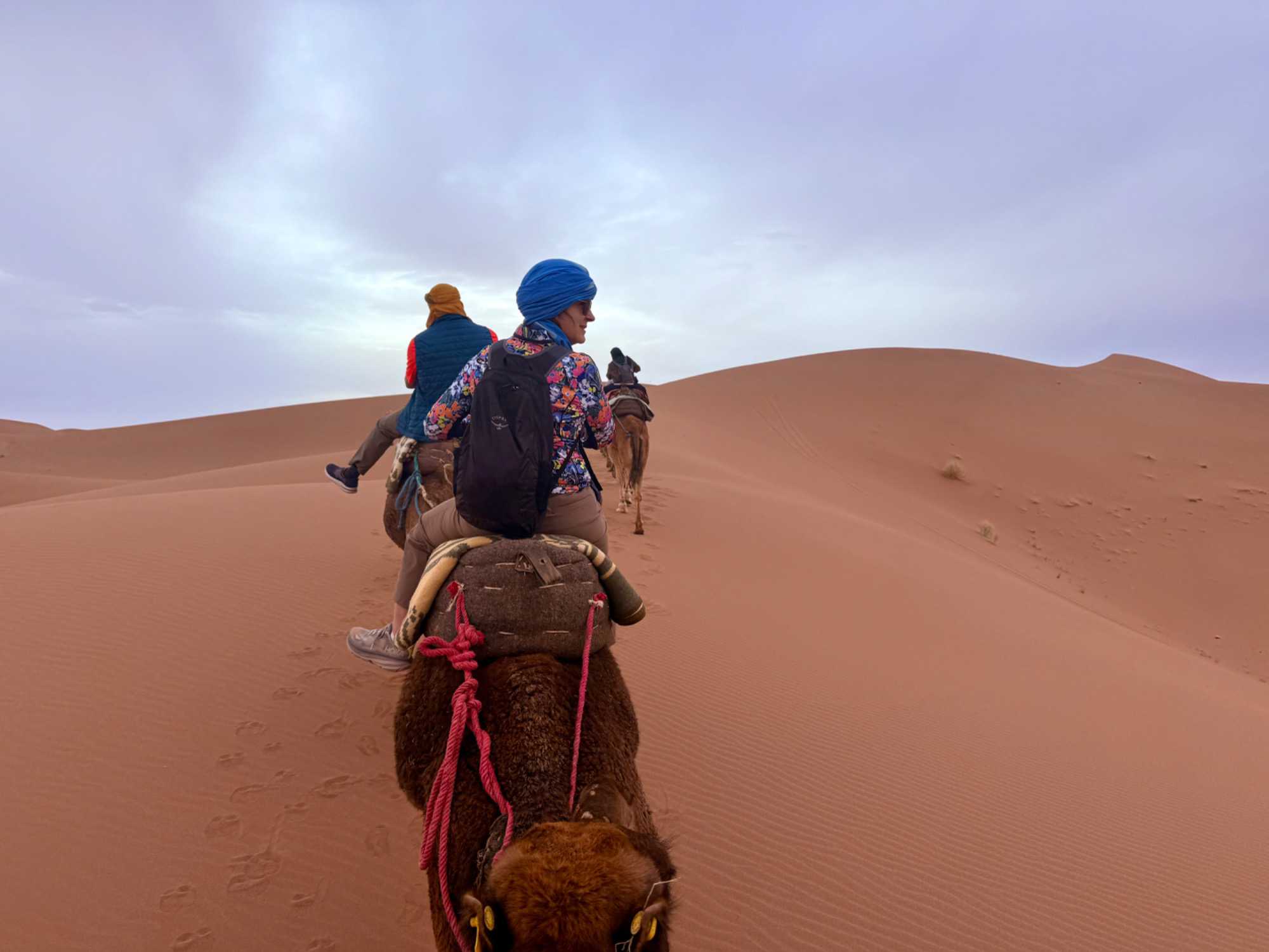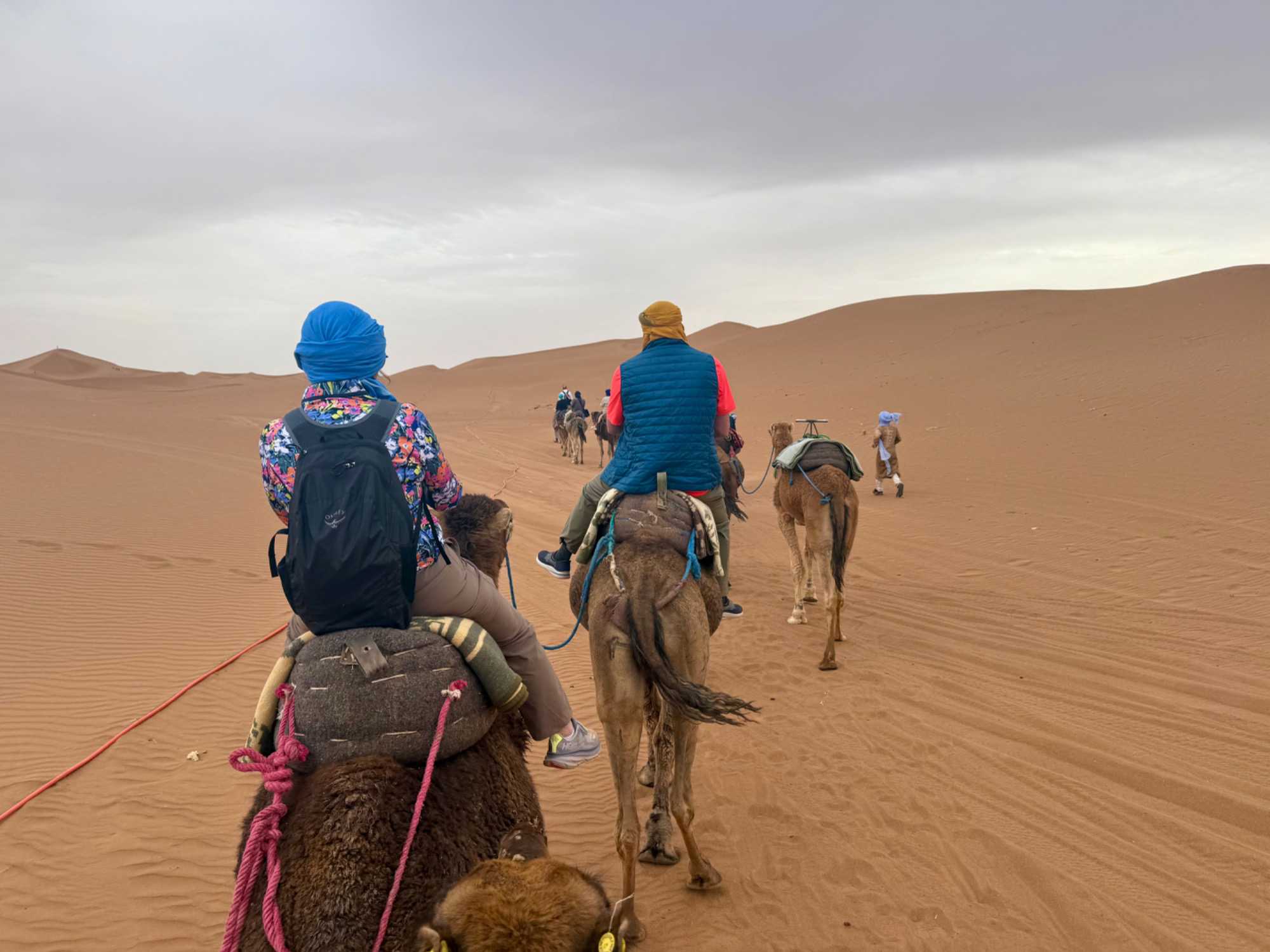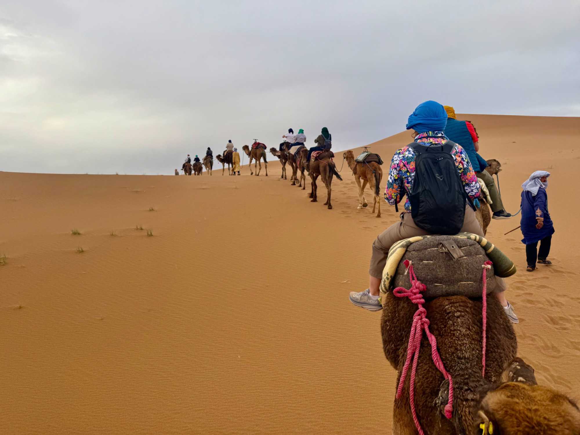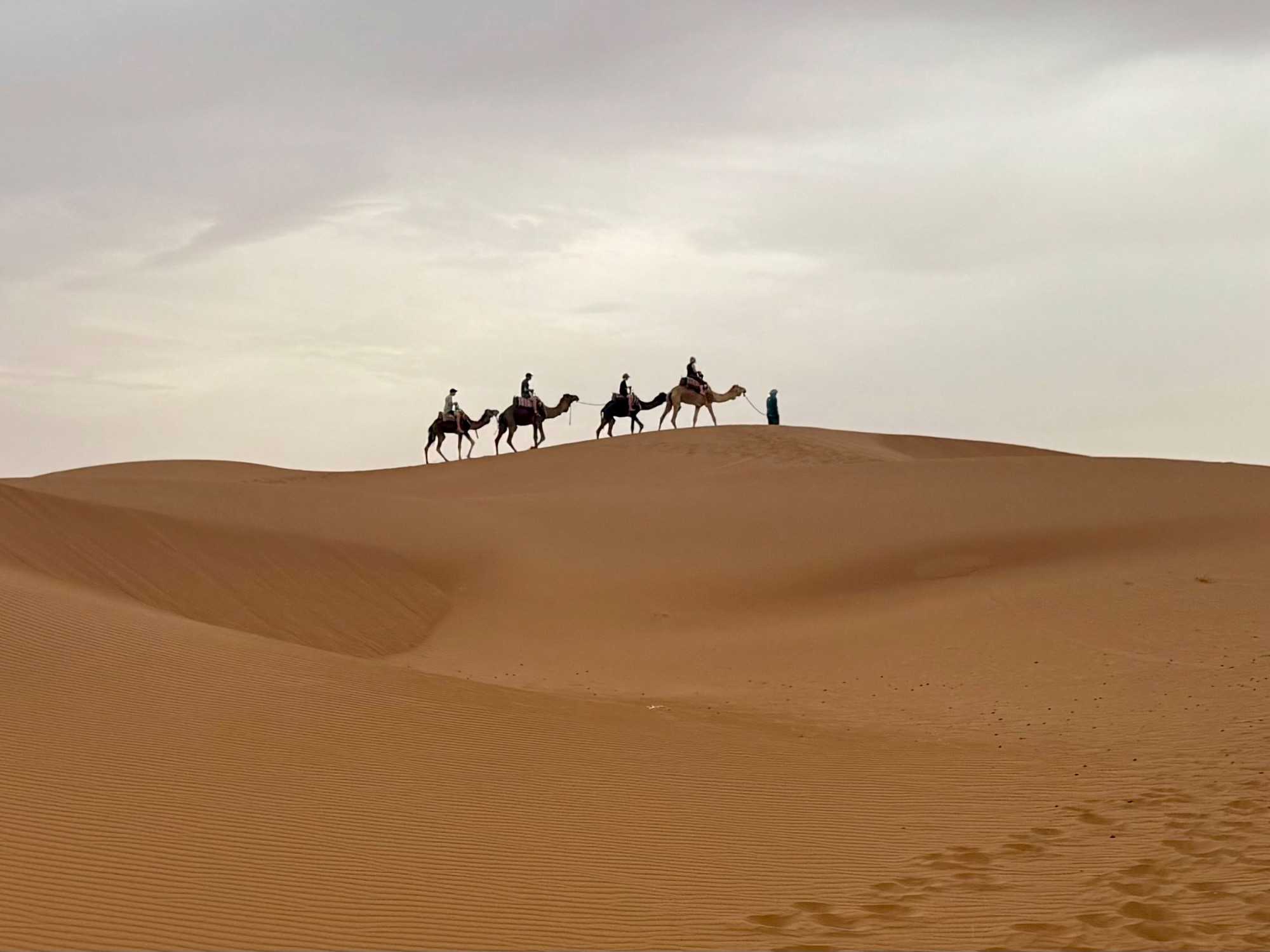 Installés confortablement, nous partons en caravane à travers les dunes. L’expérience est à la fois impressionnante et apaisante. Le mouvement du dromadaire, lent et régulier, nous transporte presque dans une autre dimension.