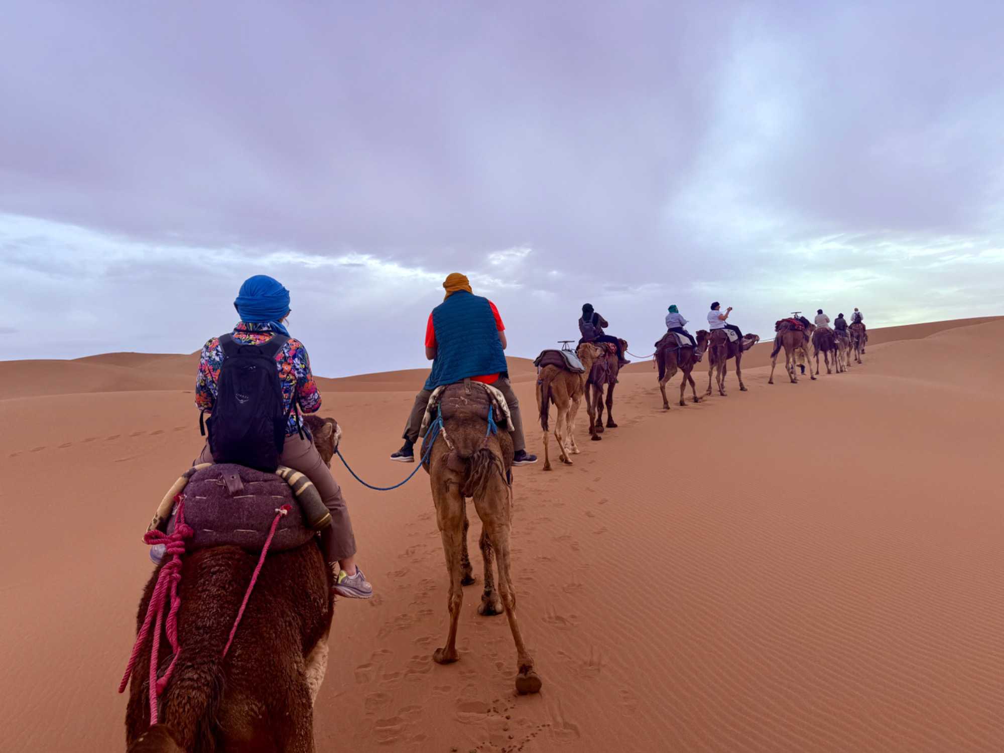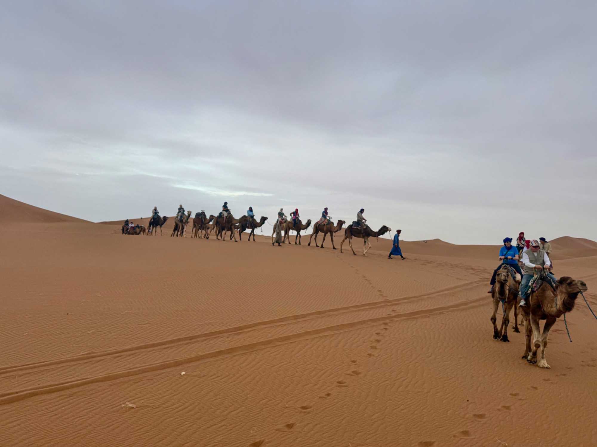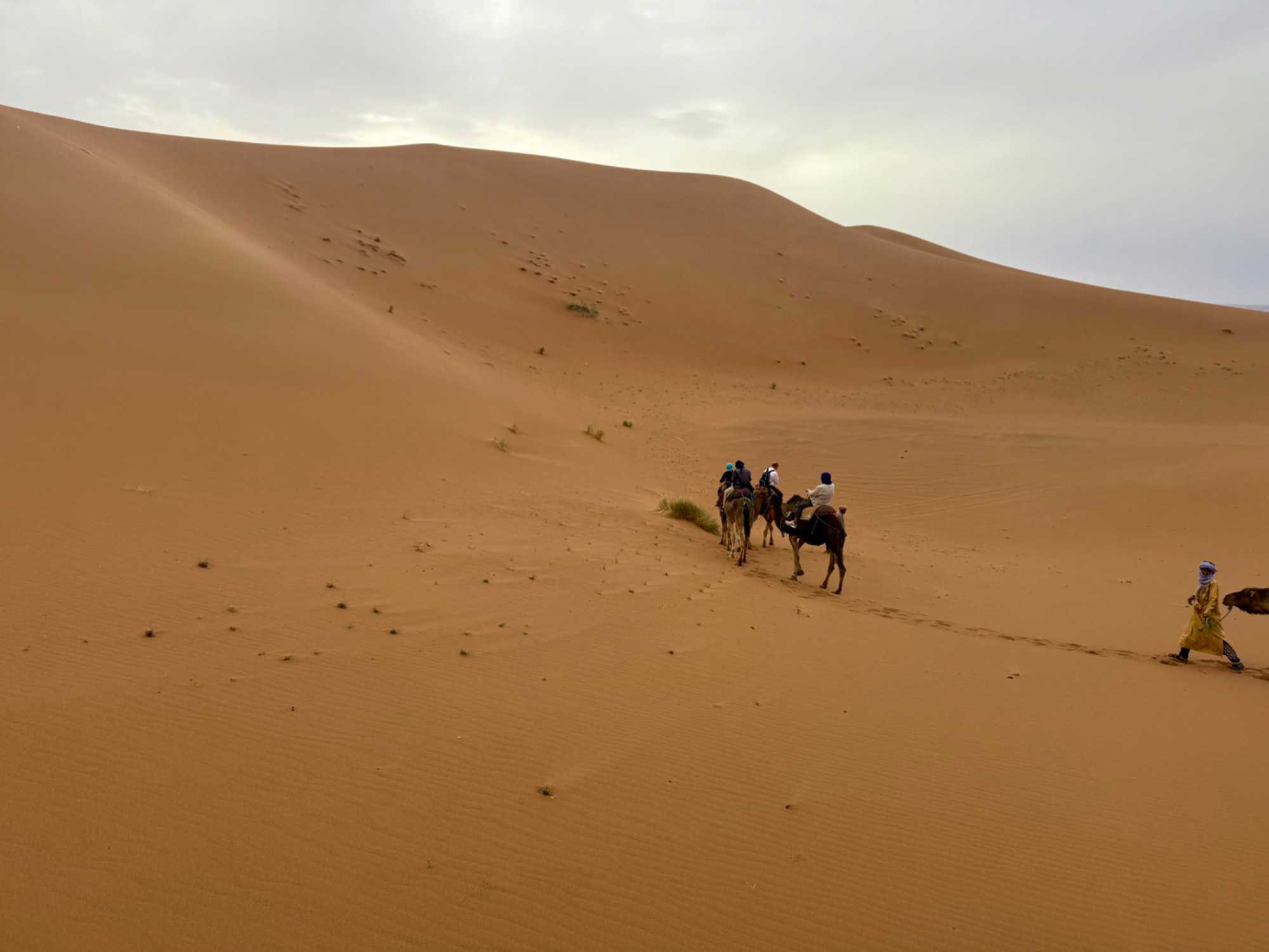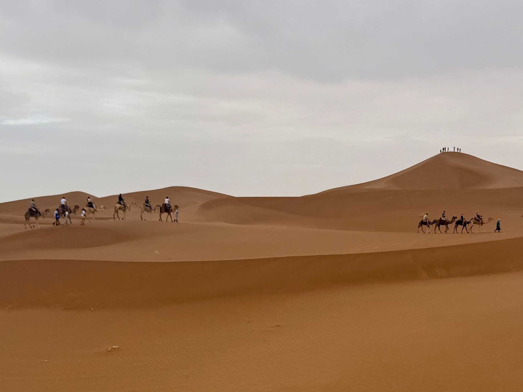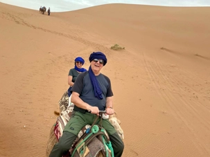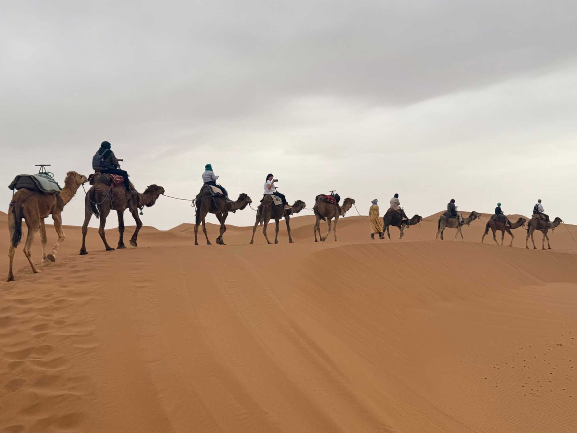 Installés confortablement, nous partons en caravane à travers les dunes. L’expérience est à la fois impressionnante et apaisante. Le mouvement du dromadaire, lent et régulier, nous transporte presque dans une autre dimension.