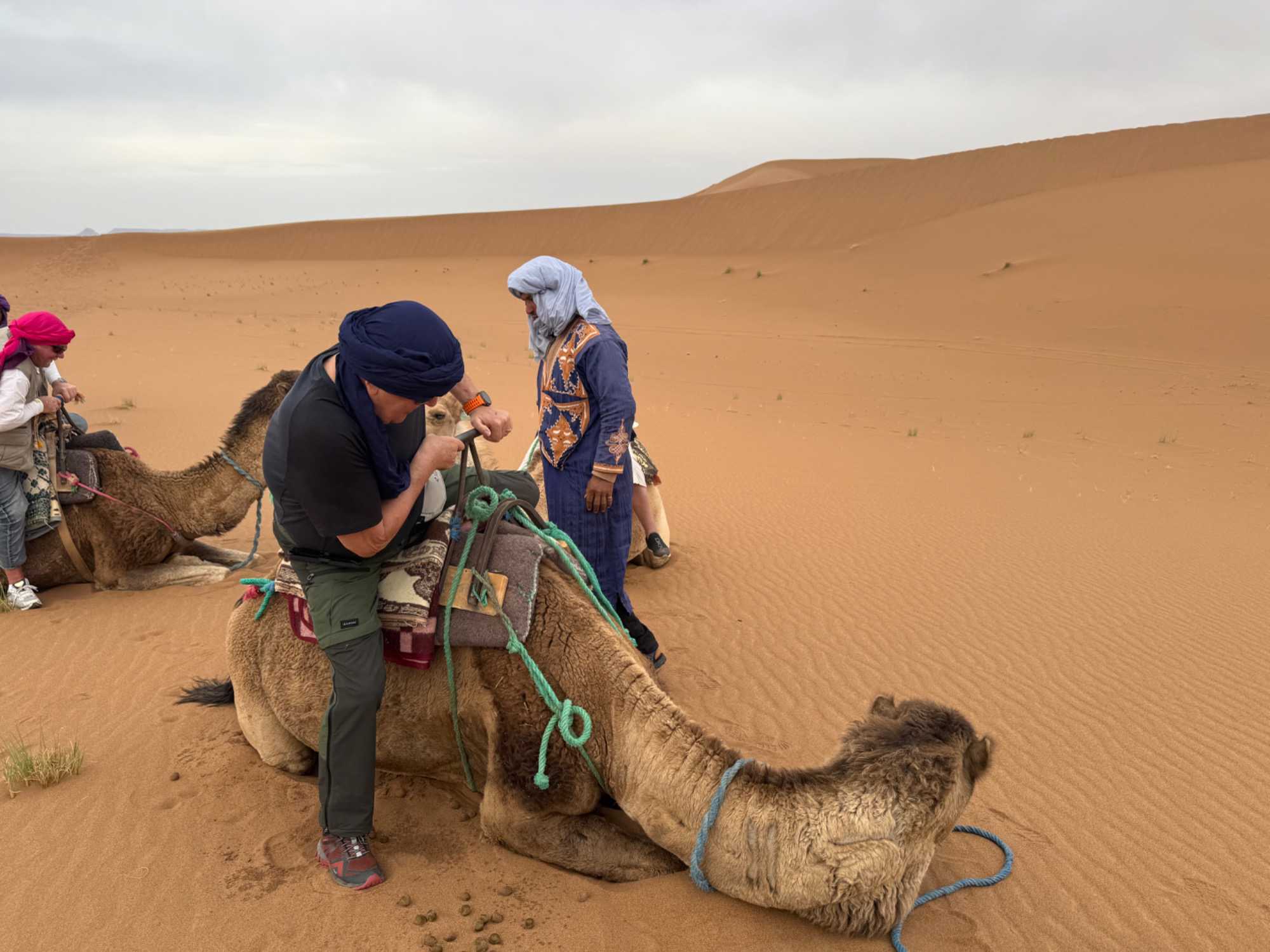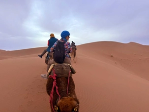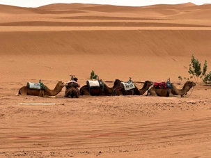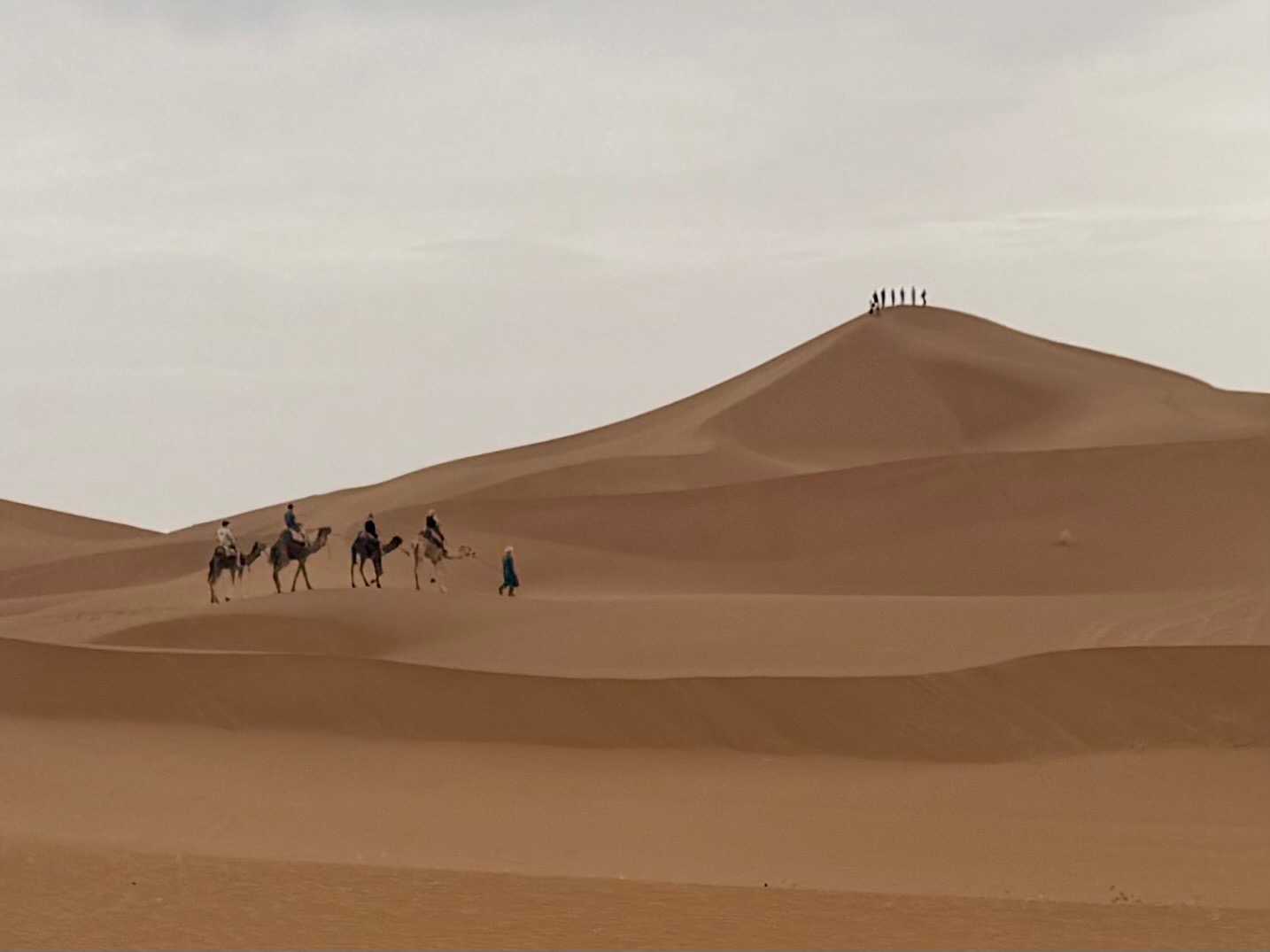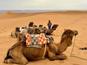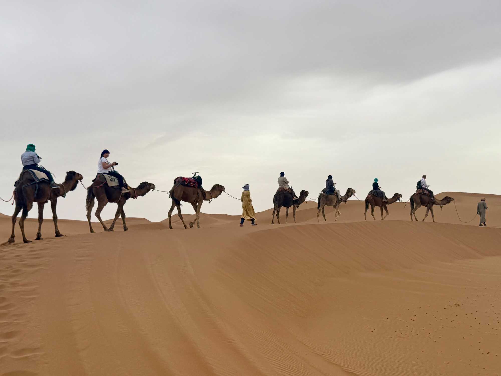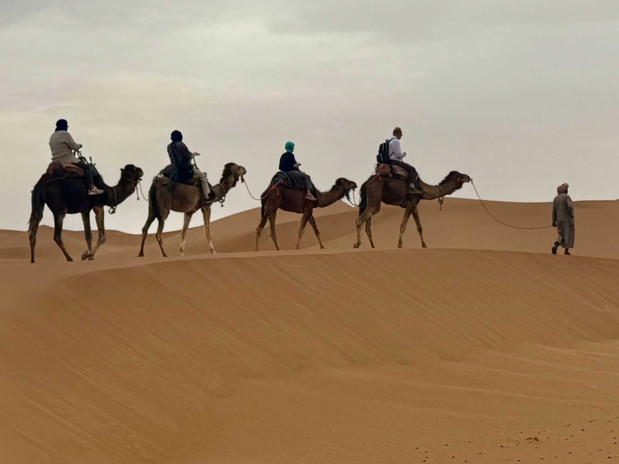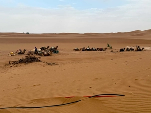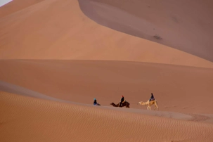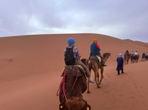 Installés confortablement, nous partons en caravane à travers les dunes. L’expérience est à la fois impressionnante et apaisante. Le mouvement du dromadaire, lent et régulier, nous transporte presque dans une autre dimension.