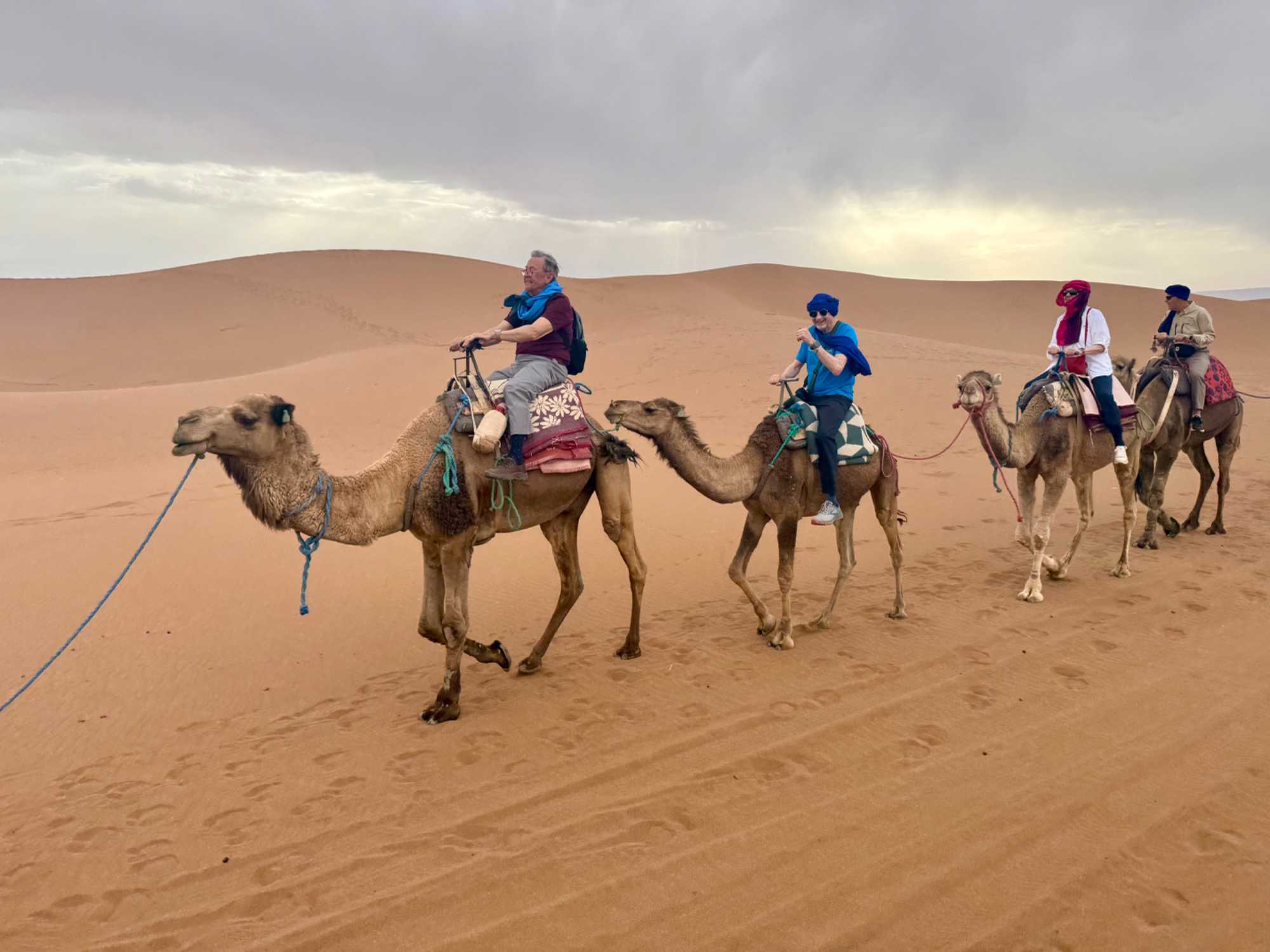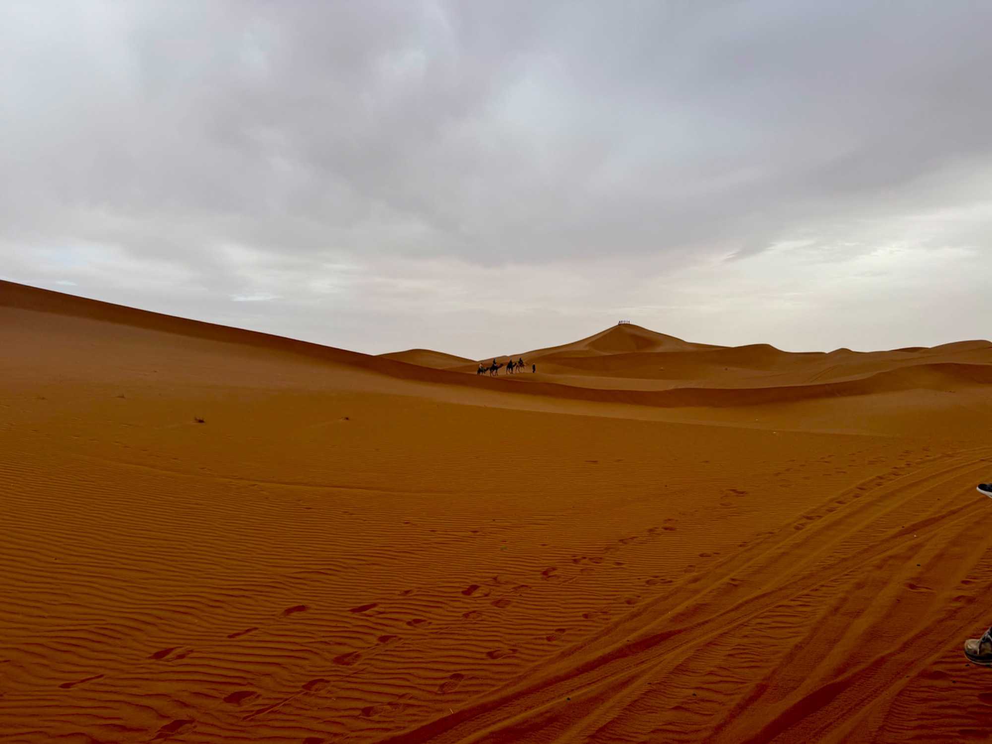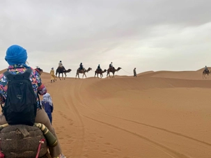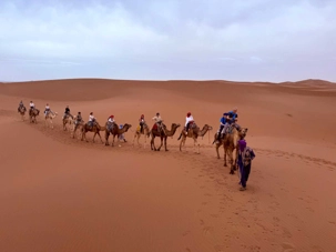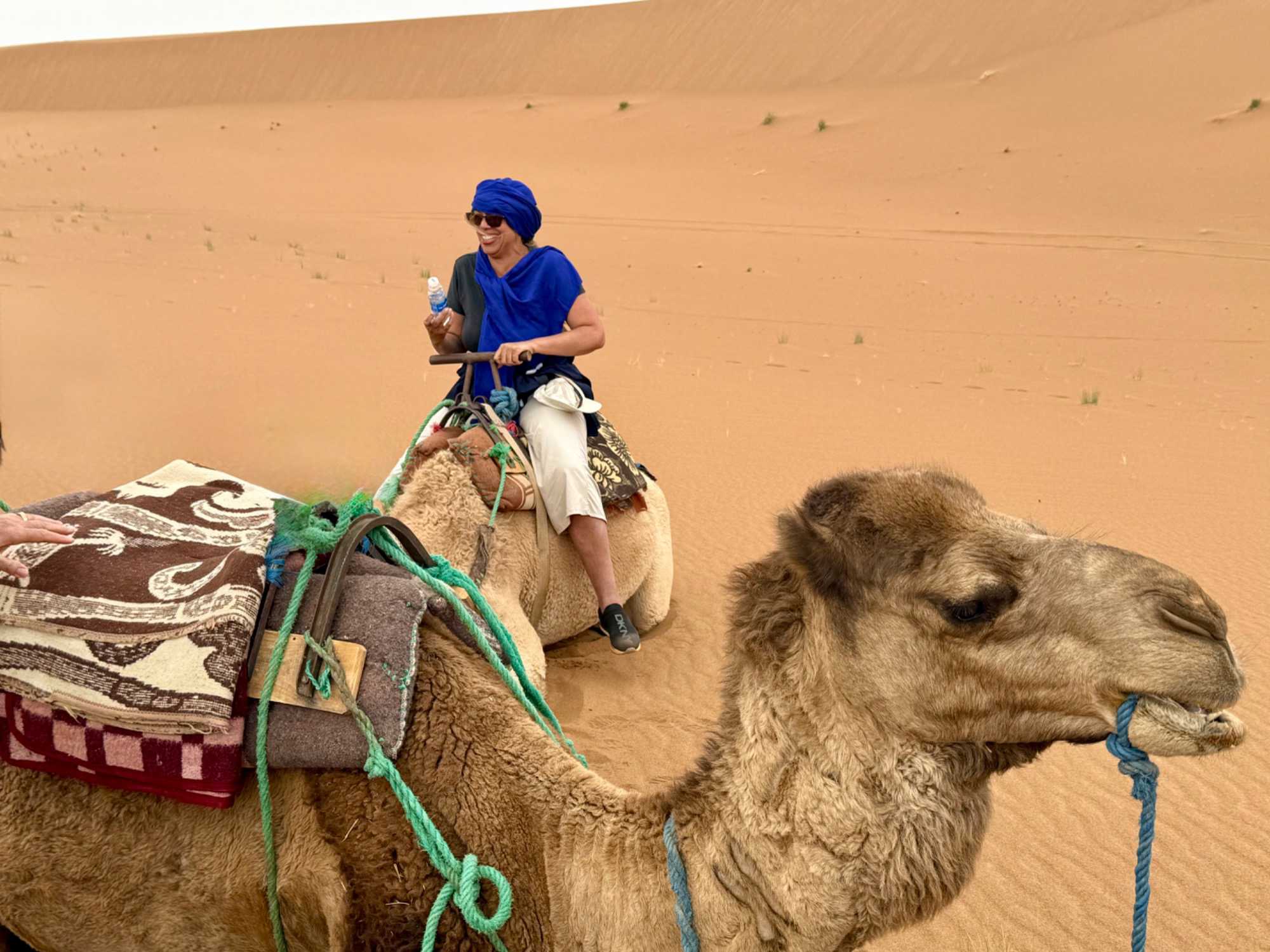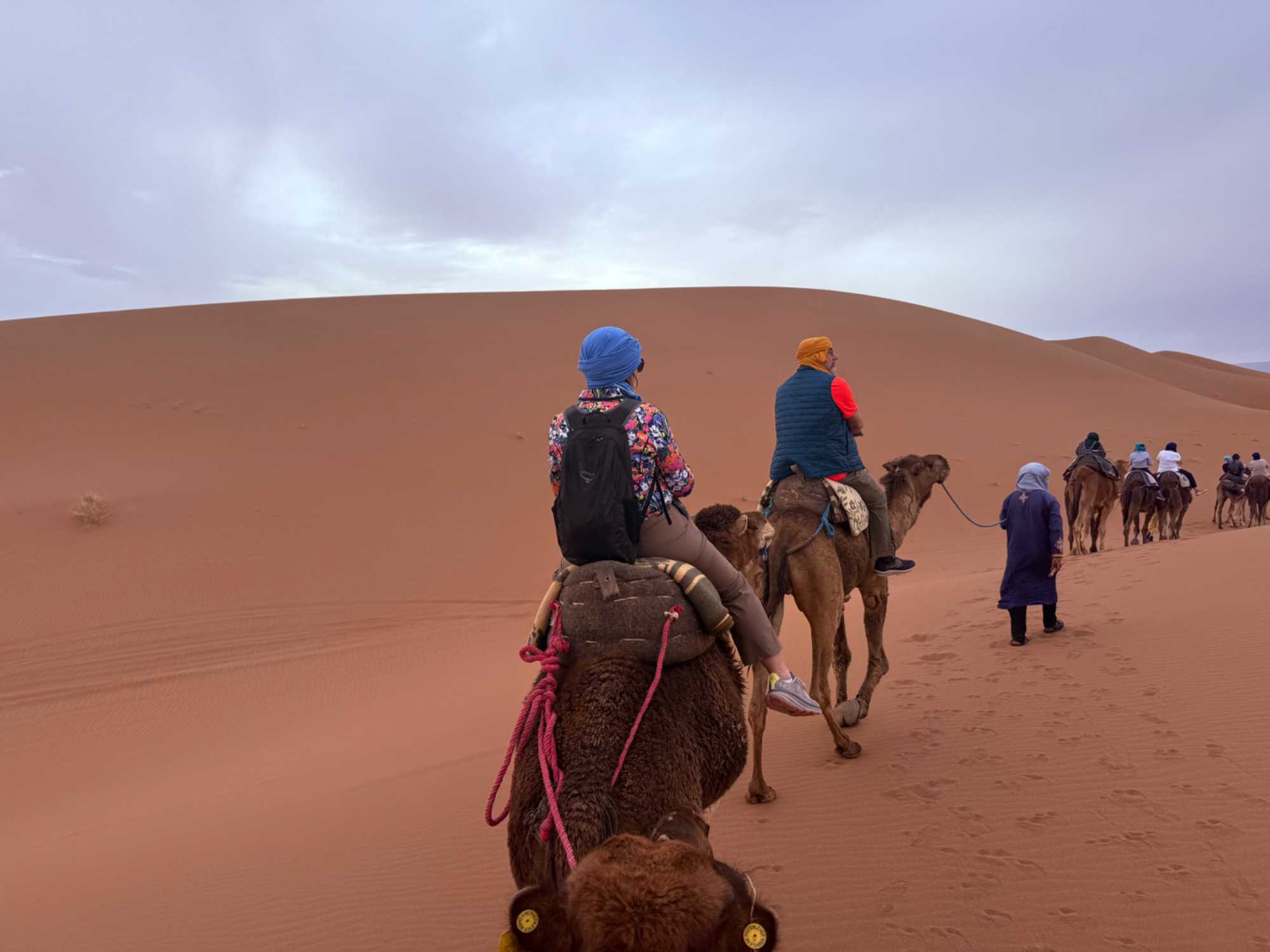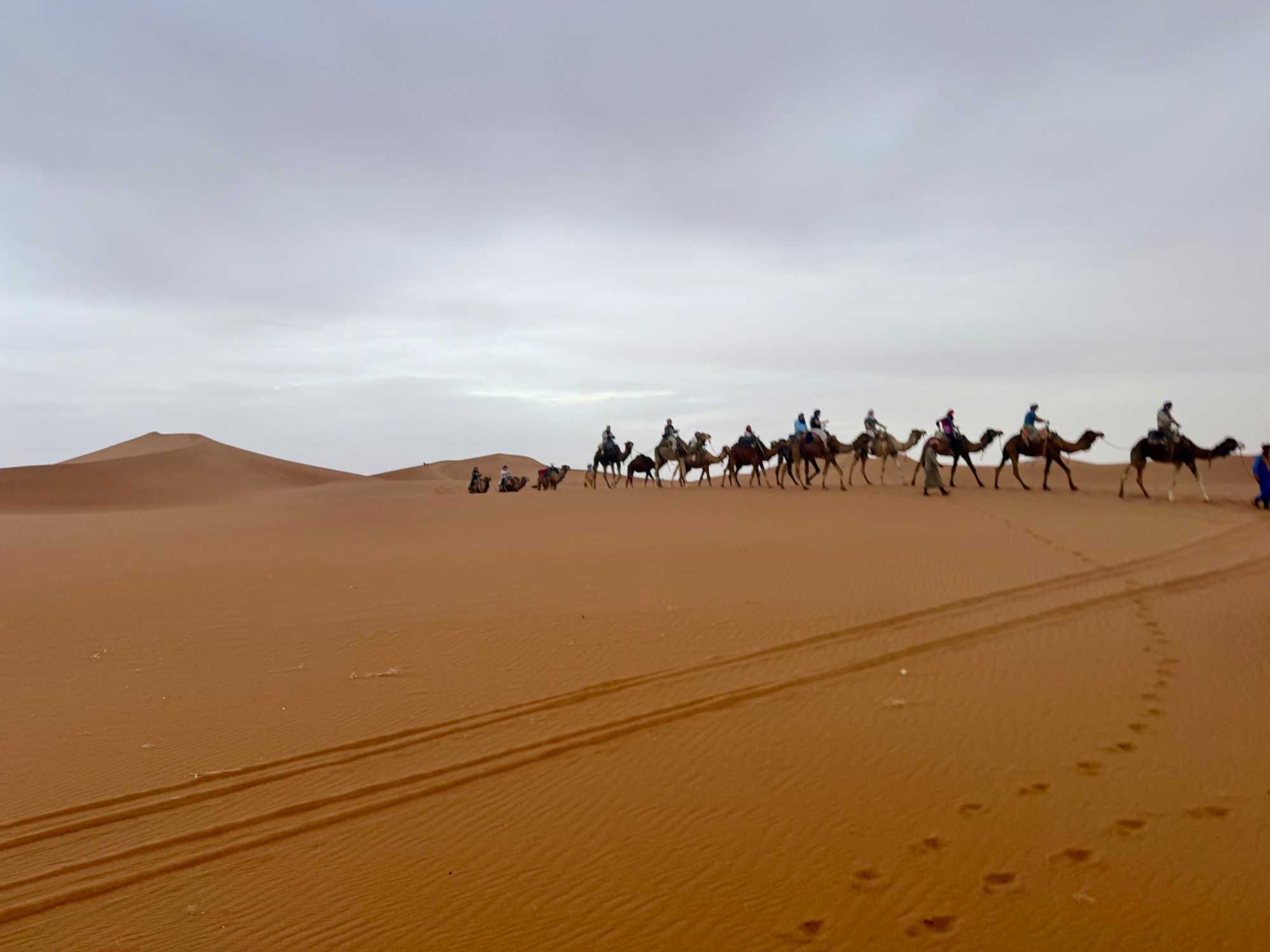 Installés confortablement, nous partons en caravane à travers les dunes. L’expérience est à la fois impressionnante et apaisante. Le mouvement du dromadaire, lent et régulier, nous transporte presque dans une autre dimension.