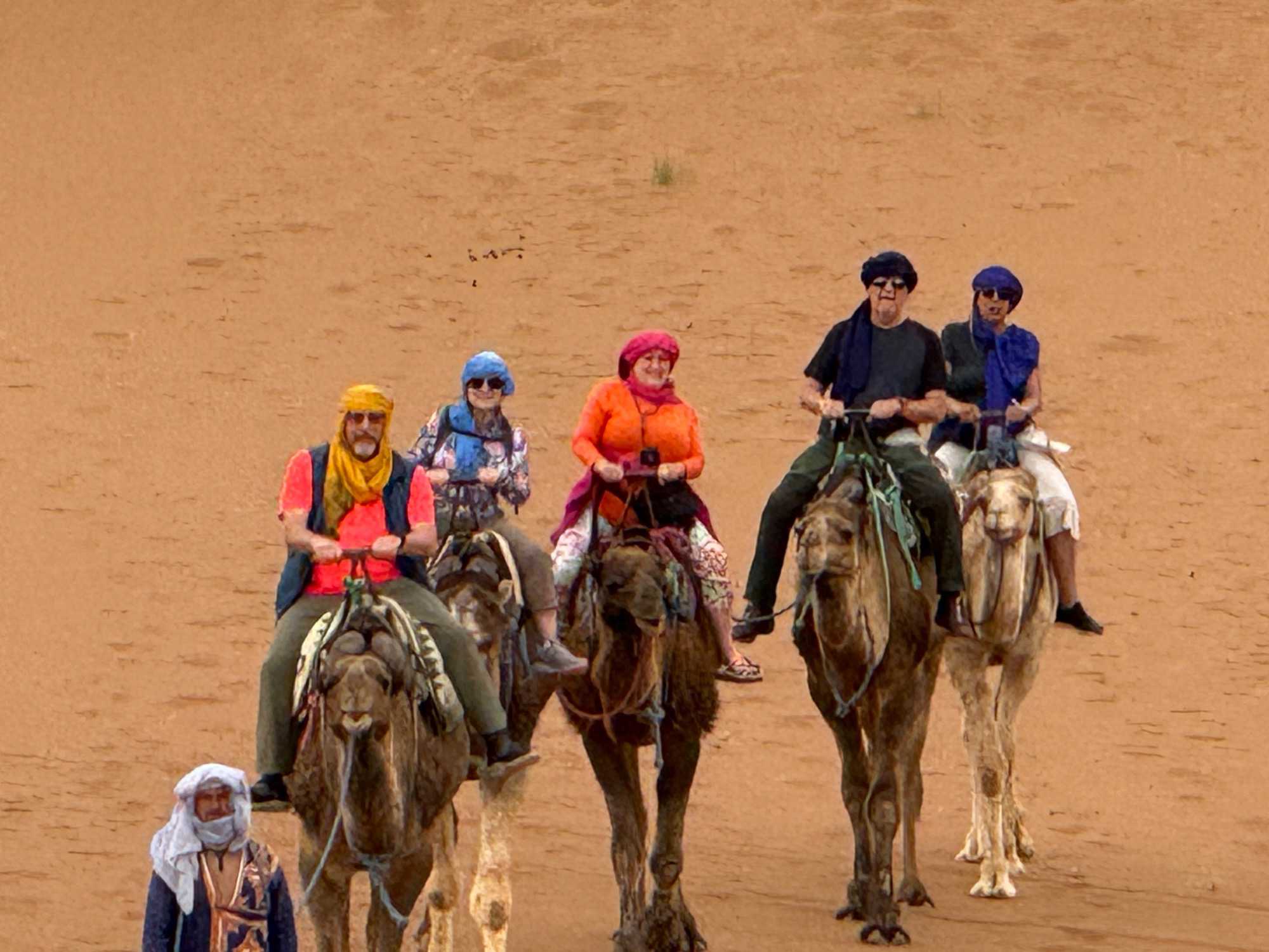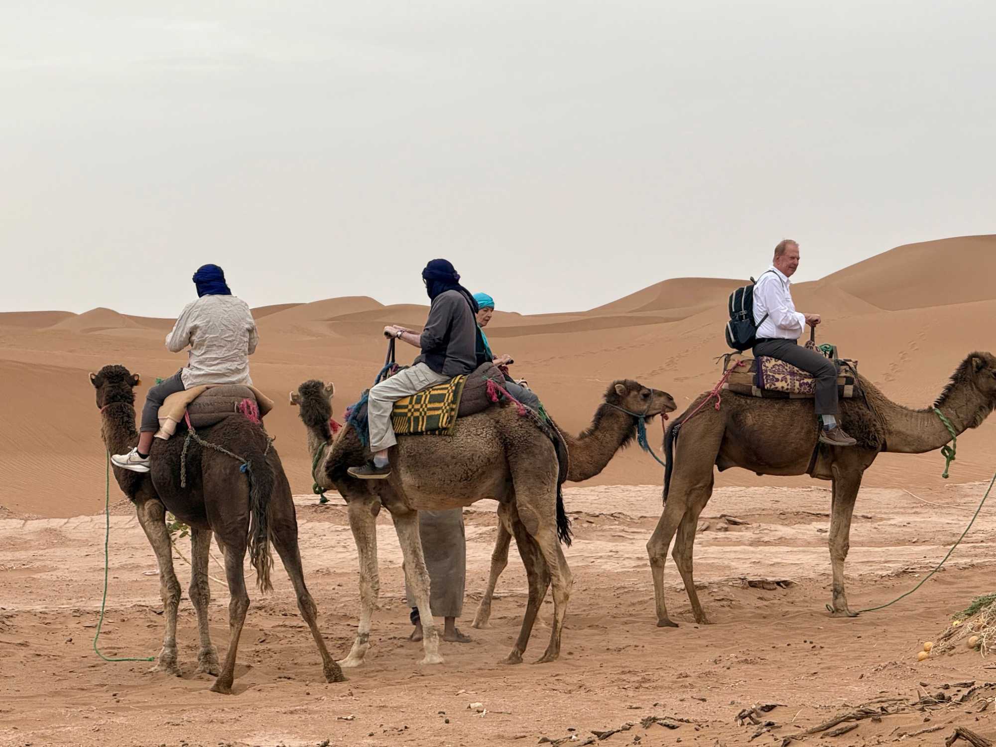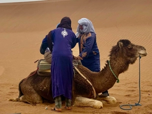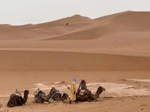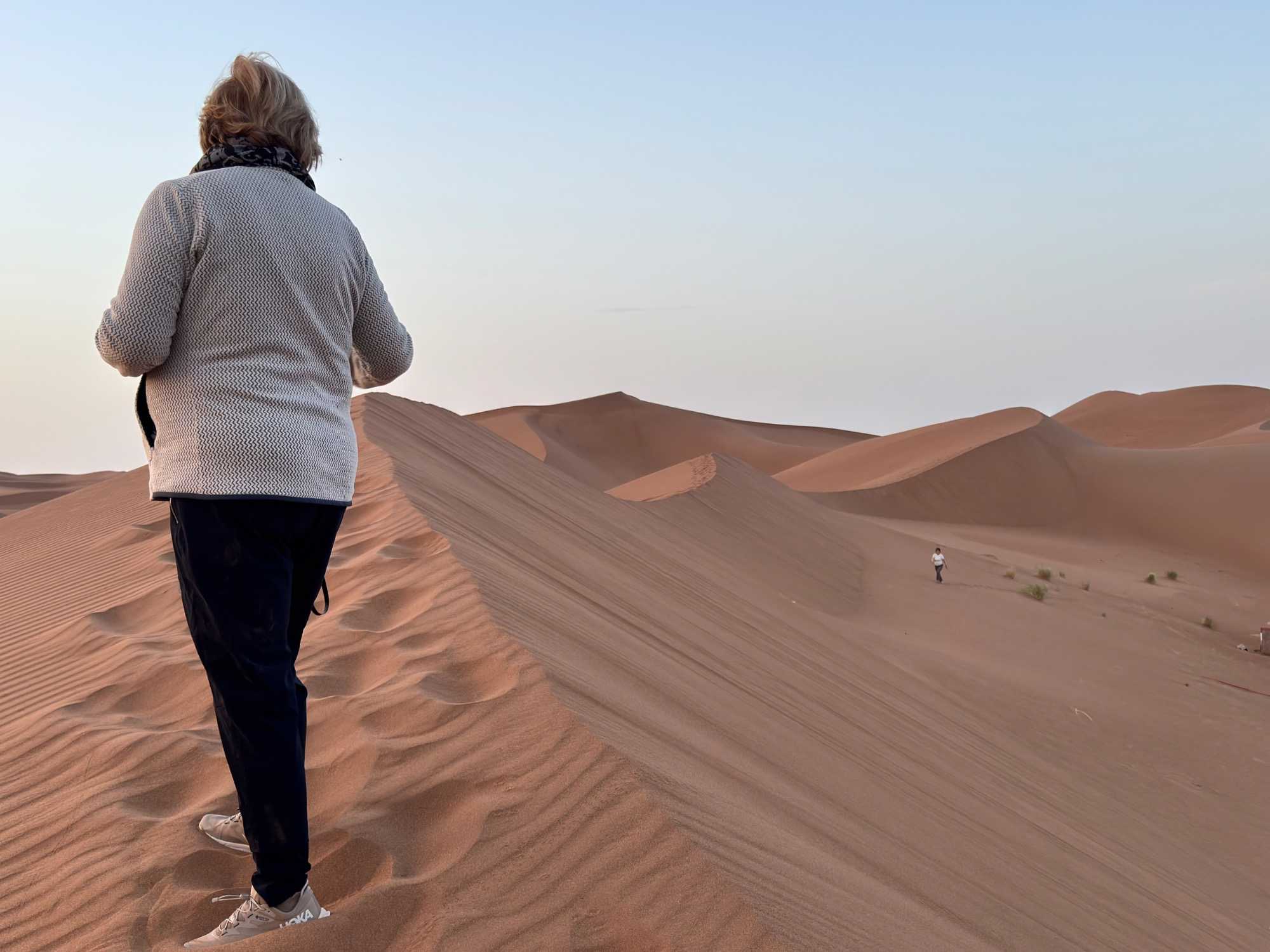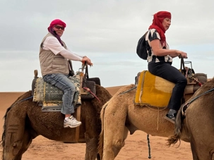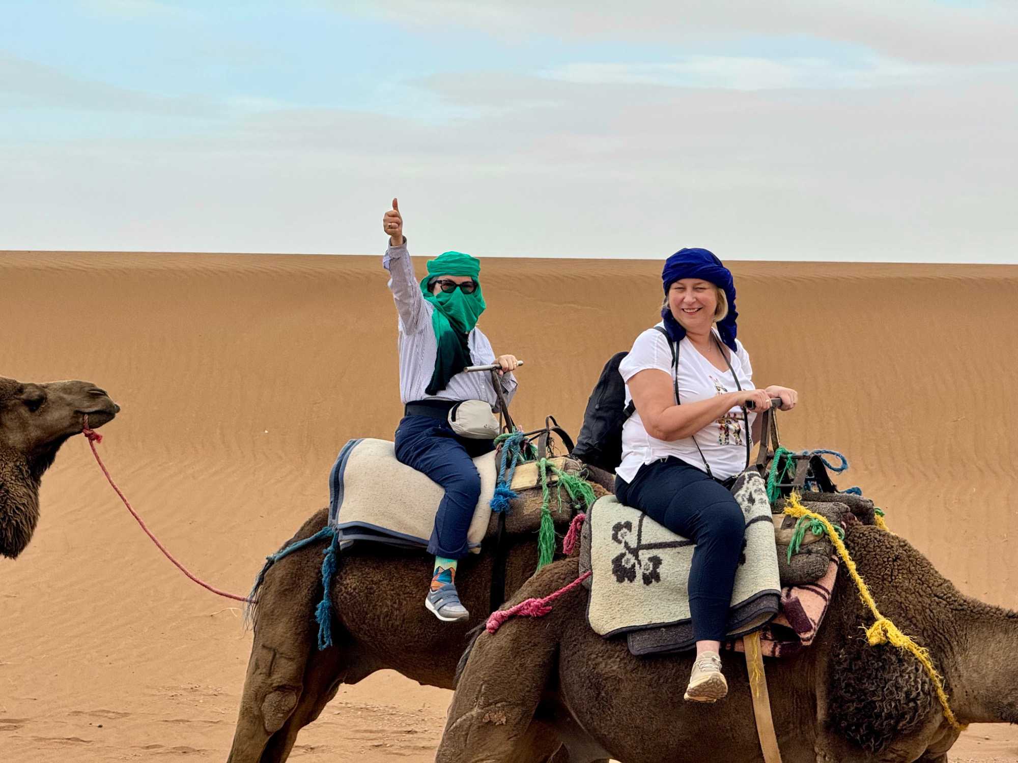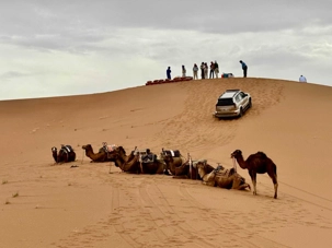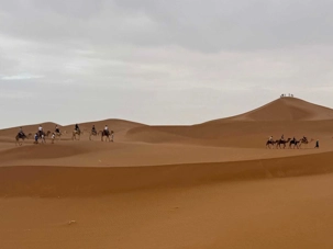 Installés confortablement, nous partons en caravane à travers les dunes. L’expérience est à la fois impressionnante et apaisante. Le mouvement du dromadaire, lent et régulier, nous transporte presque dans une autre dimension.