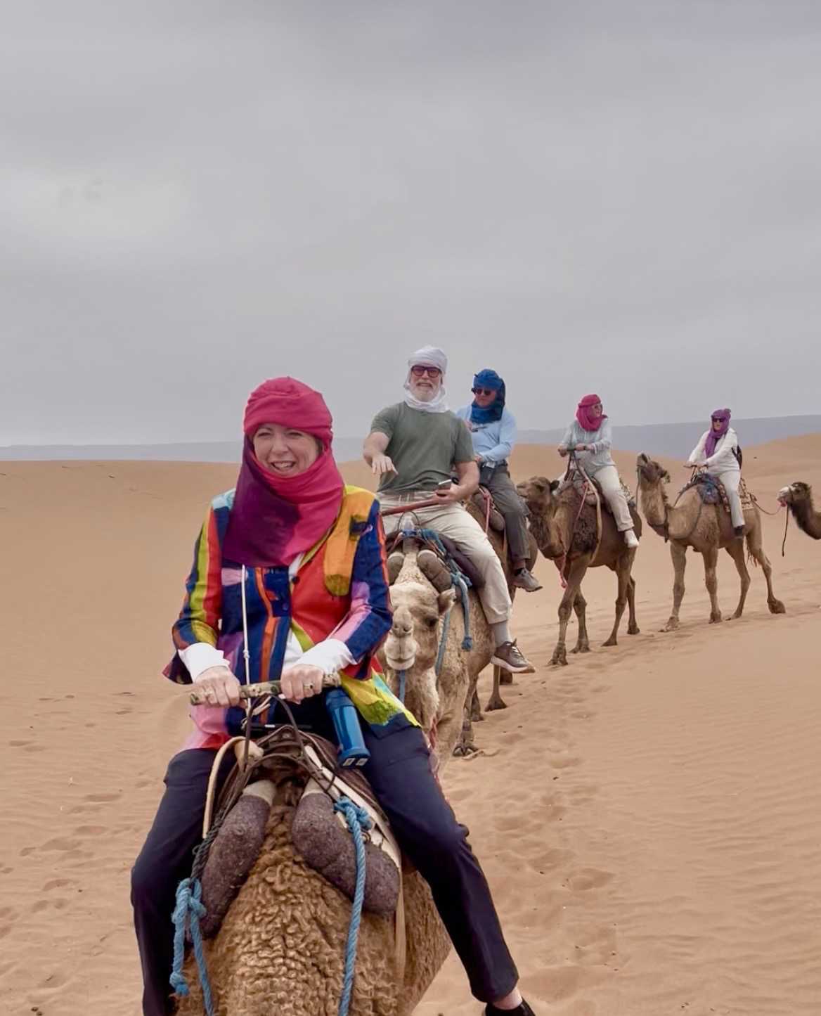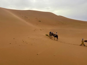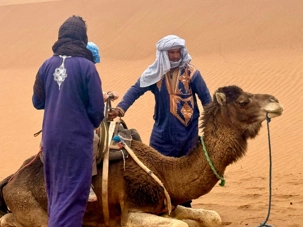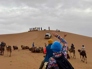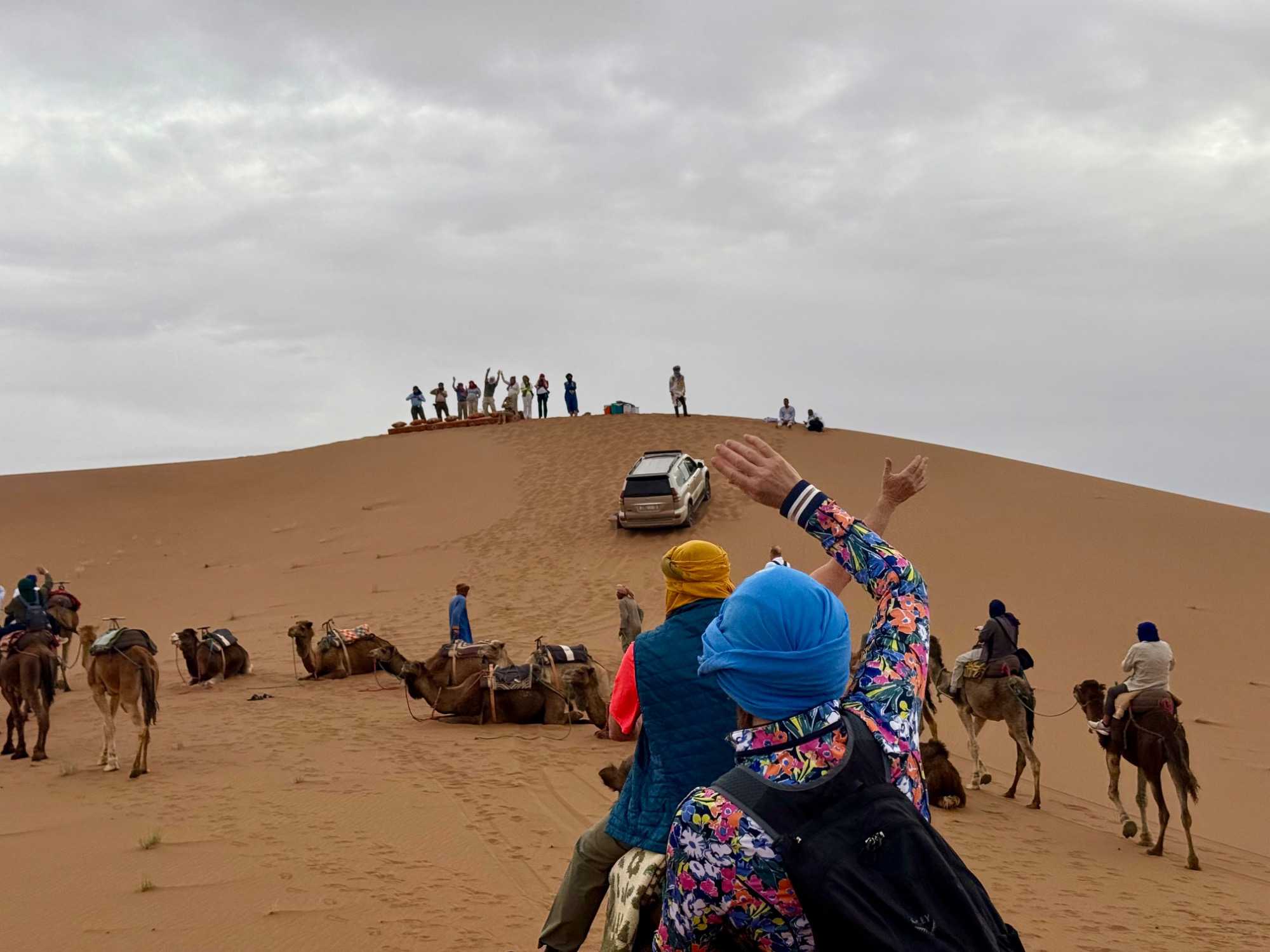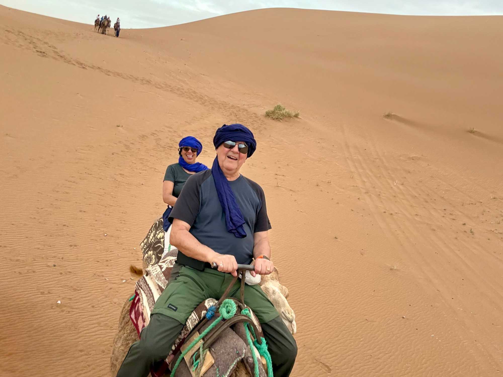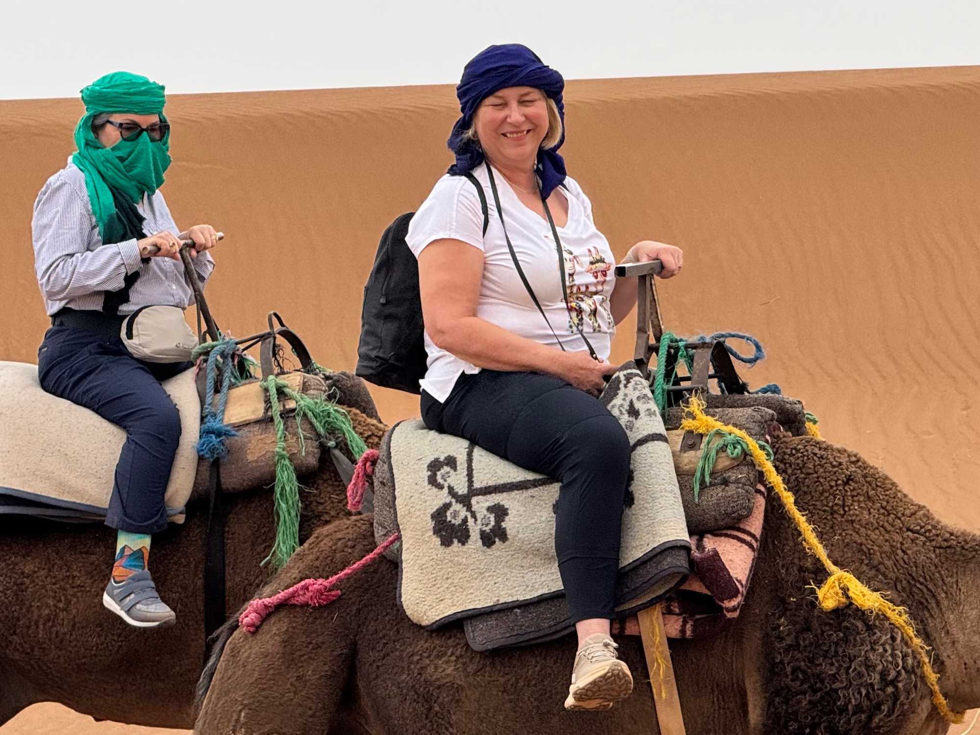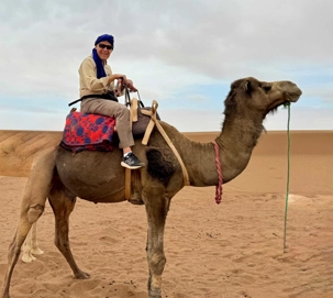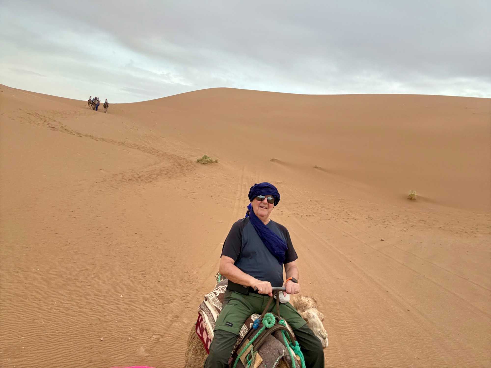 Installés confortablement, nous partons en caravane à travers les dunes. L’expérience est à la fois impressionnante et apaisante. Le mouvement du dromadaire, lent et régulier, nous transporte presque dans une autre dimension.