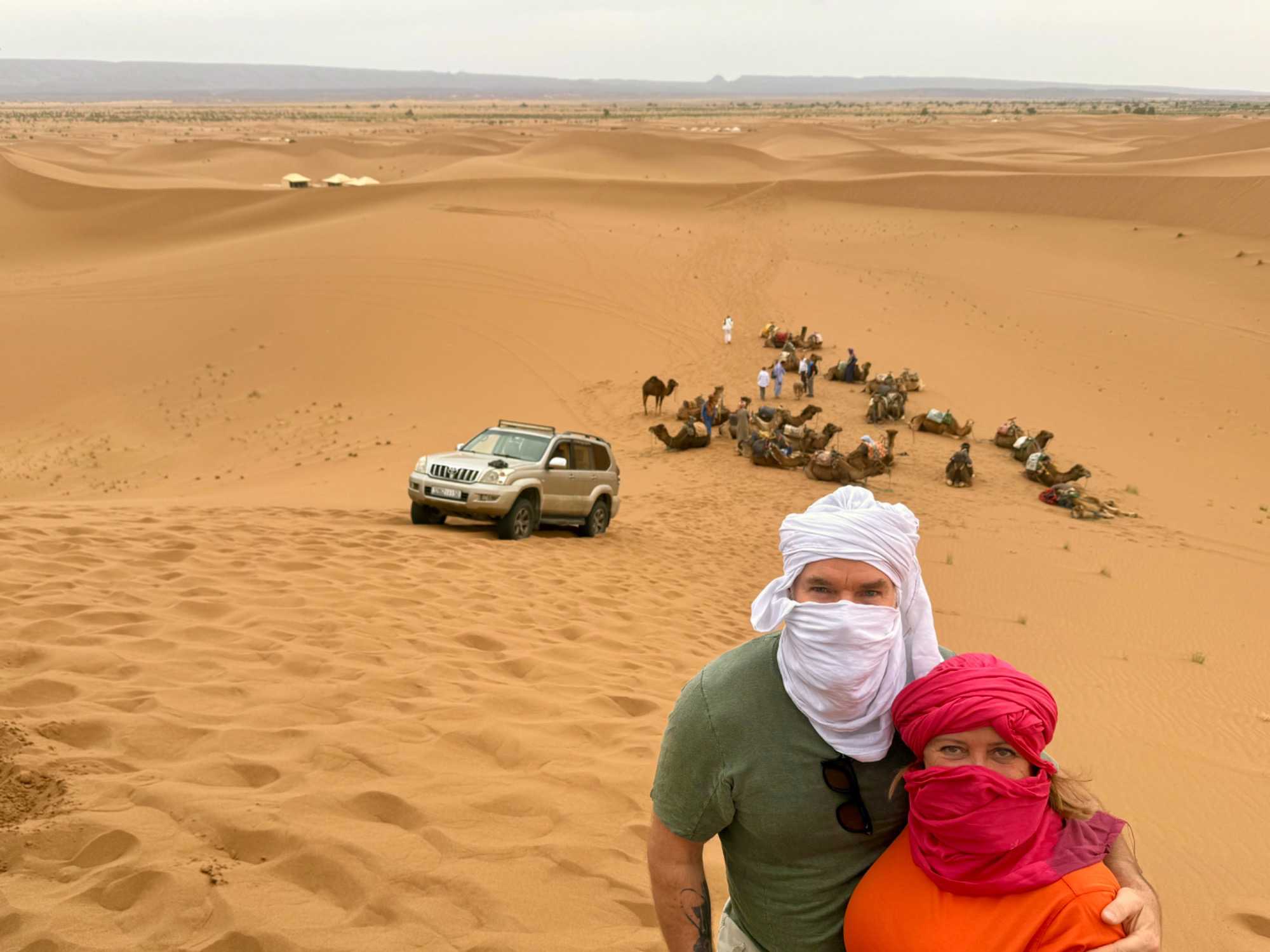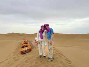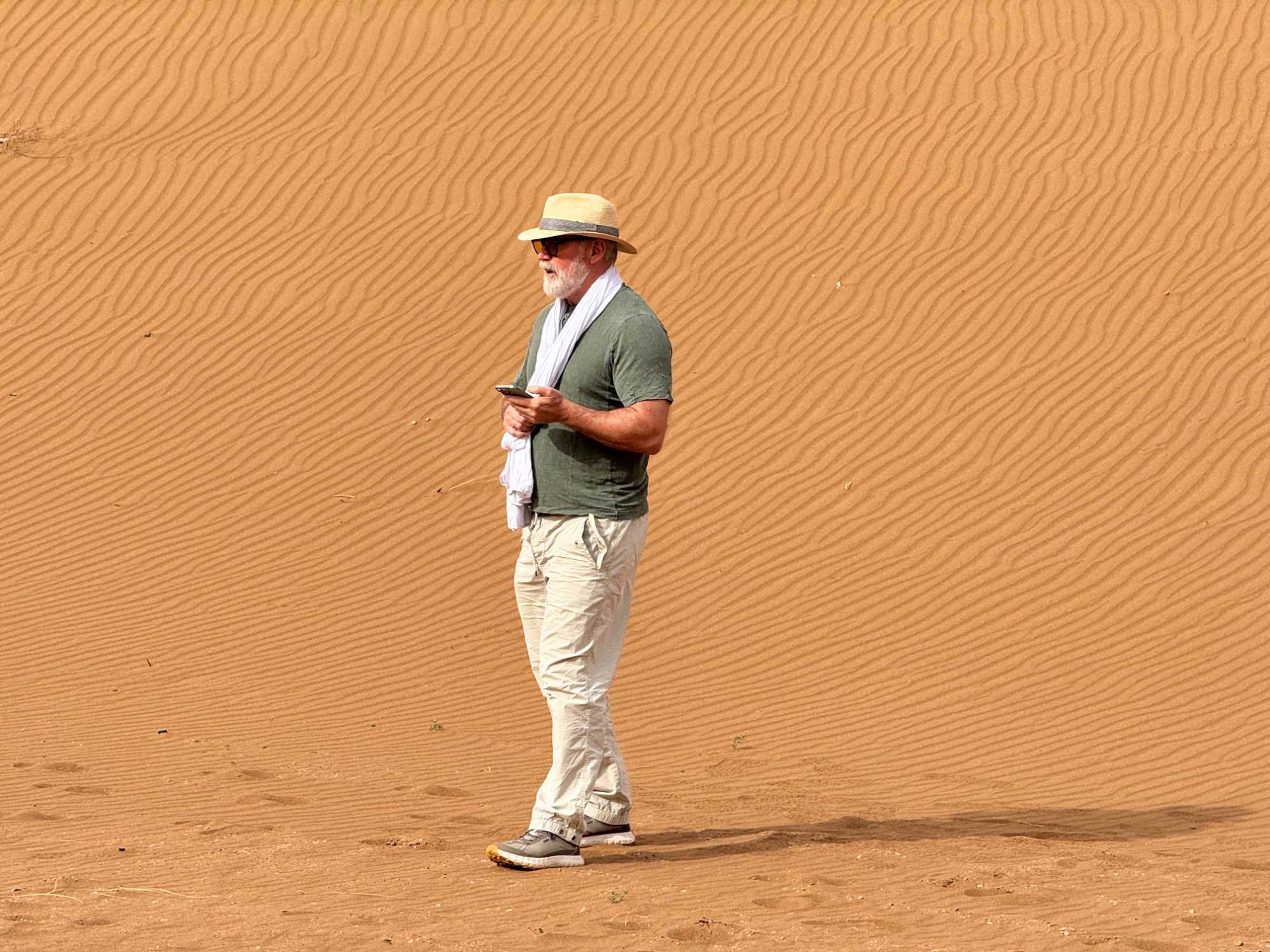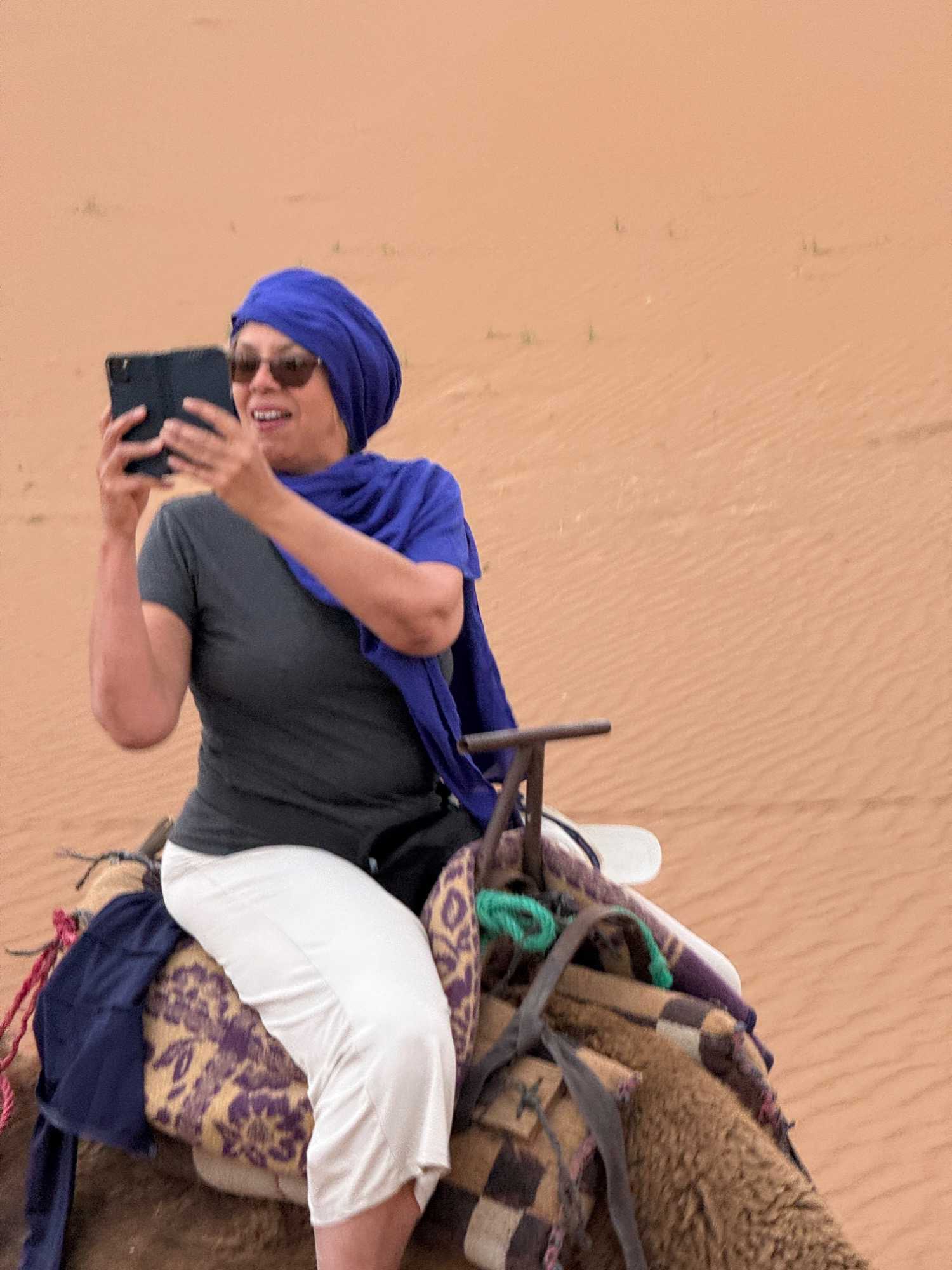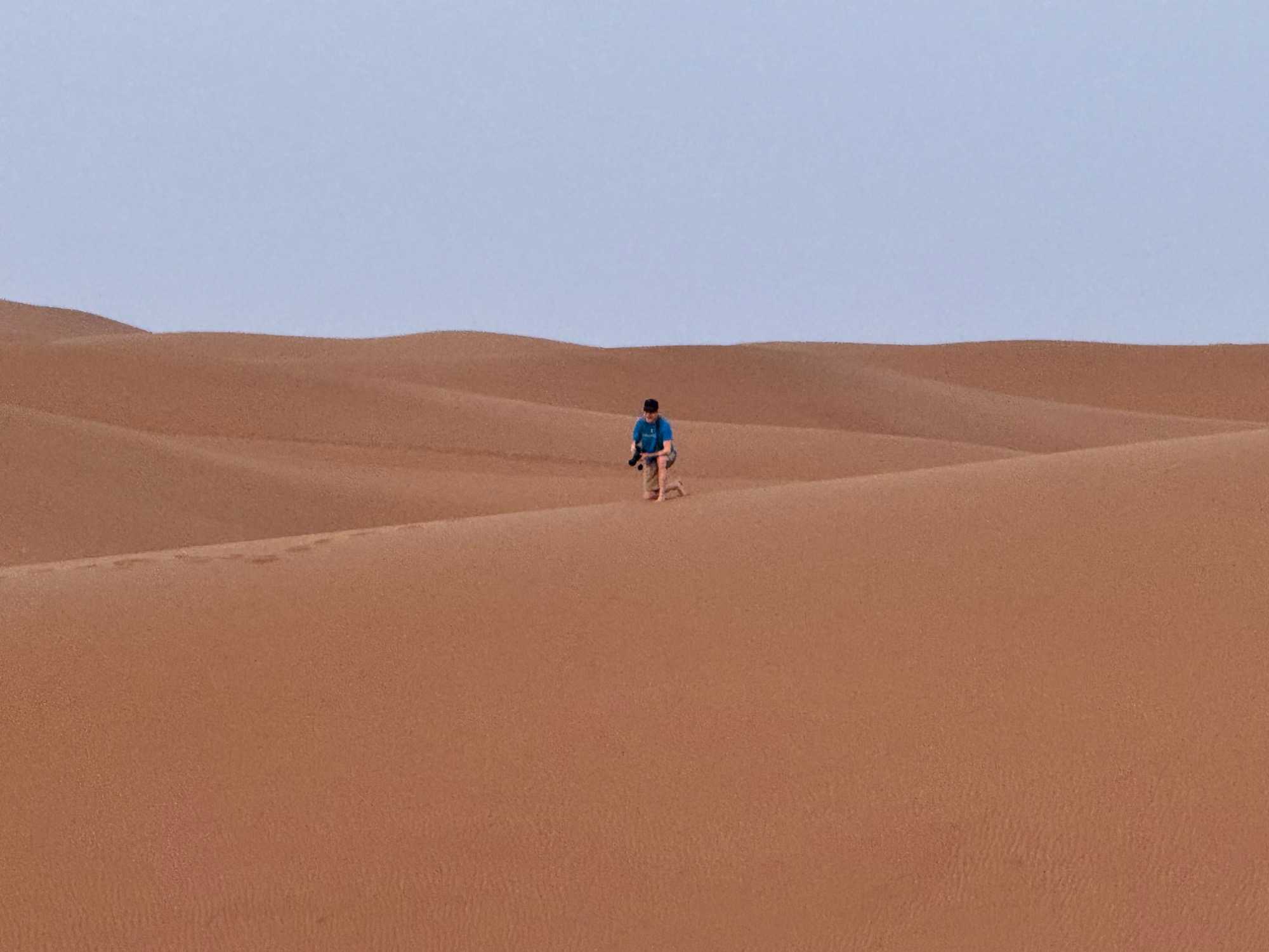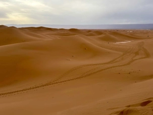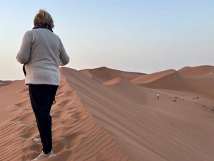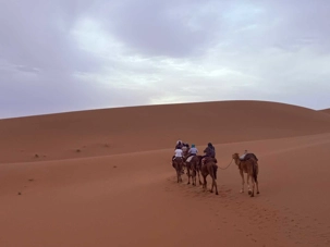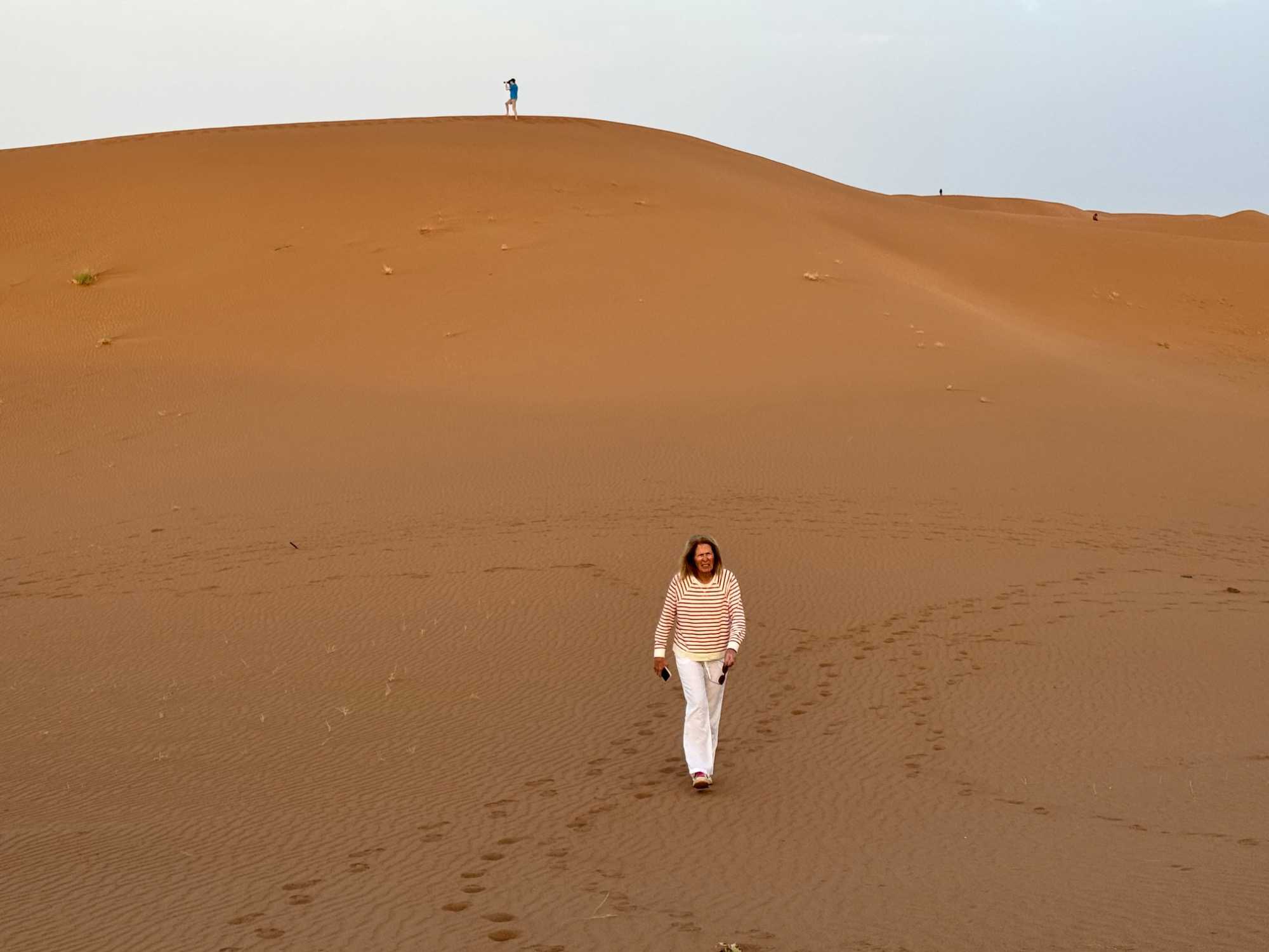 Installés confortablement, nous partons en caravane à travers les dunes. L’expérience est à la fois impressionnante et apaisante. Le mouvement du dromadaire, lent et régulier, nous transporte presque dans une autre dimension.