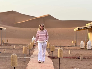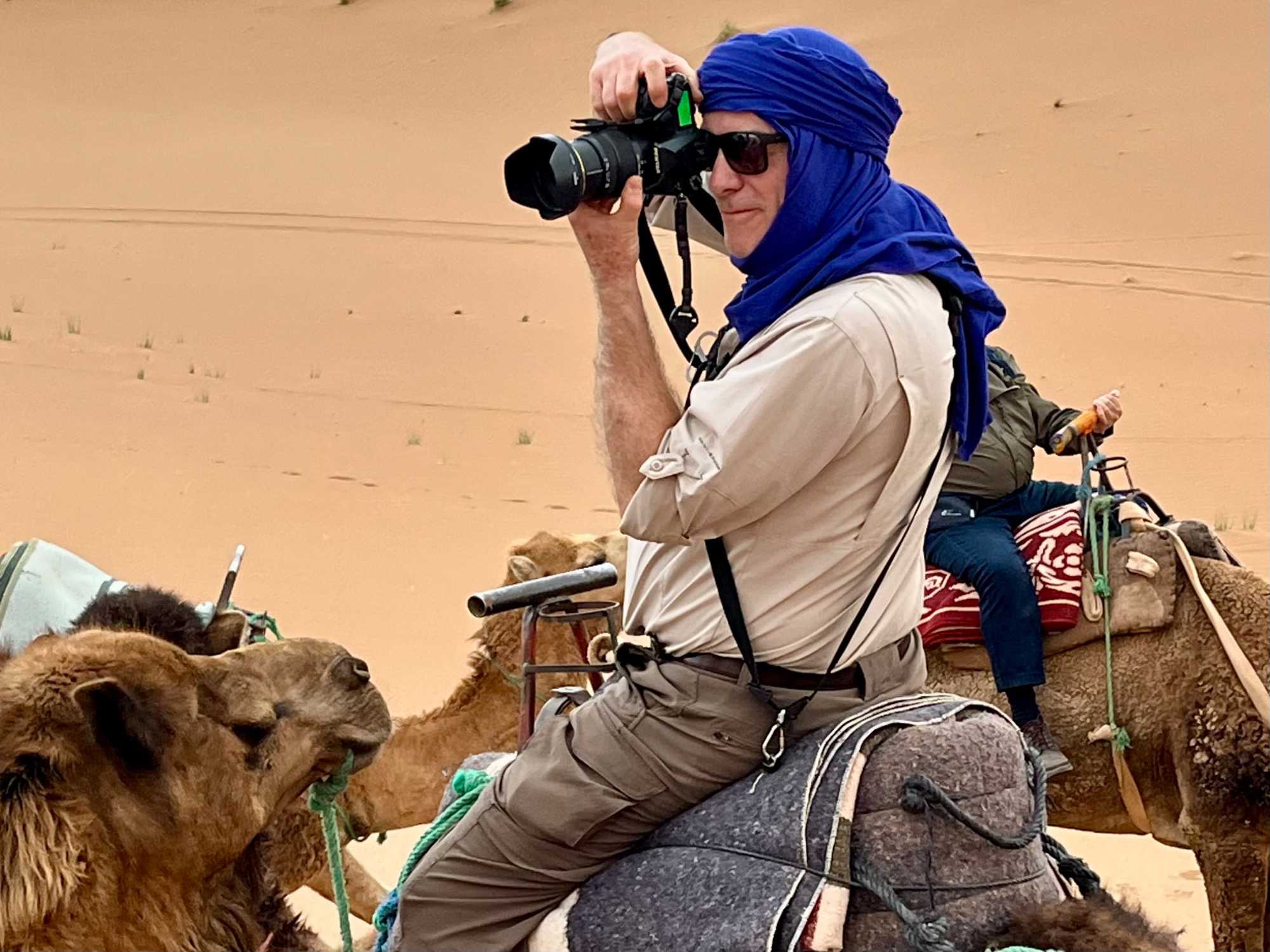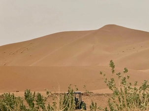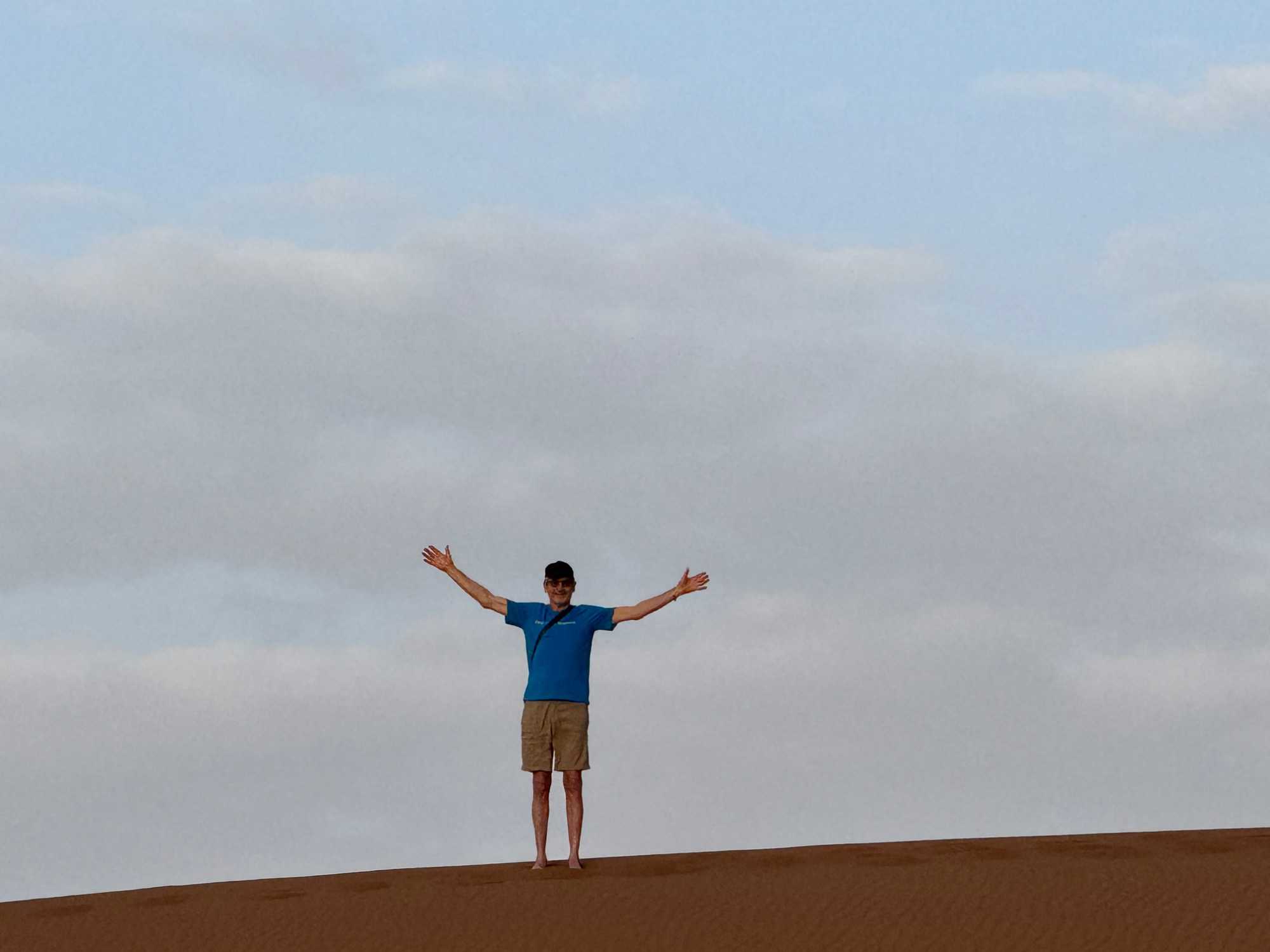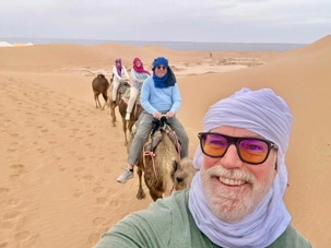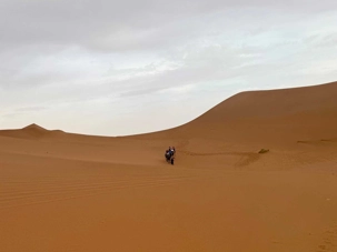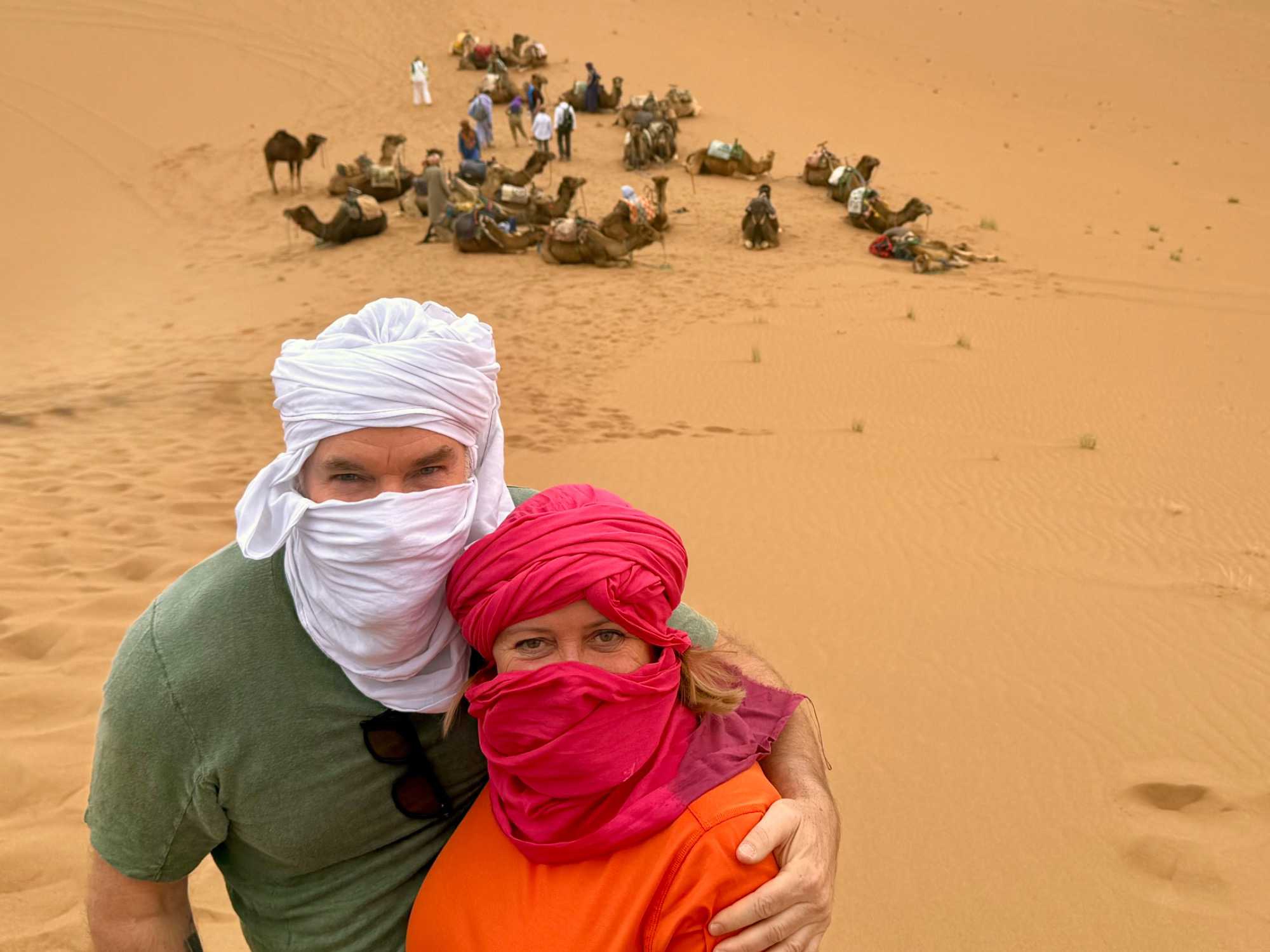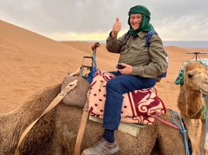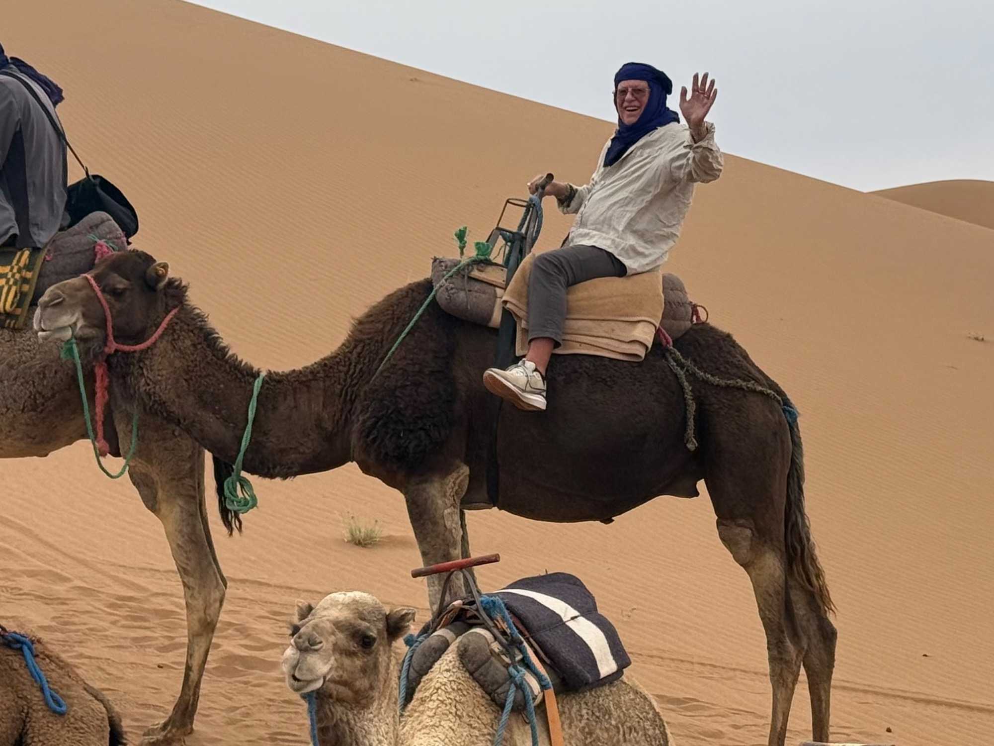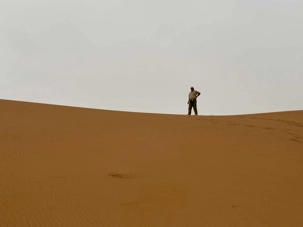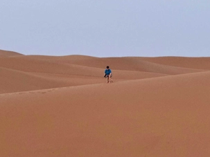 Installés confortablement, nous partons en caravane à travers les dunes. L’expérience est à la fois impressionnante et apaisante. Le mouvement du dromadaire, lent et régulier, nous transporte presque dans une autre dimension.