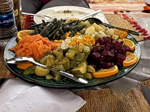Notre équipe avait tout préparé avec soin : tapis, coussins, petites bouchées, olives, noix, pistaches… et même du vin servi dans de vrais verres. Une attention délicate, dans un décor à couper le souffle.