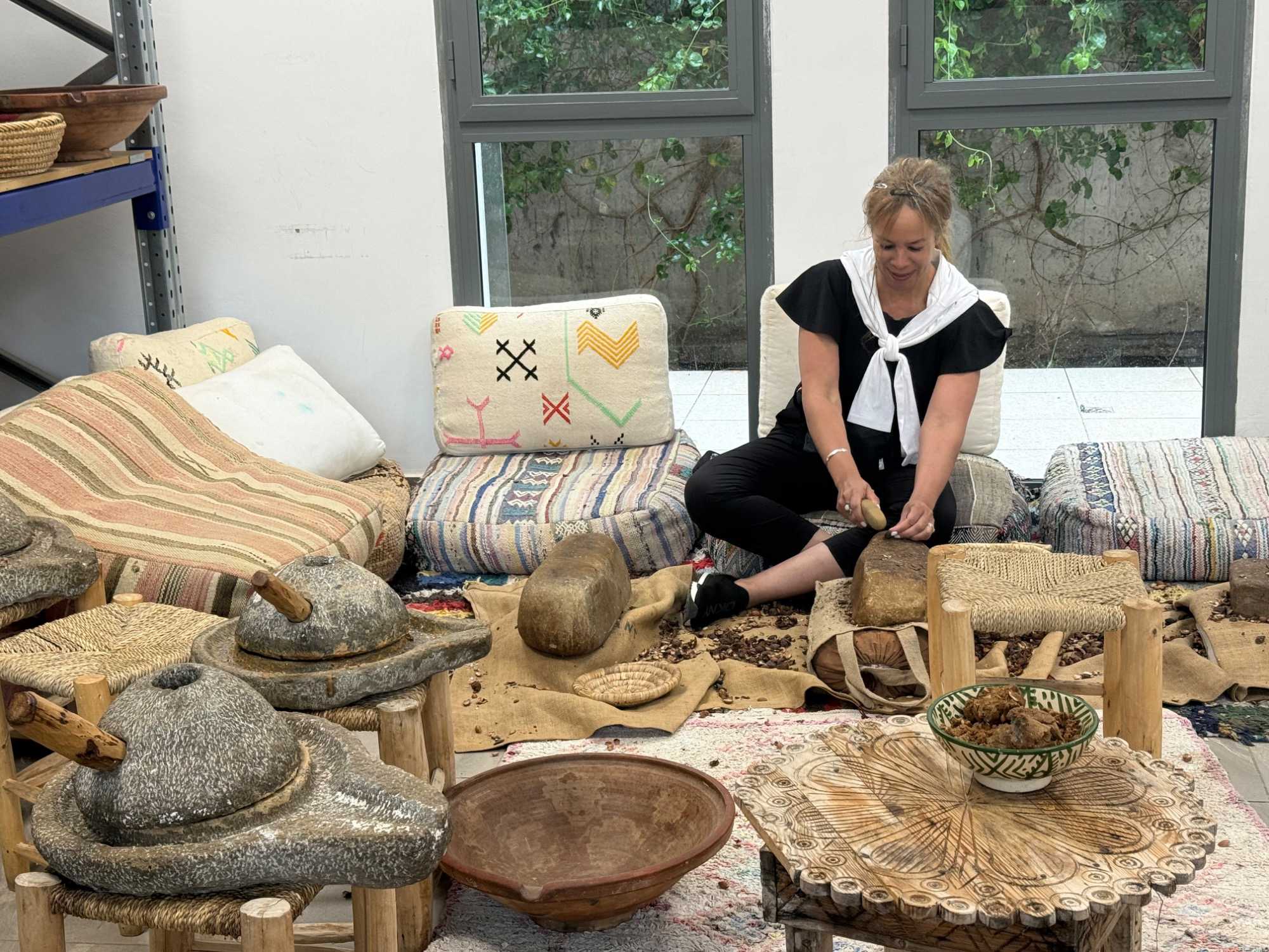 Au fil de la visite, guidés par une passionnée, nous découvrons toute la richesse de cette culture unique, mais aussi la réalité du travail qu’elle représente. La récolte des fruits de l’arganier est effectuée principalement par des coopératives de femmes, dans des conditions parfois exigeantes. Après le séchage des fruits, commence un travail long et minutieux : il faut extraire la noix, puis la casser à la main, pierre contre pierre, pour en retirer les précieuses amandes. Un geste ancestral, répété des milliers de fois, qui demande patience, force et savoir-faire.