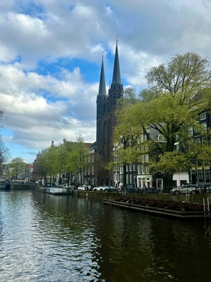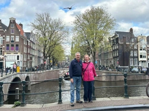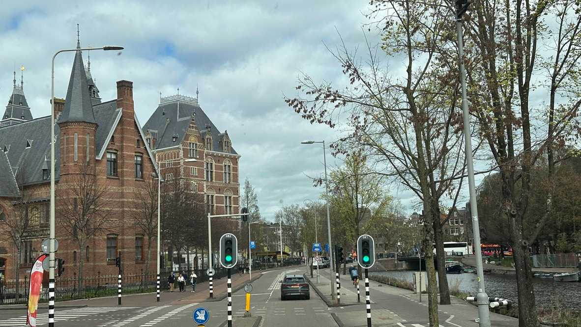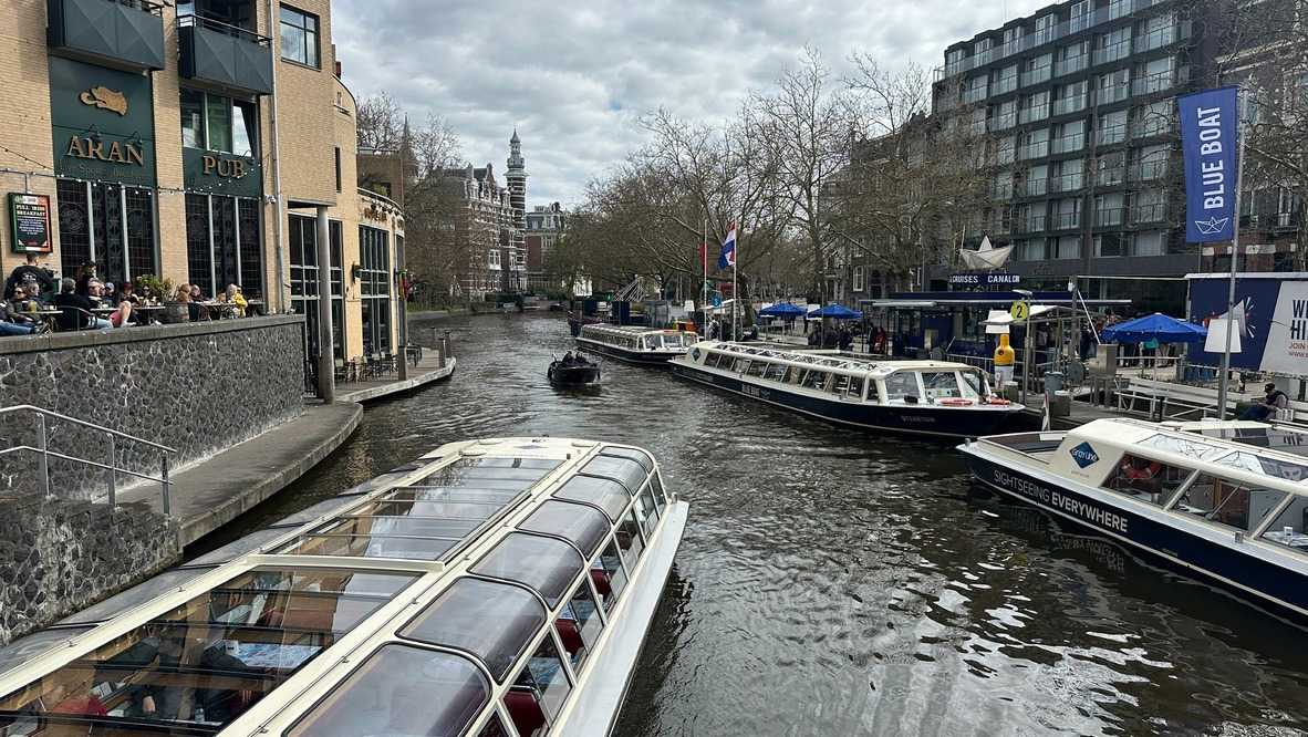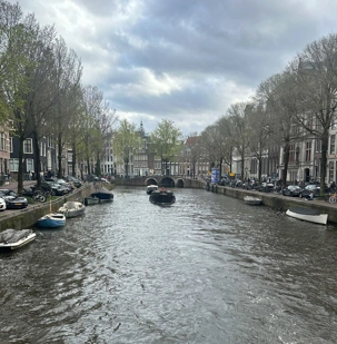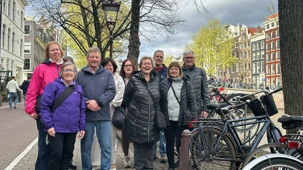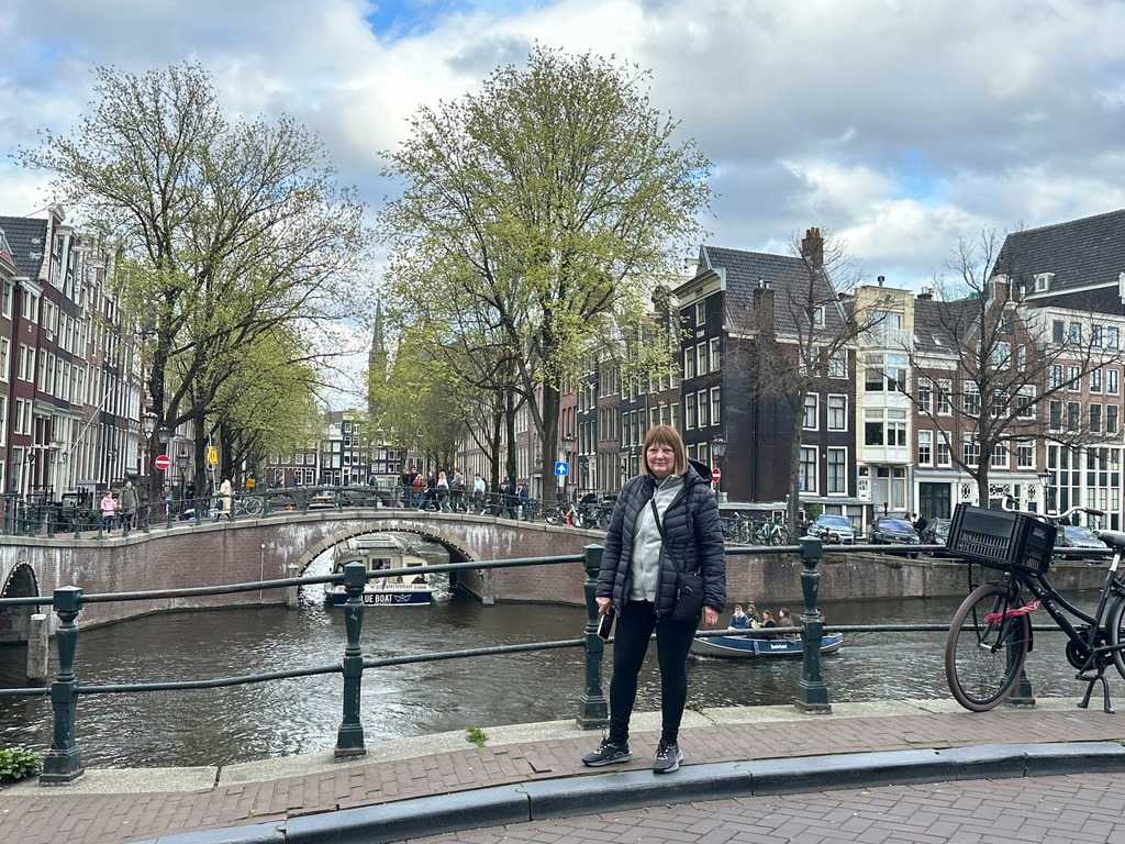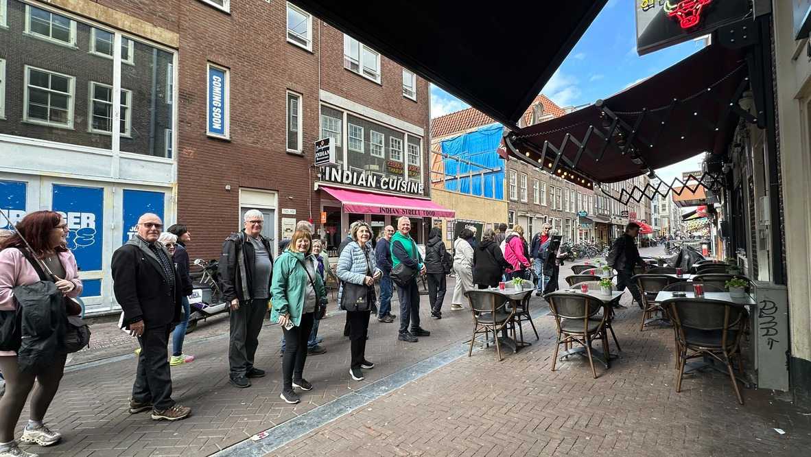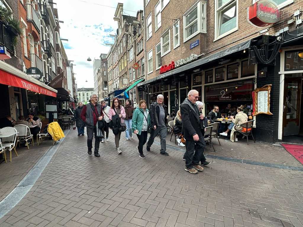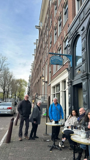 Nous apercevons nos premiers canaux, le réseau de pistes cyclables omniprésent le long de ces derniers, et ces maisons en hauteur typiques d’Amsterdam. Des gargouillements au ventre nous font comprendre que l’heure du lunch approche. Mon expérience d’accompagnatrice me fait réaliser que le premier dîner après un vol de nuit est salutaire pour ragaillardir 25 voyageurs un peu amochés. De généreuses portions nous attendent : crème de tomates, suivi d’un blanc de poulet, de frites, d’une salade et de profiteroles accompagnés d’une traditionnelle crème chantilly. Un bon verre de vin ou une bière rafraîchissante, et hop, les batteries sont rechargées !
