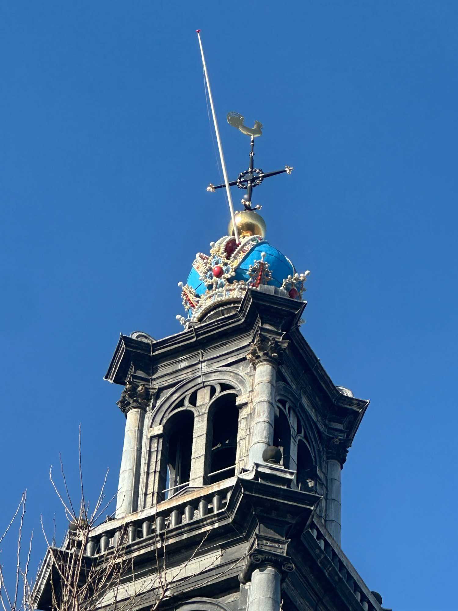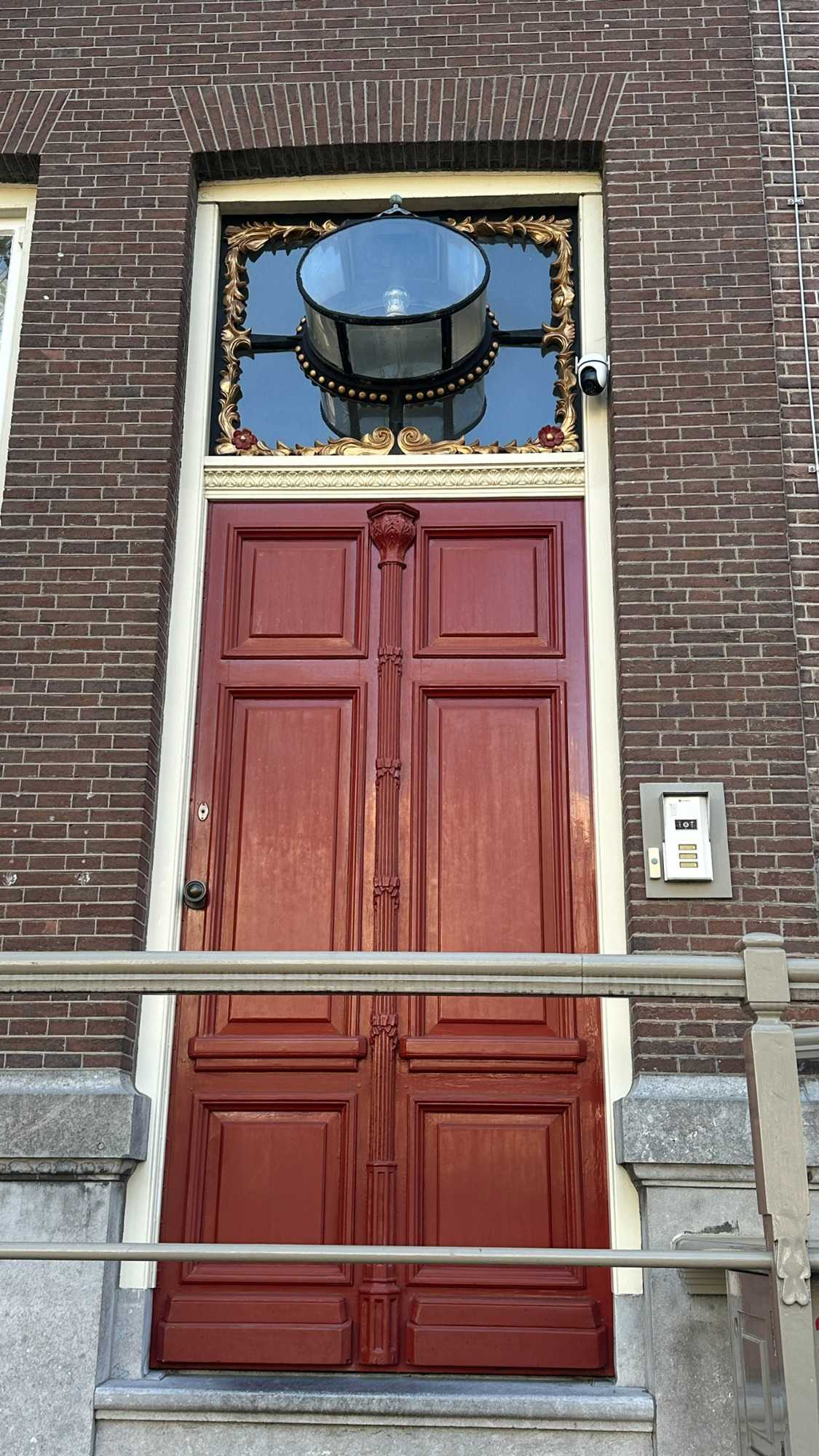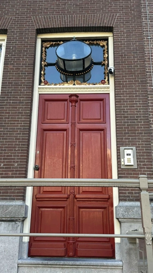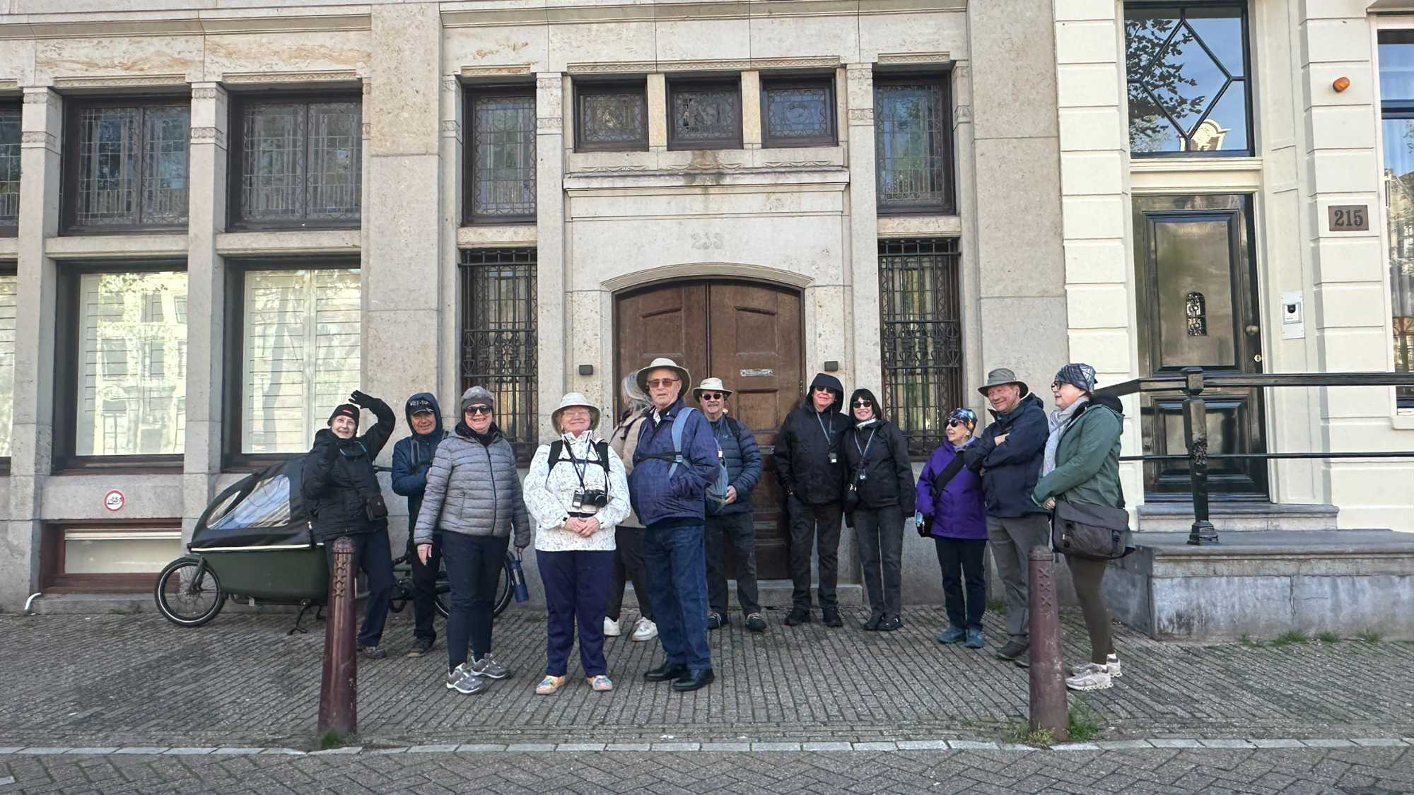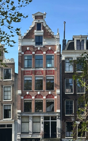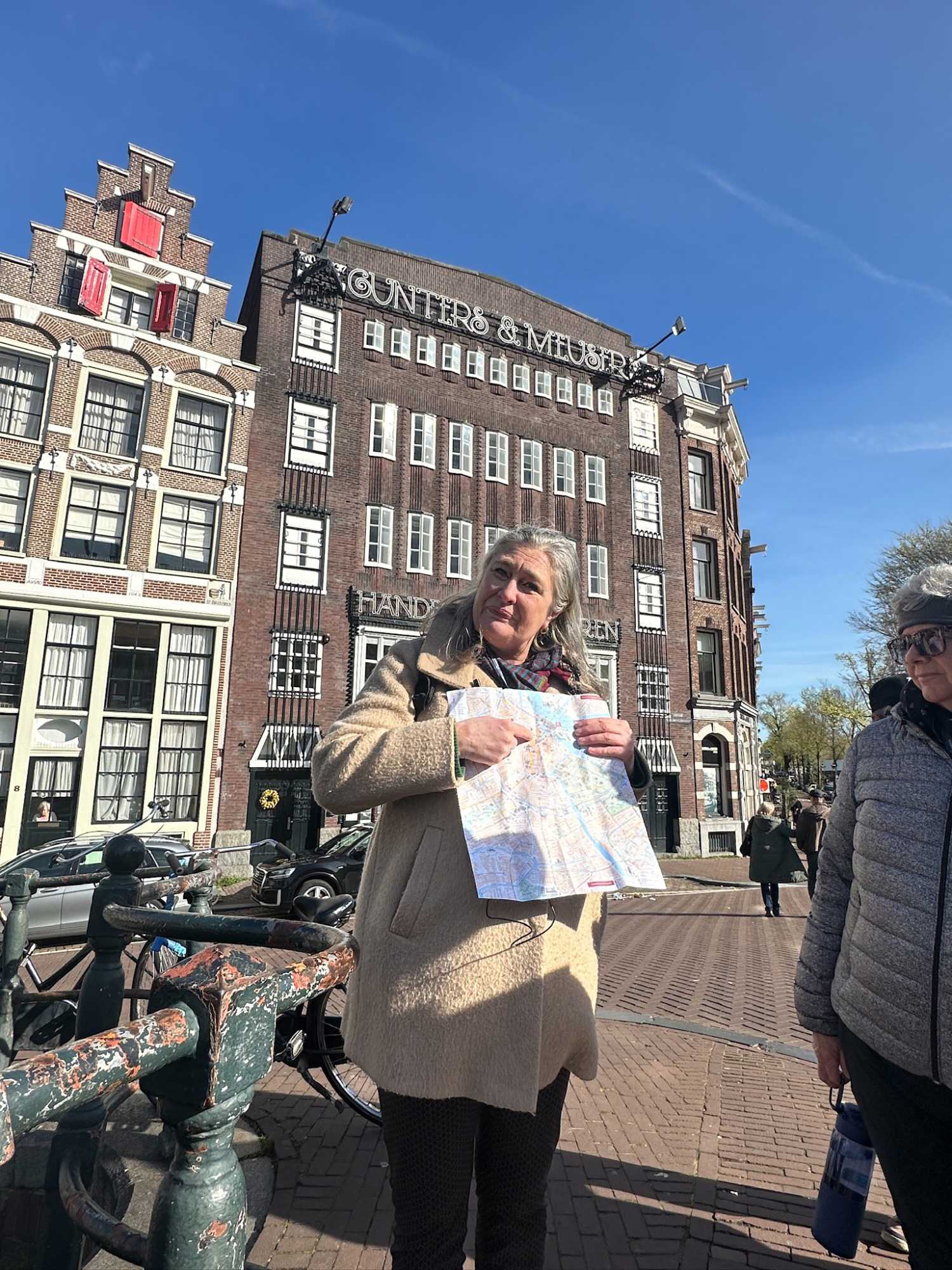 Geneviève nous fait lever les yeux. Là-haut, au sommet des maisons, ces fameux crochets métalliques qui intriguent. Ce ne sont pas des détails décoratifs : ils servaient (et servent encore) à hisser les marchandises directement aux étages supérieurs. Les escaliers étant trop étroits pour transporter des charges, tout passait par les fenêtres, d’où des façades volontairement construites de manière inclinée vers l’avant afin d’éviter que les objets ne cognent contre les murs. Ingénieux… et typiquement amstellodamois. Et pourquoi cette étroitesse des bâtiments ? Eh bien, la taxation était basée sur la largeur du bâtiment et on préférait ainsi construire les maisons sur quelques étages plutôt qu’en largeur afin de réduire les frais ! Nous avons tous adoré notre tour!