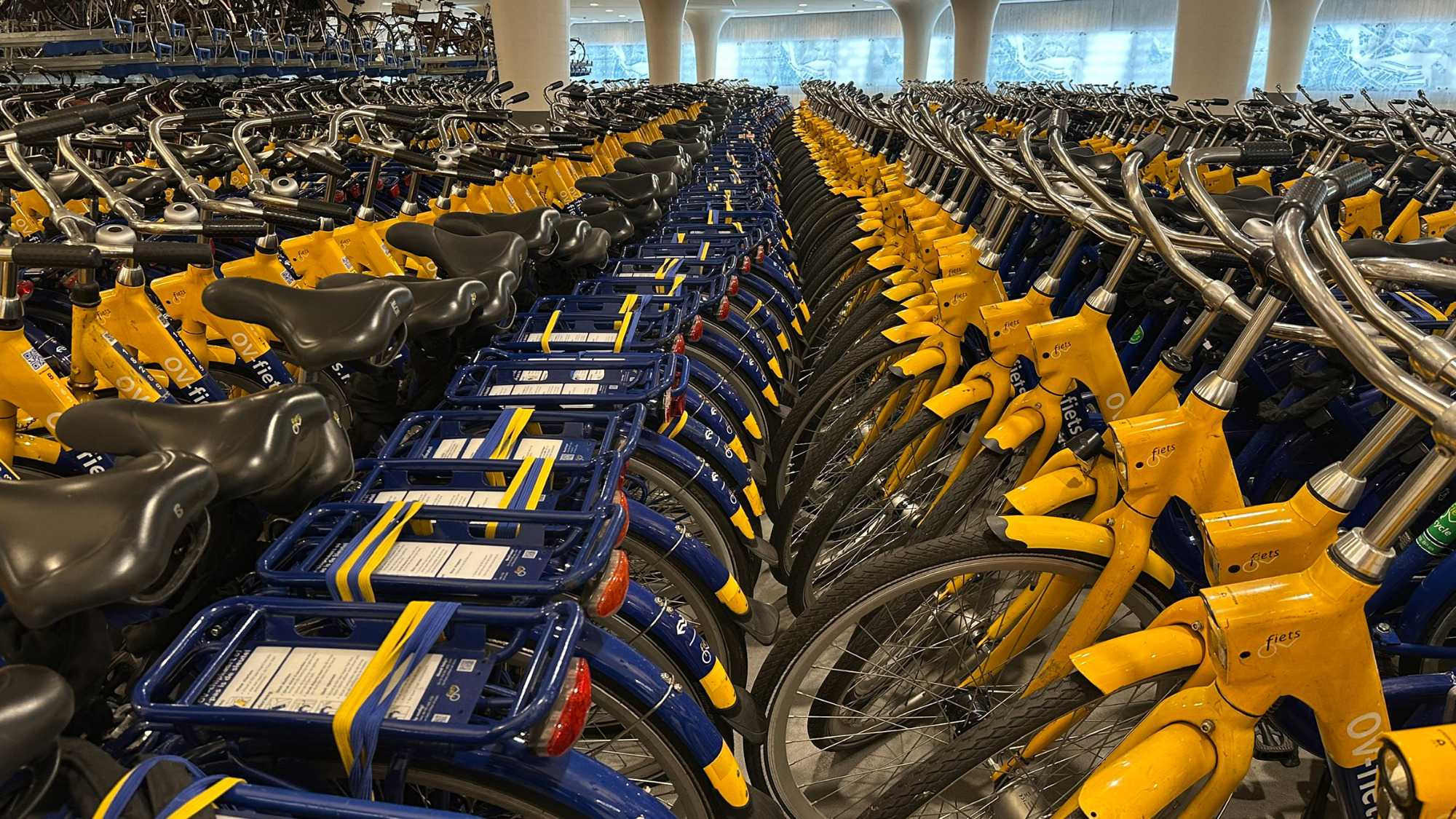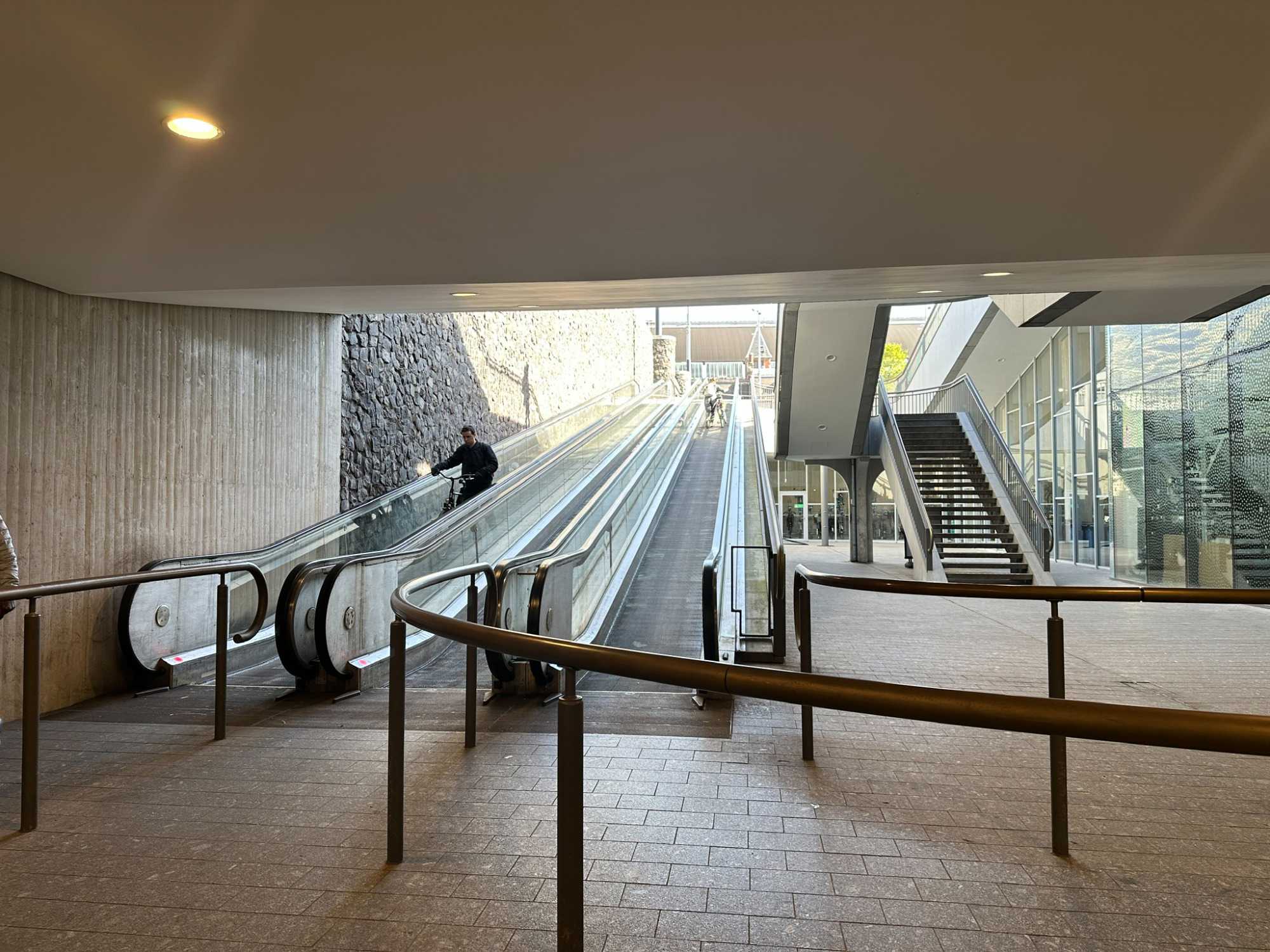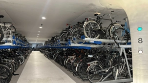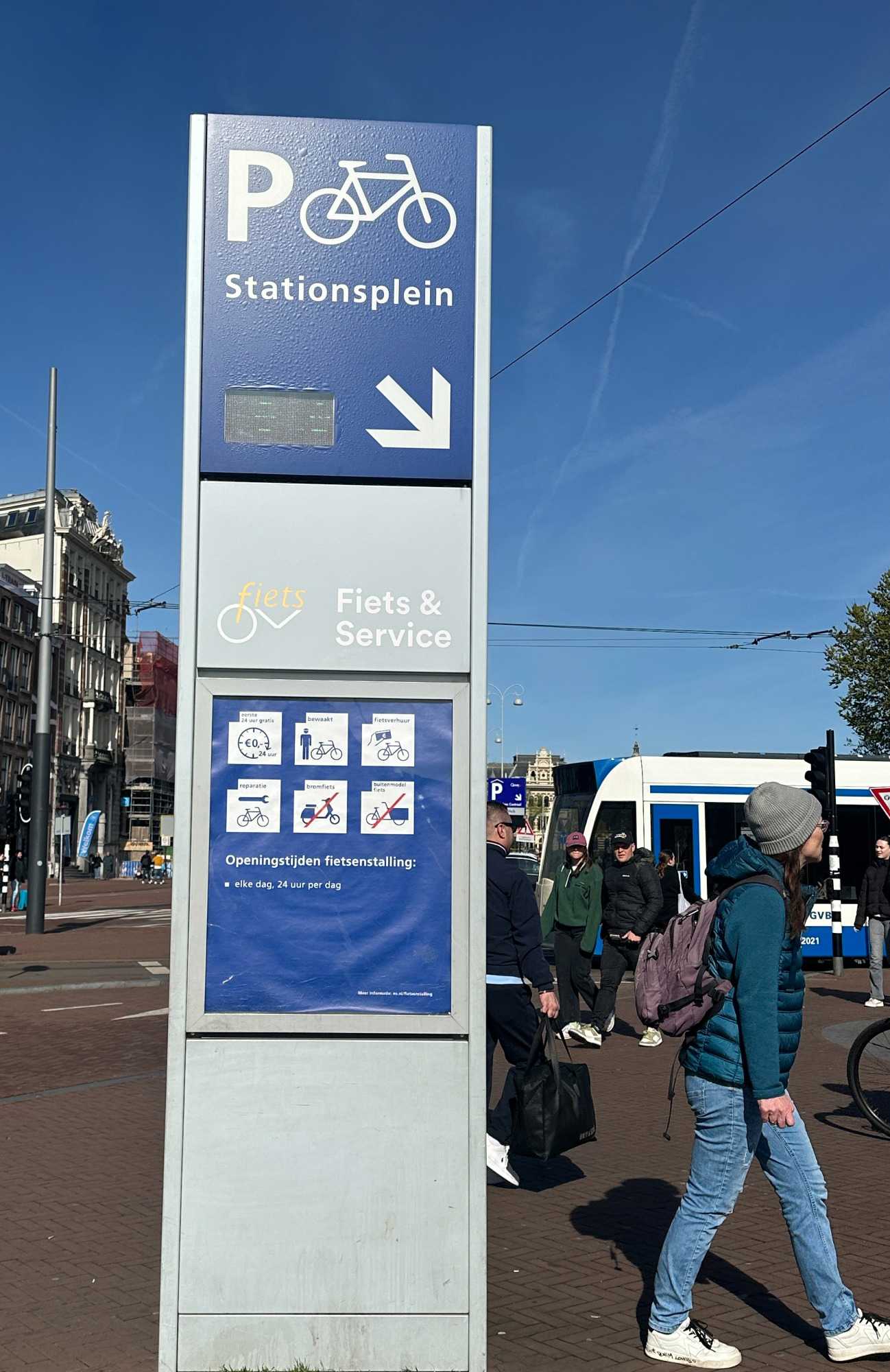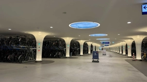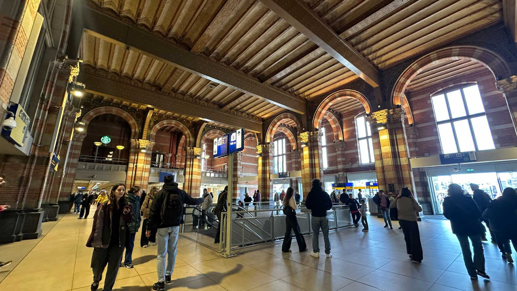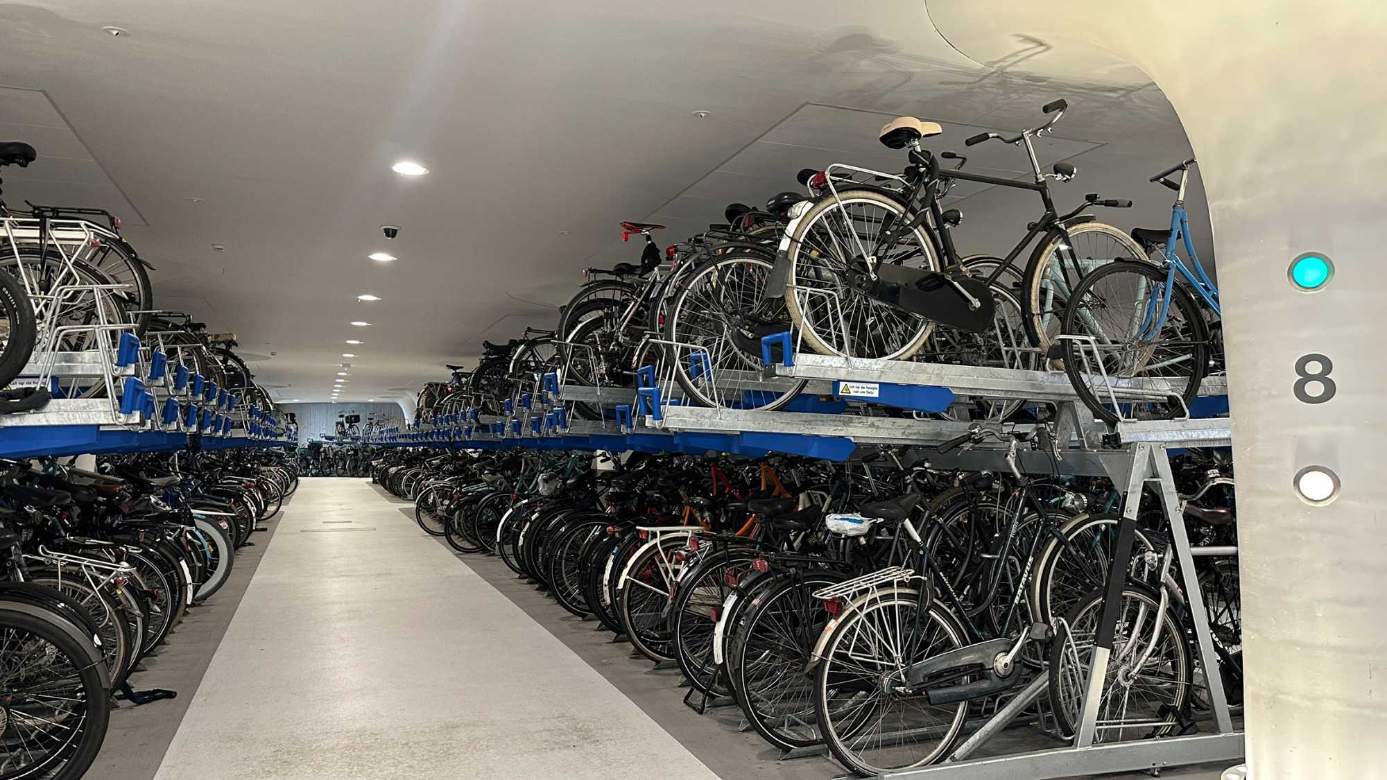 On poursuit vers un lieu emblématique : la Gare centrale d’Amsterdam. Imposante, presque théâtrale, elle a été inaugurée en 1889 et construite sur… une île artificielle, elle-même soutenue par des pieux. Son architecte, Pierre Cuypers, le même que celui du Rijksmuseum, lui a donné cette allure néo-gothique. Sous la Gare centrale d’Amsterdam, le stationnement souterrain pour vélos se présente comme une infrastructure moderne très organisée. Ouvert en 2023, il offre environ 7 000 places (auxquelles s’ajoutent d’autres à proximité, portant la capacité totale autour de la gare à plus de 10 000 vélos). Les usagers descendent avec leur vélo, accèdent à un emplacement par leur titre de transport, puis l’installent sur des supports à deux niveaux. Les 24 premières heures sont gratuites, après quoi un tarif s’applique automatiquement.