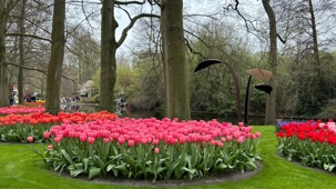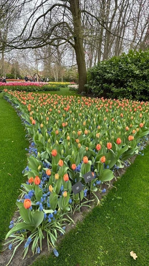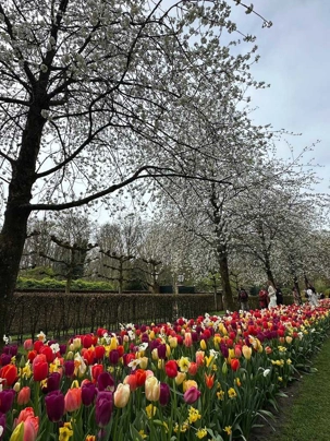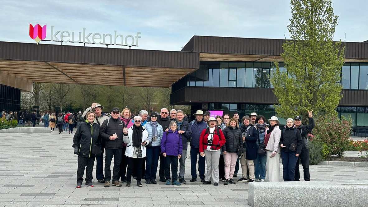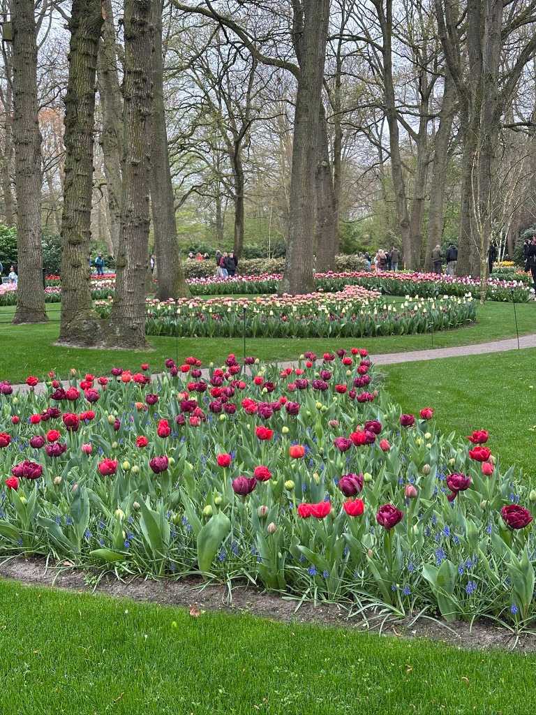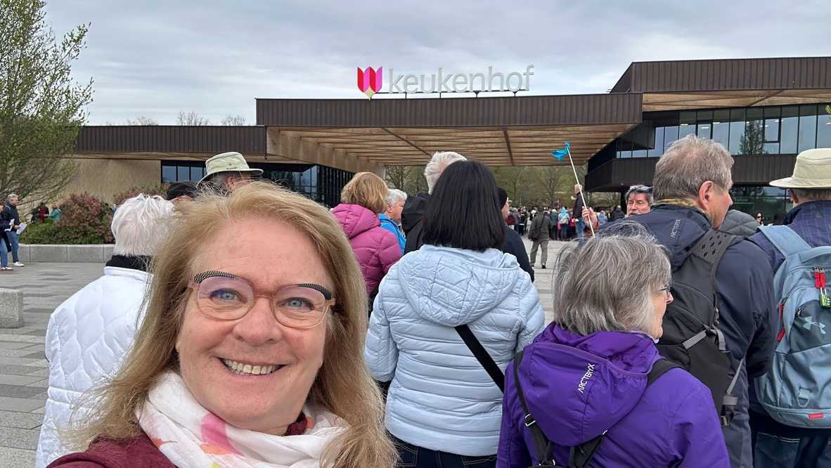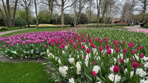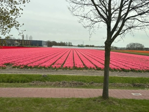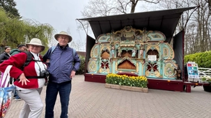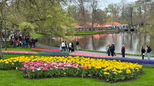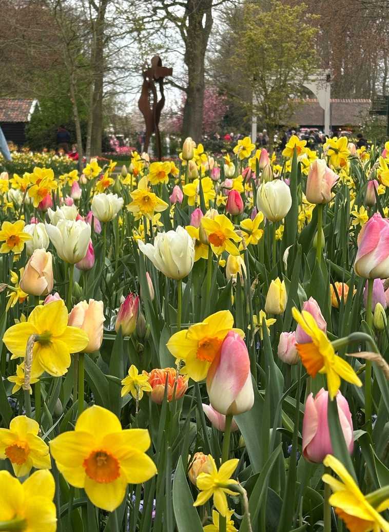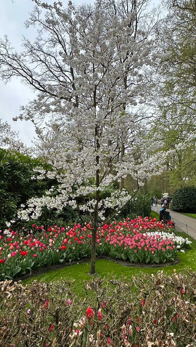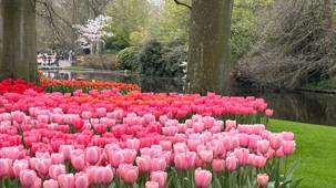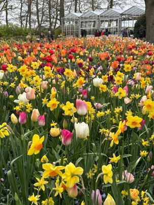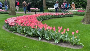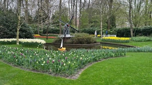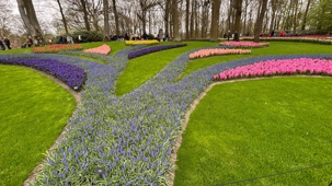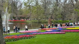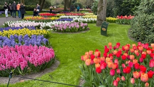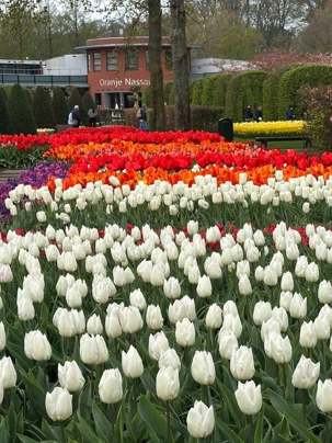 Ce lundi 13 avril devrait rester longtemps dans la mémoire de vos proches puisqu'ils ont l'occasion aujourd’hui de visiter les très célèbres jardins, mondialement connus, de Keukenhof. Ouvert pour une courte période annuellement, soit du 19 mars au 10 mai cette année, Keukenhof, expose près de 7 millions de plantes à bulbes en fleurs. Afin que chacun profite au maximum de sa journée, le groupe se sépare pour goûter au plaisir de faire la visite comme bon lui semble et flâner à sa guise. On peut admirer des massifs de tulipes, jacinthes, jonquilles et autres espèces colorées. C’est vraiment de toute beauté de voir toutes ces couleurs, variétés de fleurs savamment agencées pour notre plus grand plaisir. Keukenhof s’enorgueillit d’être le plus populaire jardin botanique au monde et vante ses magnifiques arrangements floraux depuis plus de 75 ans. Les jardins de Keukenhof accueillent en moyenne environ 25 000 visiteurs par jour pendant leur ouverture printanière de huit semaines. Avec plus de 1,4 million de visiteurs sur une cinquantaine de jours, la fréquentation dépasse régulièrement les 45 000 personnes par jour lors des week-ends de pointe et de Pâques. Dame nature est de notre bord dirait-on; ciel légèrement couvert, timides percées de soleil, aucun vent, une température de 13ºC. C’est juste parfait pour faire une balade tout en étant bien habillé pour admirer ces beautés. Déjà nos voyageurs sont impressionnés de constater le grand nombre de voitures et d’autocars stationnés sur les terrains environnants.