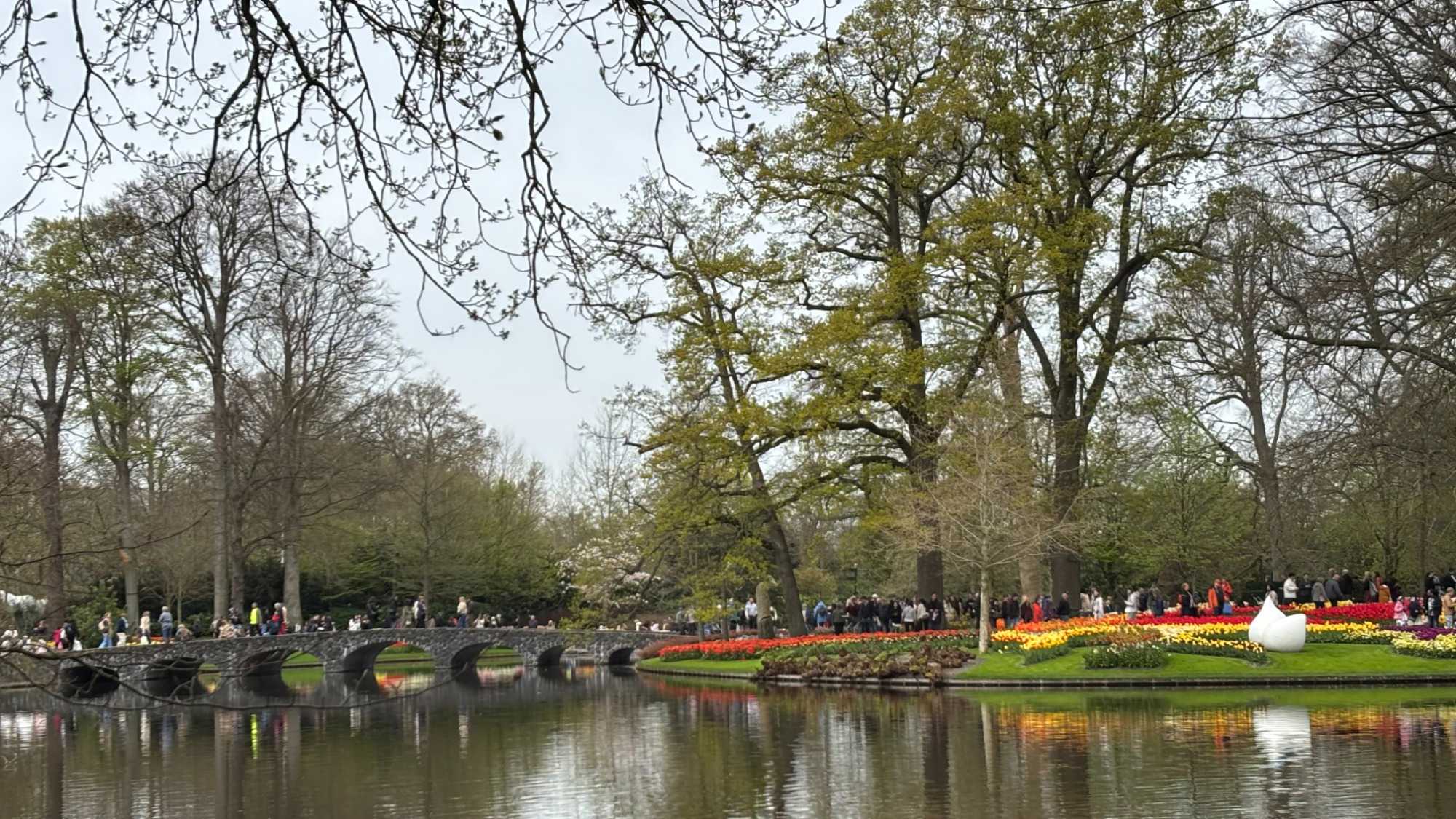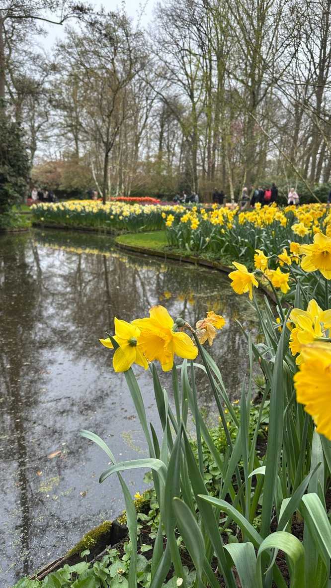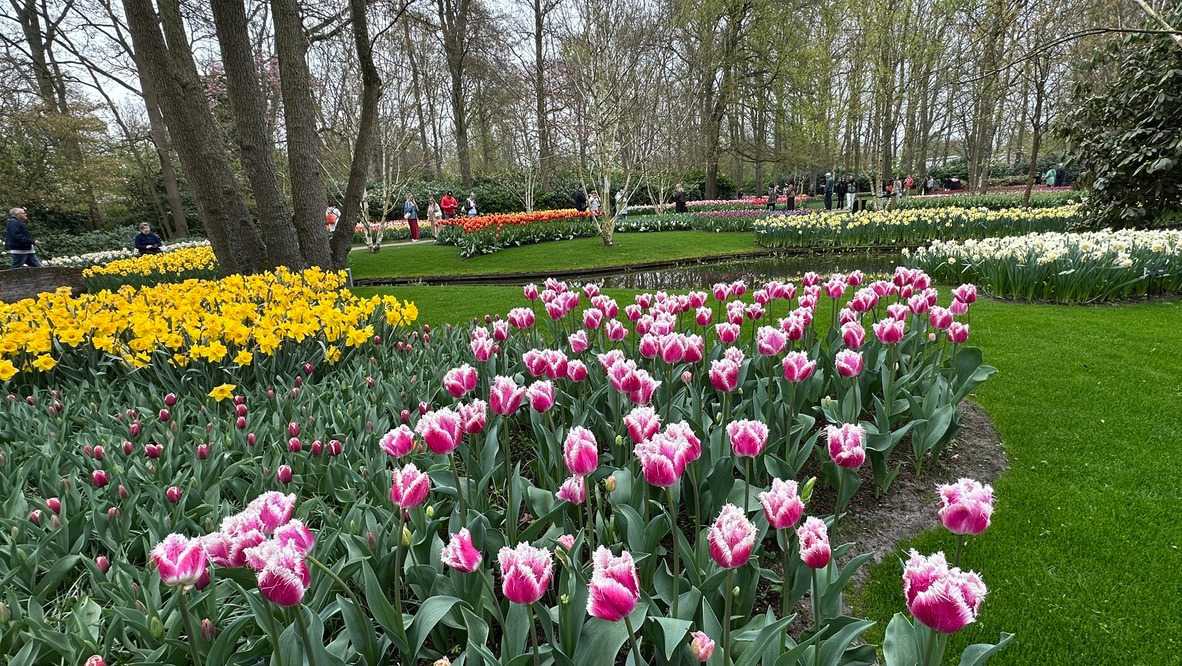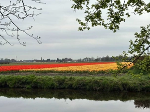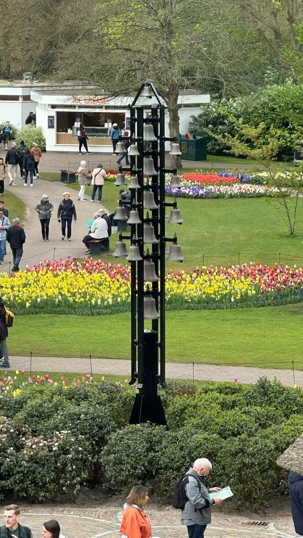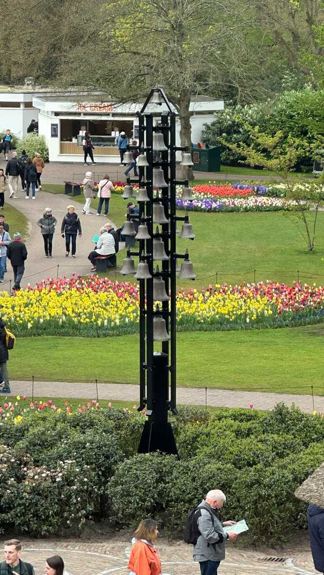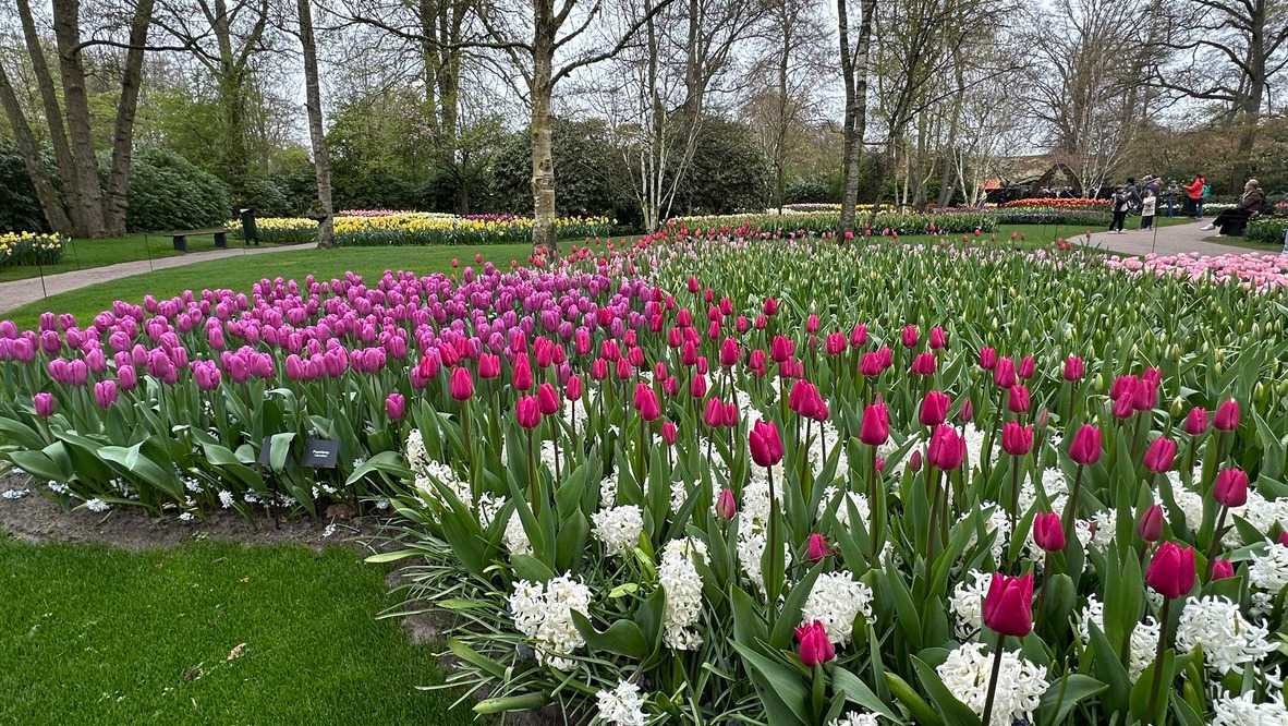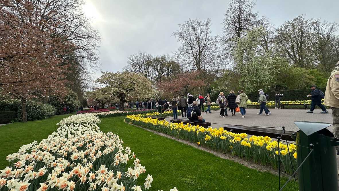 Ce lundi 13 avril devrait rester longtemps dans la mémoire de vos proches puisqu'ils ont l'occasion aujourd’hui de visiter les très célèbres jardins, mondialement connus, de Keukenhof. Ouvert pour une courte période annuellement, soit du 19 mars au 10 mai cette année, Keukenhof, expose près de 7 millions de plantes à bulbes en fleurs. Afin que chacun profite au maximum de sa journée, le groupe se sépare pour goûter au plaisir de faire la visite comme bon lui semble et flâner à sa guise. On peut admirer des massifs de tulipes, jacinthes, jonquilles et autres espèces colorées. C’est vraiment de toute beauté de voir toutes ces couleurs, variétés de fleurs savamment agencées pour notre plus grand plaisir. Keukenhof s’enorgueillit d’être le plus populaire jardin botanique au monde et vante ses magnifiques arrangements floraux depuis plus de 75 ans. Les jardins de Keukenhof accueillent en moyenne environ 25 000 visiteurs par jour pendant leur ouverture printanière de huit semaines. Avec plus de 1,4 million de visiteurs sur une cinquantaine de jours, la fréquentation dépasse régulièrement les 45 000 personnes par jour lors des week-ends de pointe et de Pâques. Dame nature est de notre bord dirait-on; ciel légèrement couvert, timides percées de soleil, aucun vent, une température de 13ºC. C’est juste parfait pour faire une balade tout en étant bien habillé pour admirer ces beautés. Déjà nos voyageurs sont impressionnés de constater le grand nombre de voitures et d’autocars stationnés sur les terrains environnants.