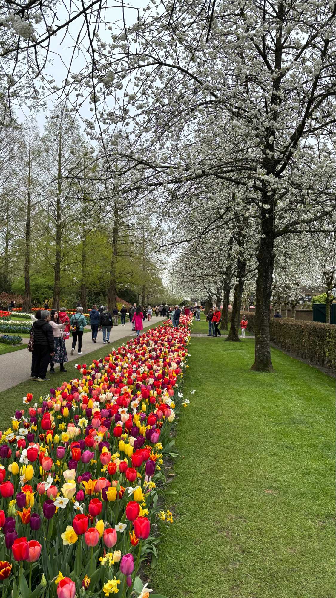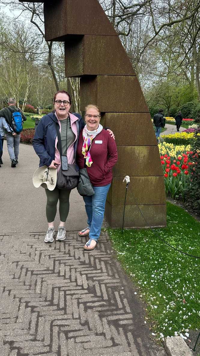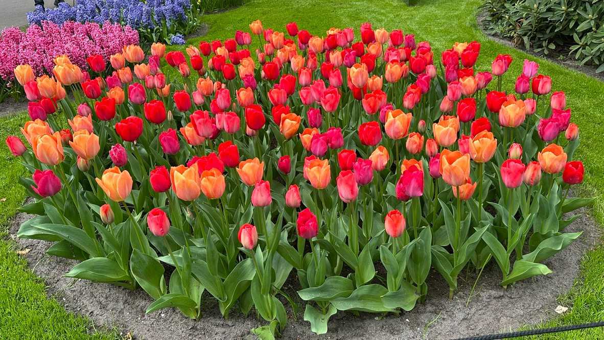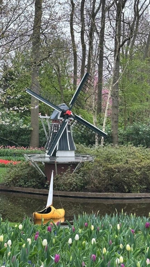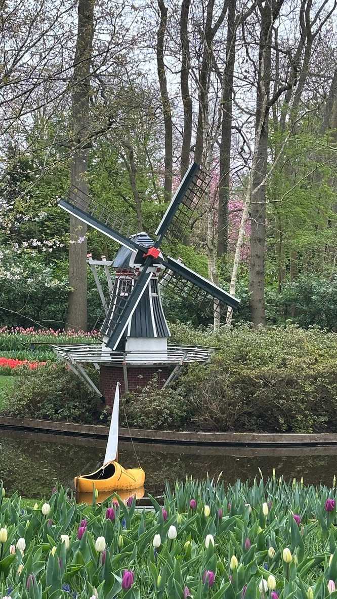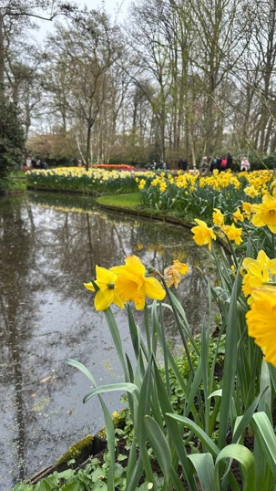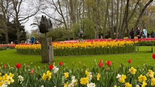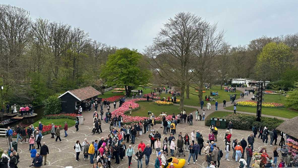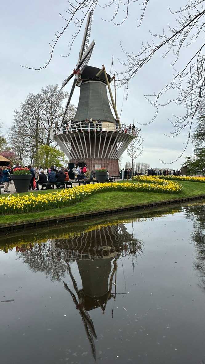 Ce lundi 13 avril devrait rester longtemps dans la mémoire de vos proches puisqu'ils ont l'occasion aujourd’hui de visiter les très célèbres jardins, mondialement connus, de Keukenhof. Ouvert pour une courte période annuellement, soit du 19 mars au 10 mai cette année, Keukenhof, expose près de 7 millions de plantes à bulbes en fleurs. Afin que chacun profite au maximum de sa journée, le groupe se sépare pour goûter au plaisir de faire la visite comme bon lui semble et flâner à sa guise. On peut admirer des massifs de tulipes, jacinthes, jonquilles et autres espèces colorées. C’est vraiment de toute beauté de voir toutes ces couleurs, variétés de fleurs savamment agencées pour notre plus grand plaisir. Keukenhof s’enorgueillit d’être le plus populaire jardin botanique au monde et vante ses magnifiques arrangements floraux depuis plus de 75 ans. Les jardins de Keukenhof accueillent en moyenne environ 25 000 visiteurs par jour pendant leur ouverture printanière de huit semaines. Avec plus de 1,4 million de visiteurs sur une cinquantaine de jours, la fréquentation dépasse régulièrement les 45 000 personnes par jour lors des week-ends de pointe et de Pâques. Dame nature est de notre bord dirait-on; ciel légèrement couvert, timides percées de soleil, aucun vent, une température de 13ºC. C’est juste parfait pour faire une balade tout en étant bien habillé pour admirer ces beautés. Déjà nos voyageurs sont impressionnés de constater le grand nombre de voitures et d’autocars stationnés sur les terrains environnants.