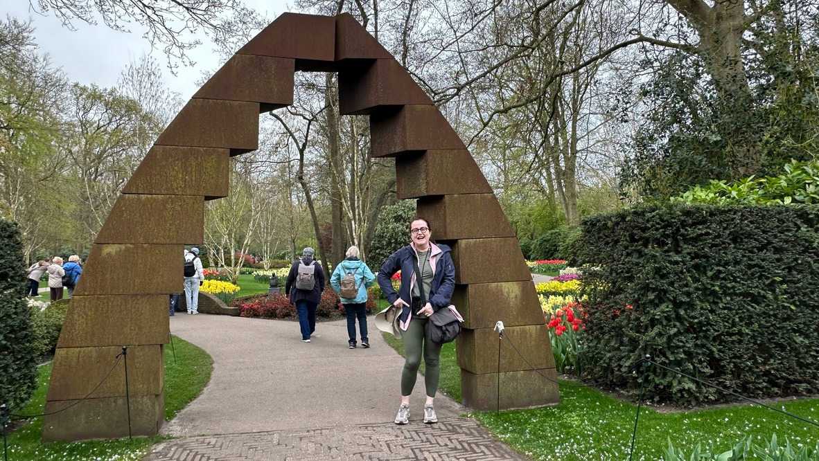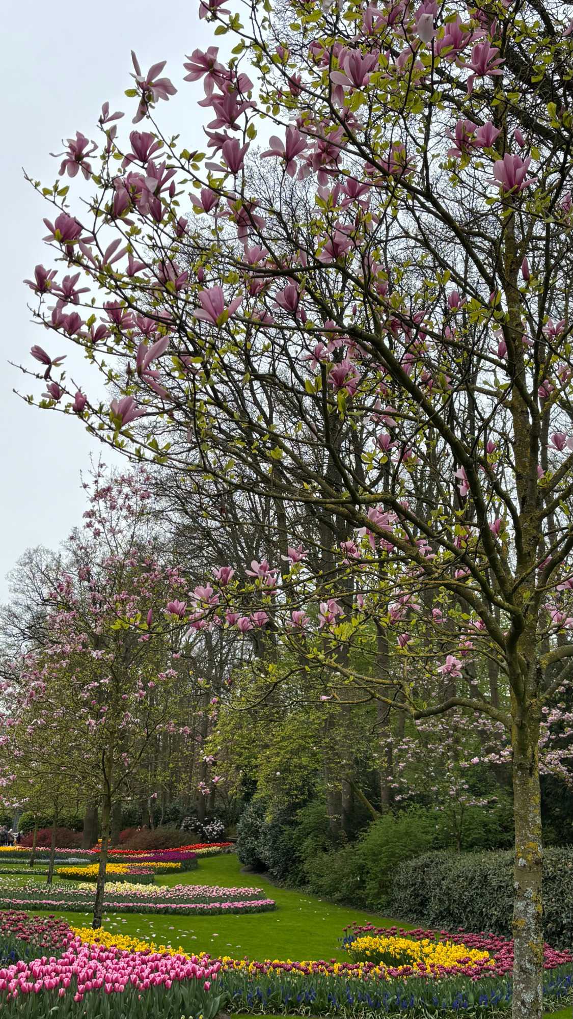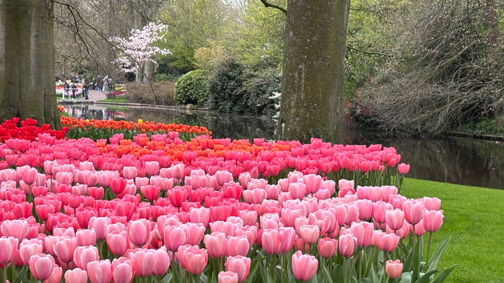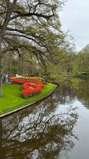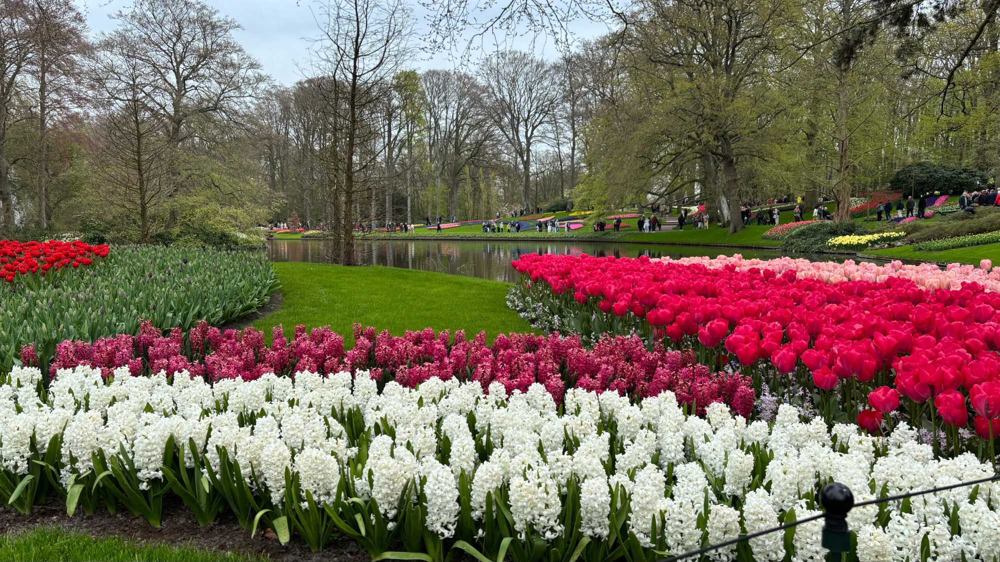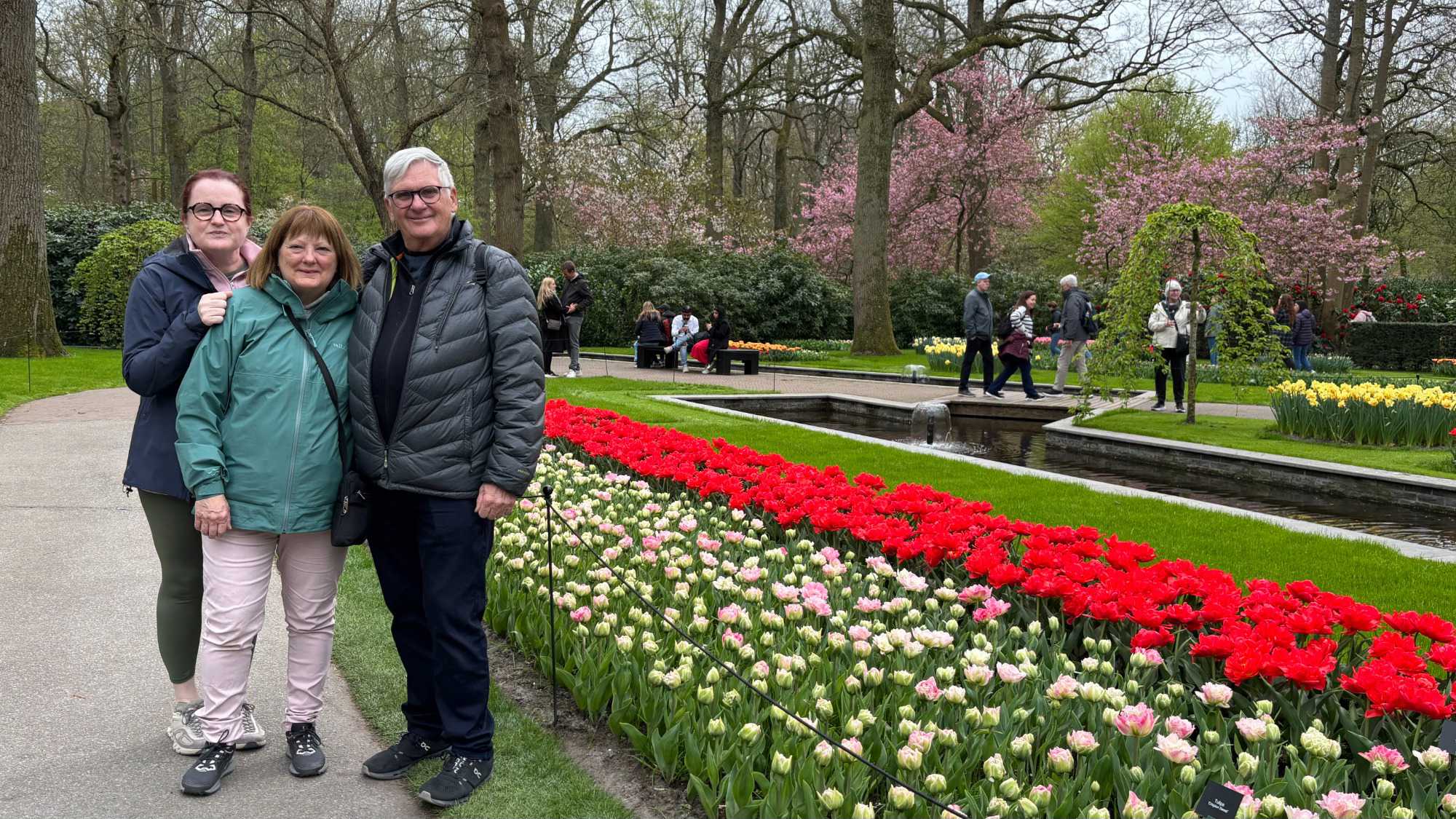 Ce lundi 13 avril devrait rester longtemps dans la mémoire de vos proches puisqu'ils ont l'occasion aujourd’hui de visiter les très célèbres jardins, mondialement connus, de Keukenhof. Ouvert pour une courte période annuellement, soit du 19 mars au 10 mai cette année, Keukenhof, expose près de 7 millions de plantes à bulbes en fleurs. Afin que chacun profite au maximum de sa journée, le groupe se sépare pour goûter au plaisir de faire la visite comme bon lui semble et flâner à sa guise. On peut admirer des massifs de tulipes, jacinthes, jonquilles et autres espèces colorées. C’est vraiment de toute beauté de voir toutes ces couleurs, variétés de fleurs savamment agencées pour notre plus grand plaisir. Keukenhof s’enorgueillit d’être le plus populaire jardin botanique au monde et vante ses magnifiques arrangements floraux depuis plus de 75 ans. Les jardins de Keukenhof accueillent en moyenne environ 25 000 visiteurs par jour pendant leur ouverture printanière de huit semaines. Avec plus de 1,4 million de visiteurs sur une cinquantaine de jours, la fréquentation dépasse régulièrement les 45 000 personnes par jour lors des week-ends de pointe et de Pâques. Dame nature est de notre bord dirait-on; ciel légèrement couvert, timides percées de soleil, aucun vent, une température de 13ºC. C’est juste parfait pour faire une balade tout en étant bien habillé pour admirer ces beautés. Déjà nos voyageurs sont impressionnés de constater le grand nombre de voitures et d’autocars stationnés sur les terrains environnants.