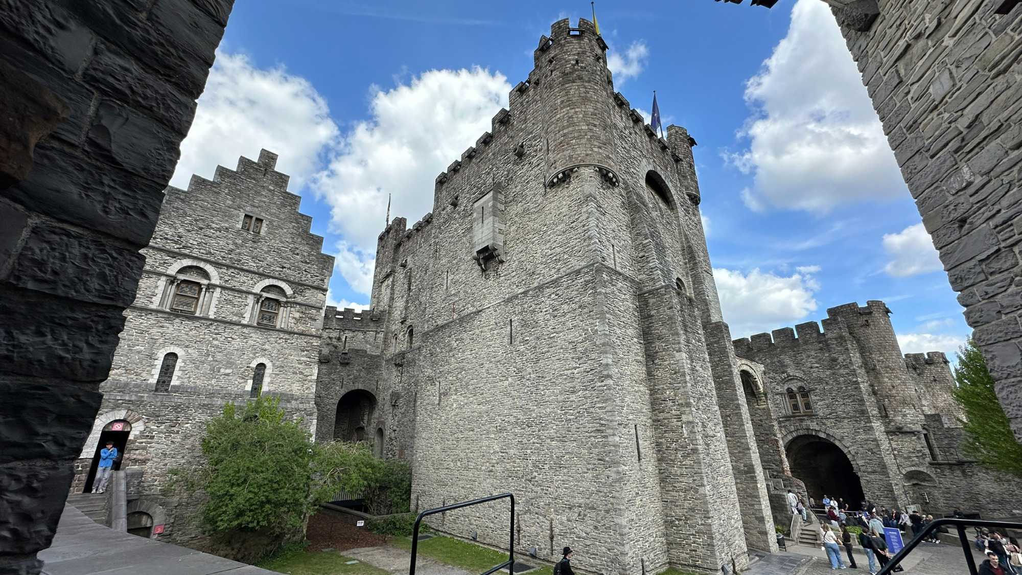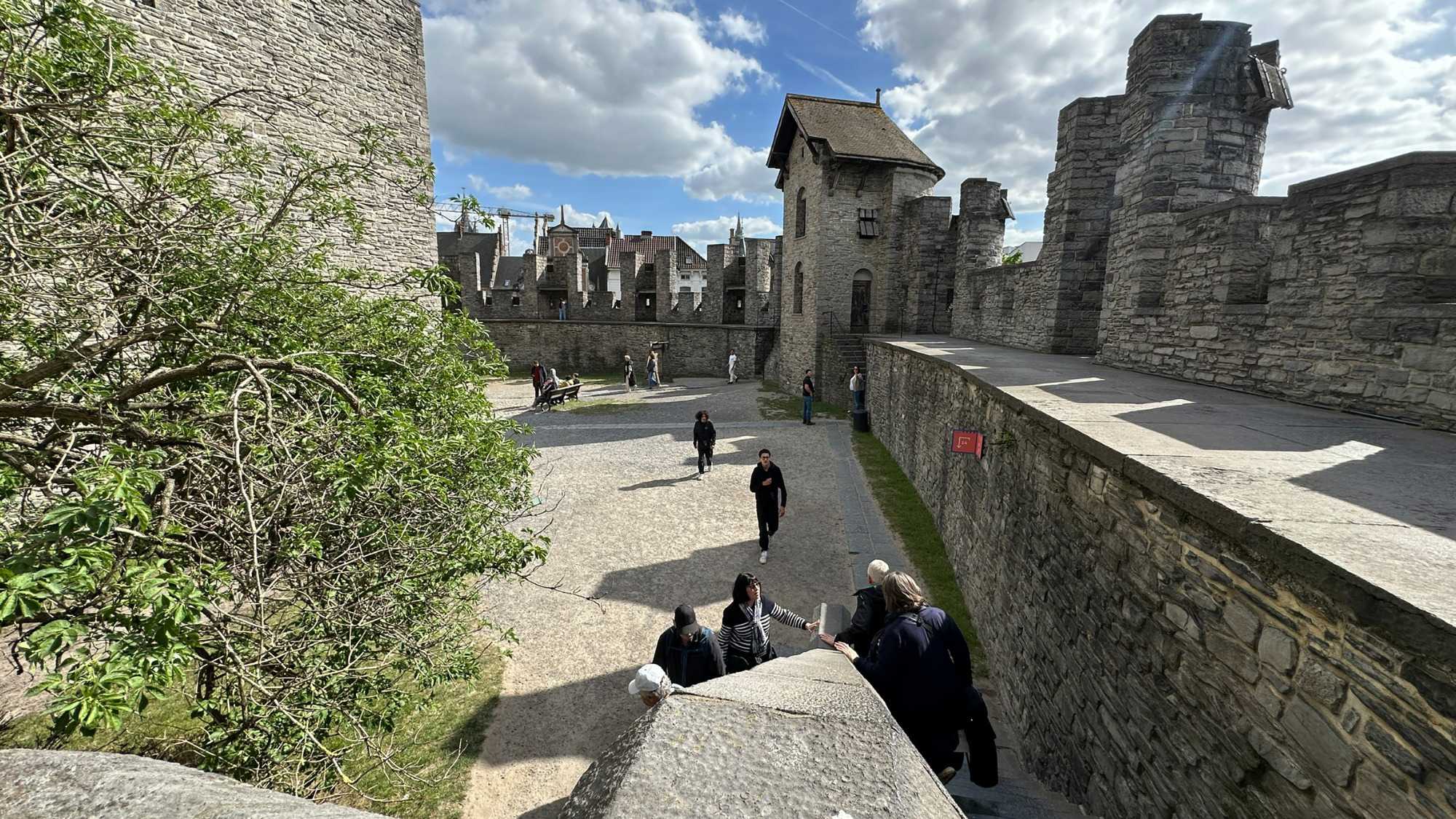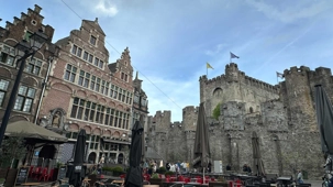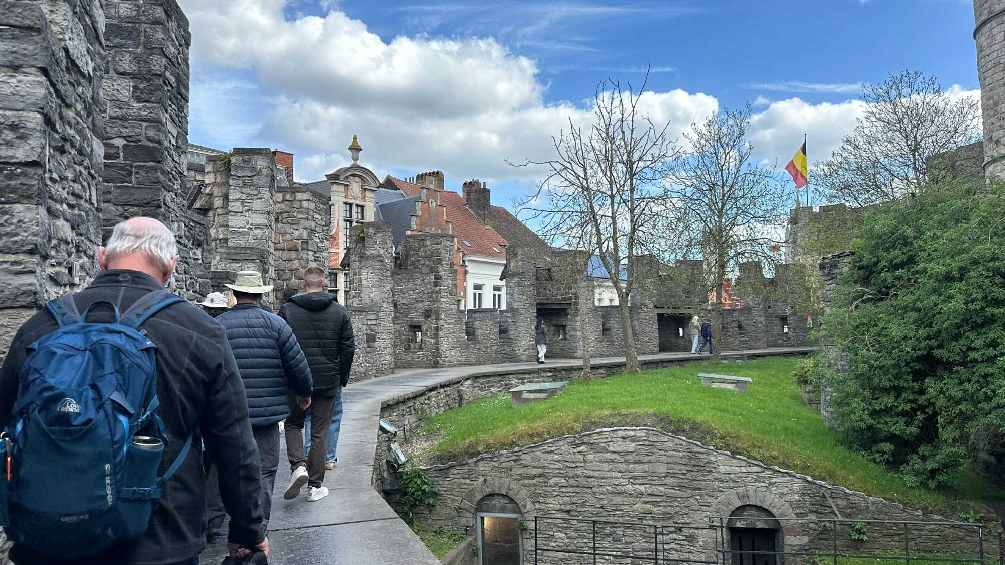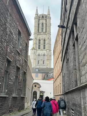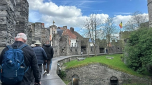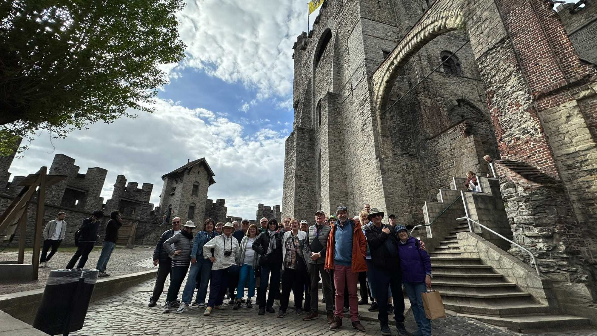 Puis, vers 15h, une visite qui a marqué nos voyageurs menée par deux guides exceptionnels, nous mène au Château des comtes de Flandre. Rarement un château médiéval est construit au beau milieu de la ville. Construit tout en pierres en 1192, il témoigne de la richesse de Gand à l’époque, portée par le commerce des céréales, de la laine et la puissance des corporations, notamment les brasseurs, les bateliers, les bouchers et les boulangers. Derrière ses remparts et ses mâchicoulis, ces ouvertures permettant de défendre la forteresse, se dévoile un monde féodal où les paysans cédaient une grande partie de leurs récoltes, et où chevaliers et comtes vivaient au rythme des obligations, des cérémonies et de la guerre.