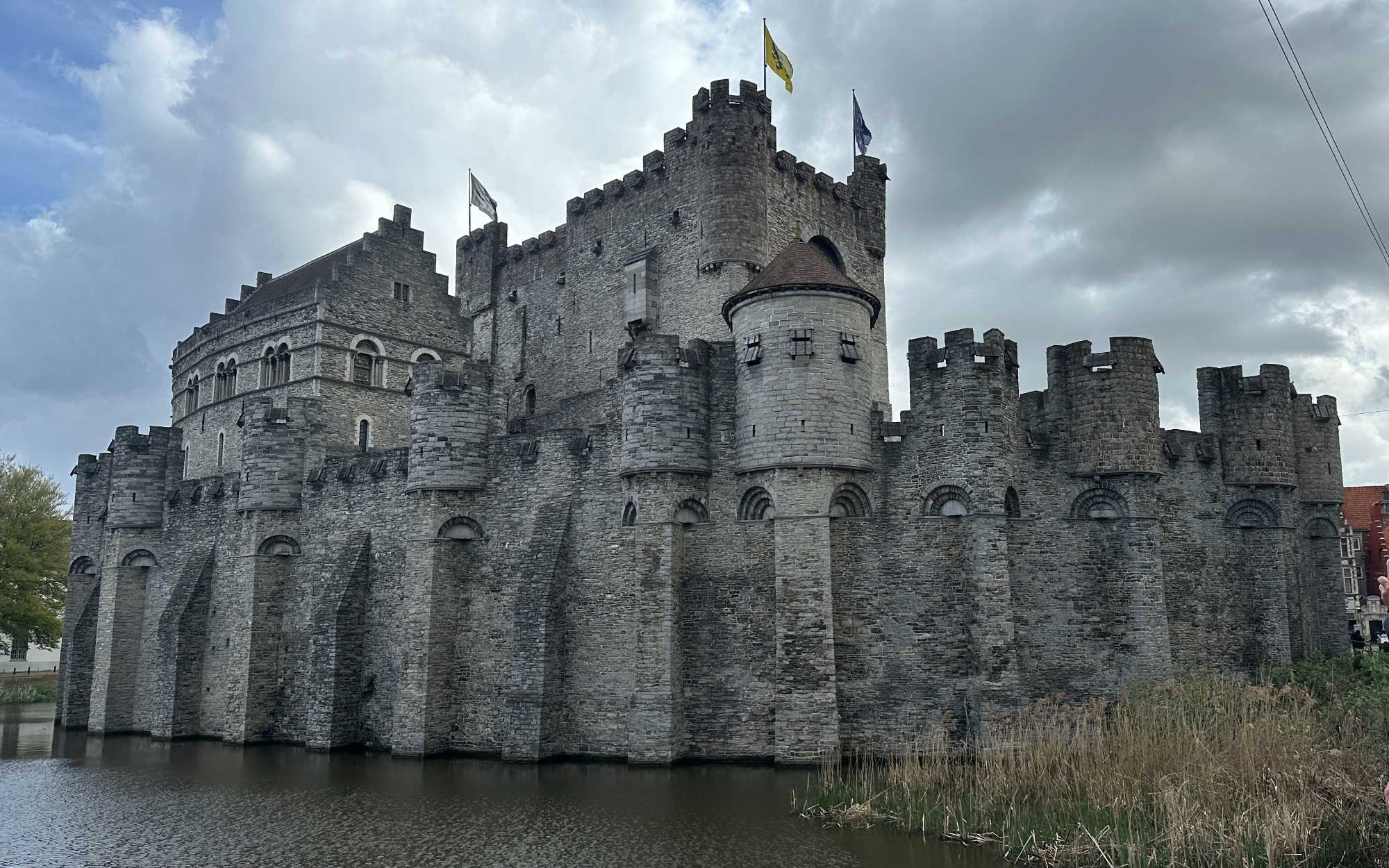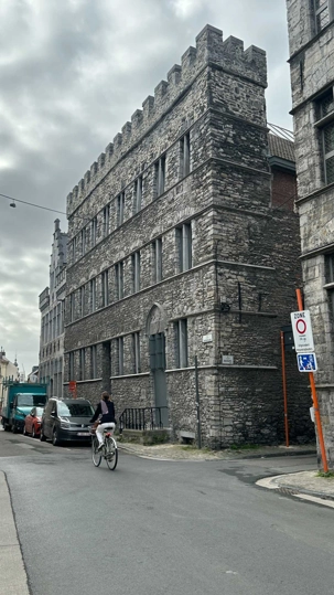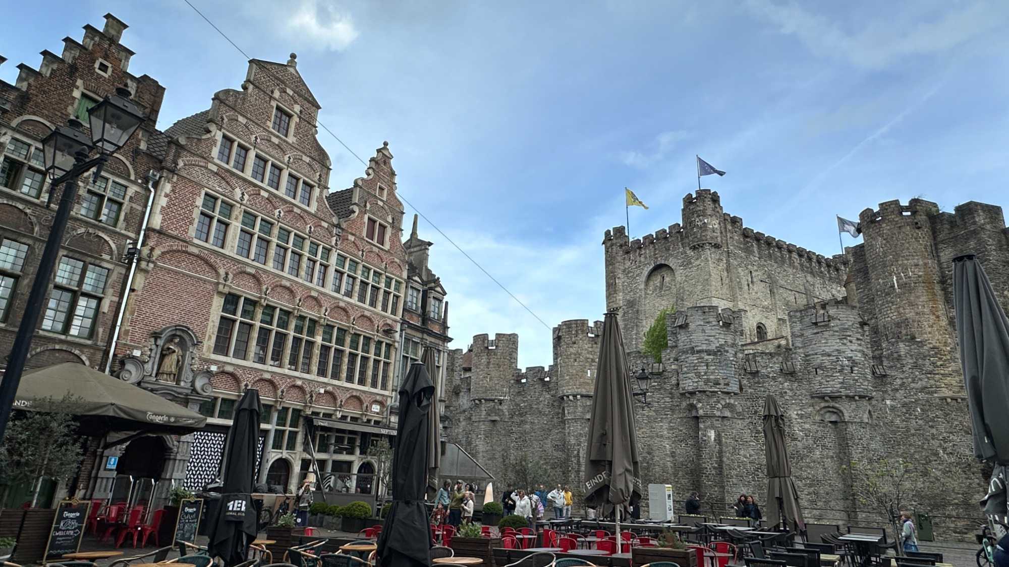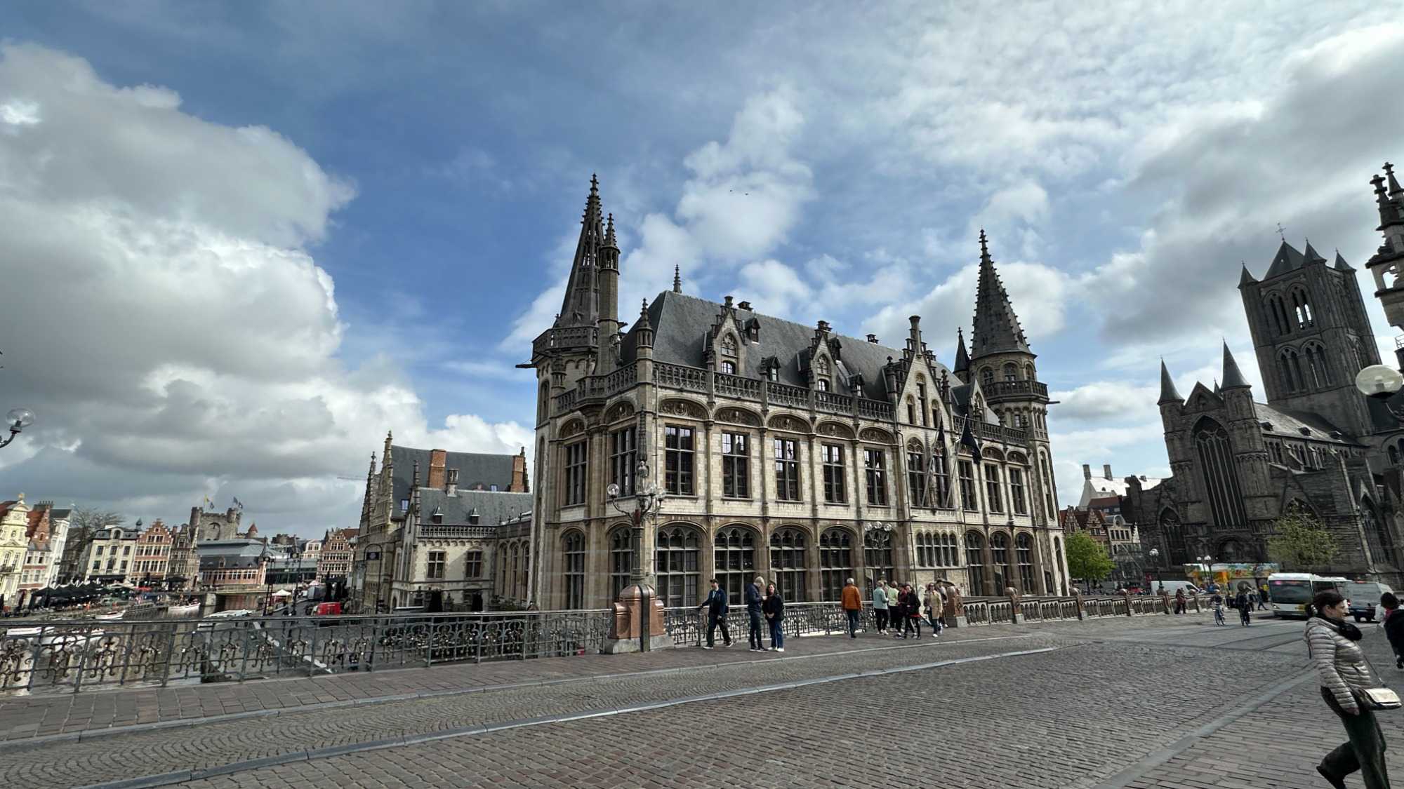 Notre regard est immédiatement attiré par le Château des Comtes de Flandre. Massif, impressionnant, presque austère, il semble sorti tout droit d’un autre siècle. Nous en reparlerons.