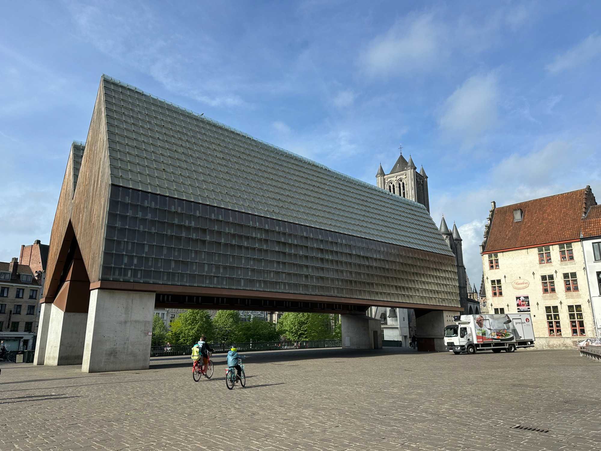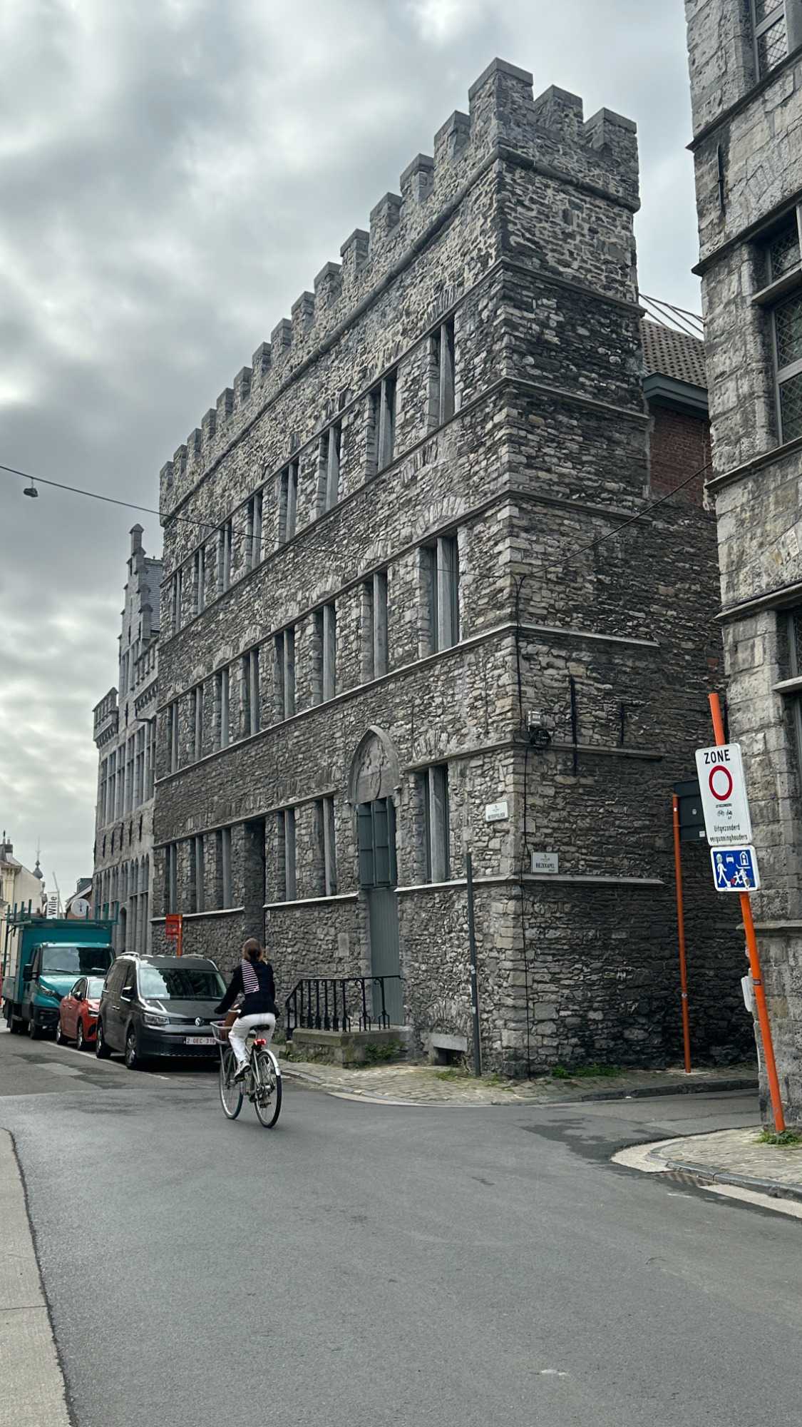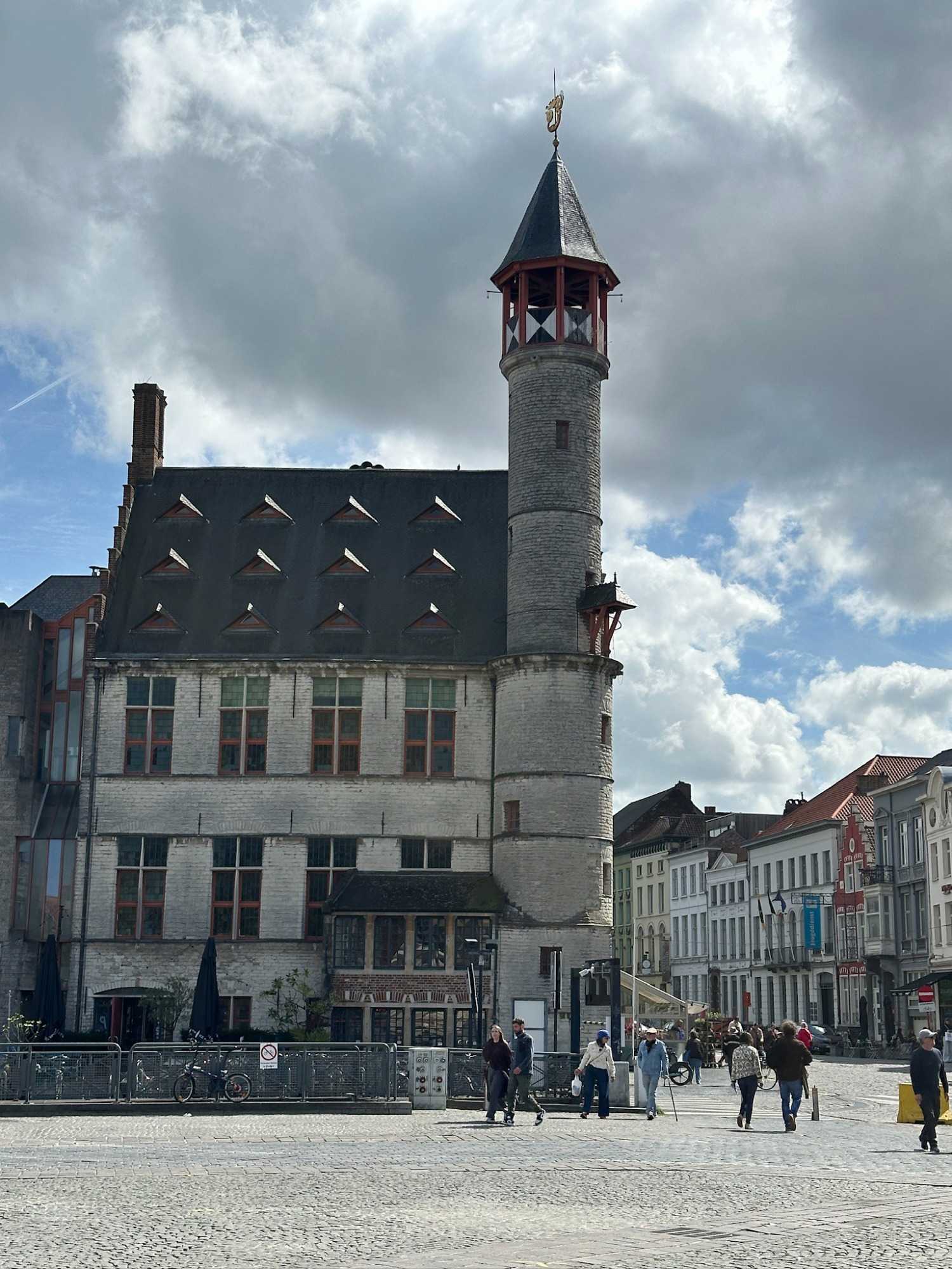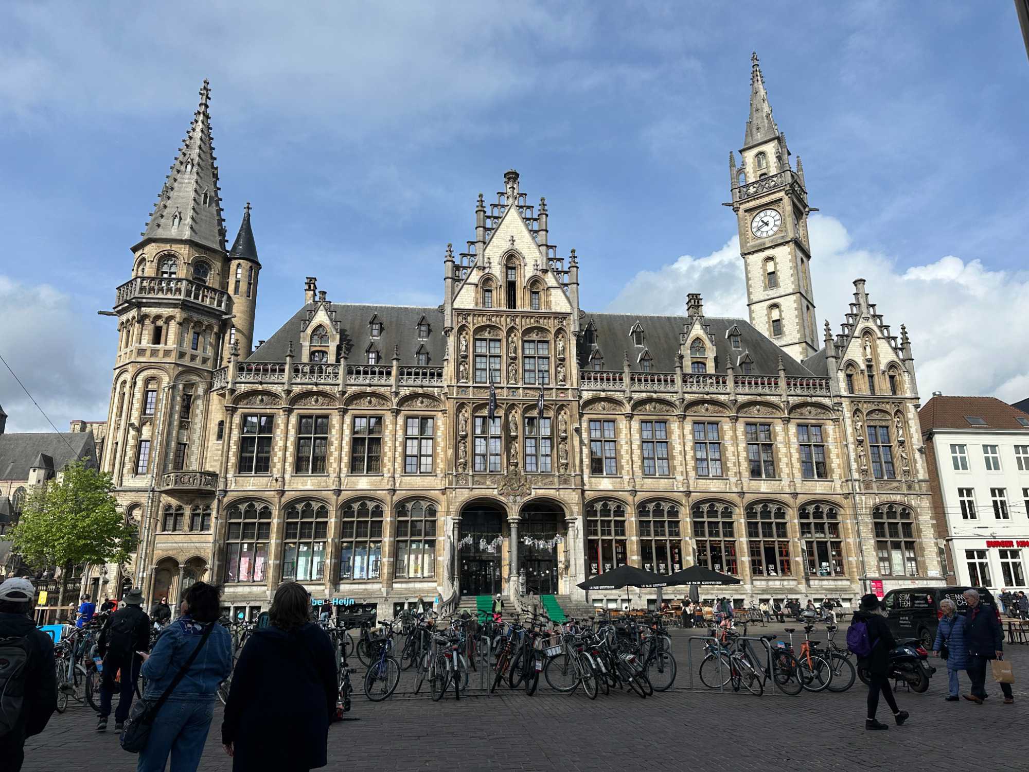Notre regard est immédiatement attiré par le Château des Comtes de Flandre. Massif, impressionnant, presque austère, il semble sorti tout droit d’un autre siècle. Nous en reparlerons.
