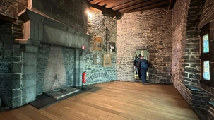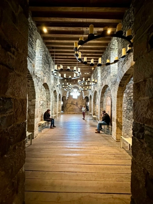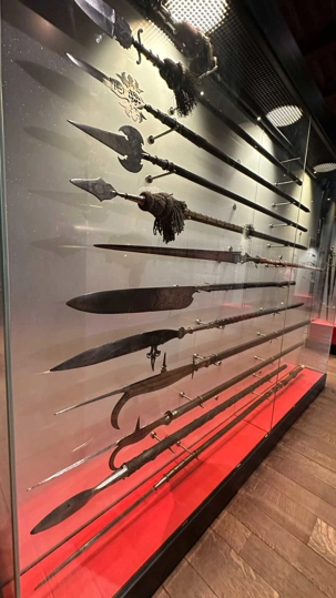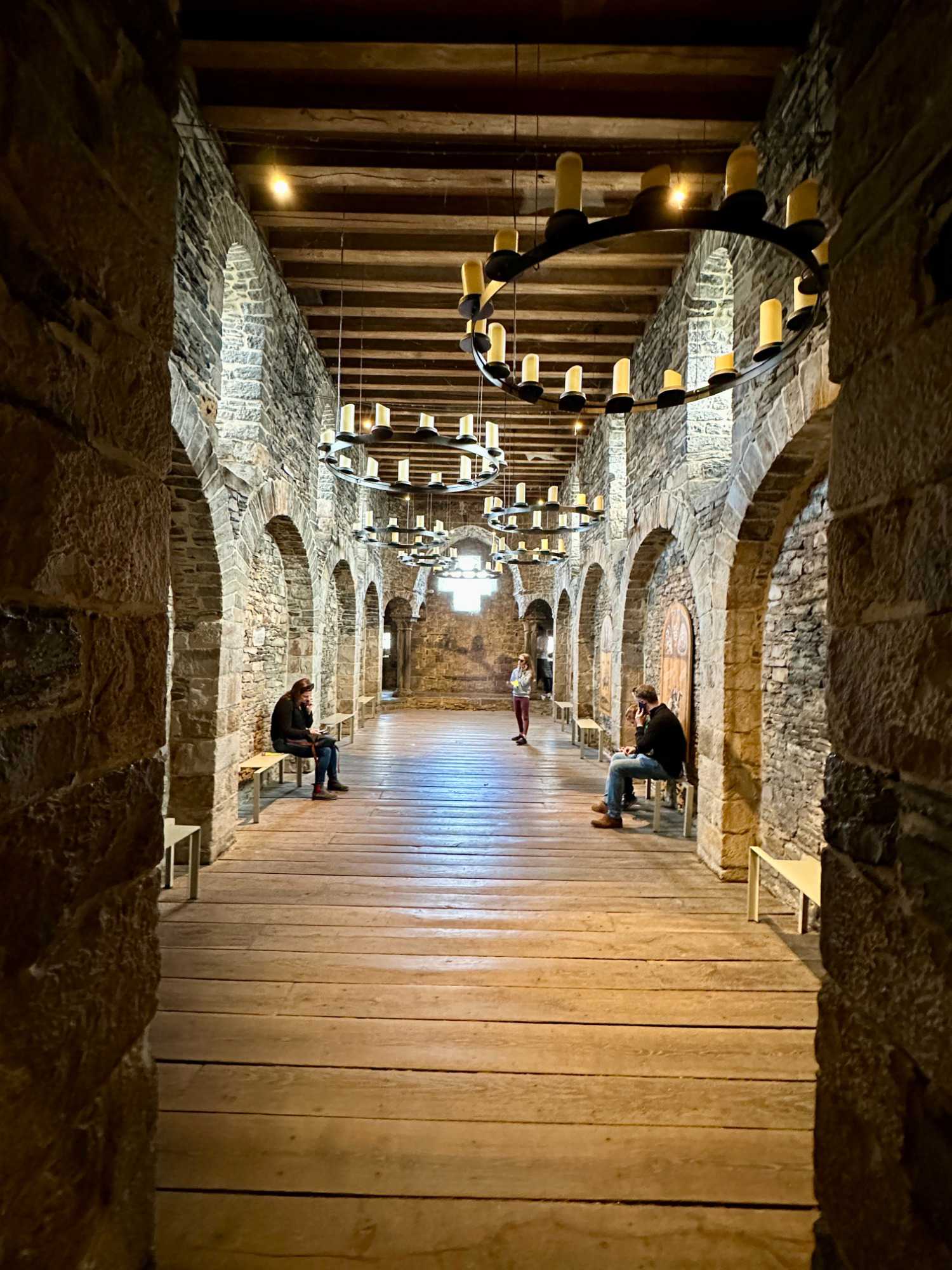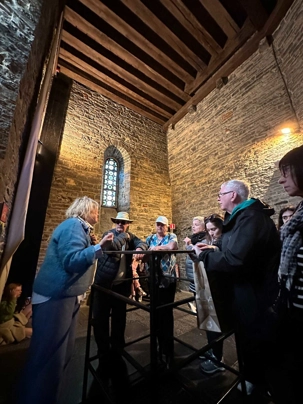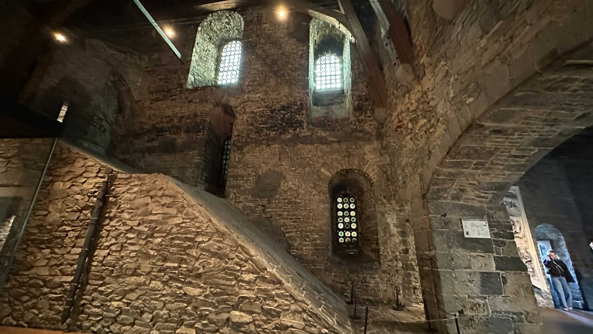À l’intérieur, les espaces racontent une vie à la fois rude et organisée: le rez-de-chaussée du donjon, sans fenêtres, servait probablement de salle d’accueil des chevaliers, tandis que la grande salle, avec ses foyers ouverts, faisait office de lieu de réception, d’habitation et même de tribunal. Les écuries rappellent l’importance des chevaux, précieux et mieux logés que bien des habitants, dans une ville qui ne comptait que quelques puits d’eau, ils avaient le leur ! Entre armures pesant jusqu’à 20 kilos, expositions d’armes de défense ou de combat, ateliers de tissage et cérémonies de chevalerie, le château donne un aperçu concret du Moyen Âge, jusque dans ses aspects les plus sombres, avec des châtiments aussi brutaux qu’exemplaires comme nous avons pu le constater lorsque les guides nous ont expliqué les châtiments de la salle des tortures. Il y avait même les “oubliettes” salle dans laquelle les criminels attendaient leur sentences.
