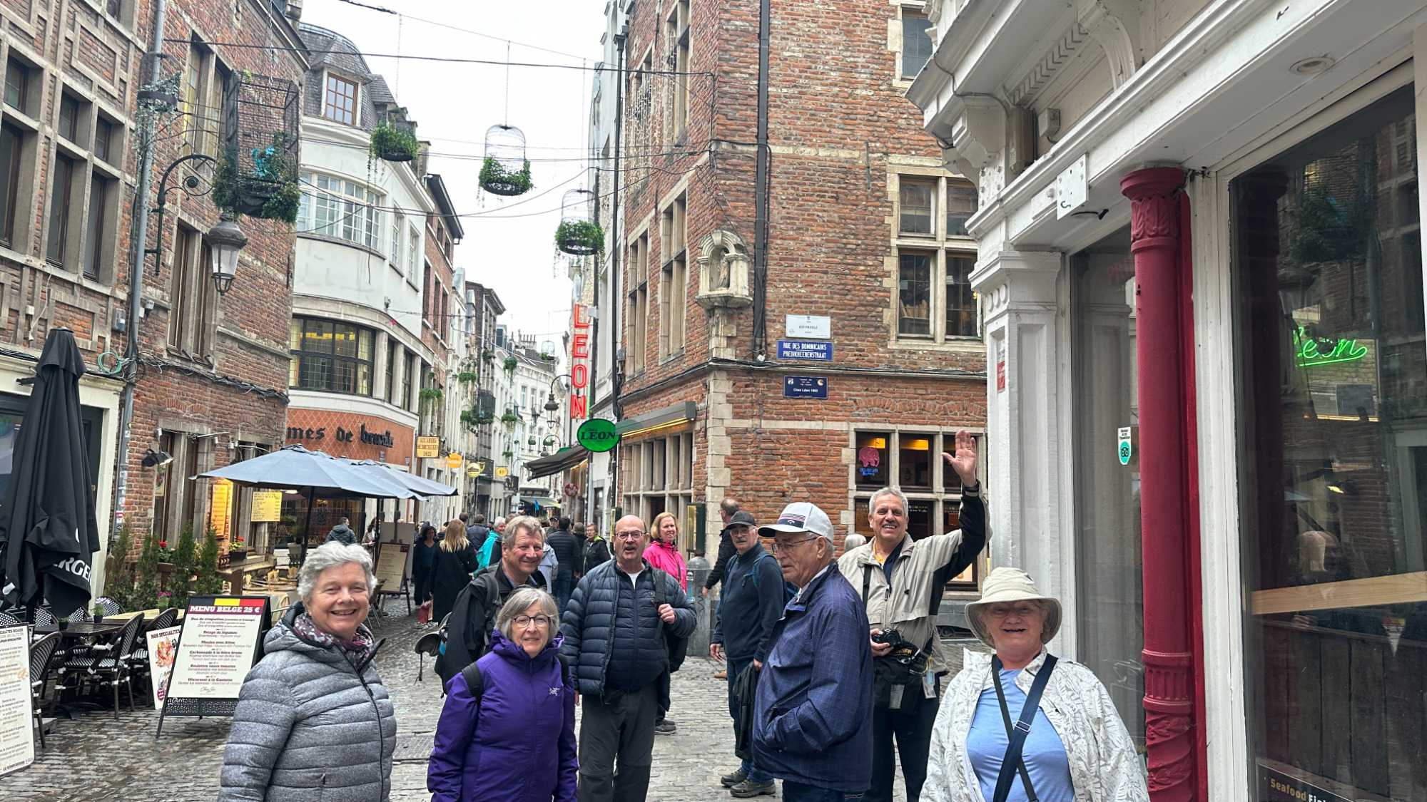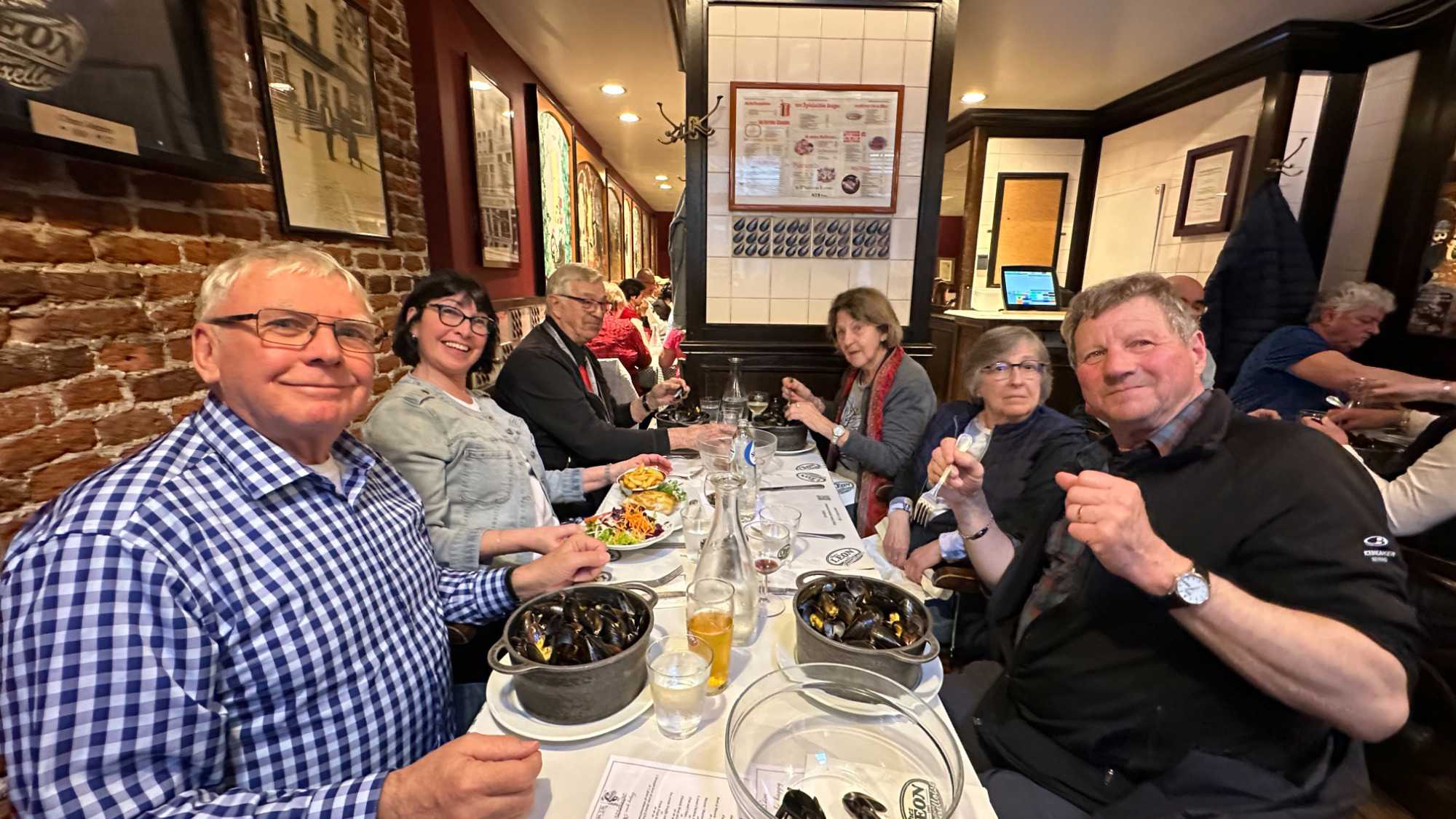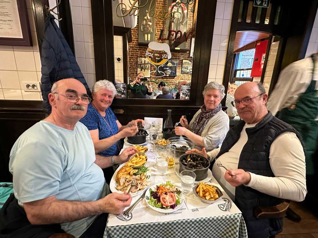 Après cet intermède apaisant, nous revenons un peu sur nos pas pour le souper à l’incontournable restaurant belge, Chez Léon, véritable institution de Bruxelles où les moules frites sont à l’honneur. Ici, l’ambiance est “Art Nouveau”, les assiettes généreuses, et les saveurs bien ancrées dans la tradition belge. Nous n’avons pas été décus; bonne qualité de nourriture, service agréable et courtois malgré les 230 places assises. Nous avons pu constater que le restaurant était bien rempli. Sans la nommer car elle se reconnaîtra, une de nos voyageuse a même retenu l’attention de notre serveur! Les coups de cœur du jour? La majesté de la Grand-Place, sans hésitation.