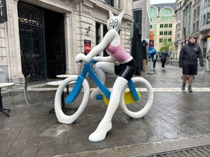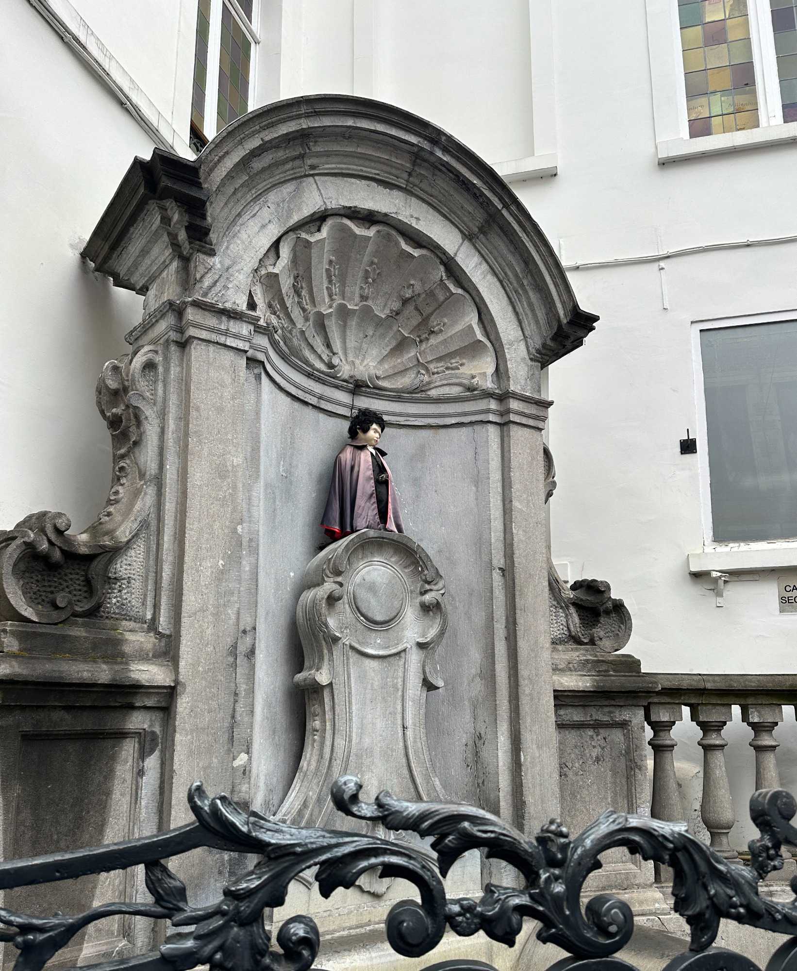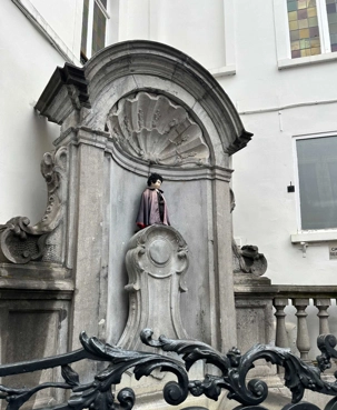 À quelques rues de là, impossible de ne pas croiser le célèbre Manneken Pis. Petit par la taille, mais immense par sa notoriété, il arrache quelques sourires et probablement autant de photos. Alain nous glisse, avec un brin d’humour, que ses tenues changent plus souvent que les nôtres en voyage. D’ailleurs aujourd’hui ne fait pas exception, il a même une perruque et une cape noire. Ses atours (plus de mille) sont conservés au musée de la ville.