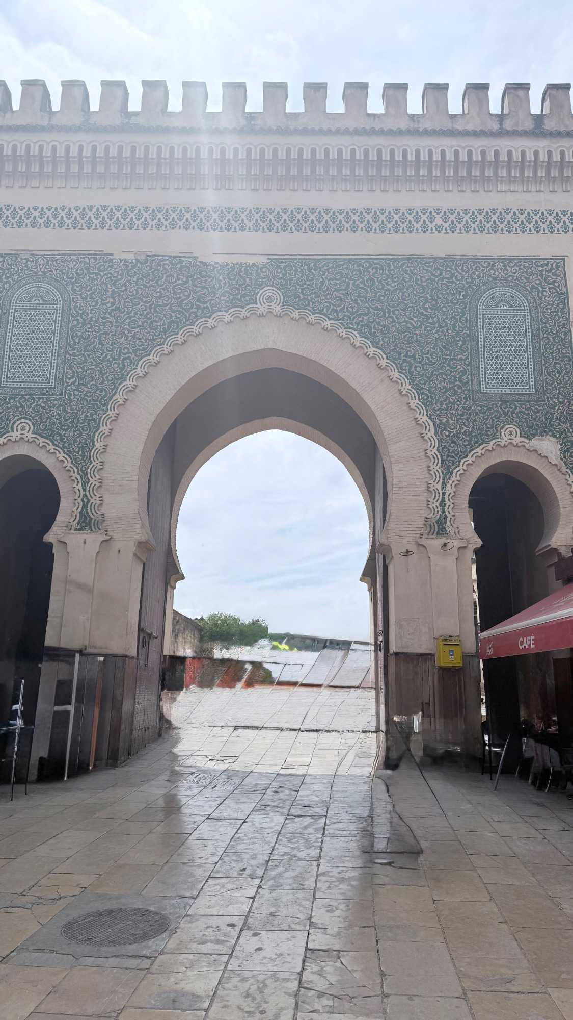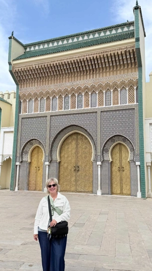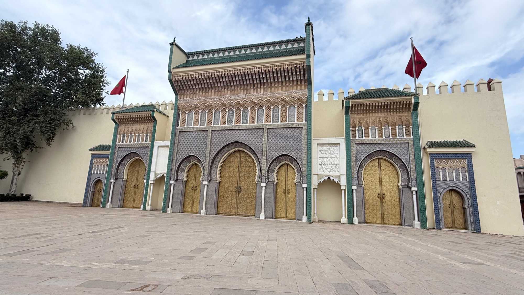 Notre route nous a ensuite conduits devant le Palais Royal de Fès, dont les portes dorées, finement ouvragées, scintillaient comme un trésor sous la lumière.