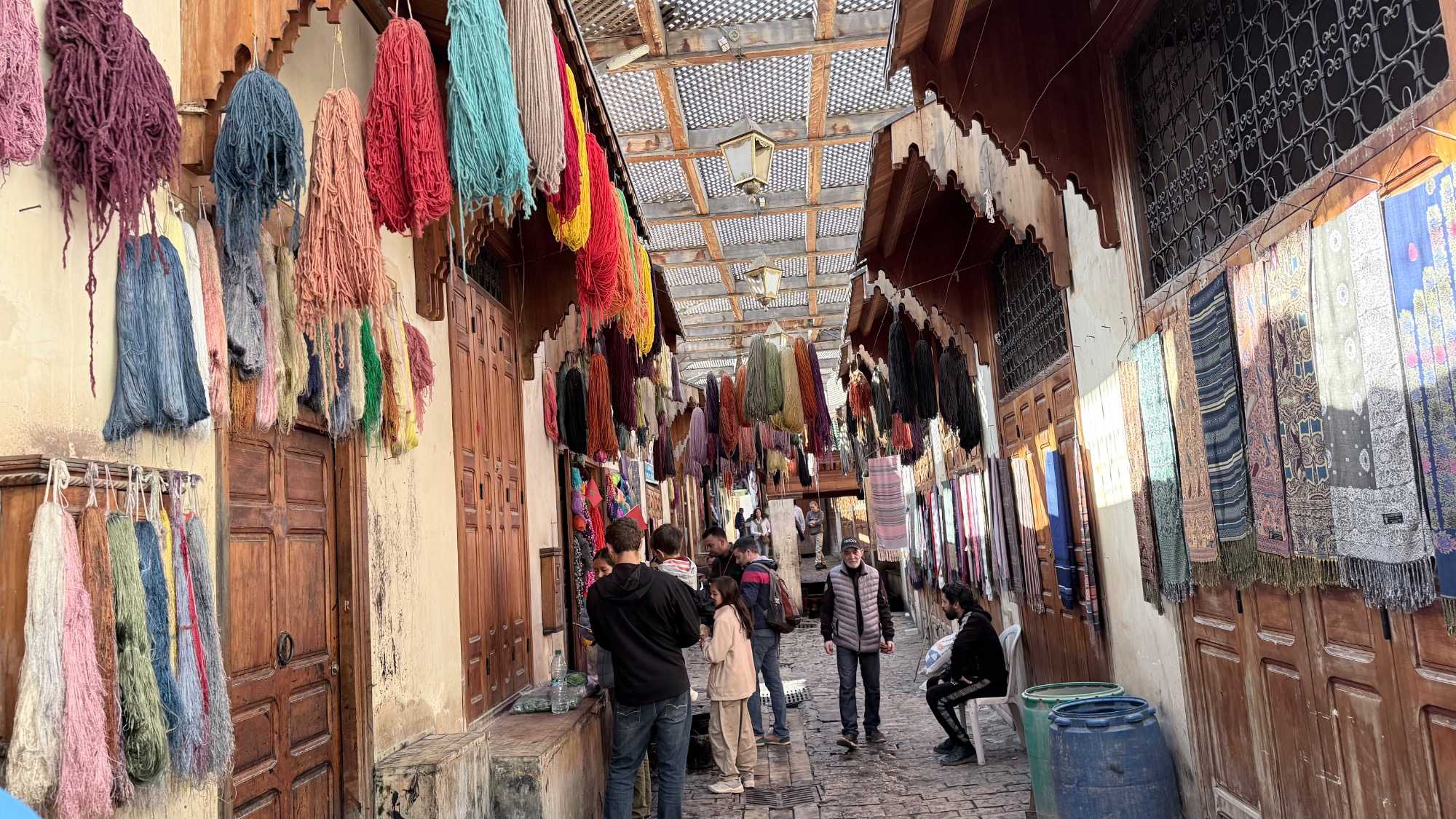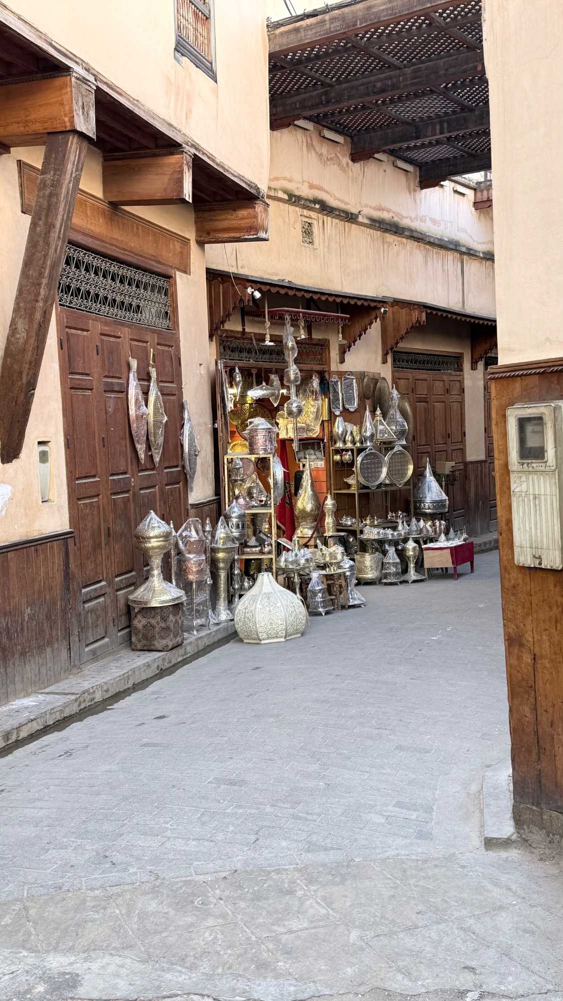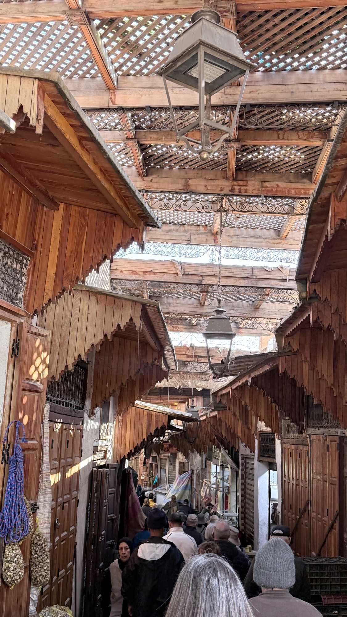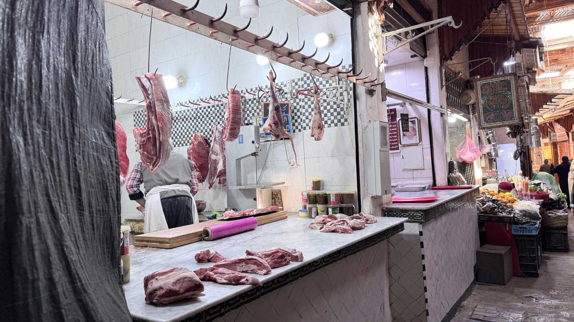 Puis, nous avons plongé au cœur de Fès el-Bali, où chaque ruelle est une invitation à se perdre… et à s’émerveiller. En nous promenant dans l’allée animée, nous avons découvert, ici et là, des kiosques de viande, des chandelles, et mille petites merveilles du quotidien. Tout semblait s’entremêler dans une joyeuse harmonie : les couleurs, les odeurs, les sourires… comme une danse vivante entre chaque étal, remplie de chaleur humaine et de bonheur partagé.