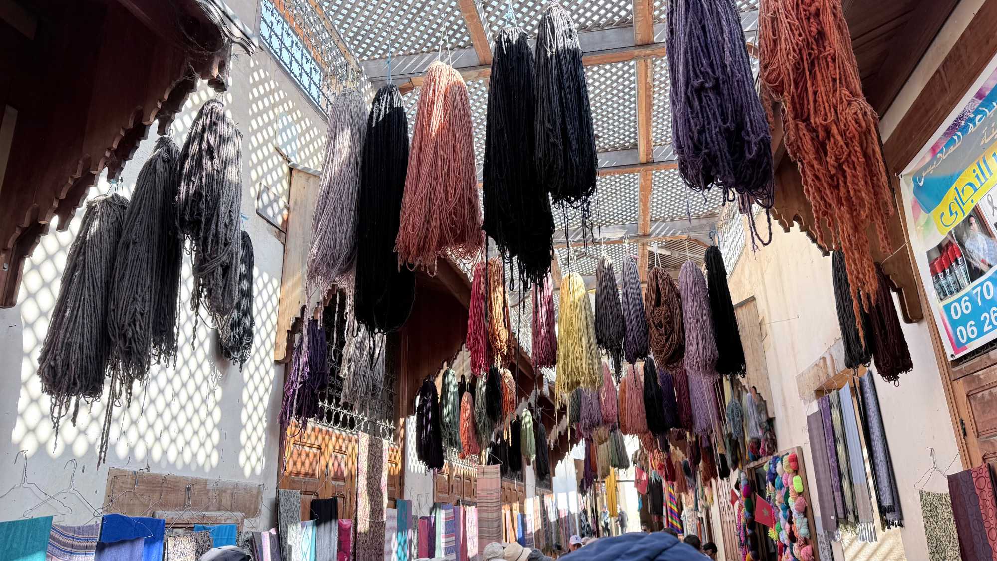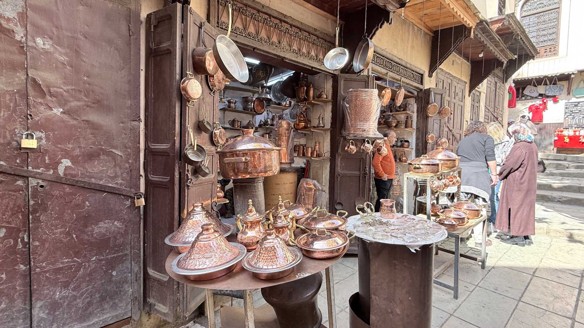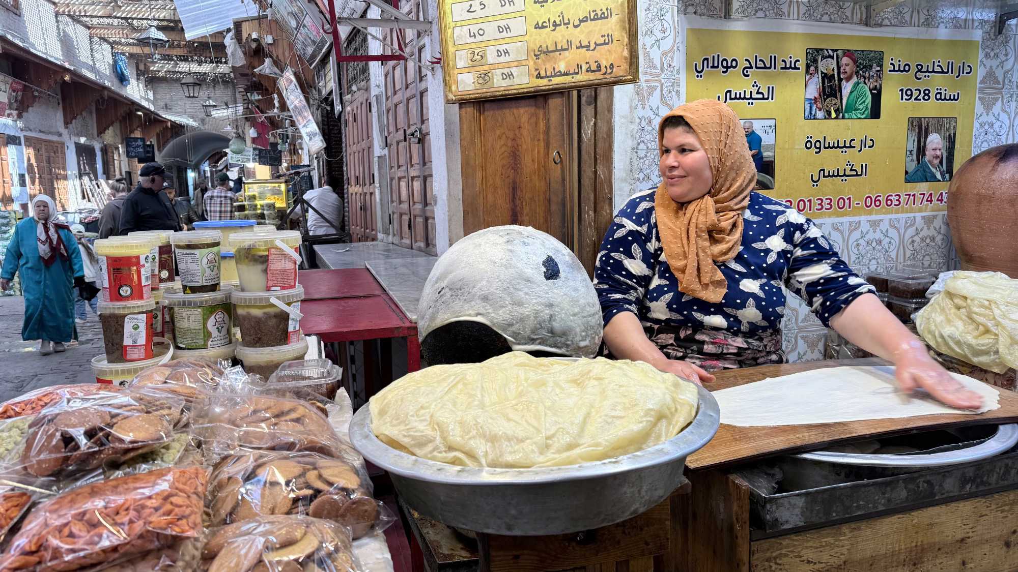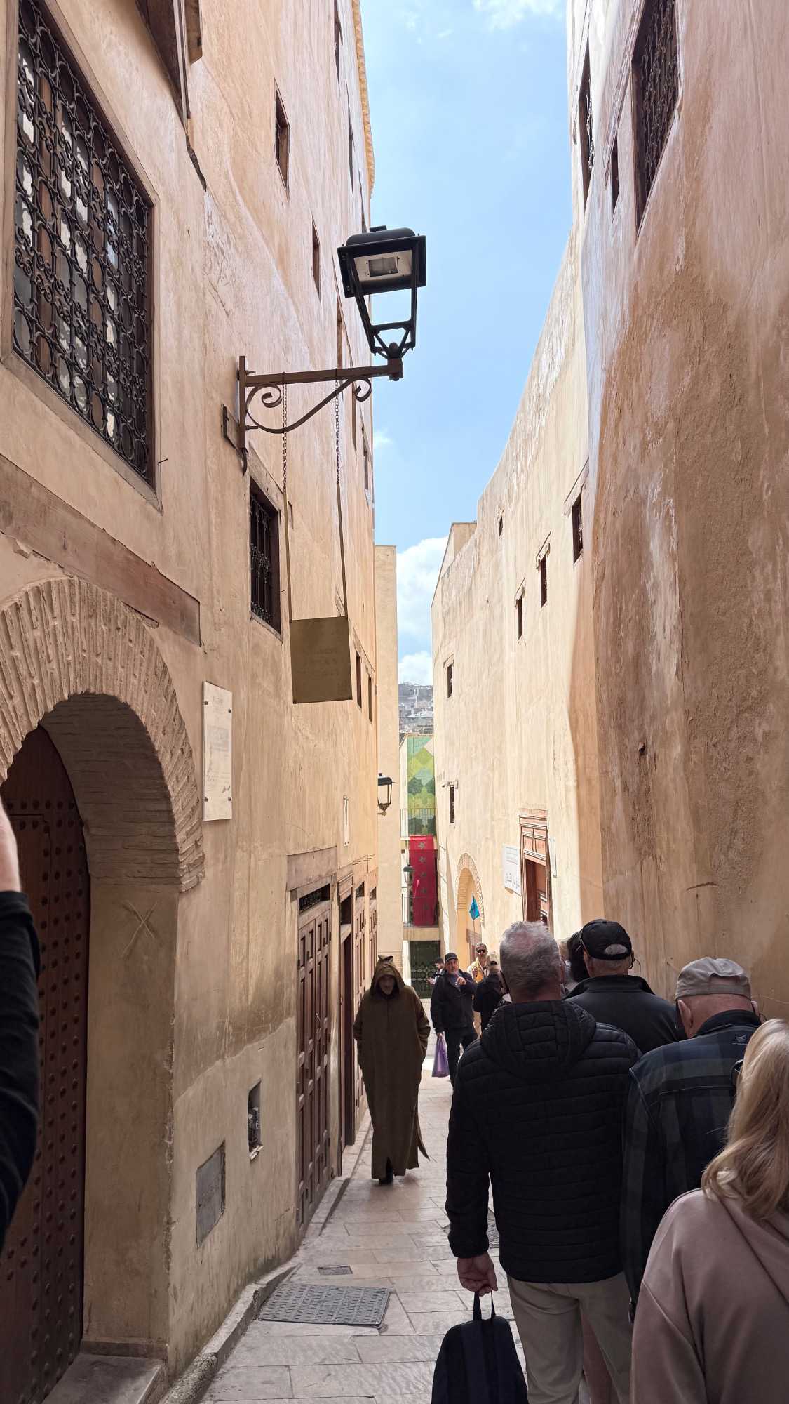 Puis, nous avons plongé au cœur de Fès el-Bali, où chaque ruelle est une invitation à se perdre… et à s’émerveiller. En nous promenant dans l’allée animée, nous avons découvert, ici et là, des kiosques de viande, des chandelles, et mille petites merveilles du quotidien. Tout semblait s’entremêler dans une joyeuse harmonie : les couleurs, les odeurs, les sourires… comme une danse vivante entre chaque étal, remplie de chaleur humaine et de bonheur partagé.