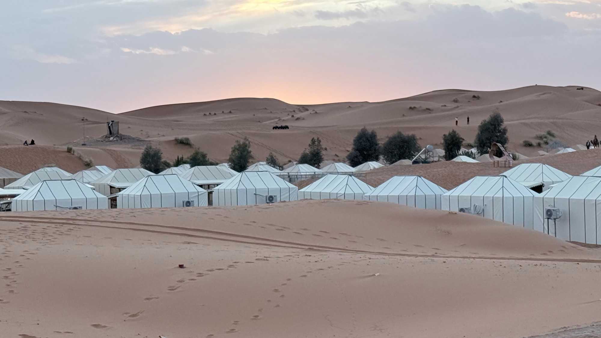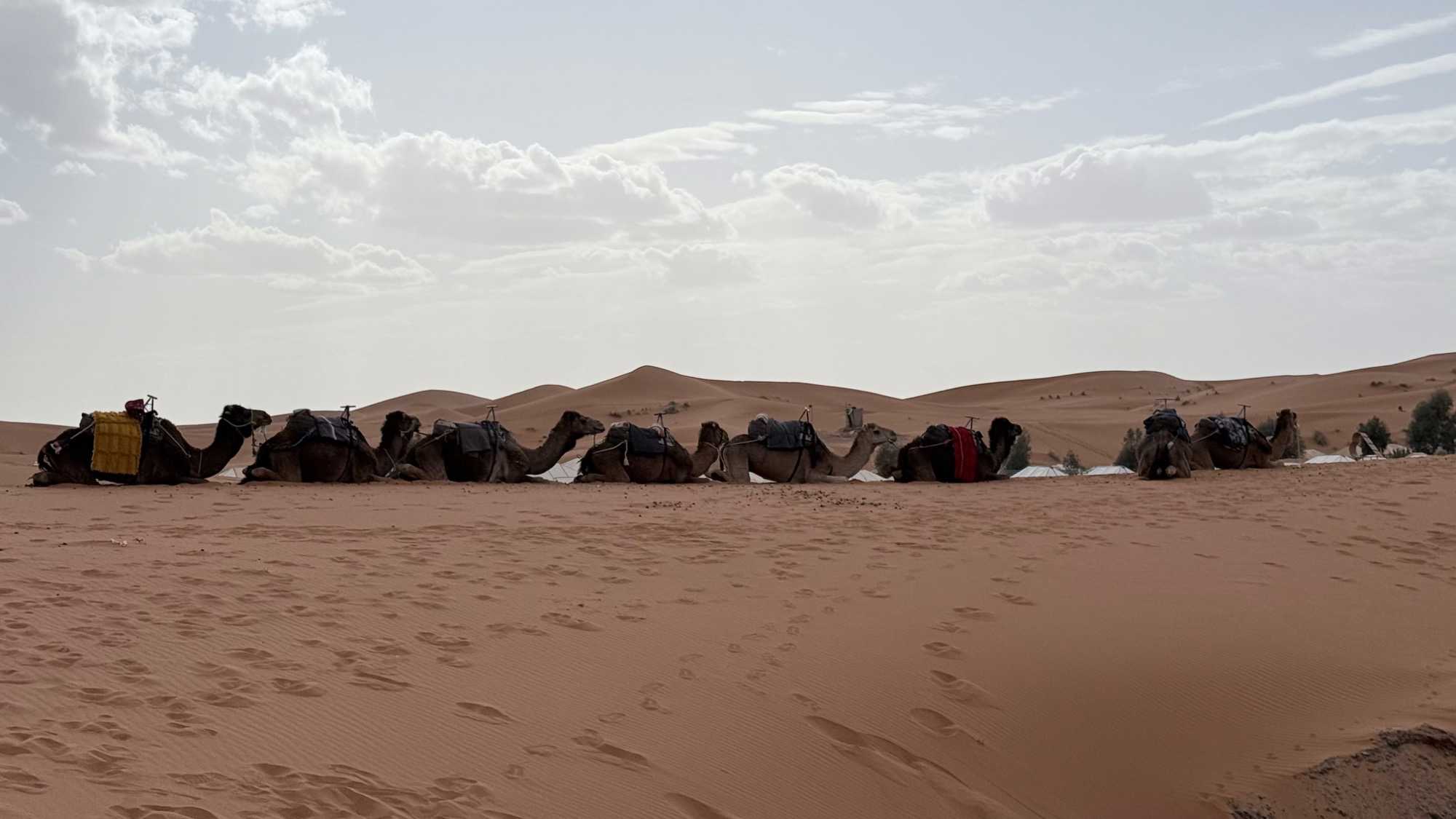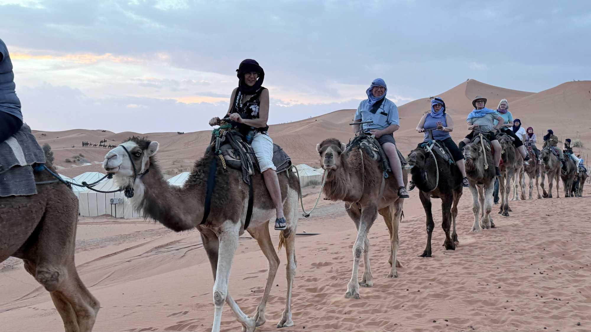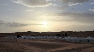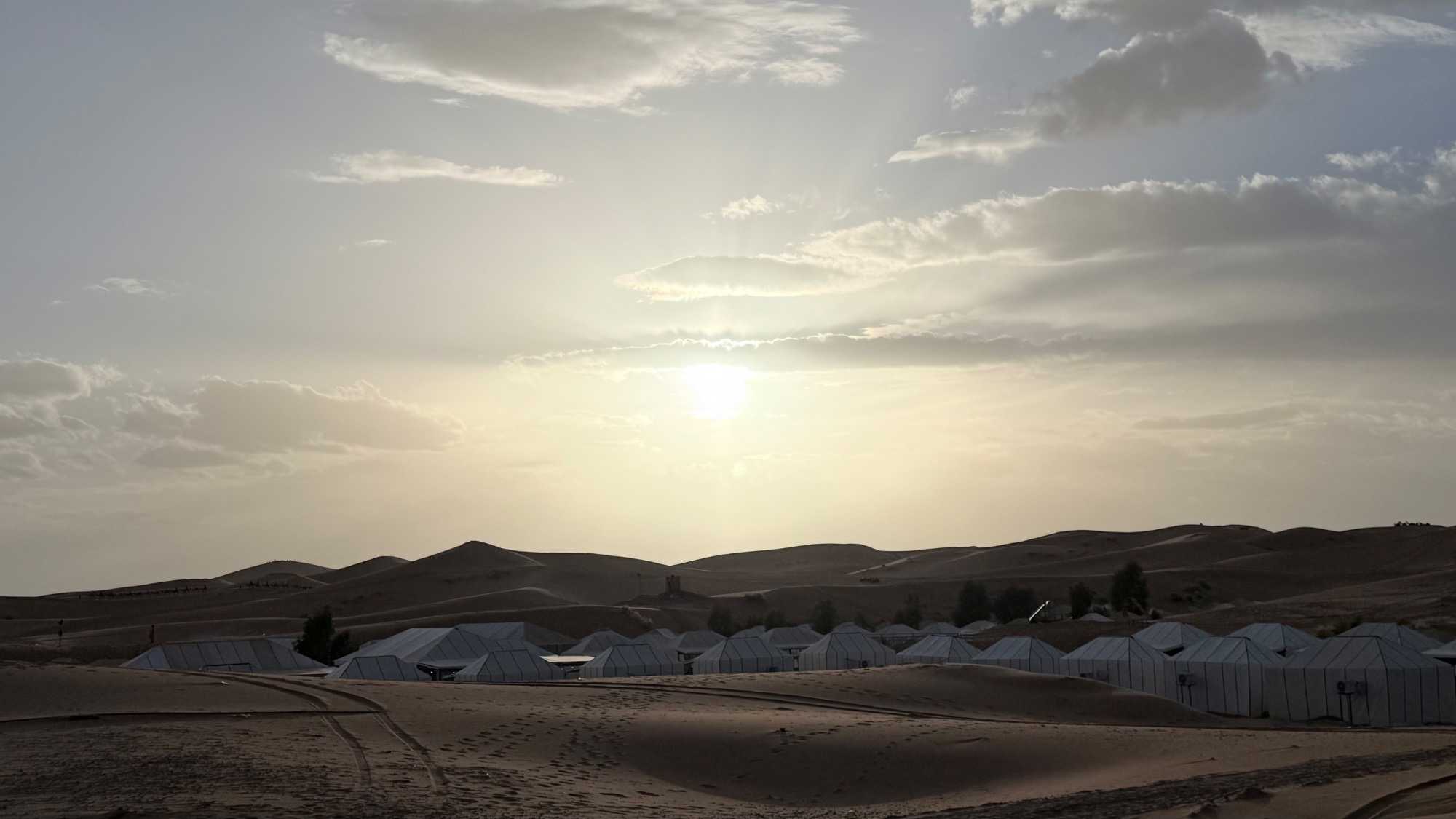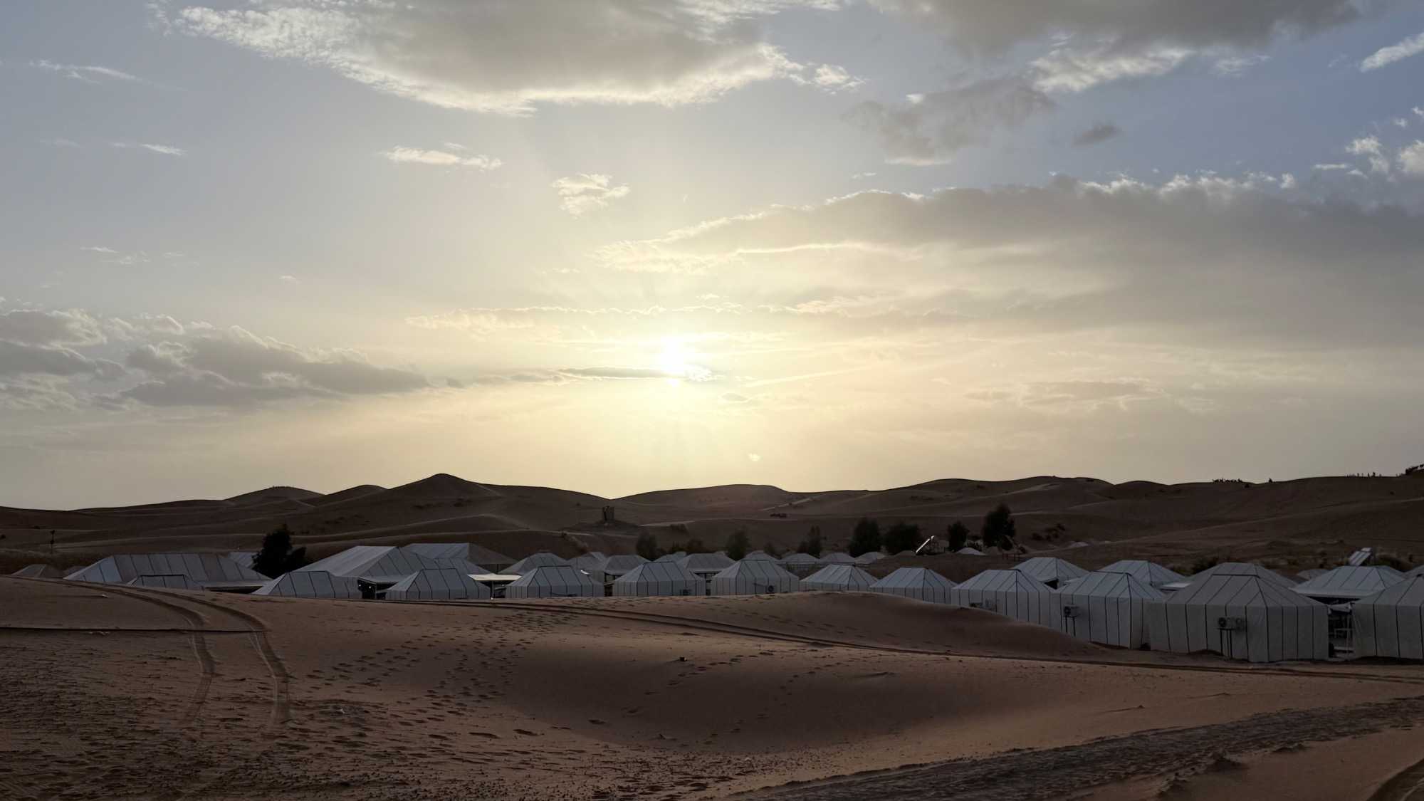 À notre arrivée aux bivouacs, à peine le temps de nous installer que certains sont repartis, bercés par le pas lent des dromadaires, à la rencontre du soleil couchant au sommet des dunes. Ce soir-là, le ciel, légèrement voilé, a dessiné un coucher de soleil différent… plus discret, plus intime, comme un secret murmuré à l’horizon.