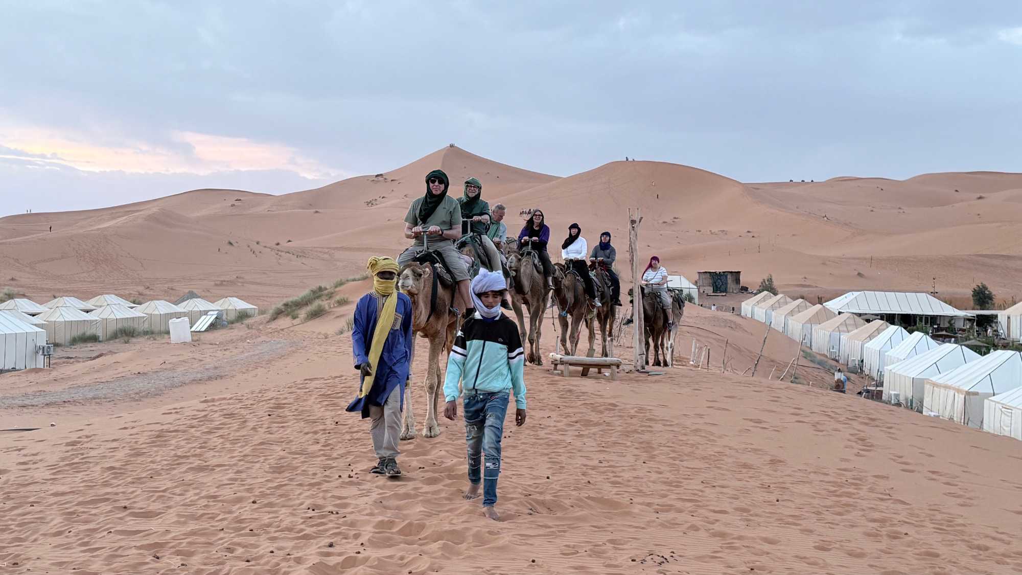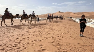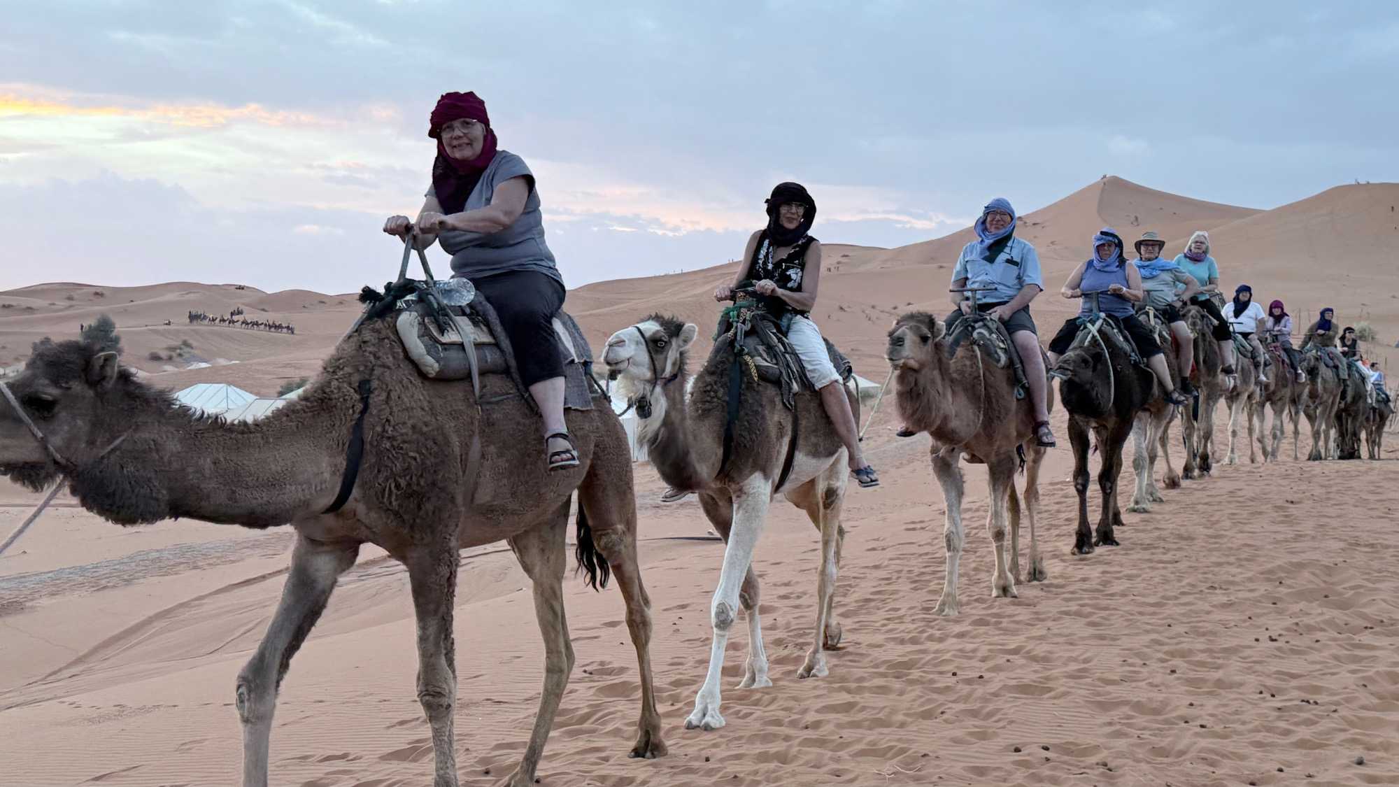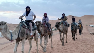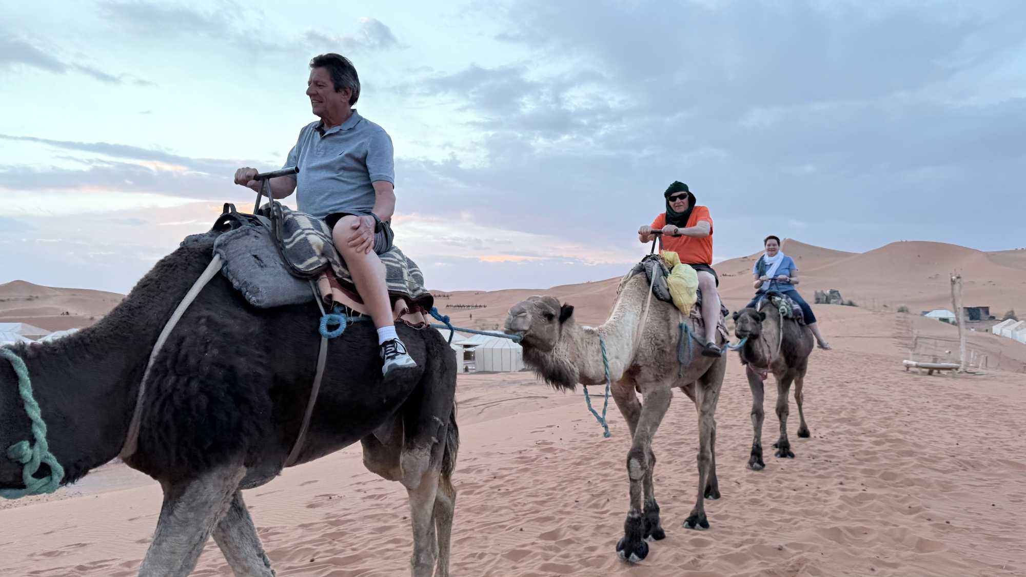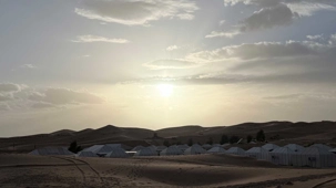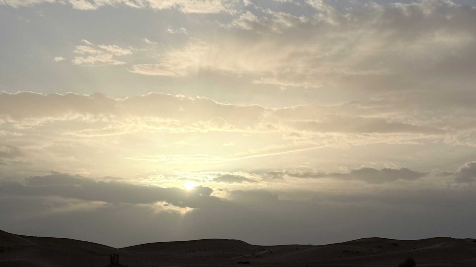 À notre arrivée aux bivouacs, à peine le temps de nous installer que certains sont repartis, bercés par le pas lent des dromadaires, à la rencontre du soleil couchant au sommet des dunes. Ce soir-là, le ciel, légèrement voilé, a dessiné un coucher de soleil différent… plus discret, plus intime, comme un secret murmuré à l’horizon.