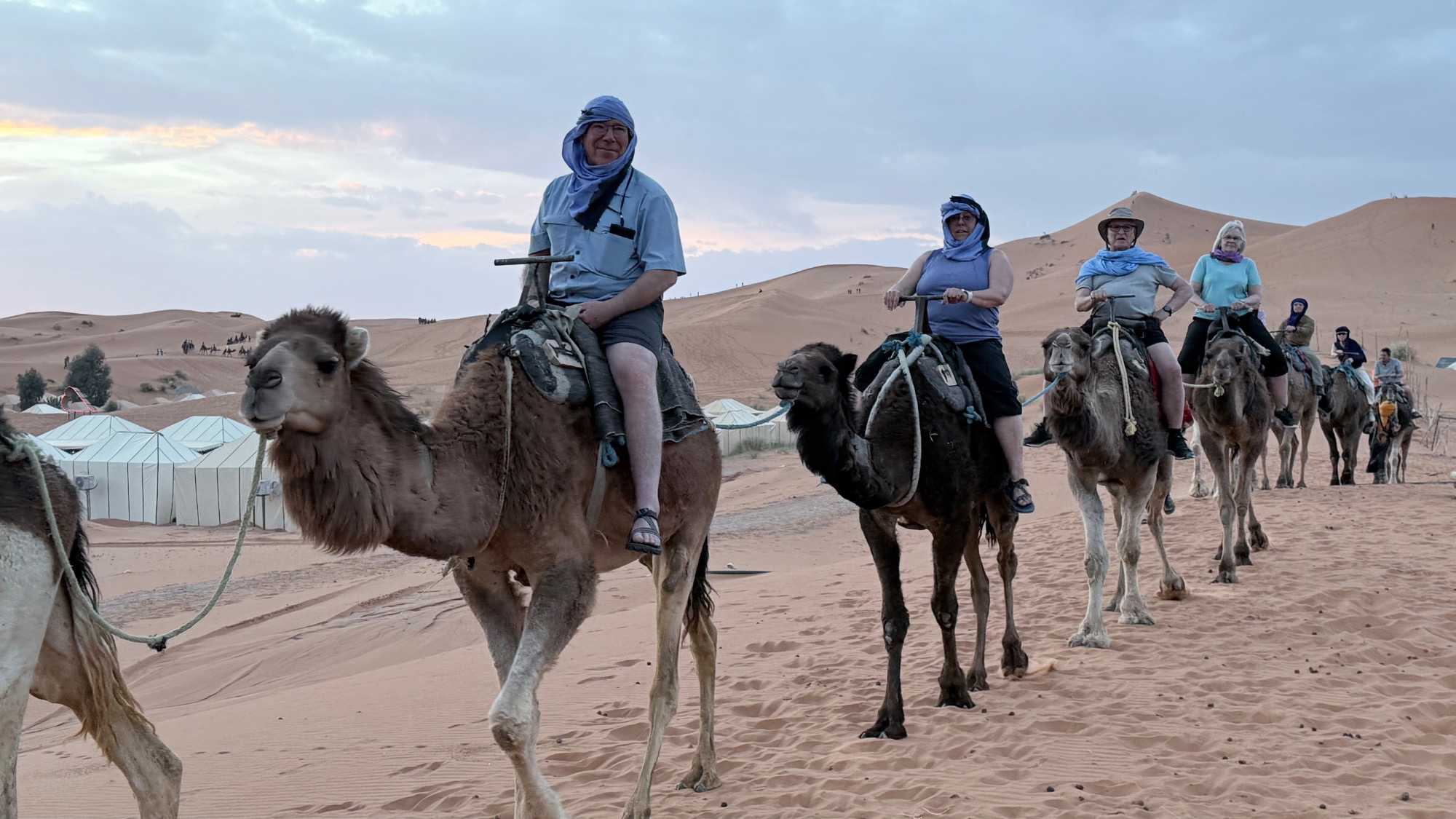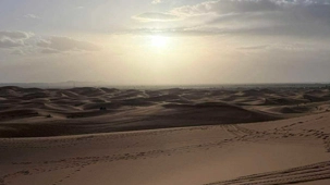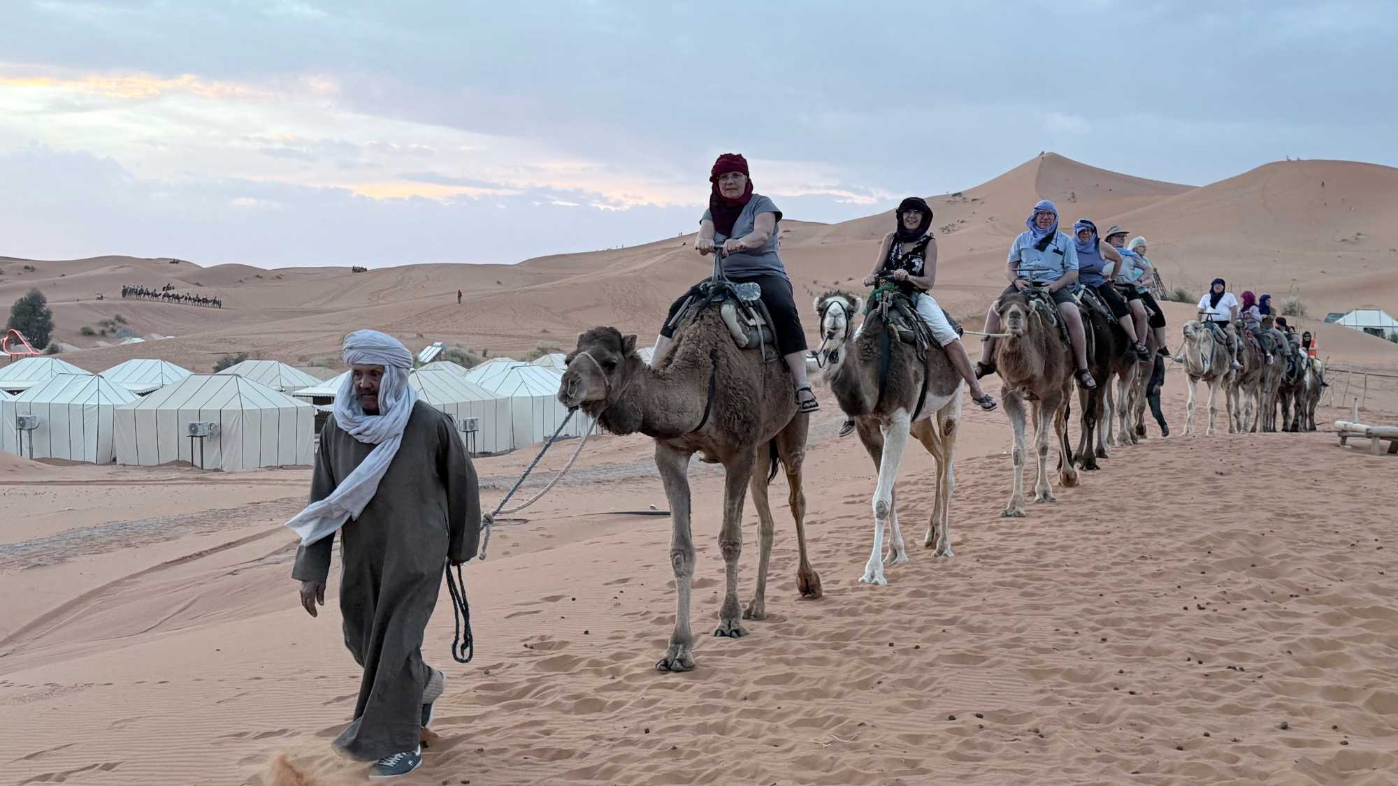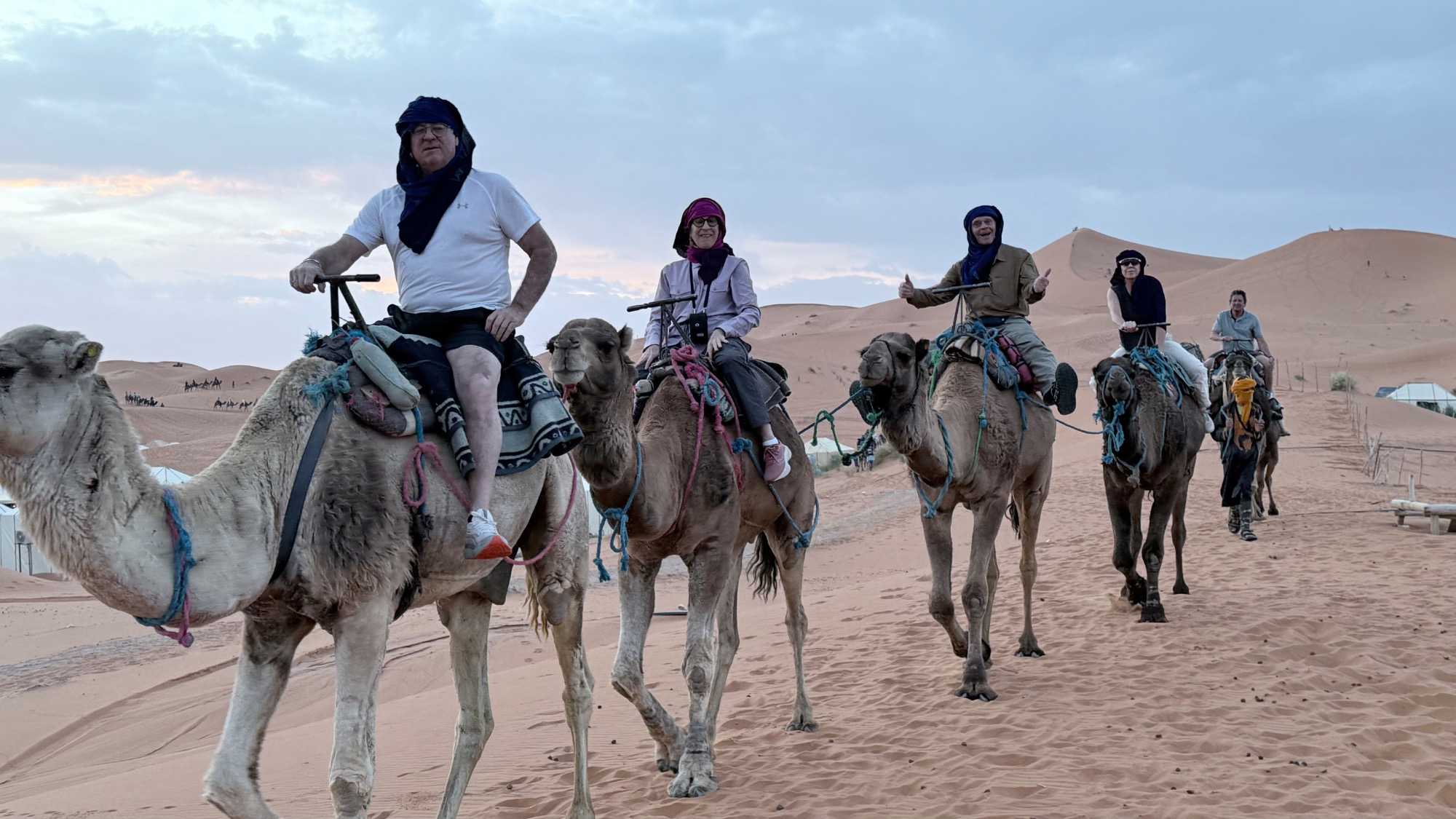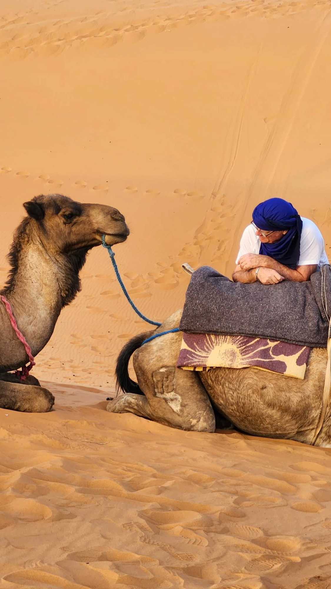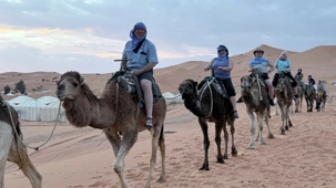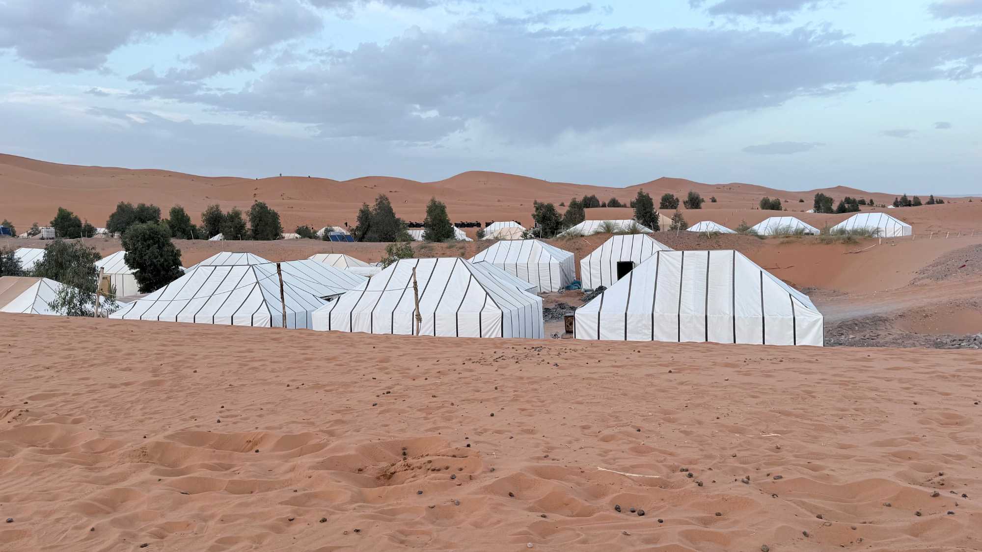 À notre arrivée aux bivouacs, à peine le temps de nous installer que certains sont repartis, bercés par le pas lent des dromadaires, à la rencontre du soleil couchant au sommet des dunes. Ce soir-là, le ciel, légèrement voilé, a dessiné un coucher de soleil différent… plus discret, plus intime, comme un secret murmuré à l’horizon.