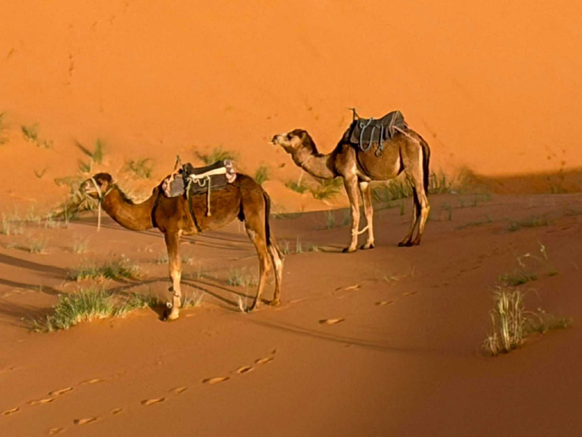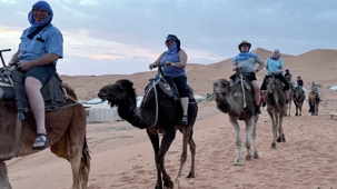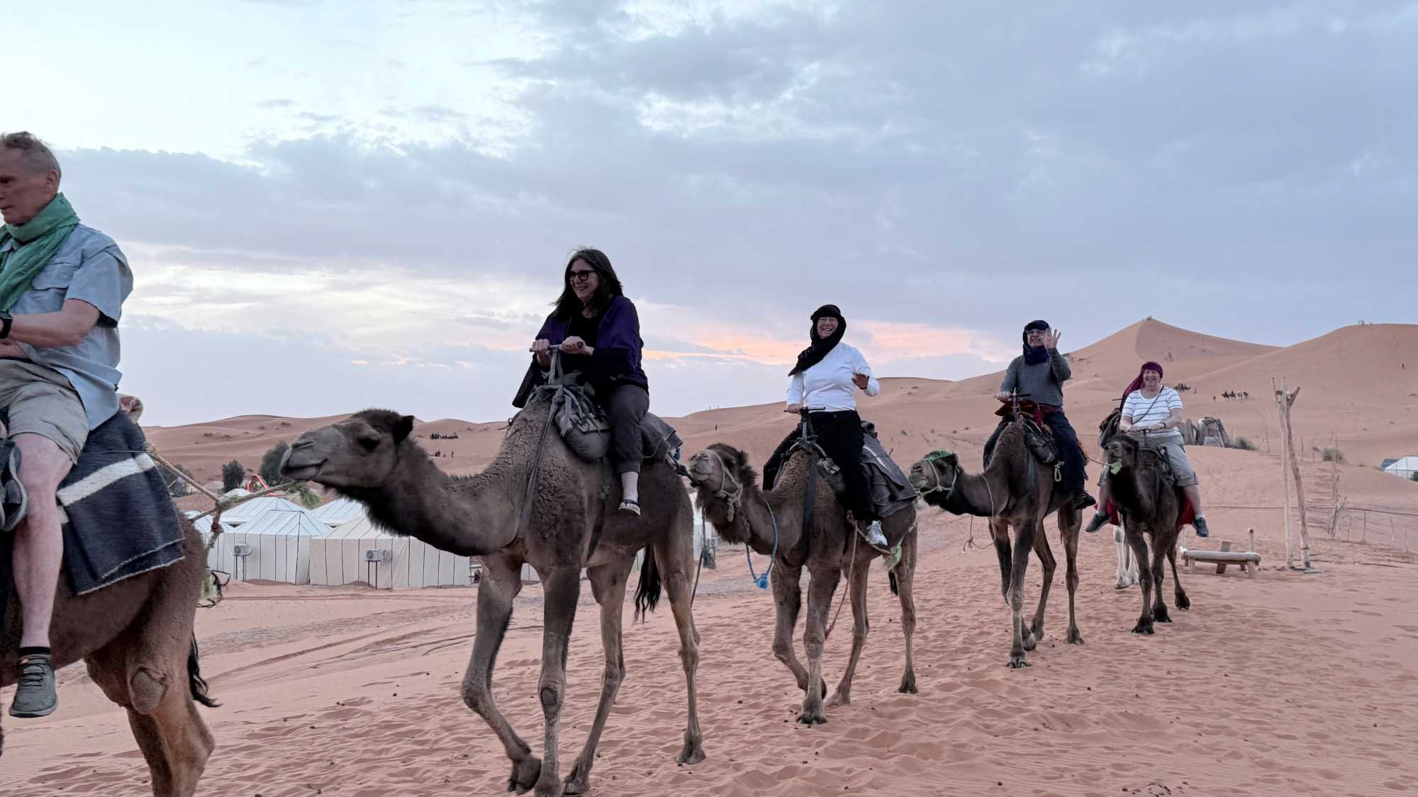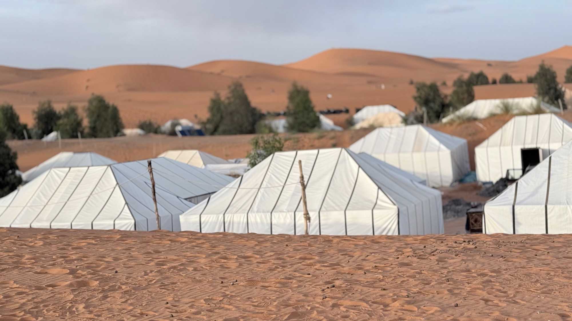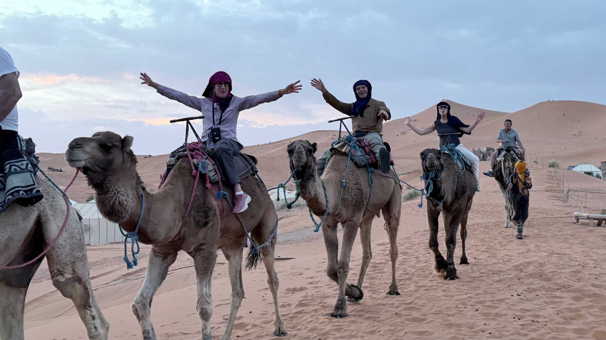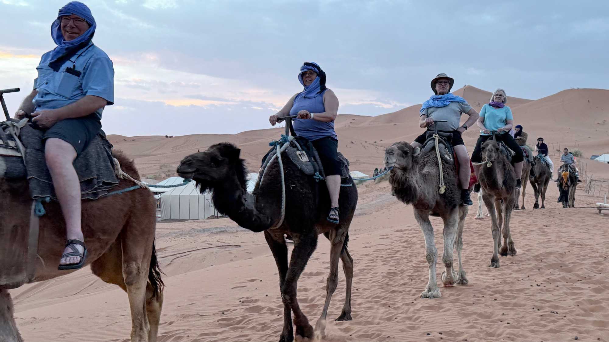 À notre arrivée aux bivouacs, à peine le temps de nous installer que certains sont repartis, bercés par le pas lent des dromadaires, à la rencontre du soleil couchant au sommet des dunes. Ce soir-là, le ciel, légèrement voilé, a dessiné un coucher de soleil différent… plus discret, plus intime, comme un secret murmuré à l’horizon.