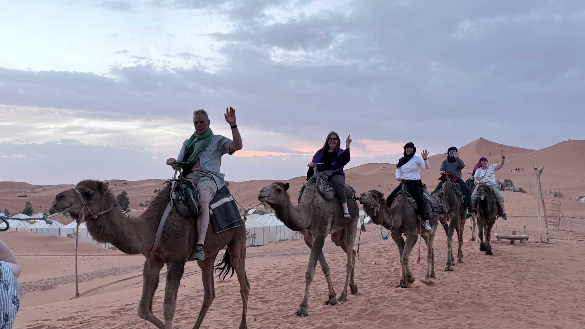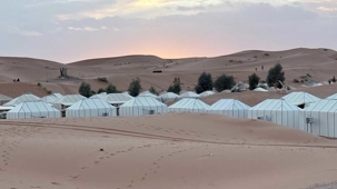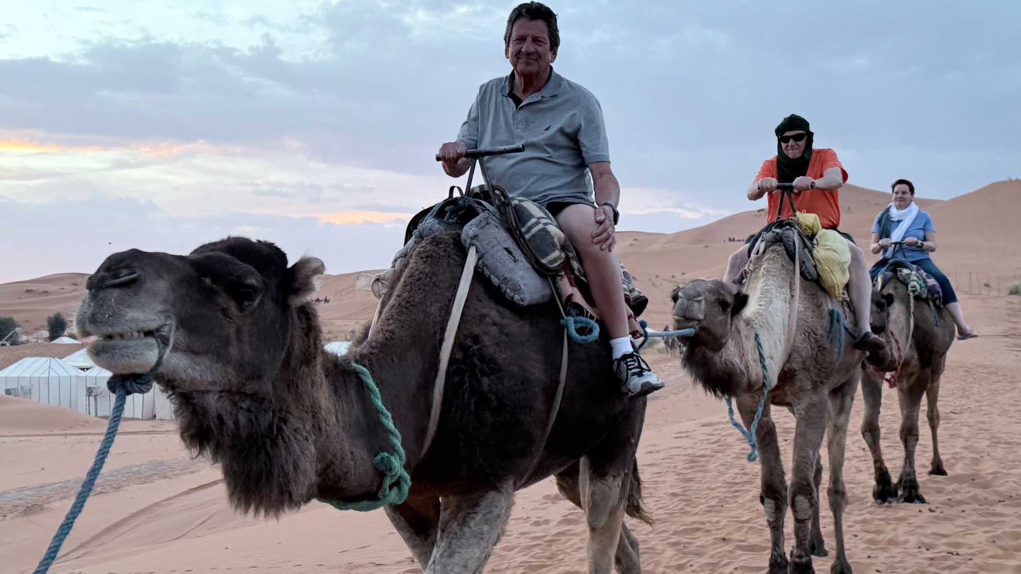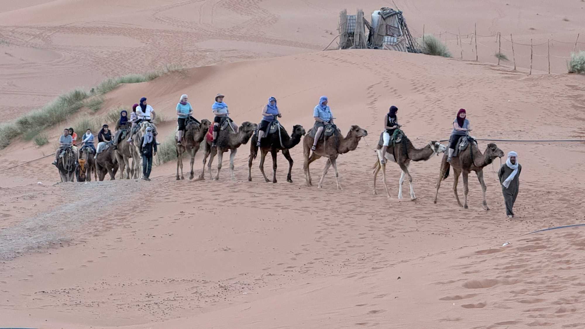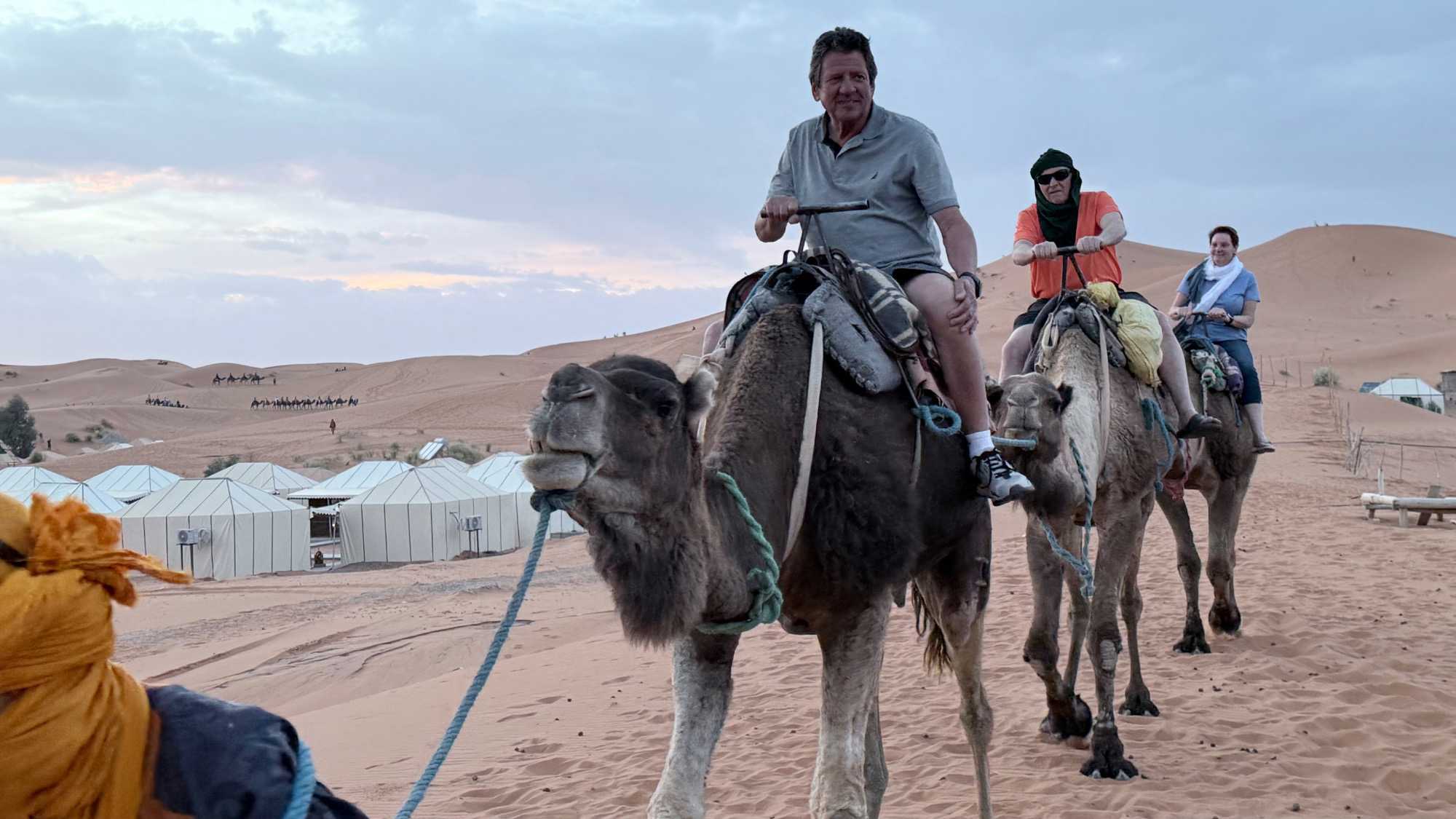 À notre arrivée aux bivouacs, à peine le temps de nous installer que certains sont repartis, bercés par le pas lent des dromadaires, à la rencontre du soleil couchant au sommet des dunes. Ce soir-là, le ciel, légèrement voilé, a dessiné un coucher de soleil différent… plus discret, plus intime, comme un secret murmuré à l’horizon.
