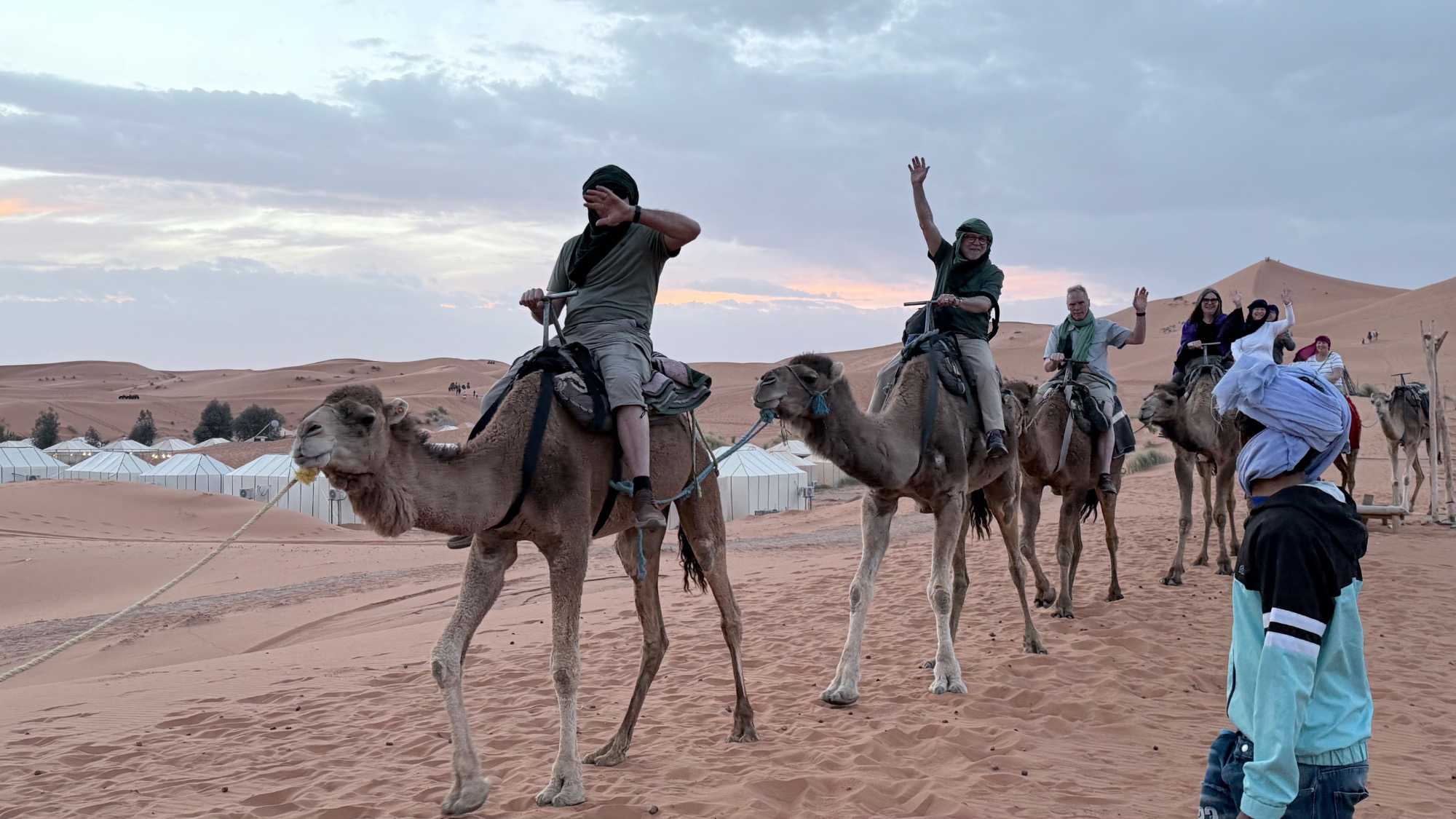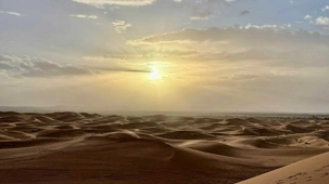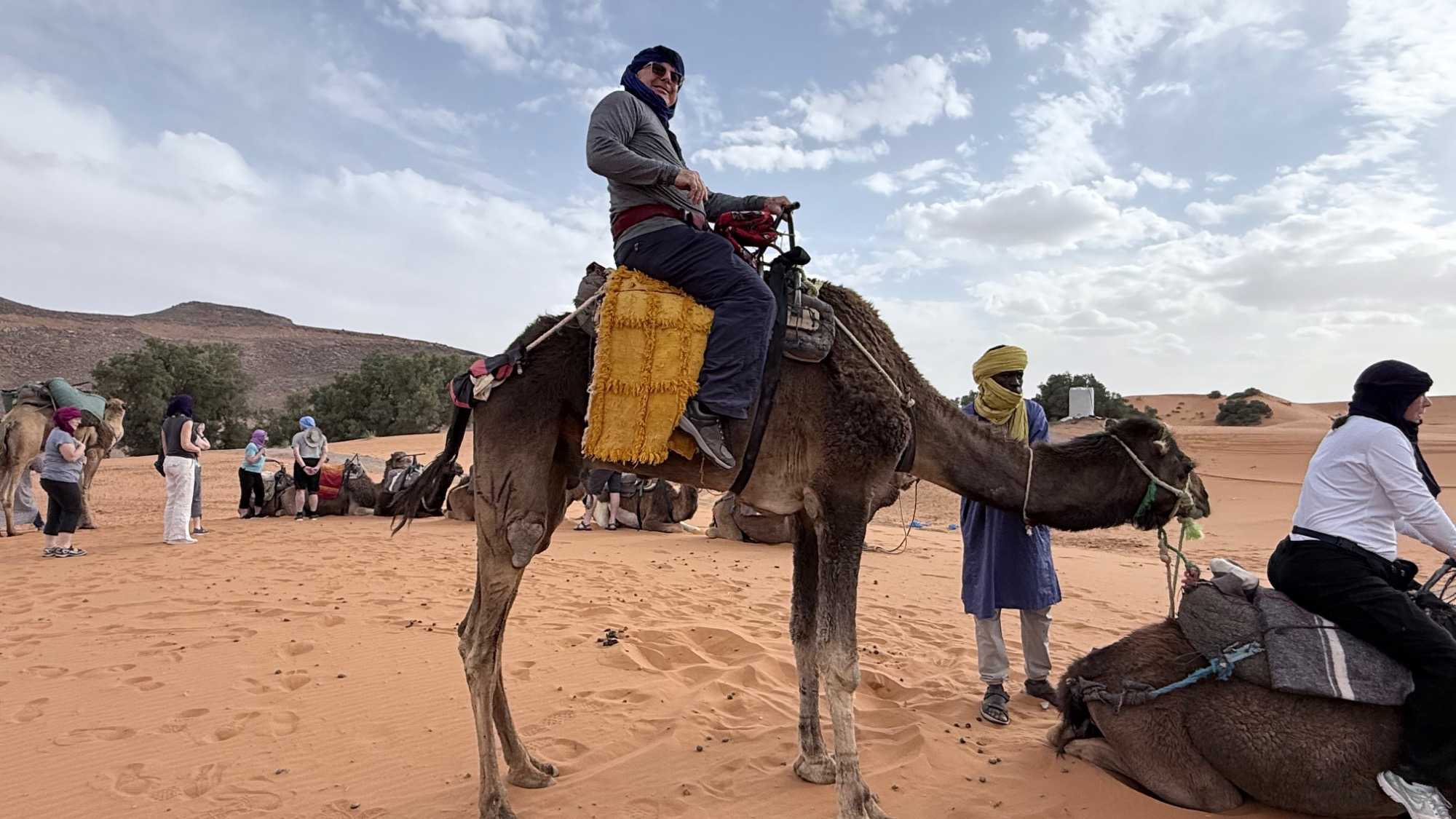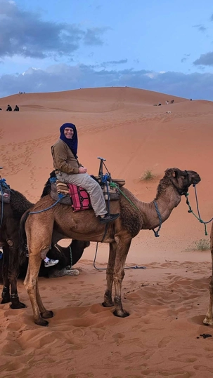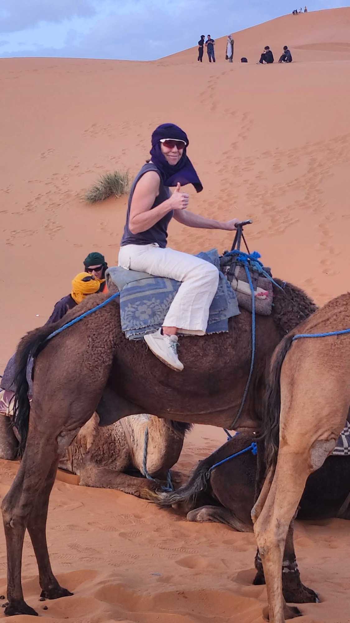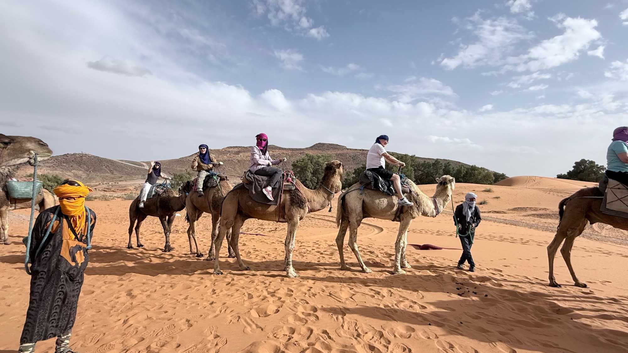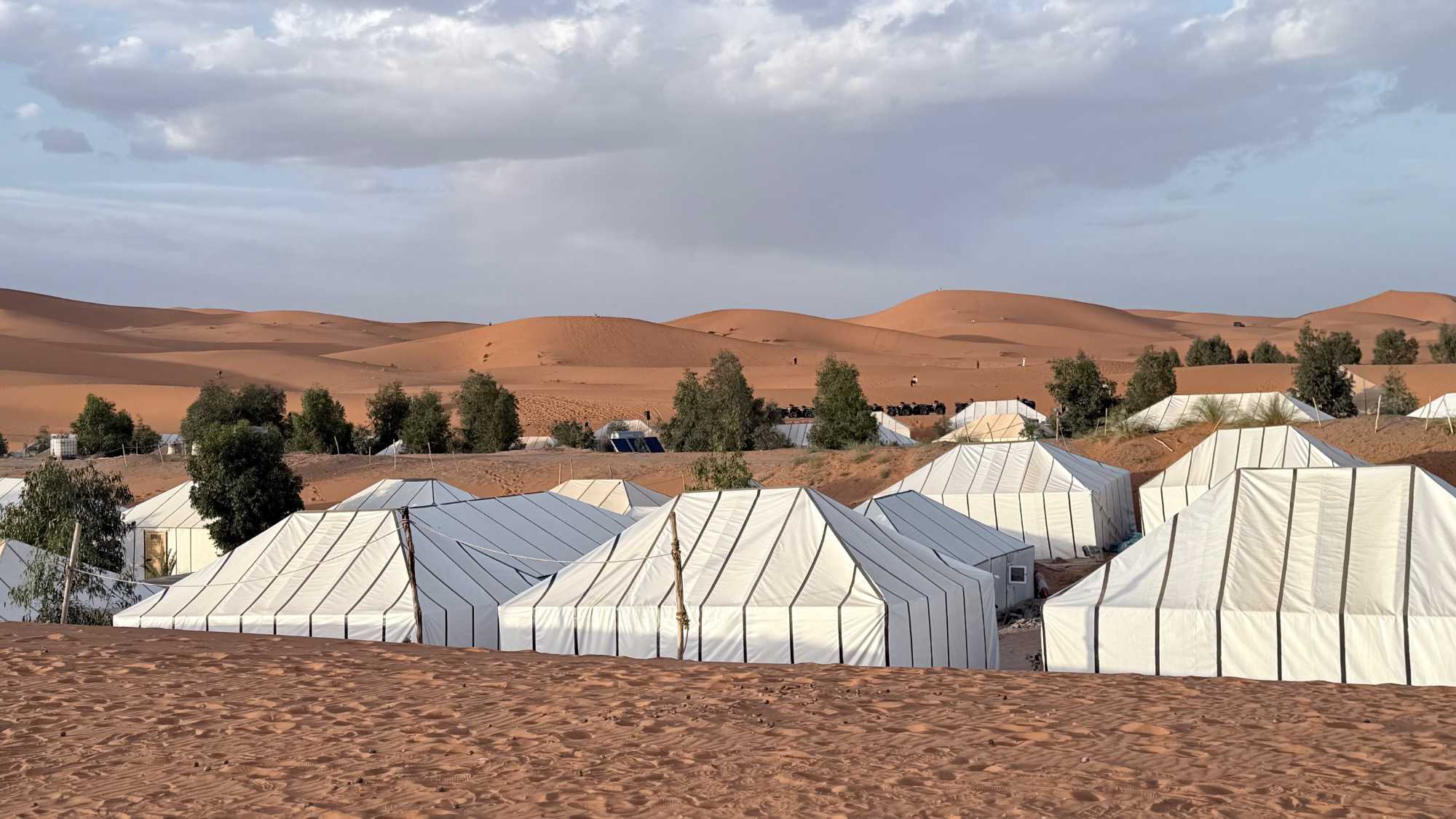 À notre arrivée aux bivouacs, à peine le temps de nous installer que certains sont repartis, bercés par le pas lent des dromadaires, à la rencontre du soleil couchant au sommet des dunes. Ce soir-là, le ciel, légèrement voilé, a dessiné un coucher de soleil différent… plus discret, plus intime, comme un secret murmuré à l’horizon.