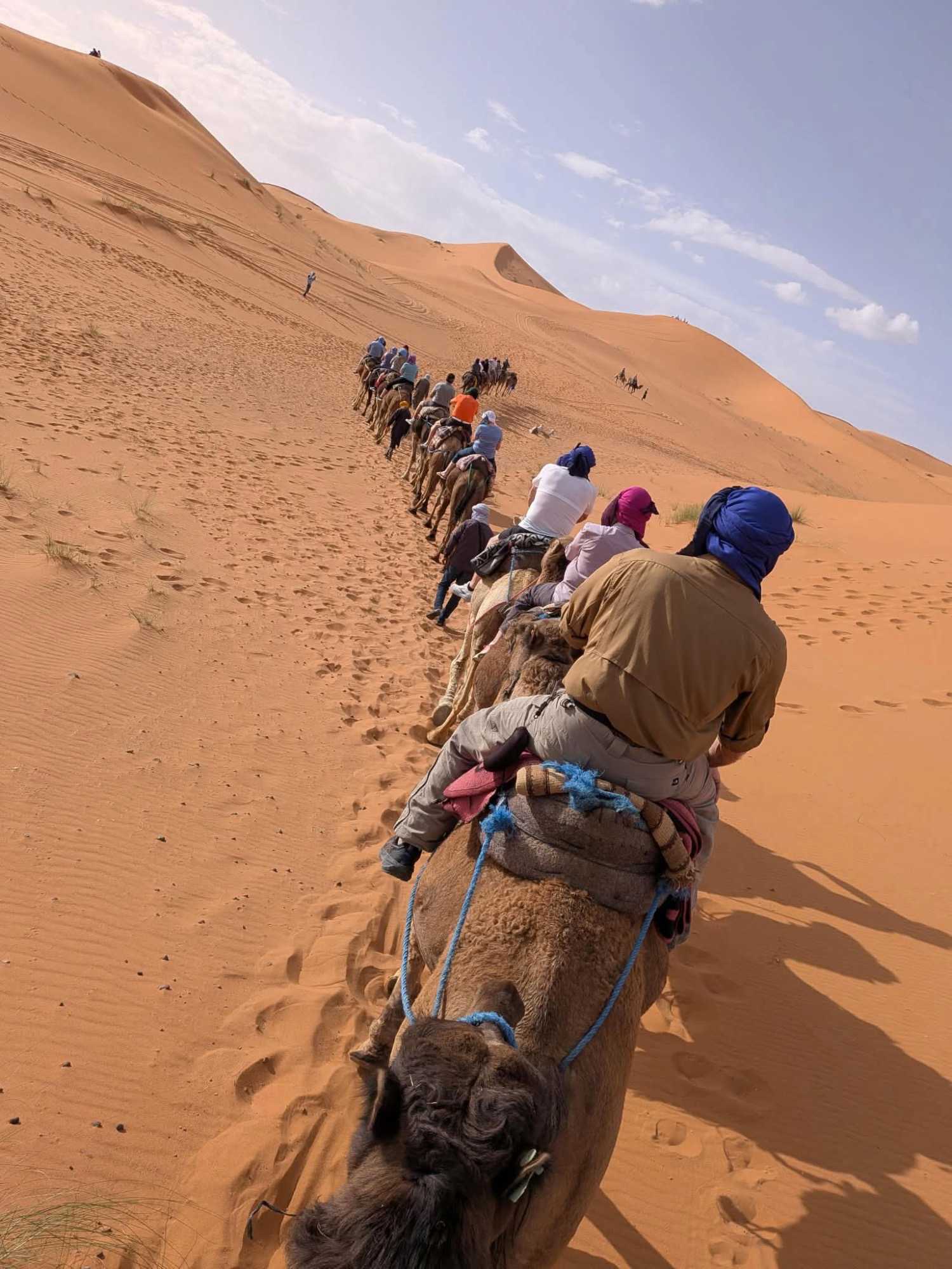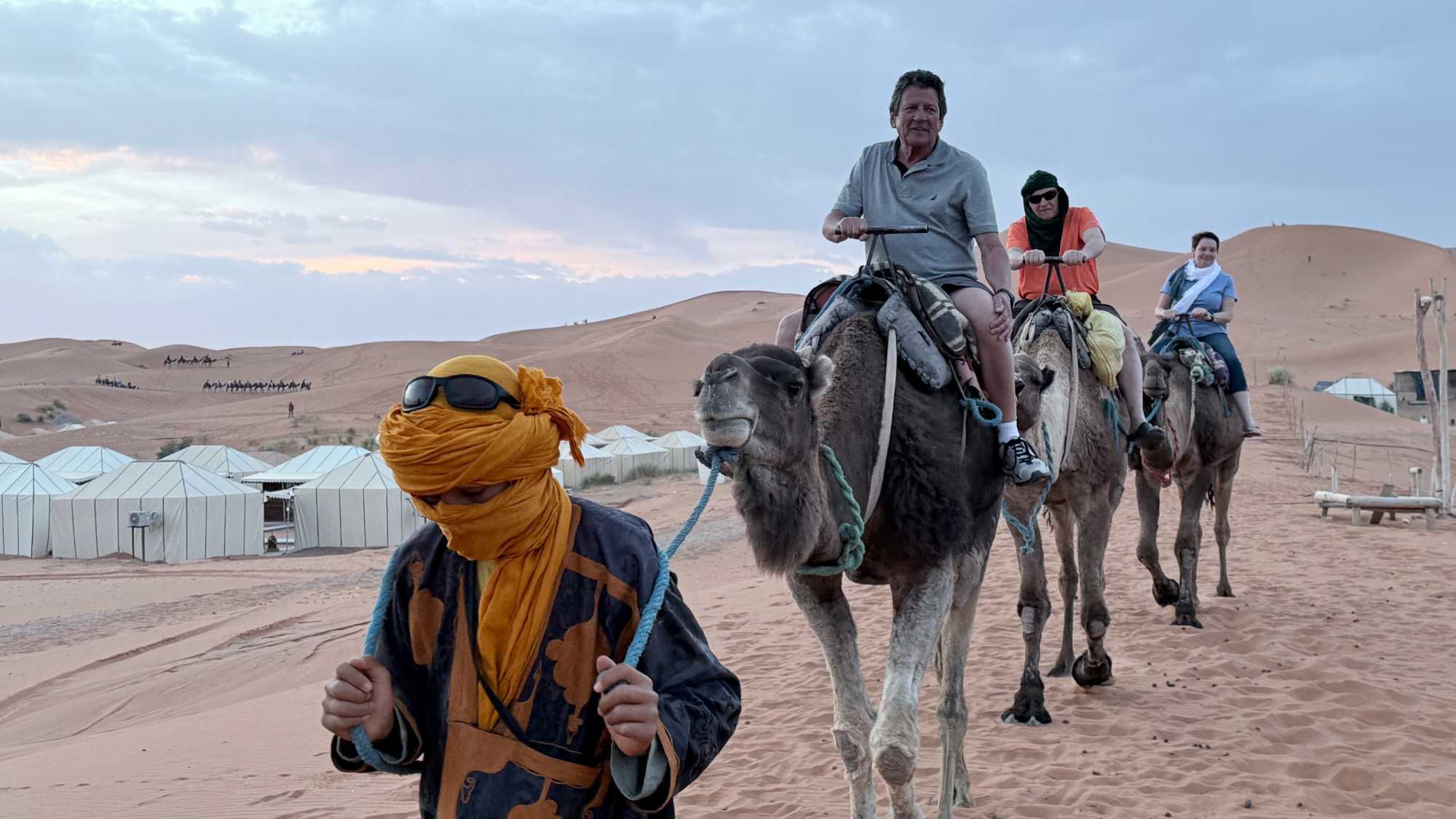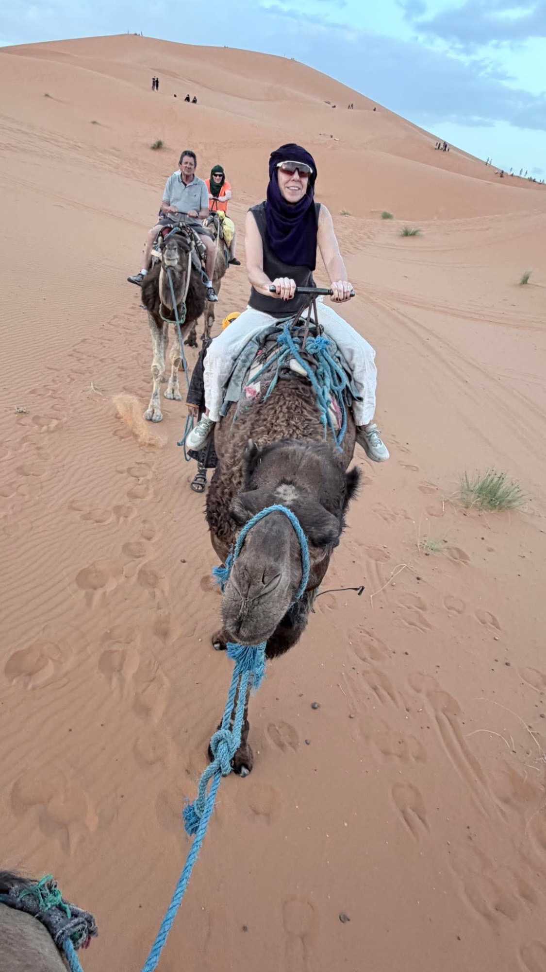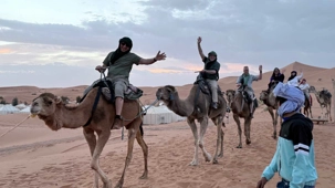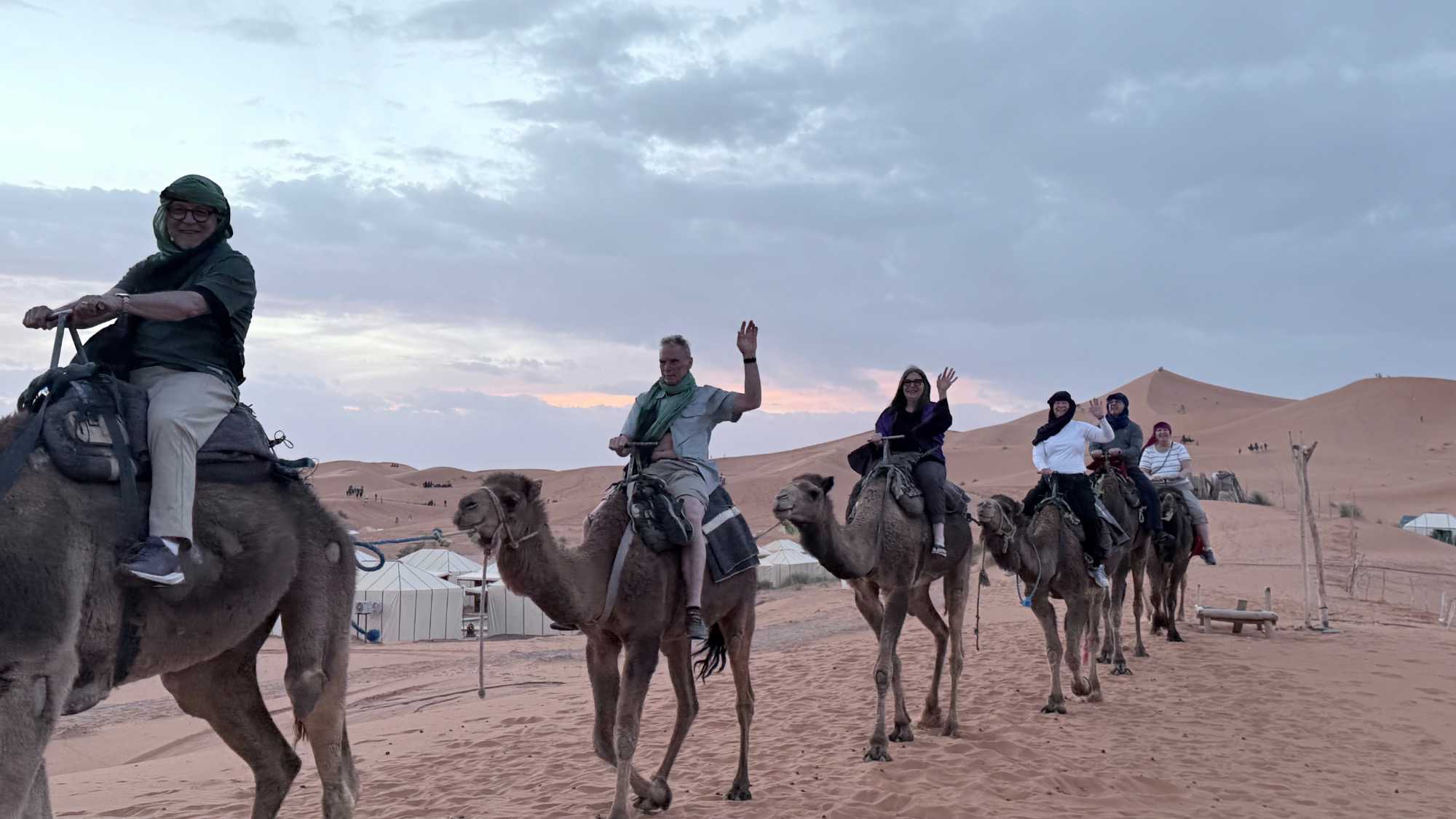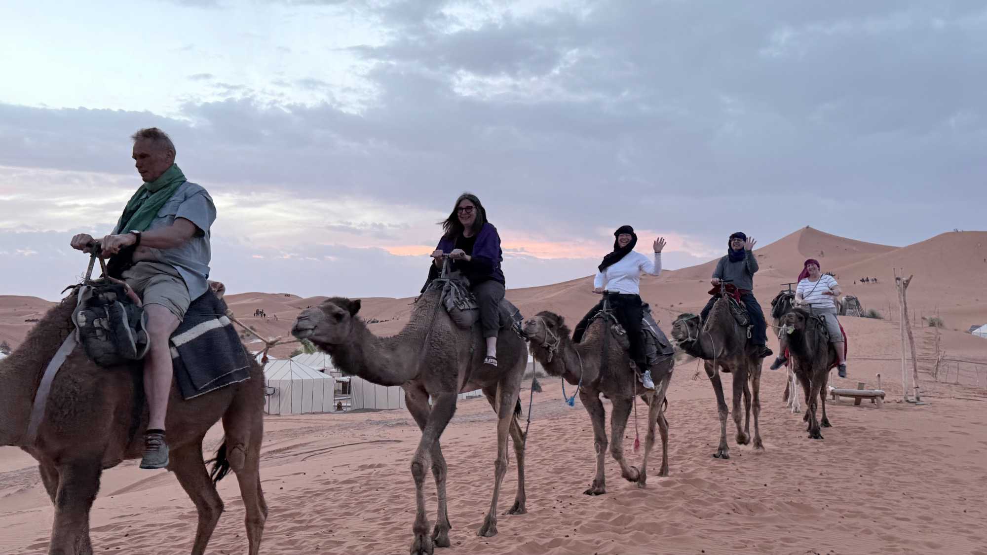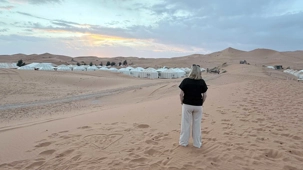 À notre arrivée aux bivouacs, à peine le temps de nous installer que certains sont repartis, bercés par le pas lent des dromadaires, à la rencontre du soleil couchant au sommet des dunes. Ce soir-là, le ciel, légèrement voilé, a dessiné un coucher de soleil différent… plus discret, plus intime, comme un secret murmuré à l’horizon.