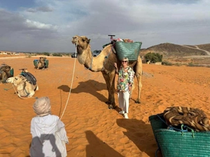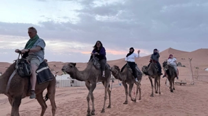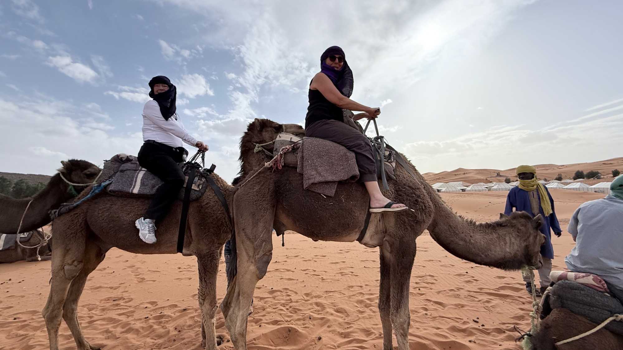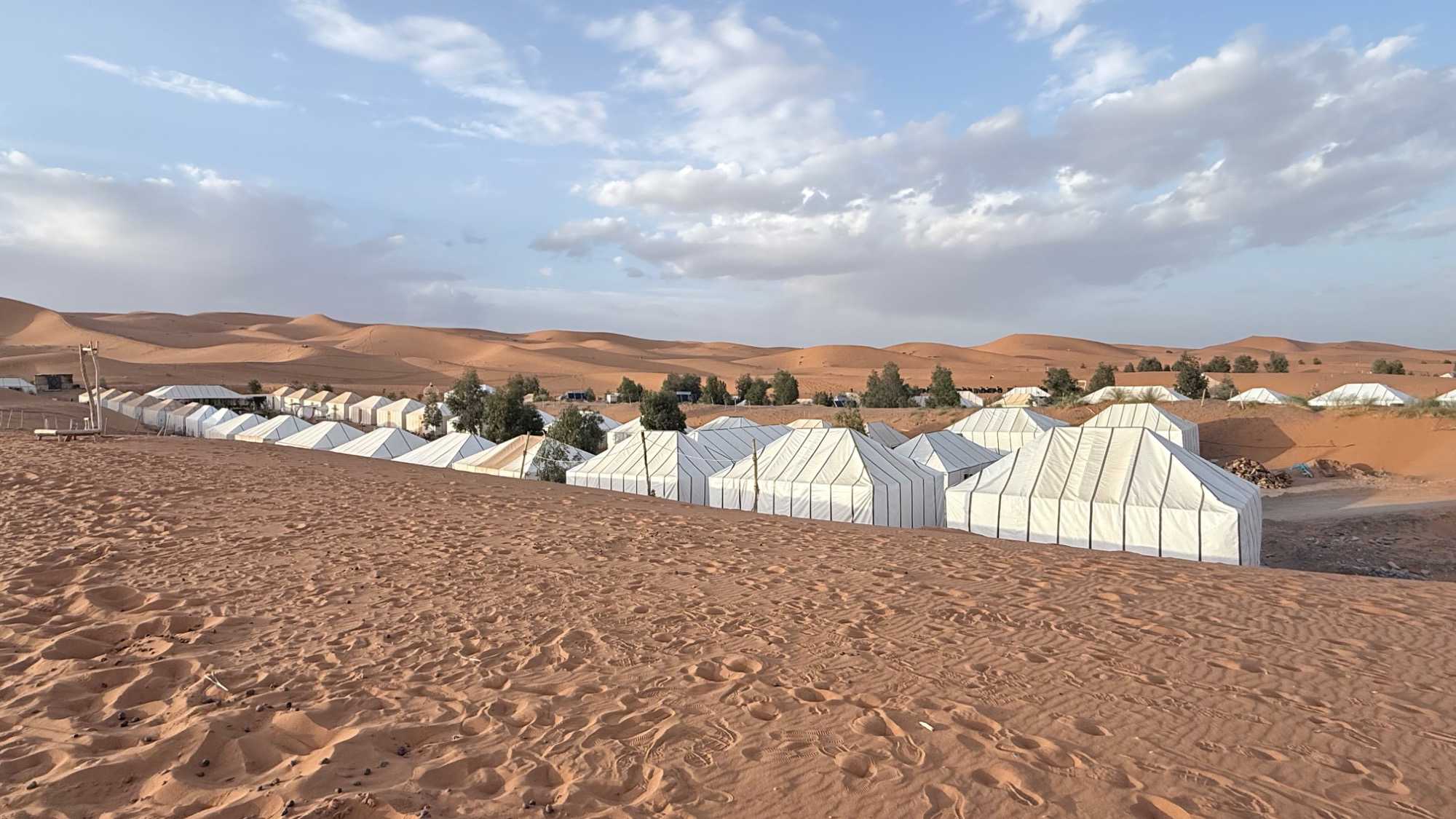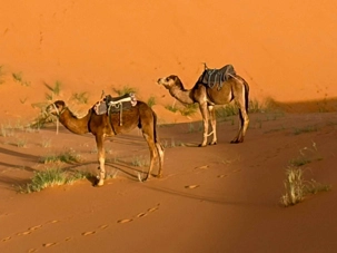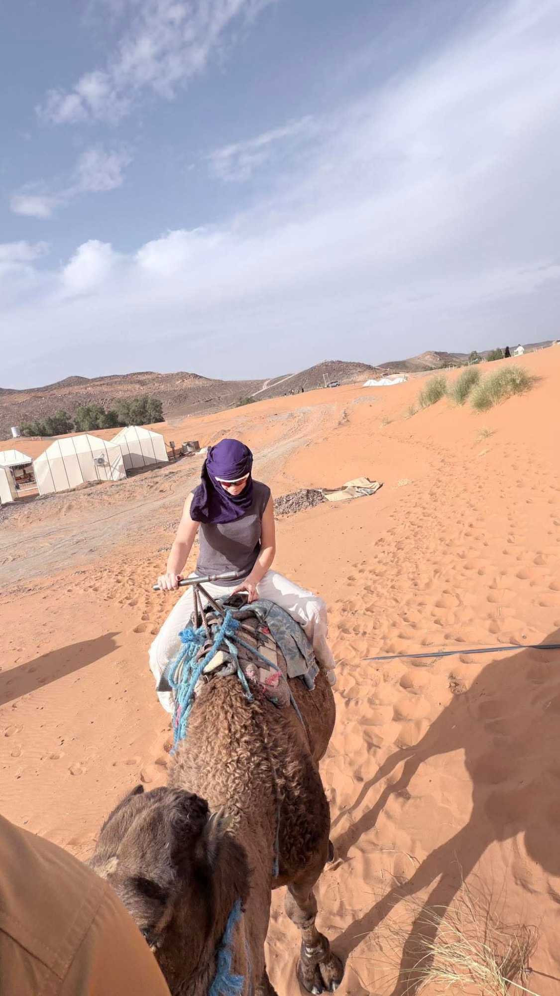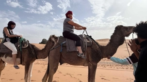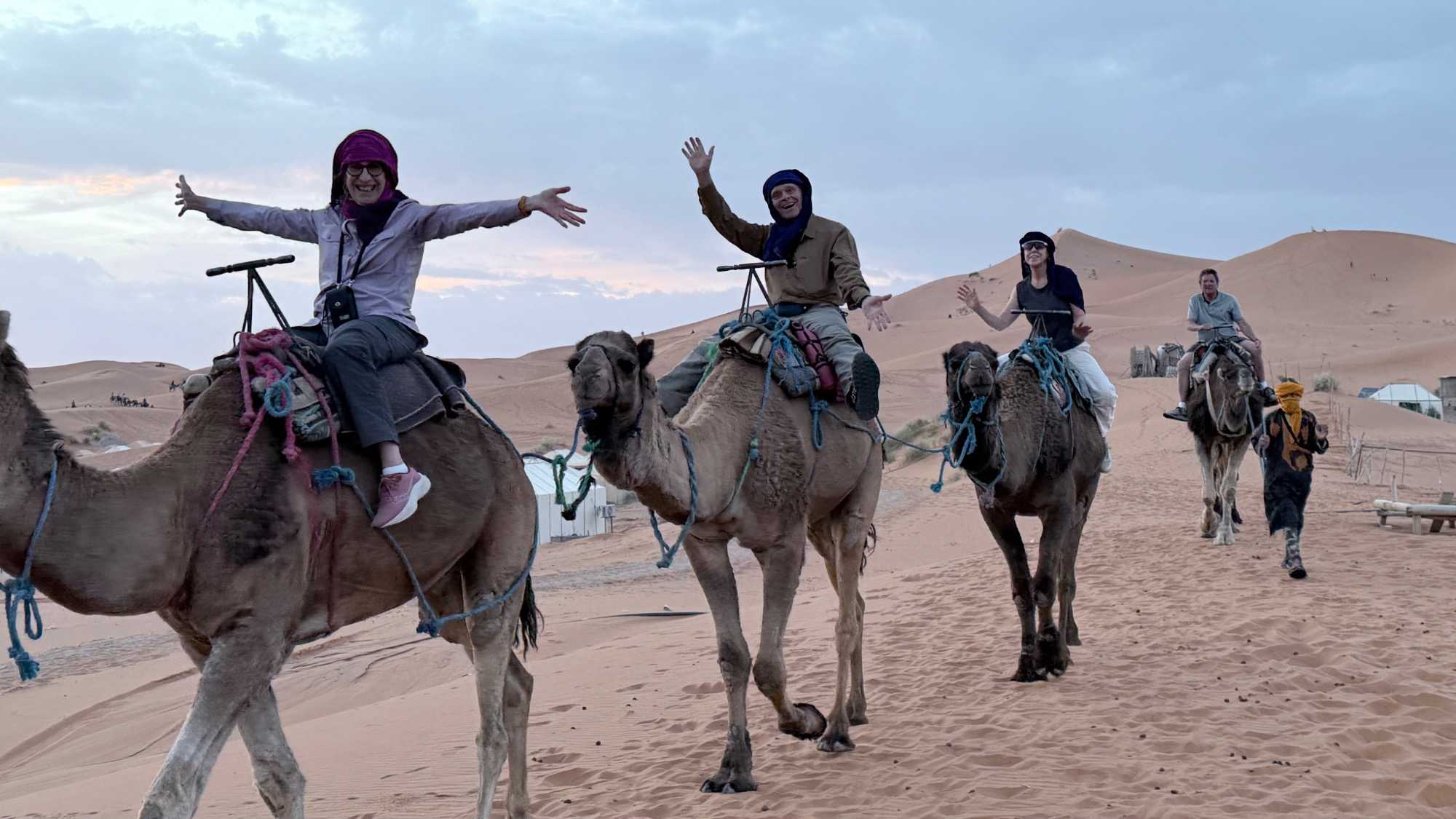 À notre arrivée aux bivouacs, à peine le temps de nous installer que certains sont repartis, bercés par le pas lent des dromadaires, à la rencontre du soleil couchant au sommet des dunes. Ce soir-là, le ciel, légèrement voilé, a dessiné un coucher de soleil différent… plus discret, plus intime, comme un secret murmuré à l’horizon.