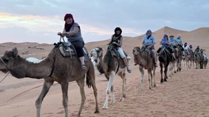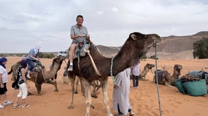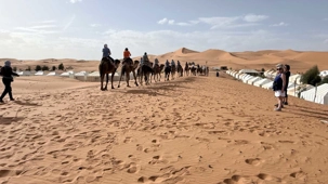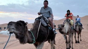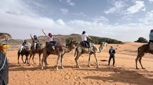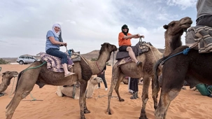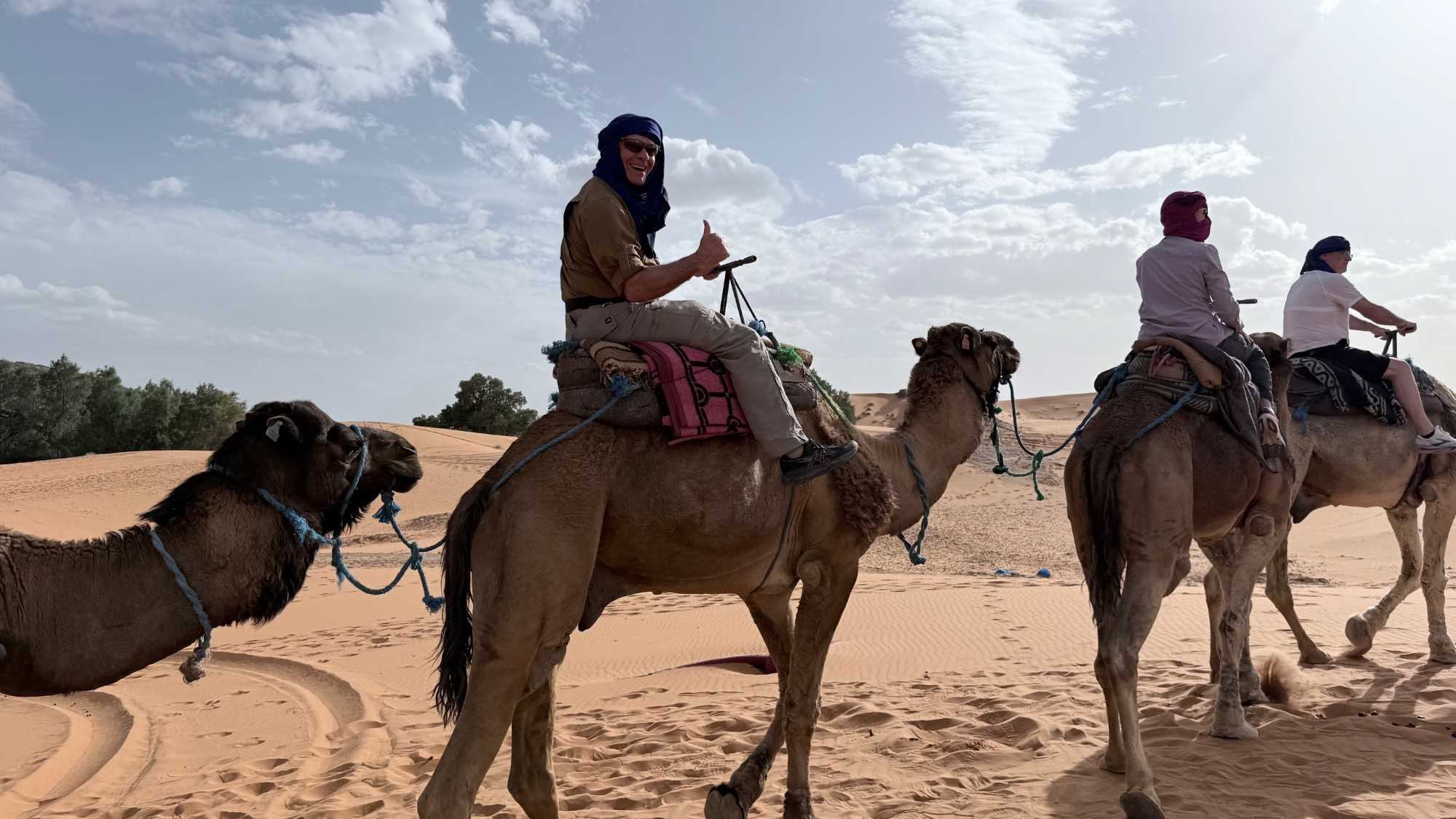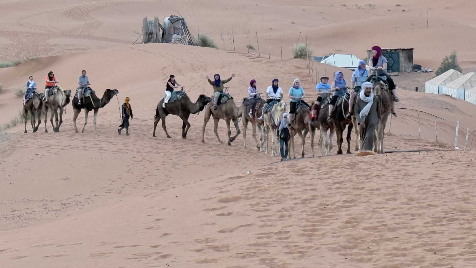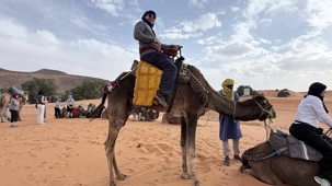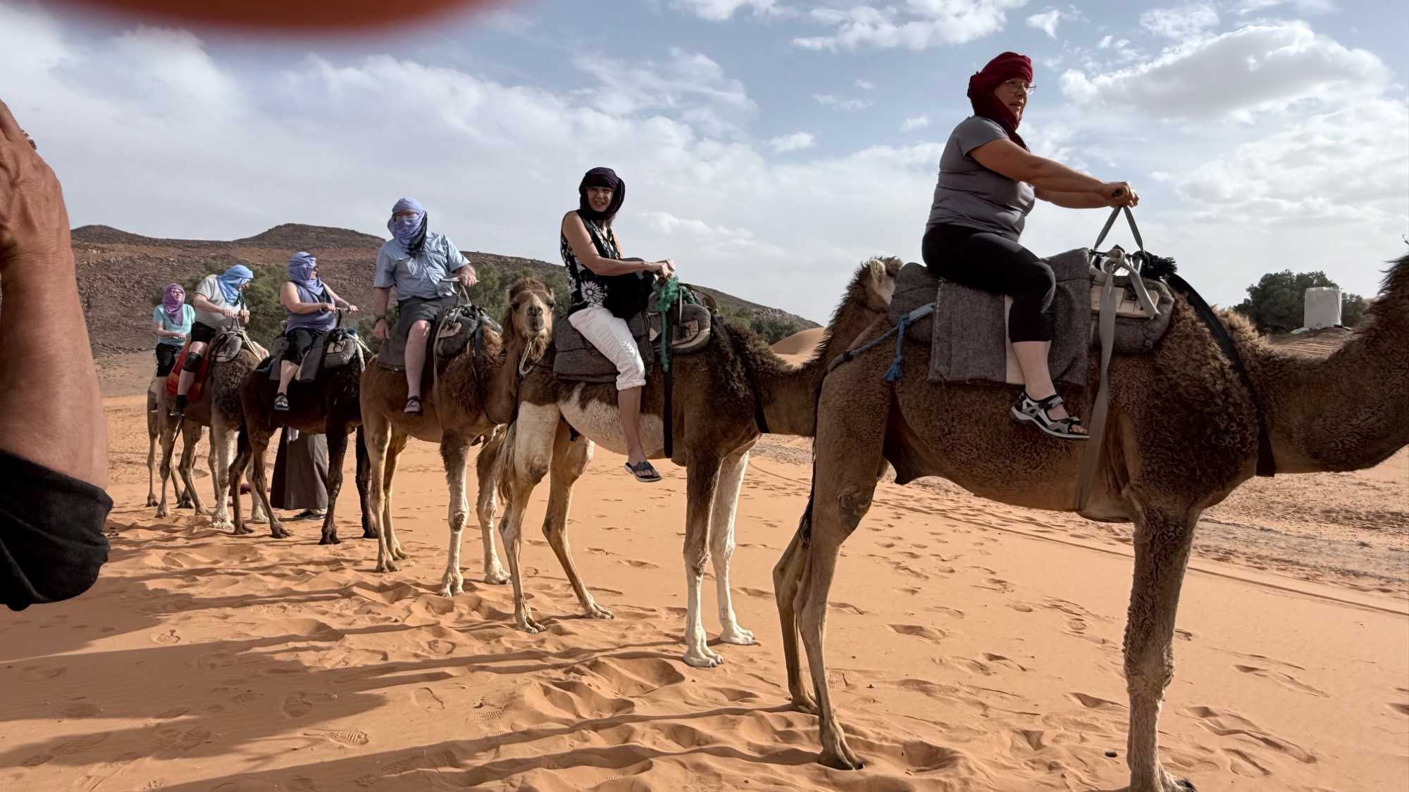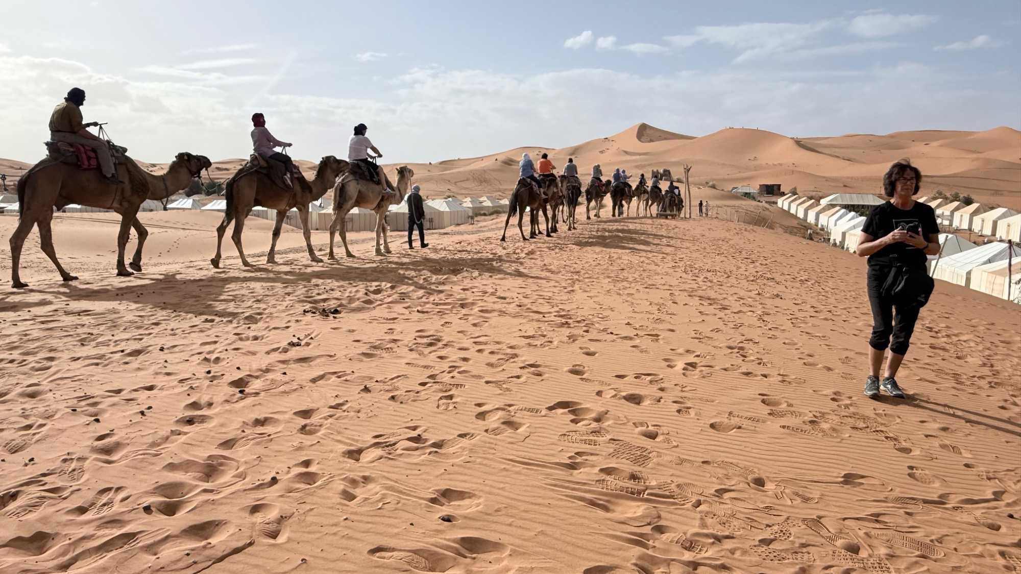 À notre arrivée aux bivouacs, à peine le temps de nous installer que certains sont repartis, bercés par le pas lent des dromadaires, à la rencontre du soleil couchant au sommet des dunes. Ce soir-là, le ciel, légèrement voilé, a dessiné un coucher de soleil différent… plus discret, plus intime, comme un secret murmuré à l’horizon.